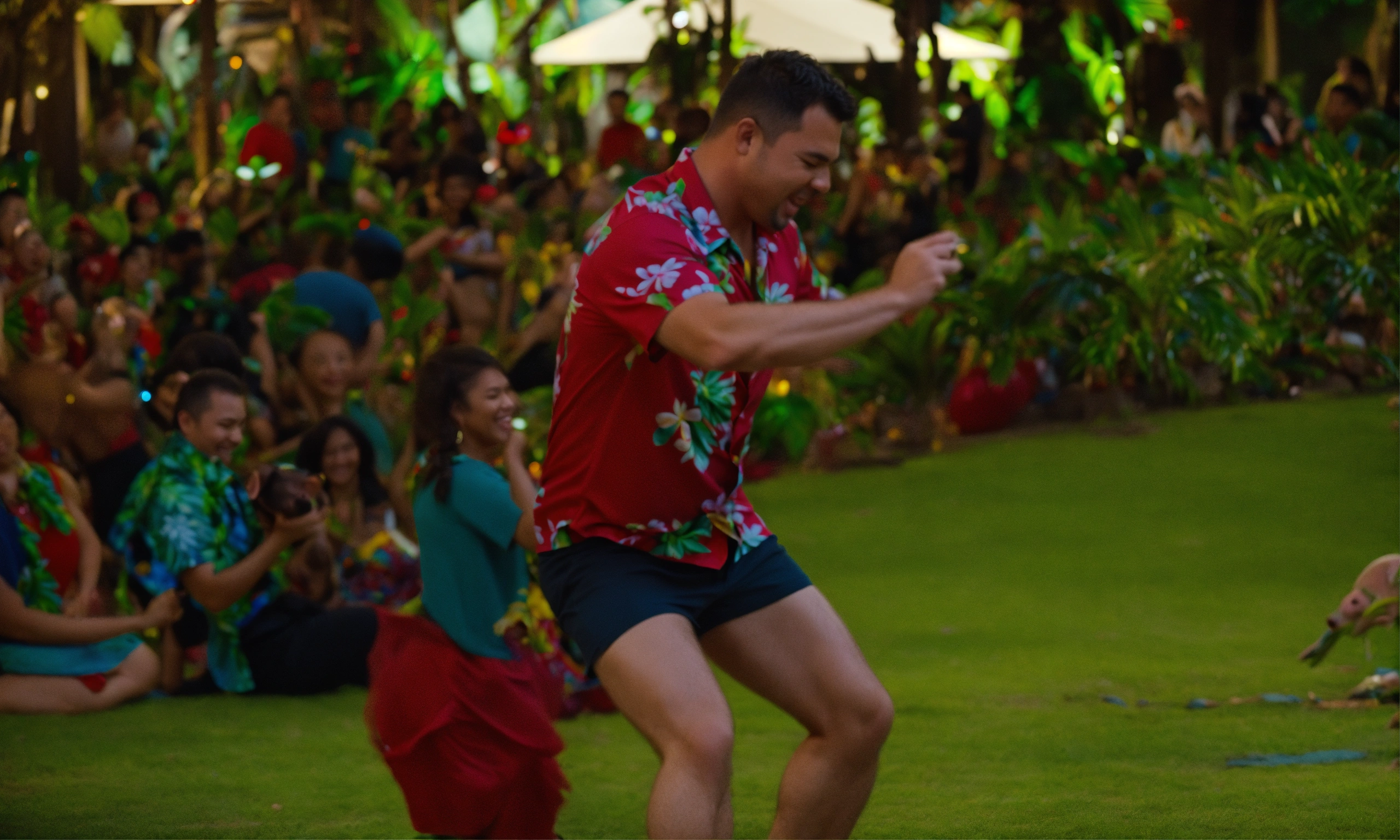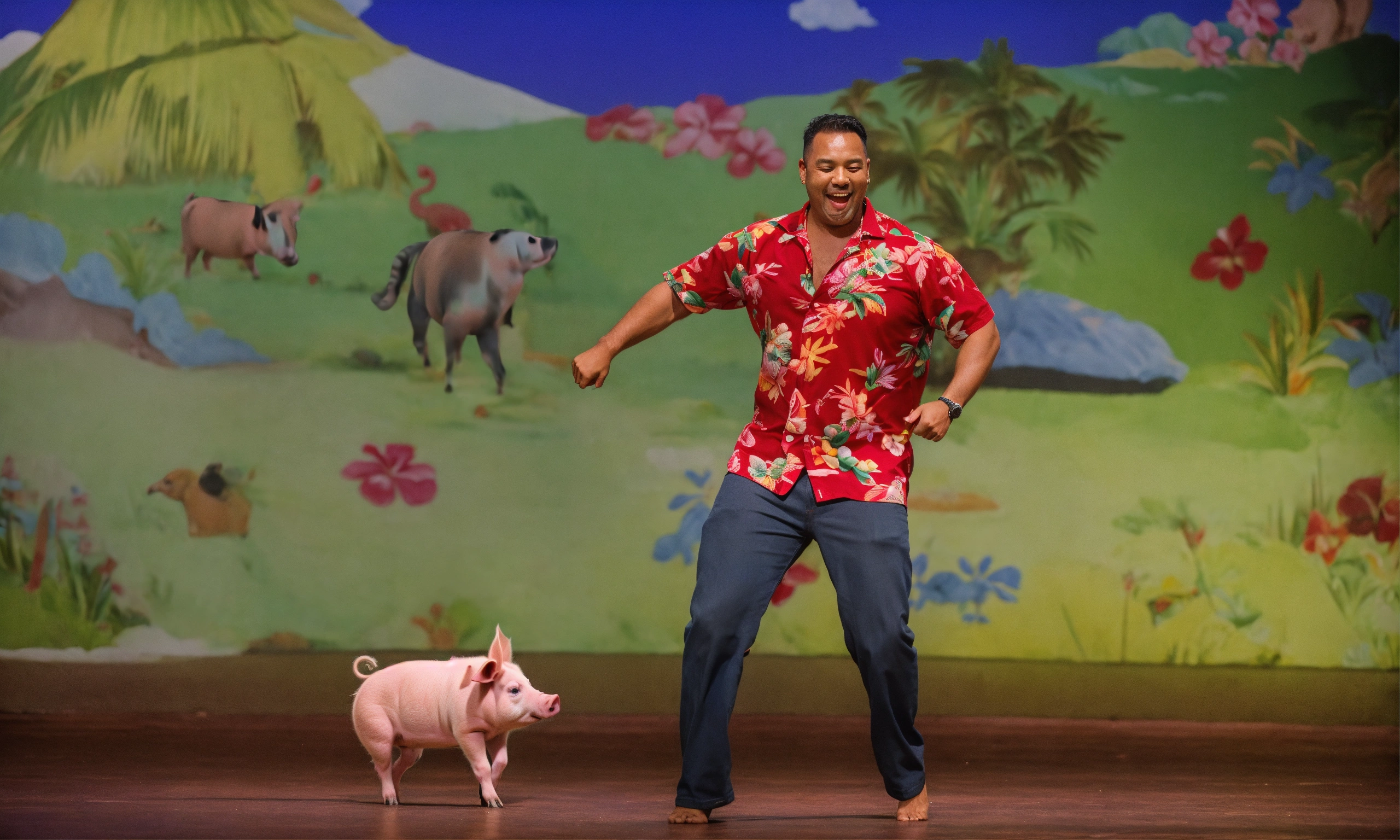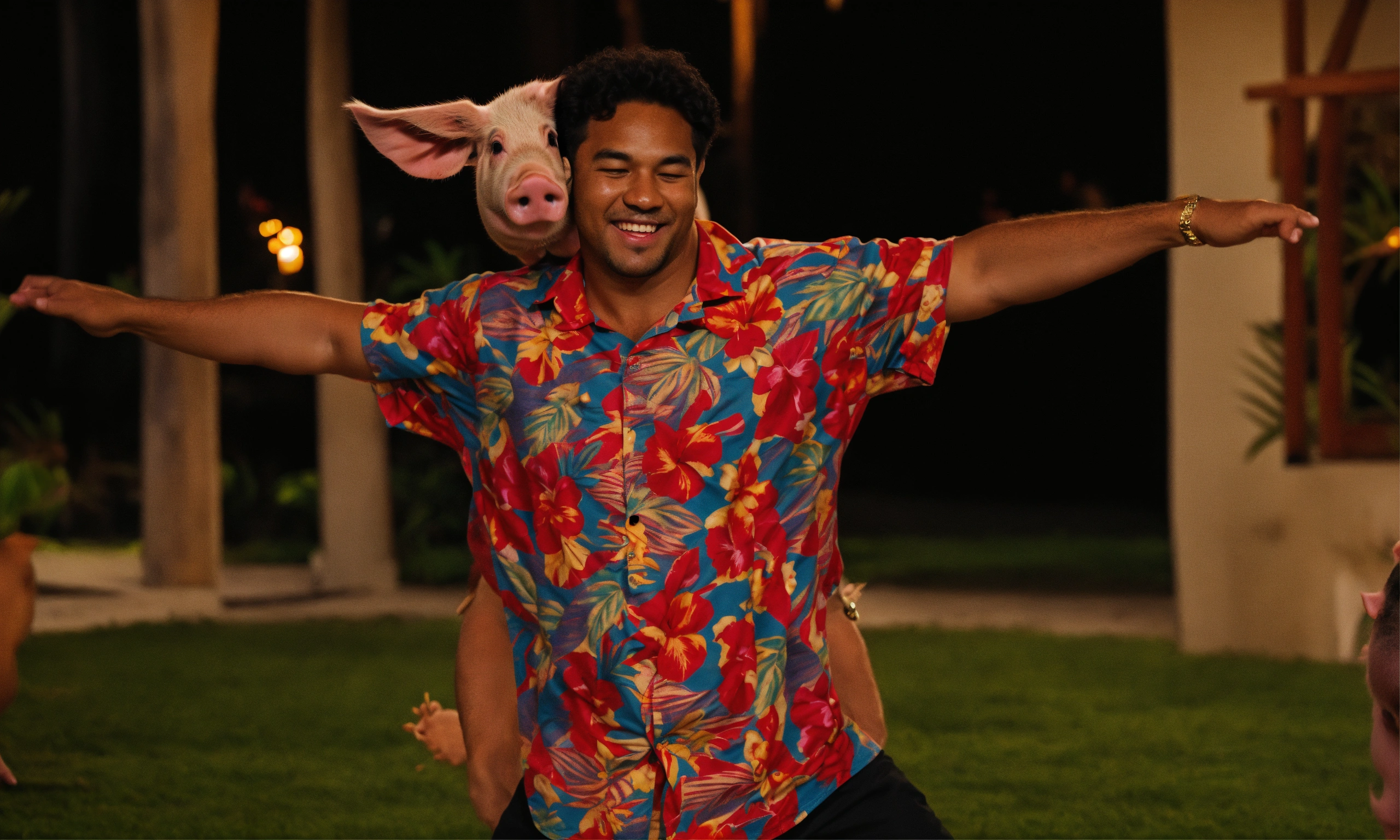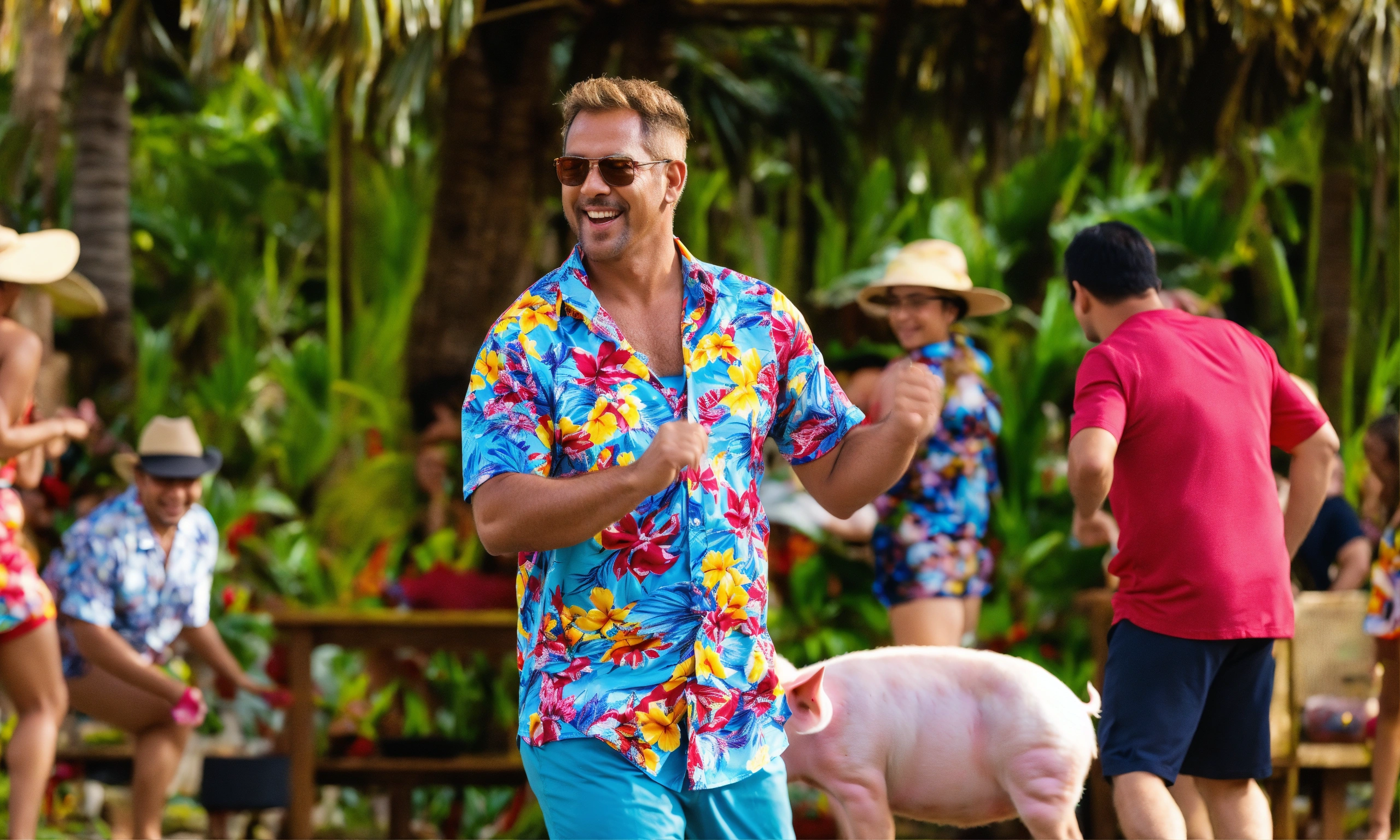 Man in hawaii shirt dancing with a pig