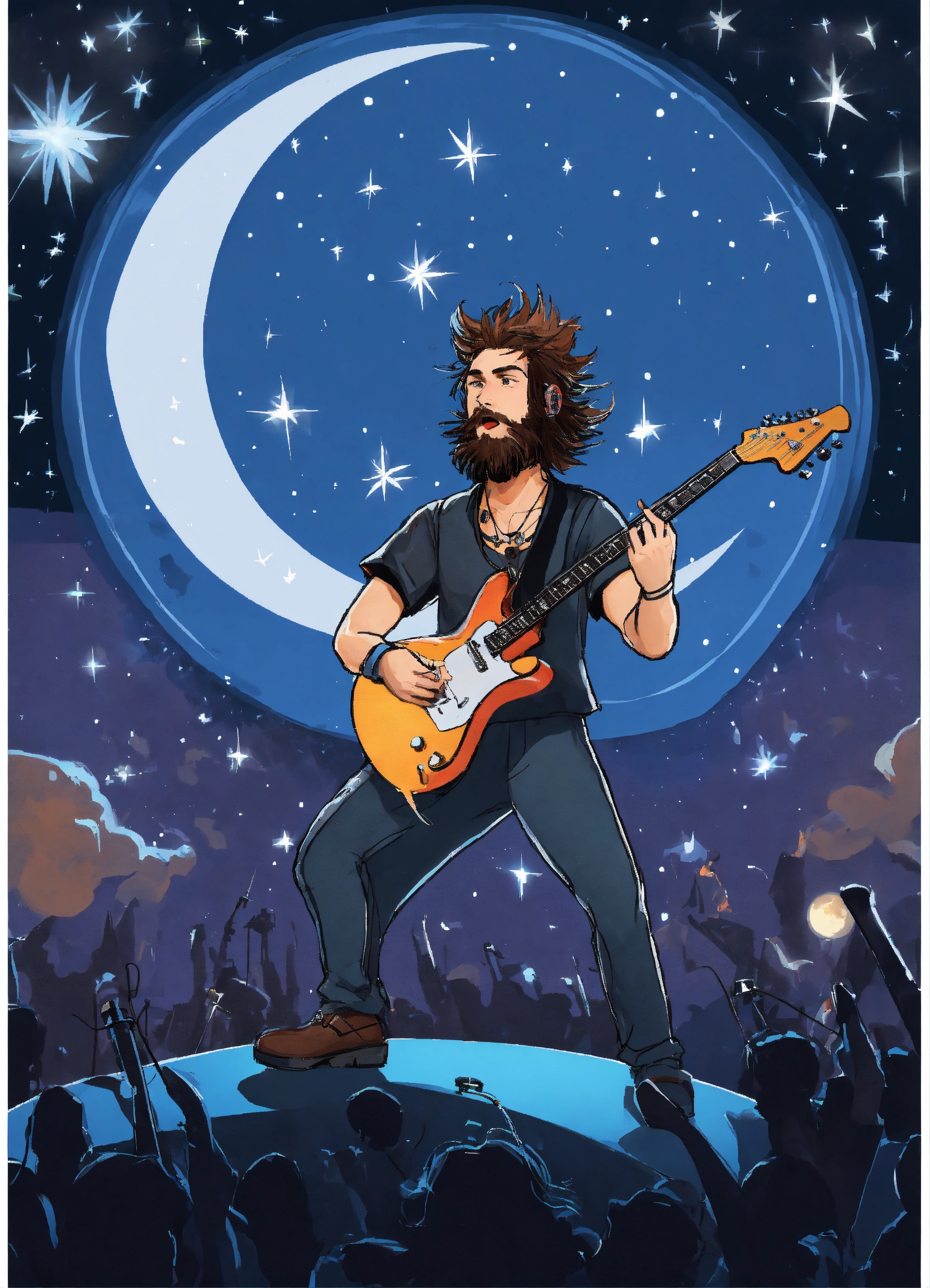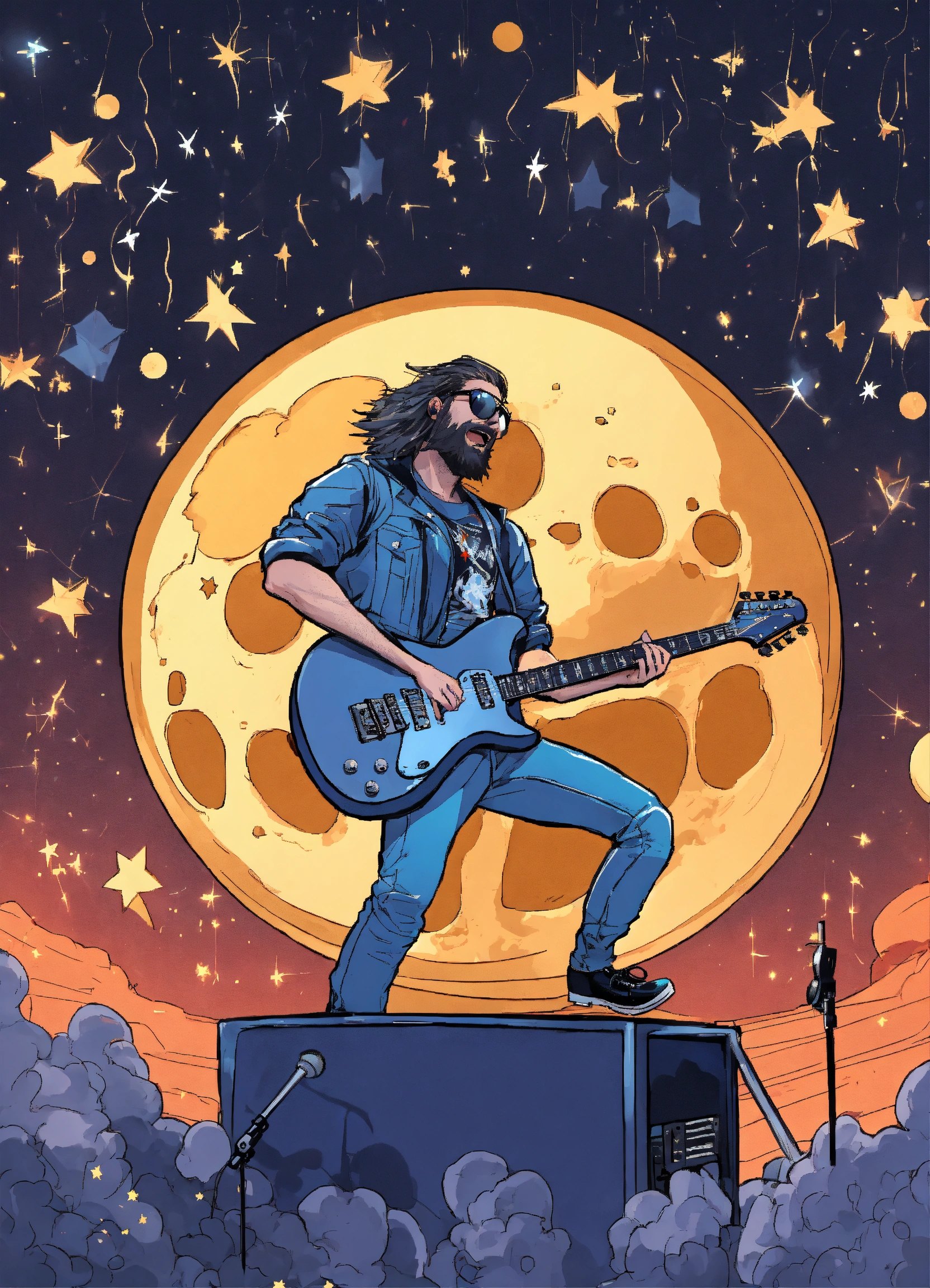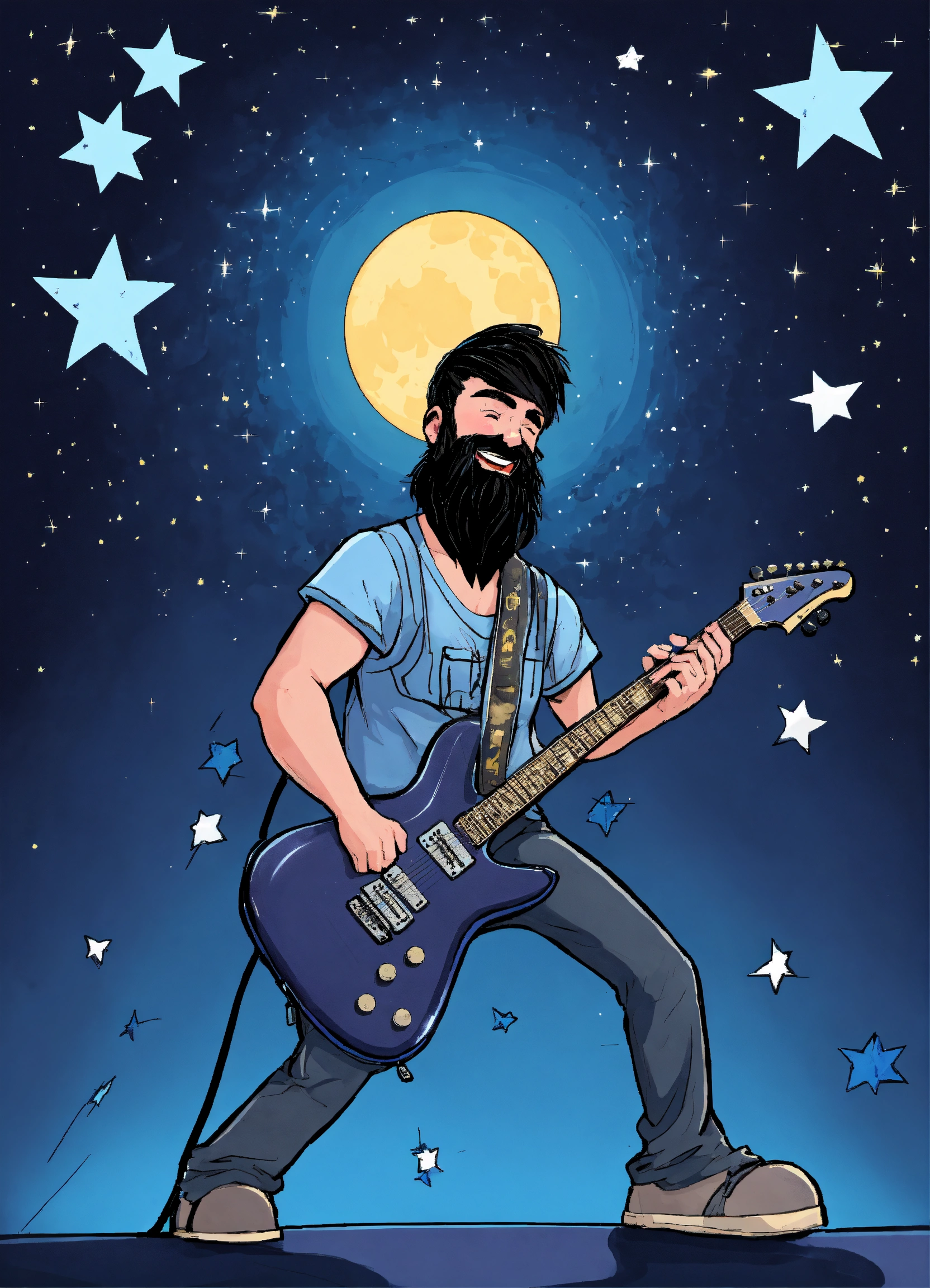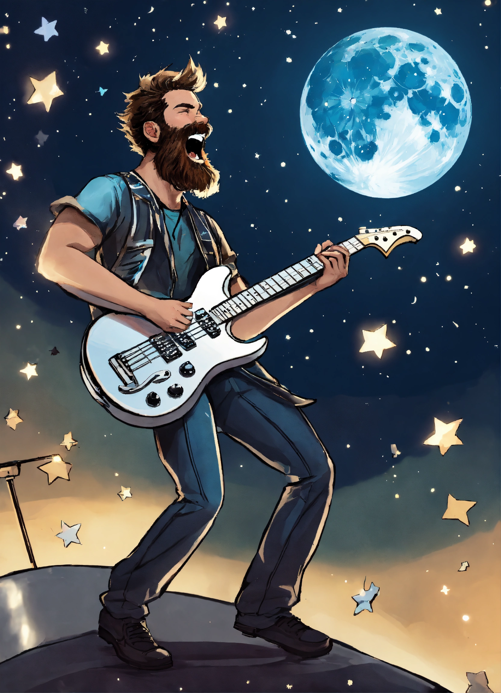 A metal guitar musician cartoon with short beard on stage rocking out in front of the big blue moon with falling stars