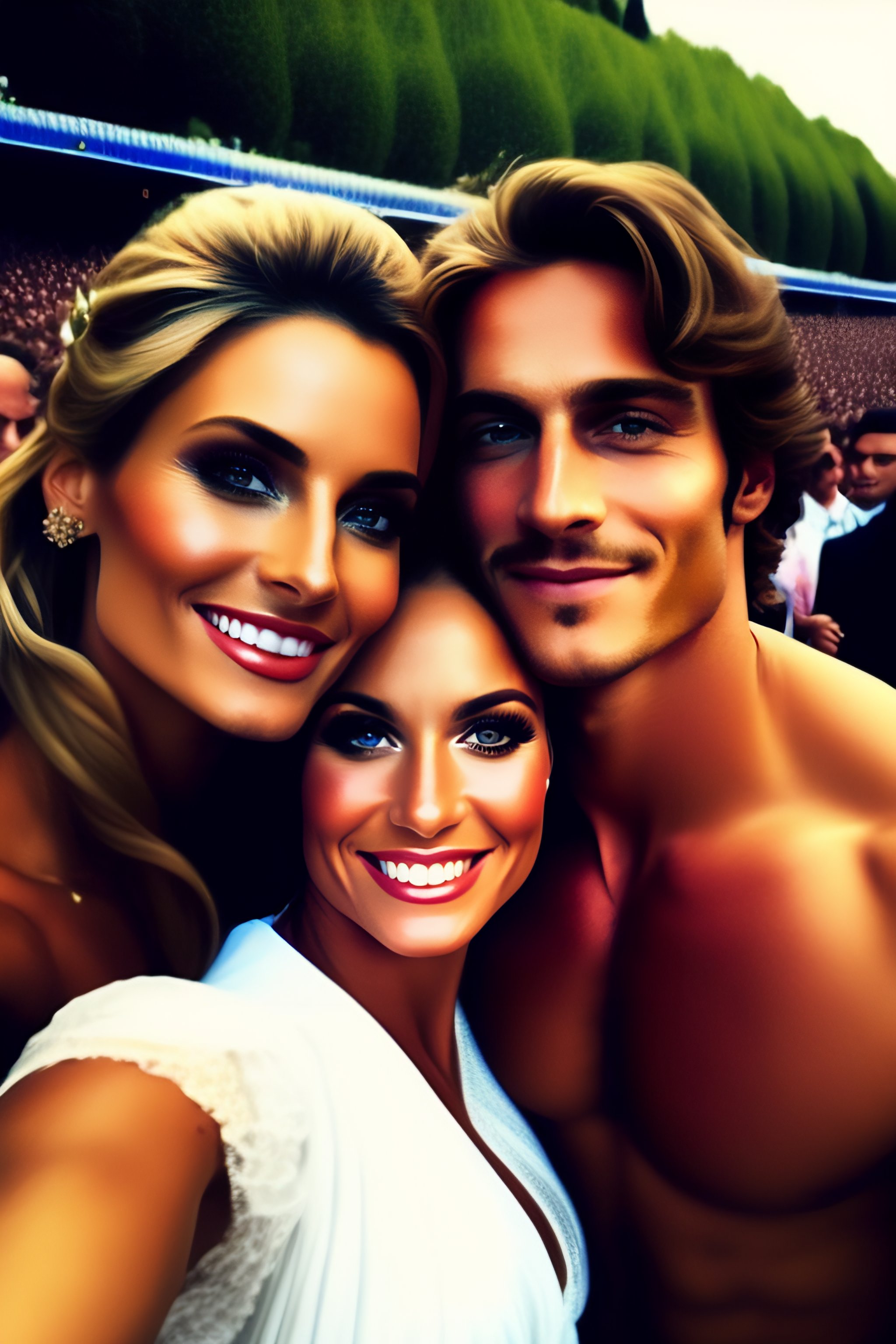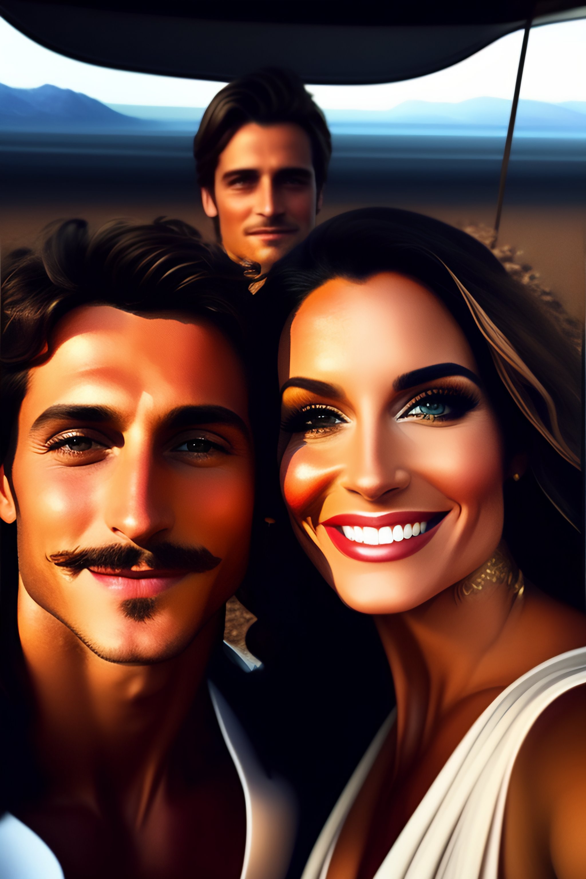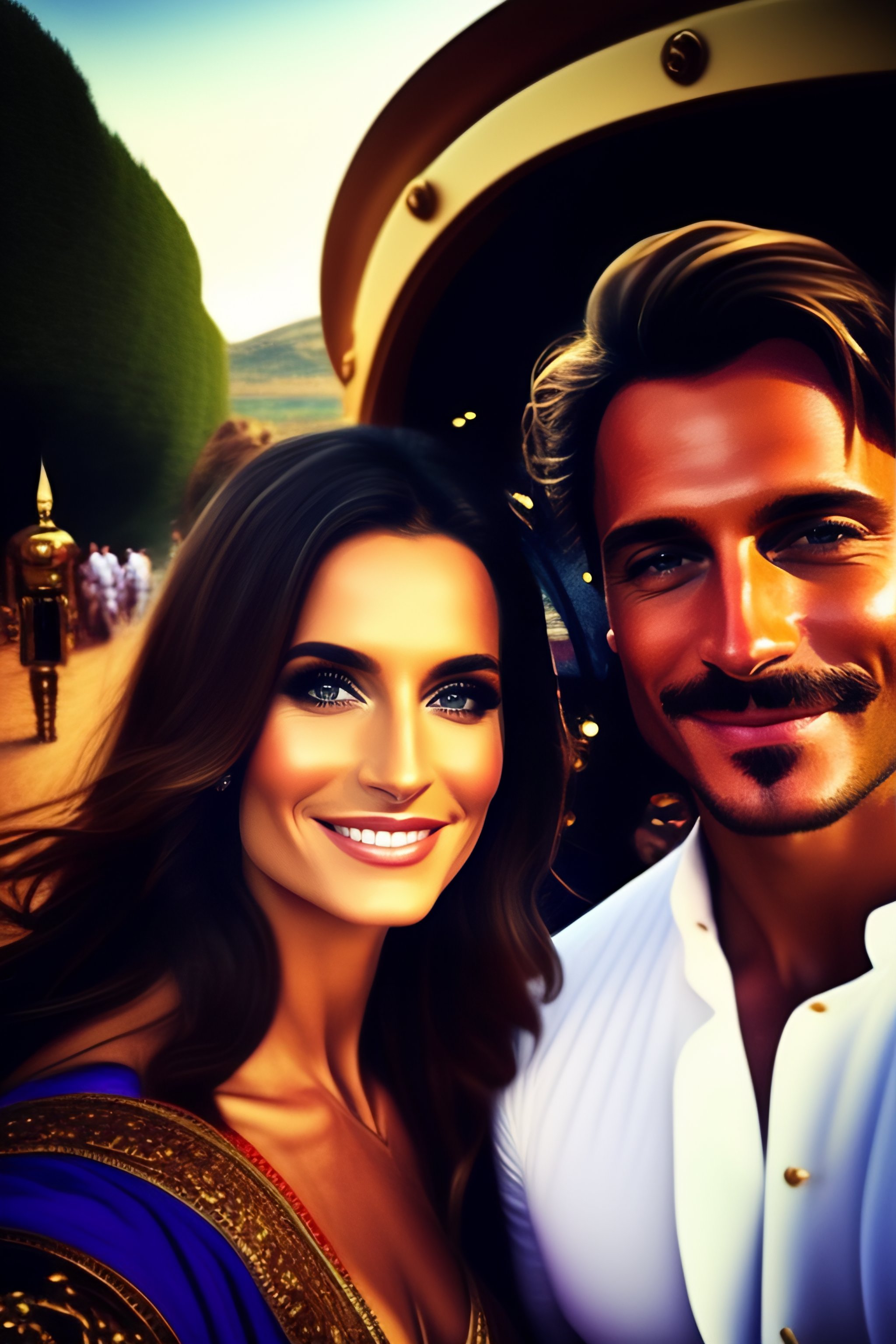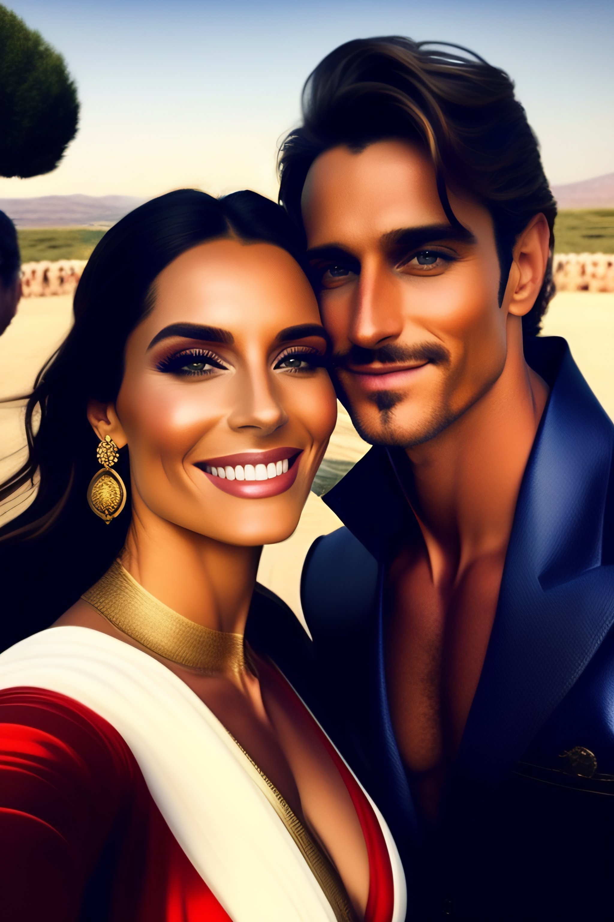 Photo, selfie. prince paris of troy, good looking man, and helen the most beautiful woman, both wearing greek clothes, looking straight to the camera and smiling. as they leave sparta in the ship to troy.