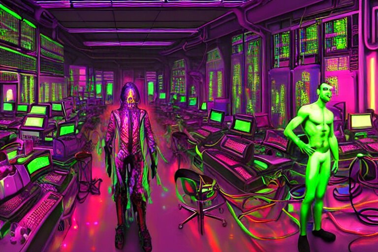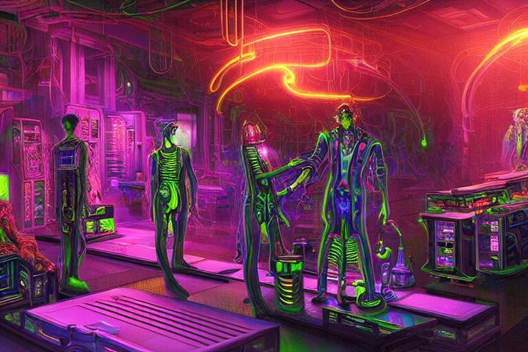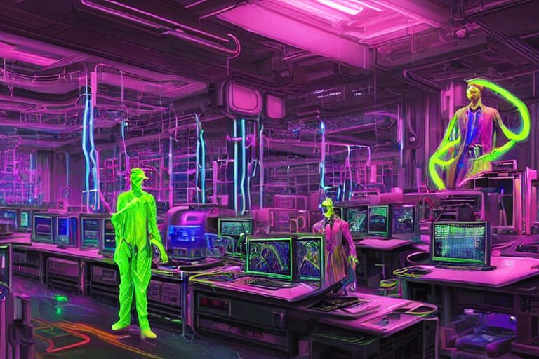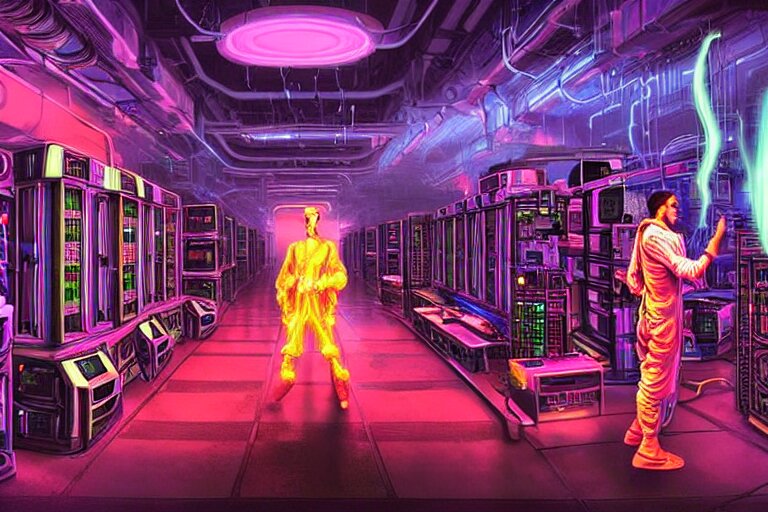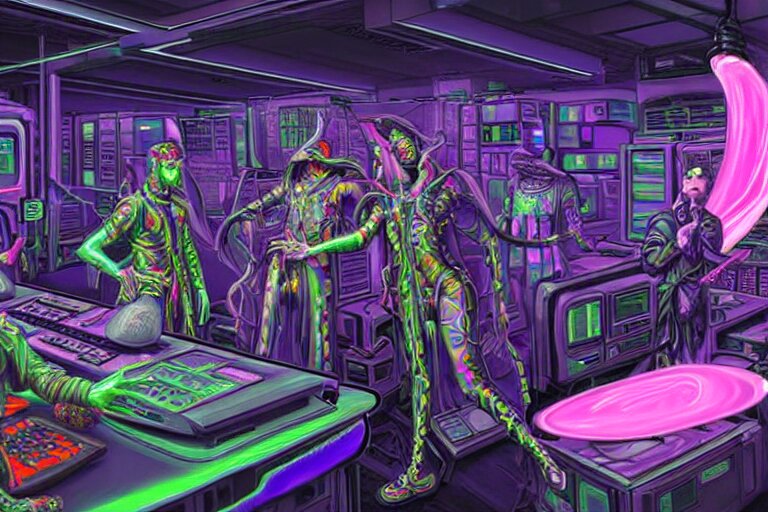 ( a highly detailed beautiful masterpiece painting of a technomagical laboratory cluttered with computers and arcane components. in the middle of the room a technomancer wizard in dazzle camouflaged robes discusses sentience with his synthesized ai djinn. behind them is a large supercomputer. the room is lit with dayglo pink and dayglo blue. ) ( by remedios varo! and anato finnstark and greg rutkowski and andy warhol and francis picabia ) ( dayglo pink, dayglo blue, prismatic, pearlescent white, raven black, glowing, hyperrealism ) ( 8 k, trending on artstation )