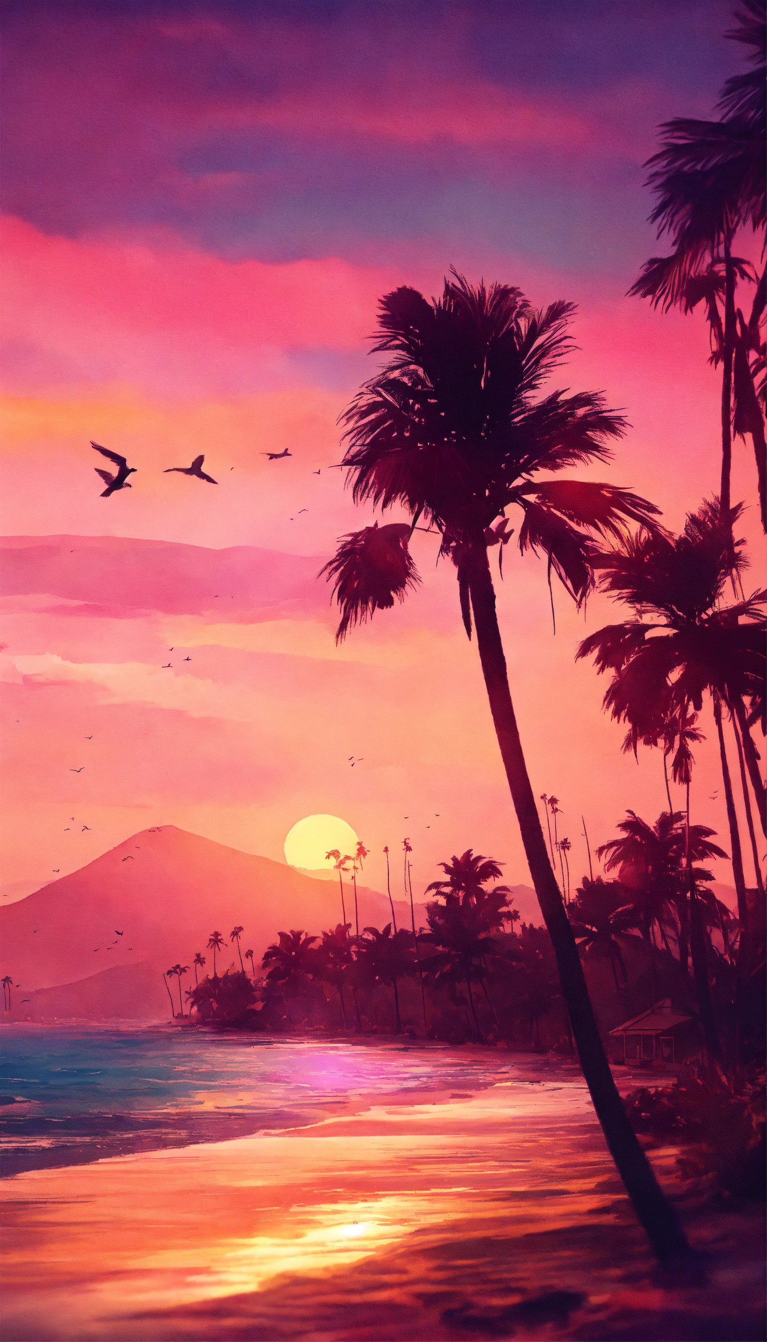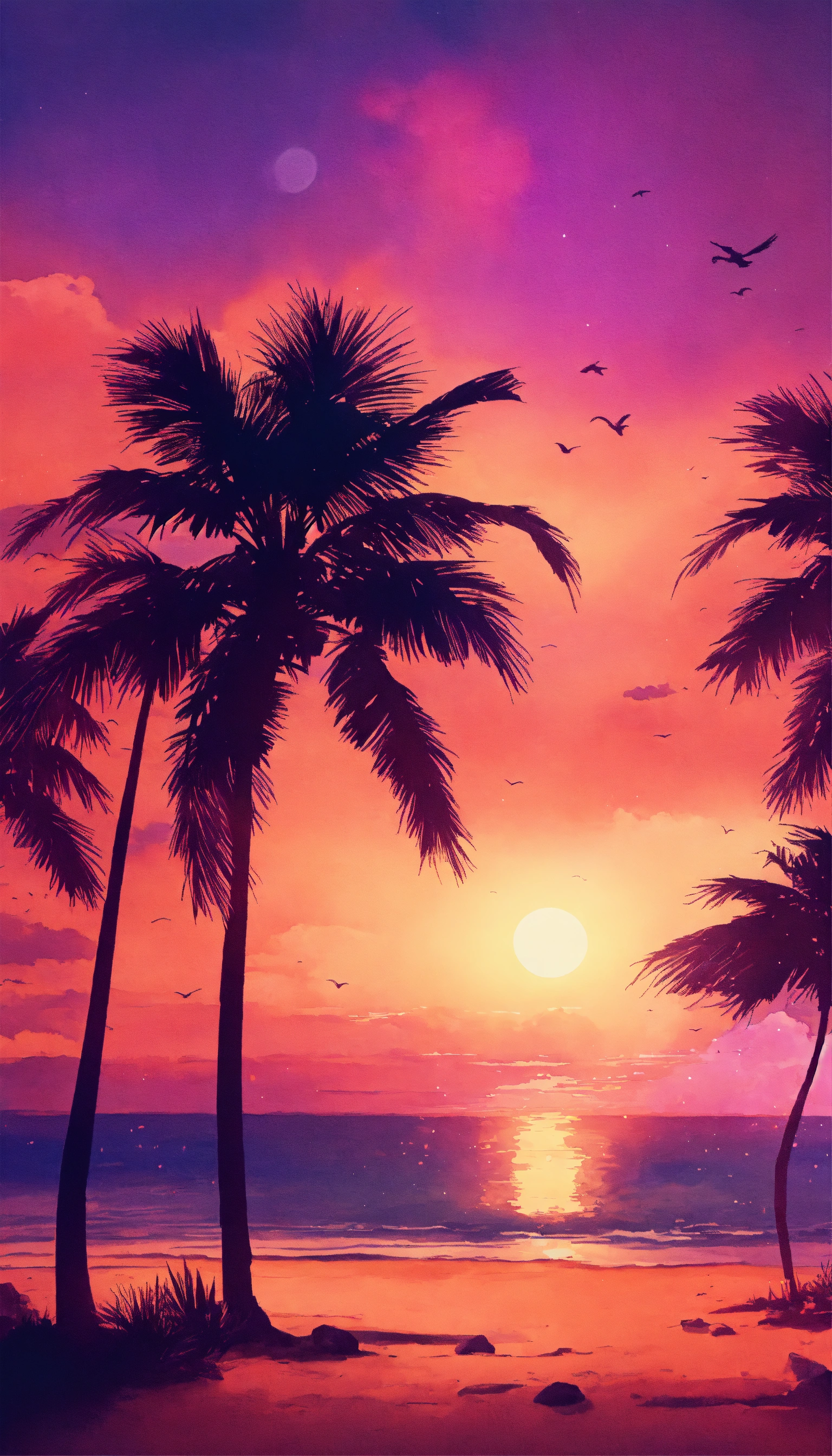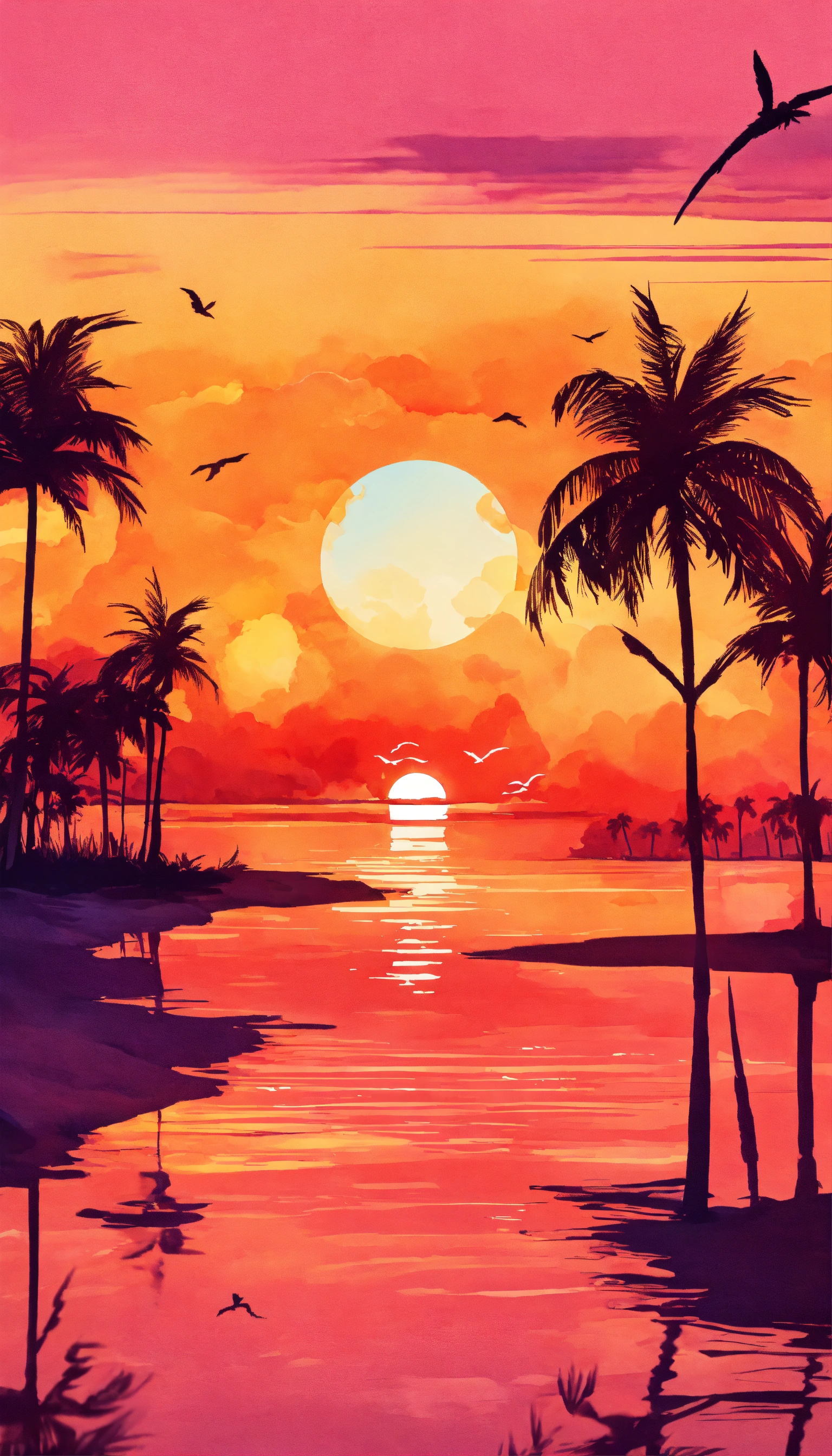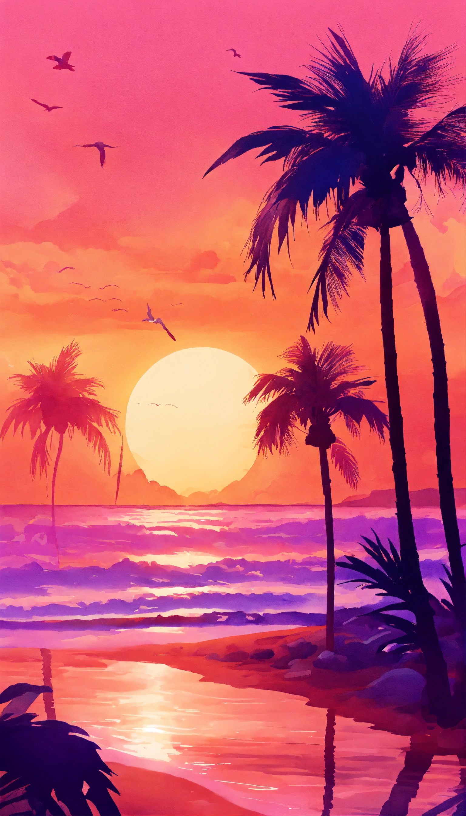 Beach scene with a vibrant orange and pink sunset, silhouetted palm trees swaying in the breeze. vintage design, in the style of watercolour, 3d vector art, watercolor effect, bokeh, hand-drawn, digital painting, low-poly, soft lighting, bird's-eye view, isometric style, retro aesthetic, focused on the character, 4k resolution, photorealistic rendering.