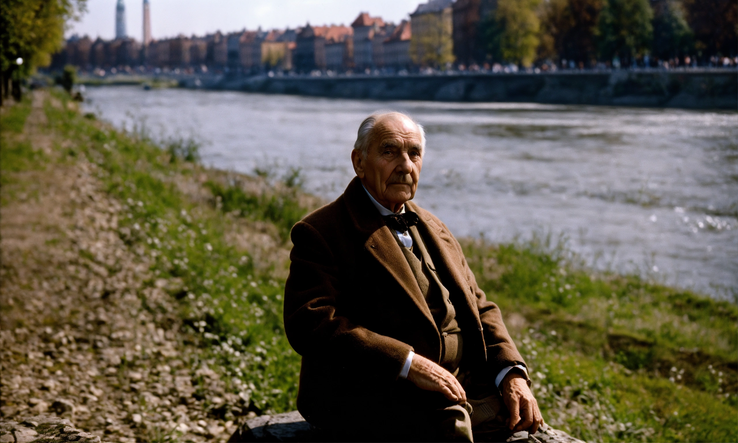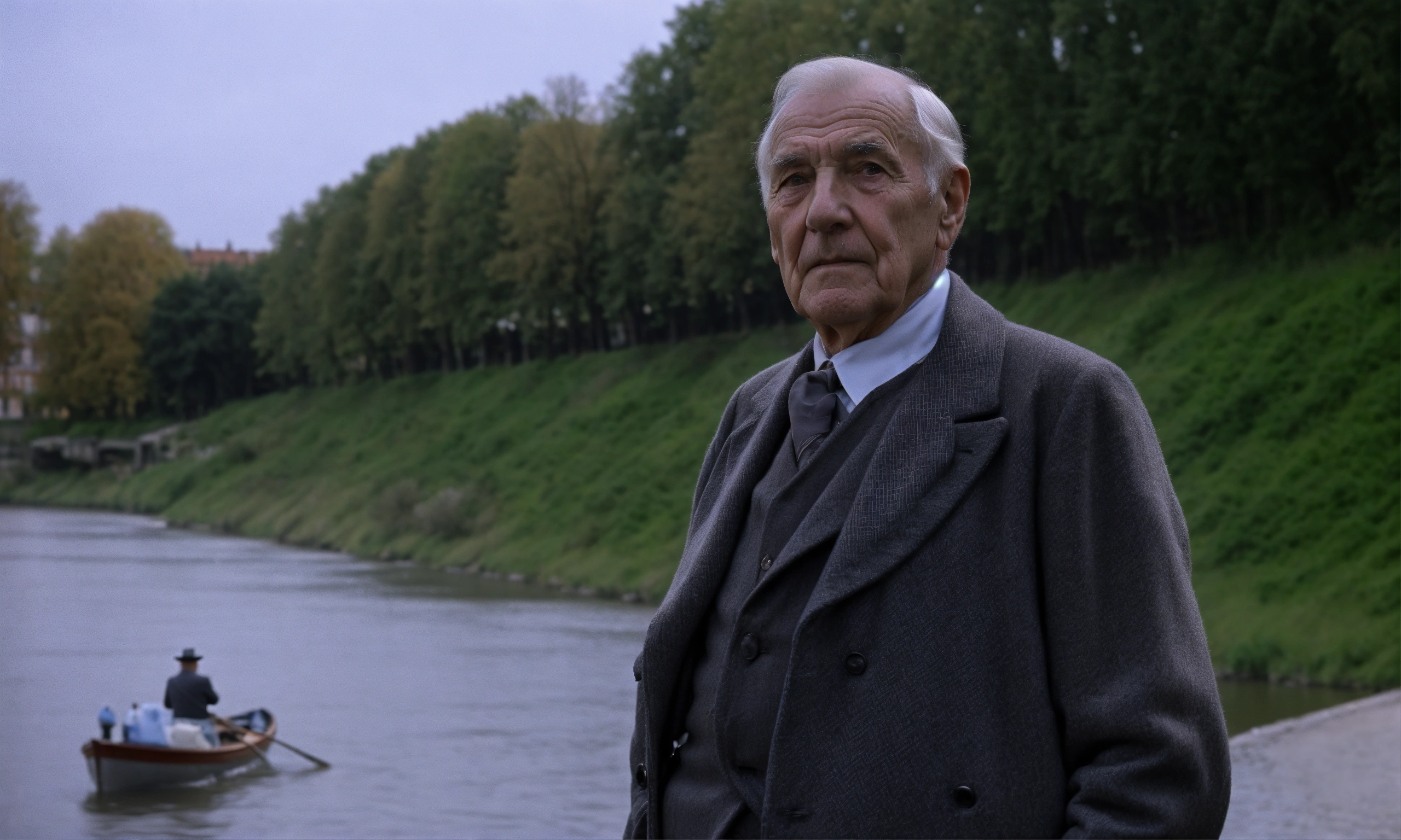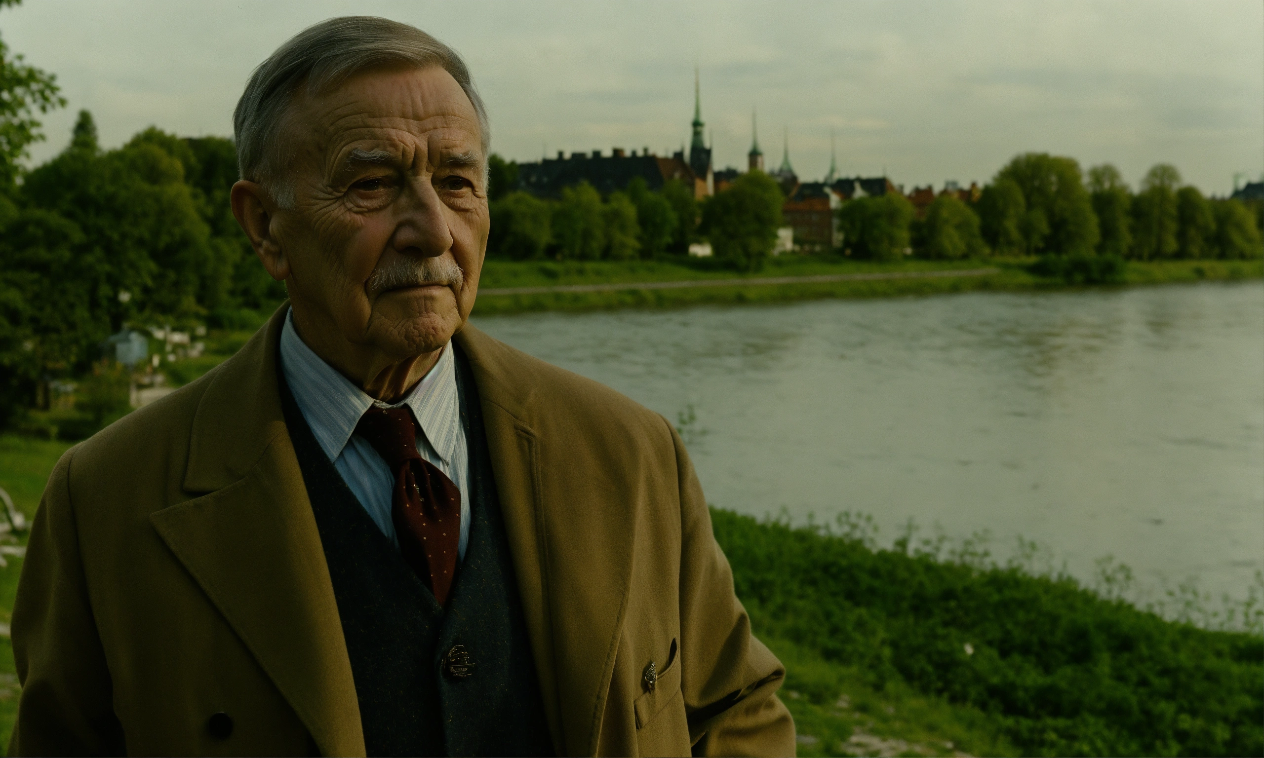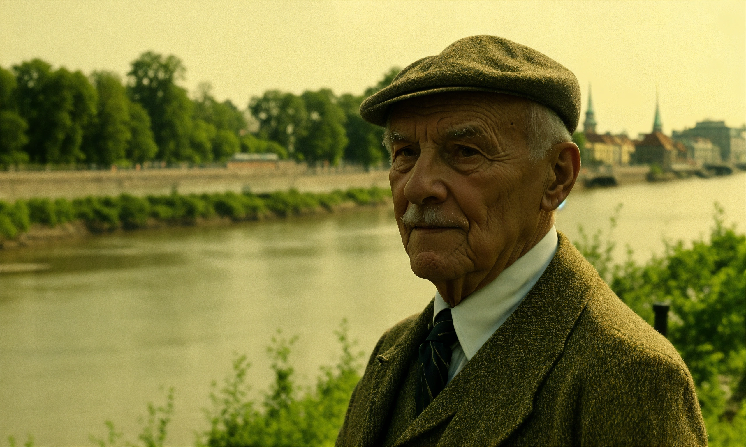 Retro warszawa 1920-1930, elderly gentleman, by the river, looks at the camera at half height, short hair.