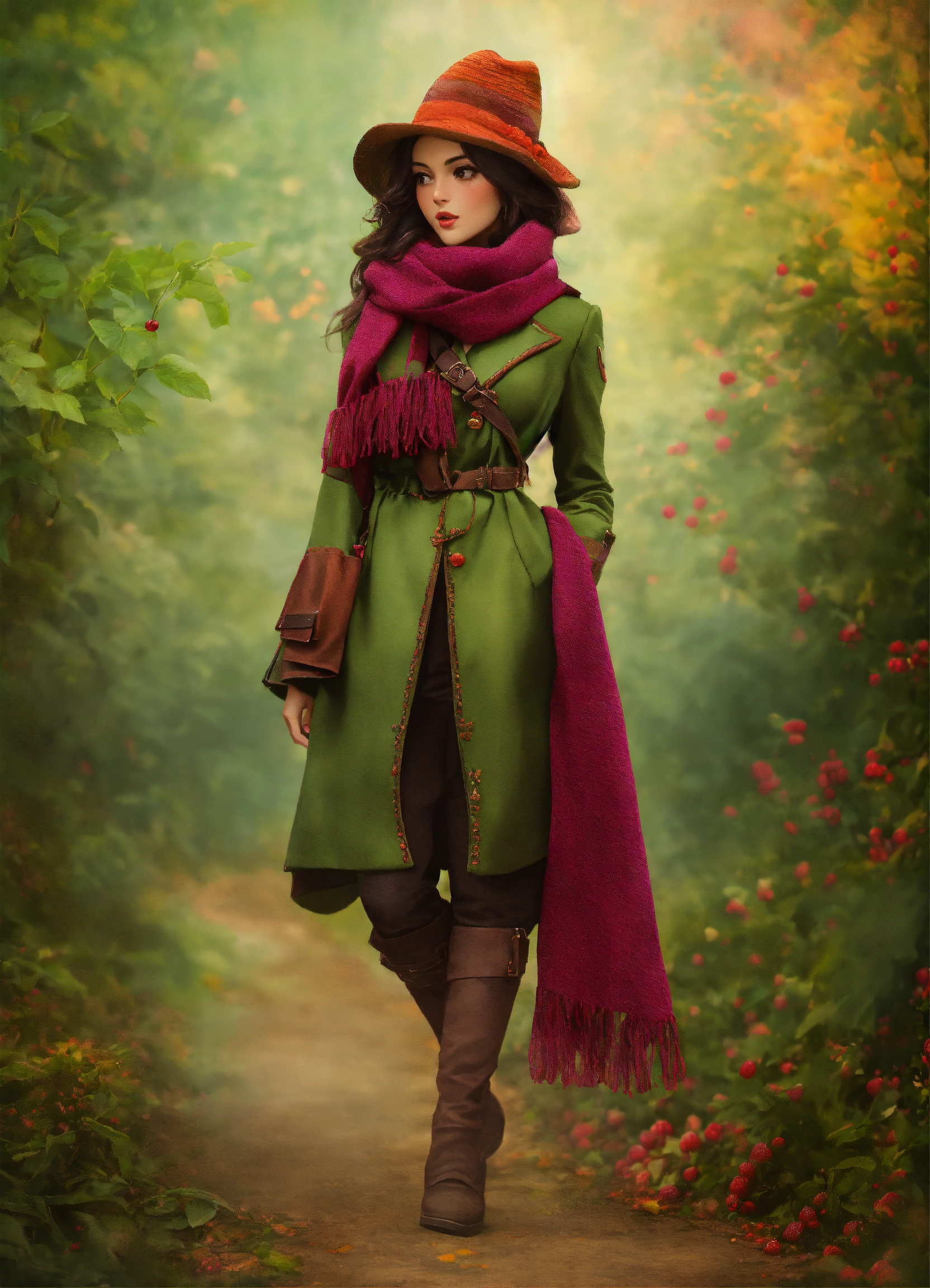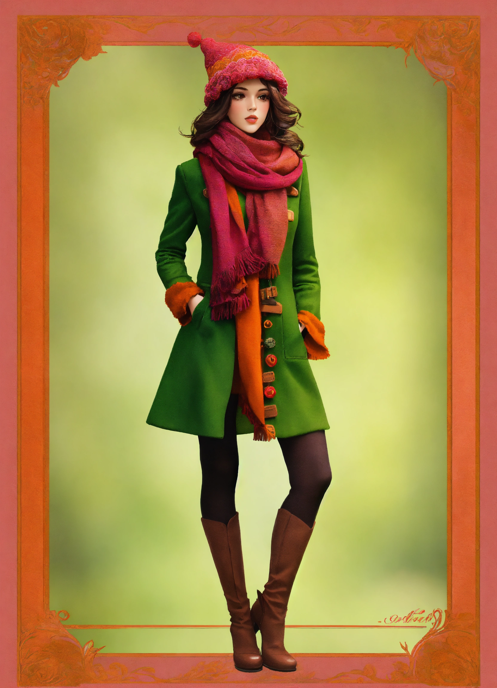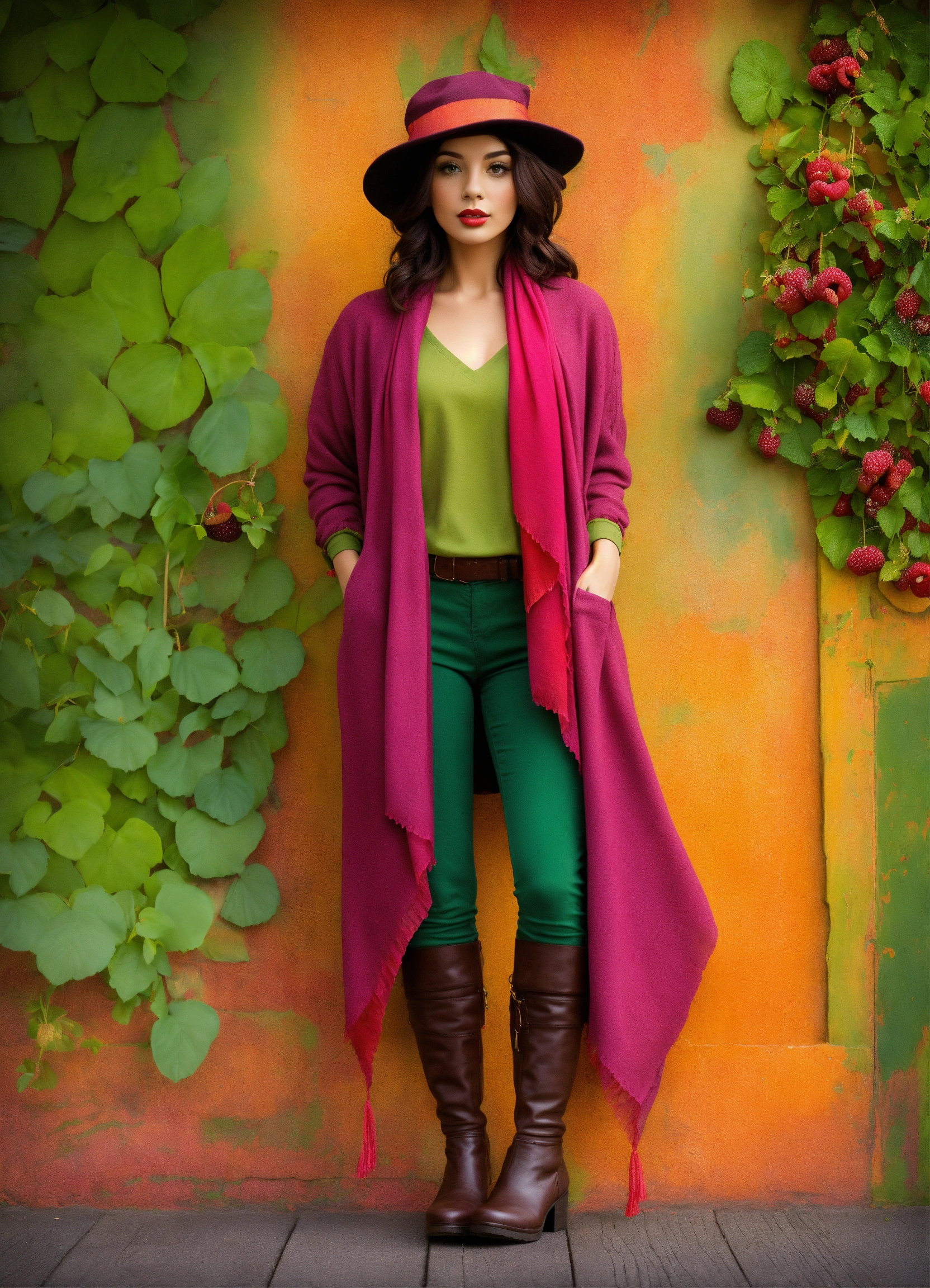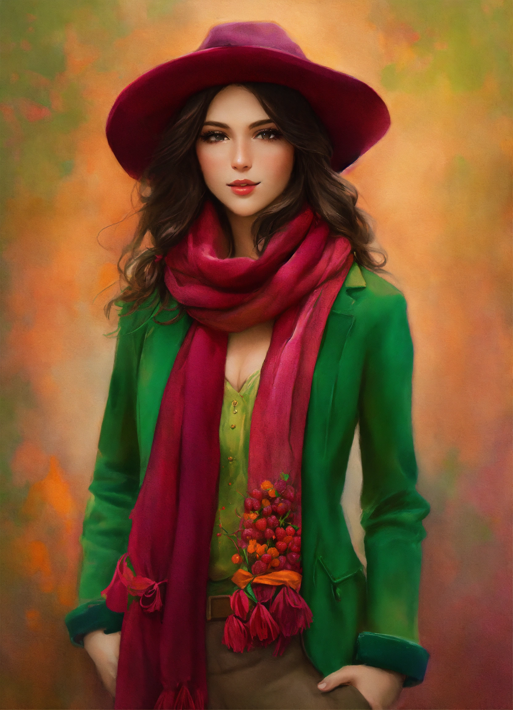 Text full body, brune whimsical woman, green and raspberry colors, raspberry and orange scarf and hat, romance, whimsical.