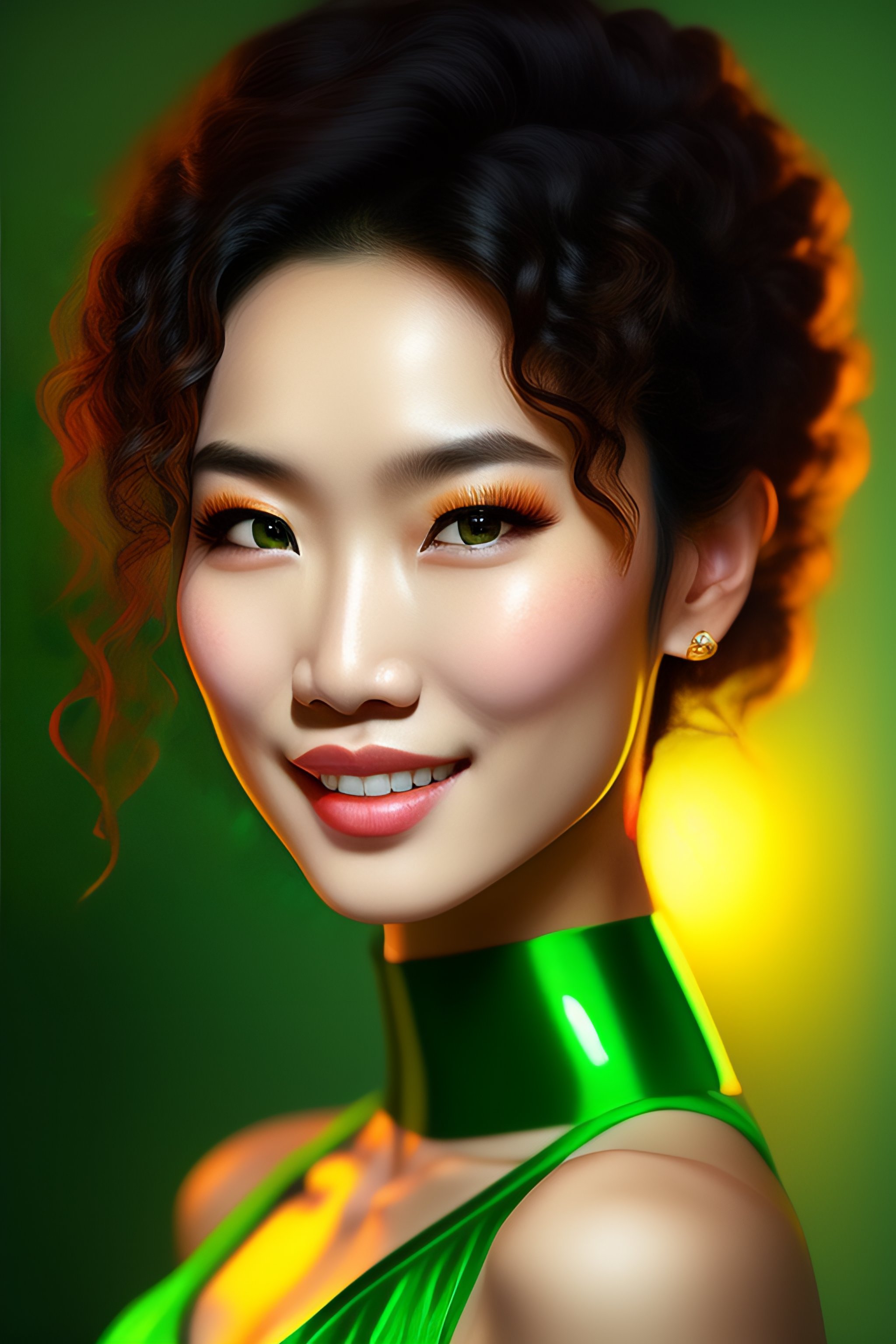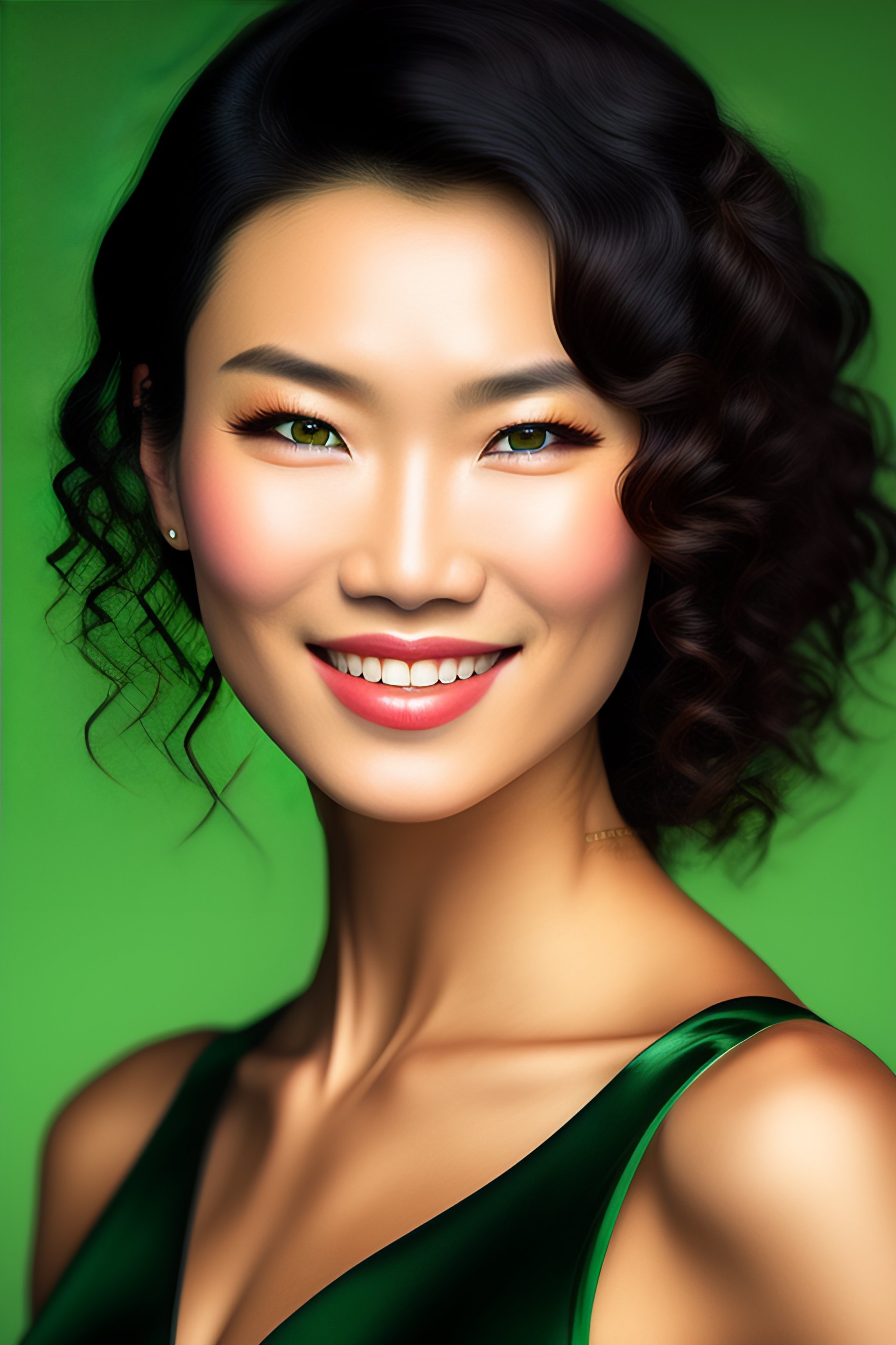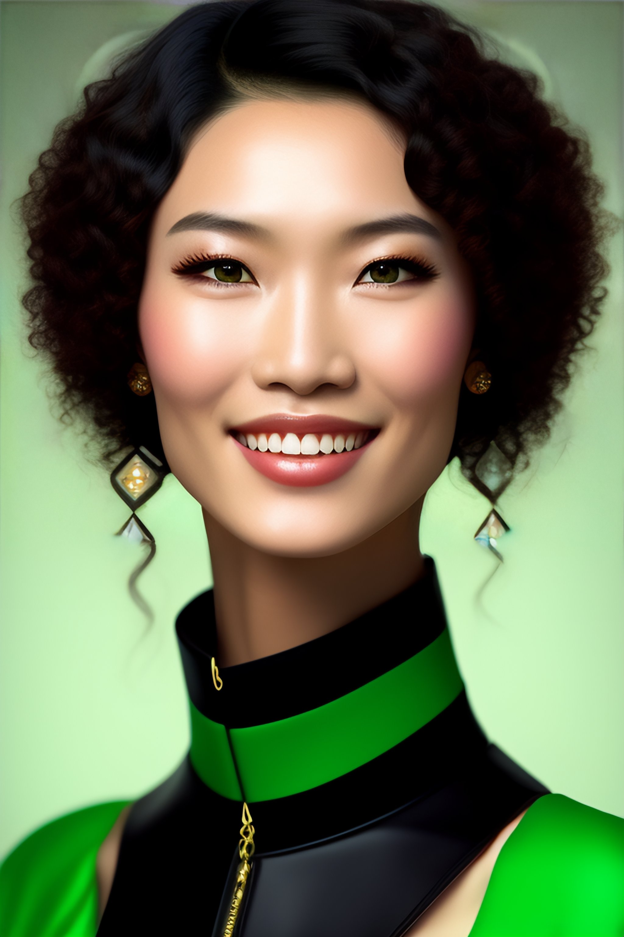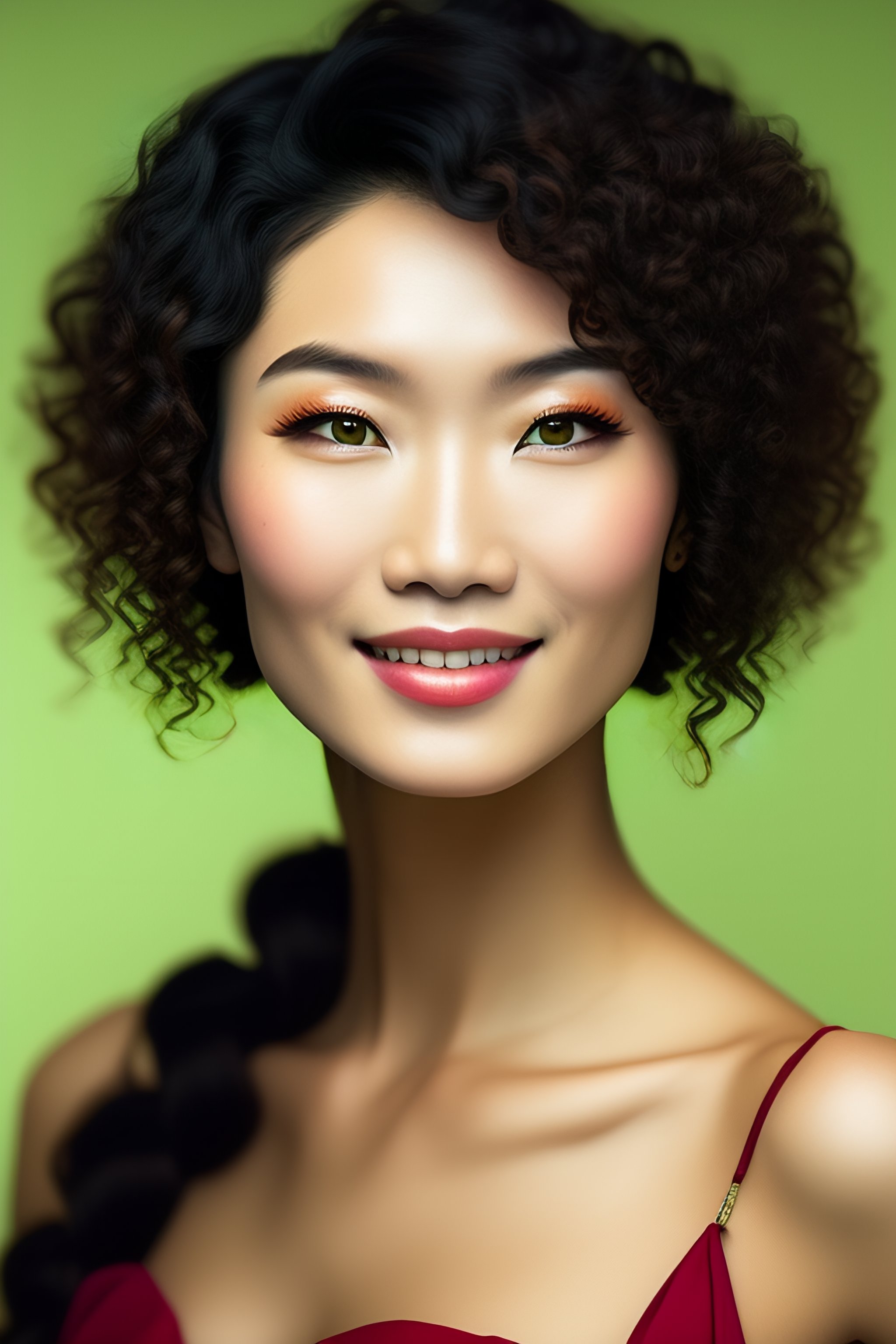 Caucasian woman, short concave flat asian nose, upturned light green eyes, thin lips, smiling with braces, well-rounded face, semi-arched eyebrows, long eyelashes, curly black hair