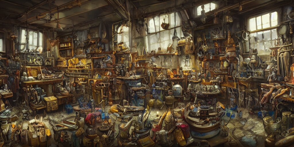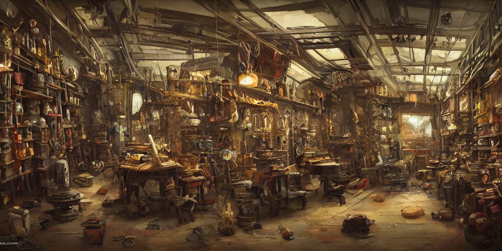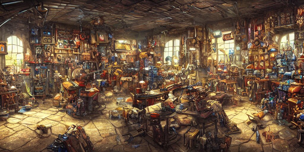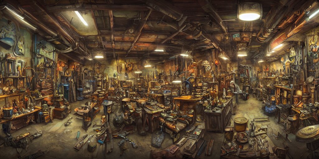 Inside an old weapon shop, fantasy vendor interior, wide angle, highly detailed, rich bright colors, trending on artstation