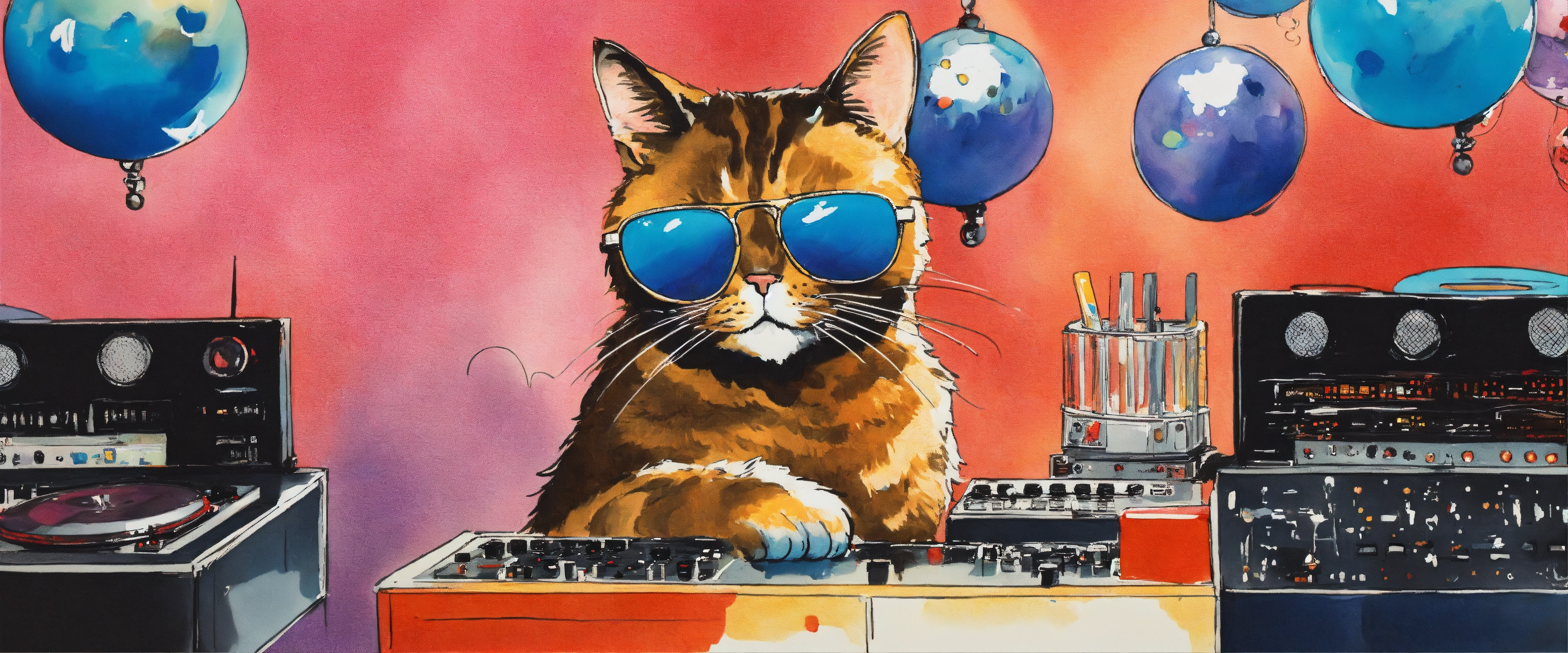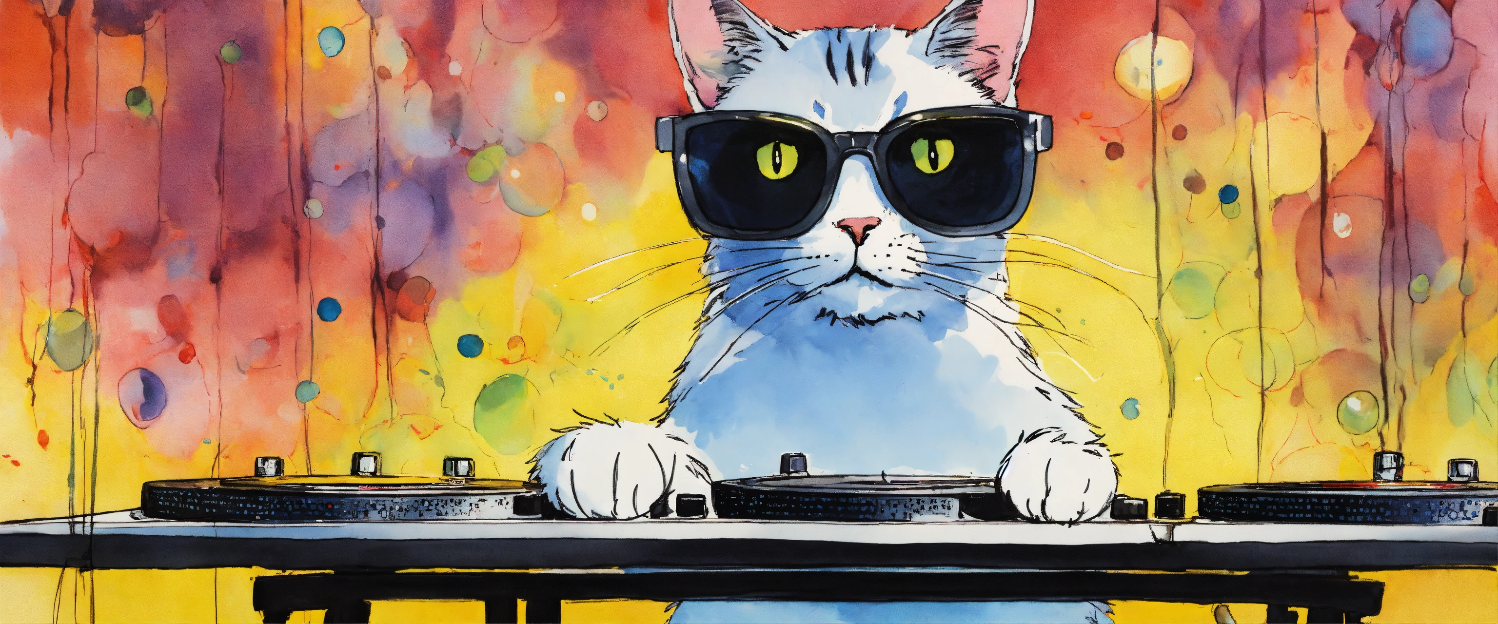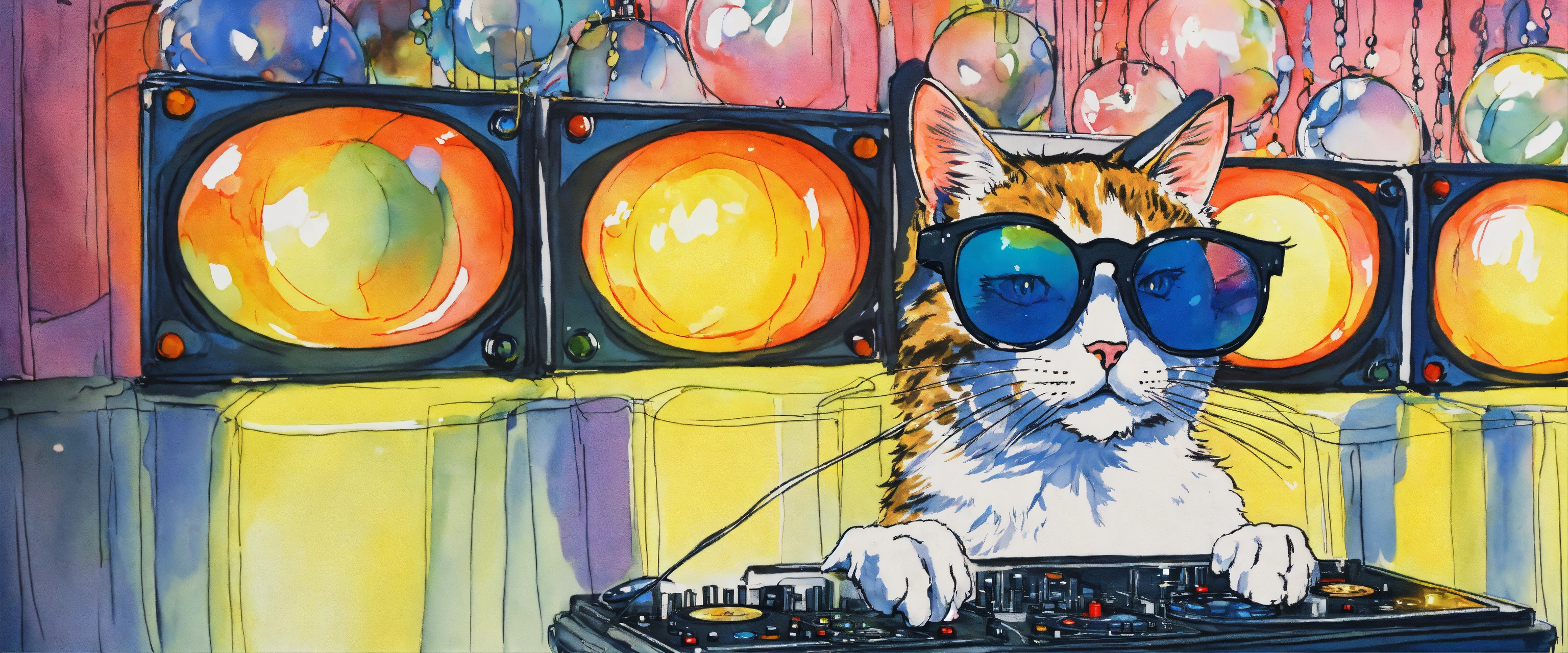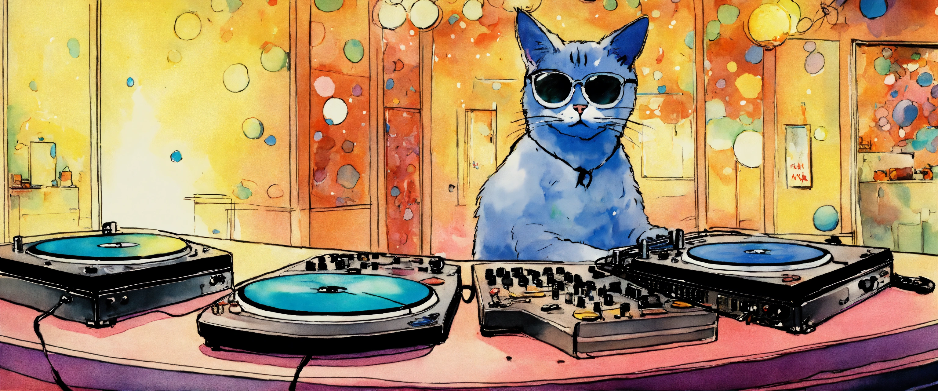 A male cat with djing sunglasses at a club with mirror balls, watercolar, by hayao miyazaki quentin blake patricia polacco dan santat