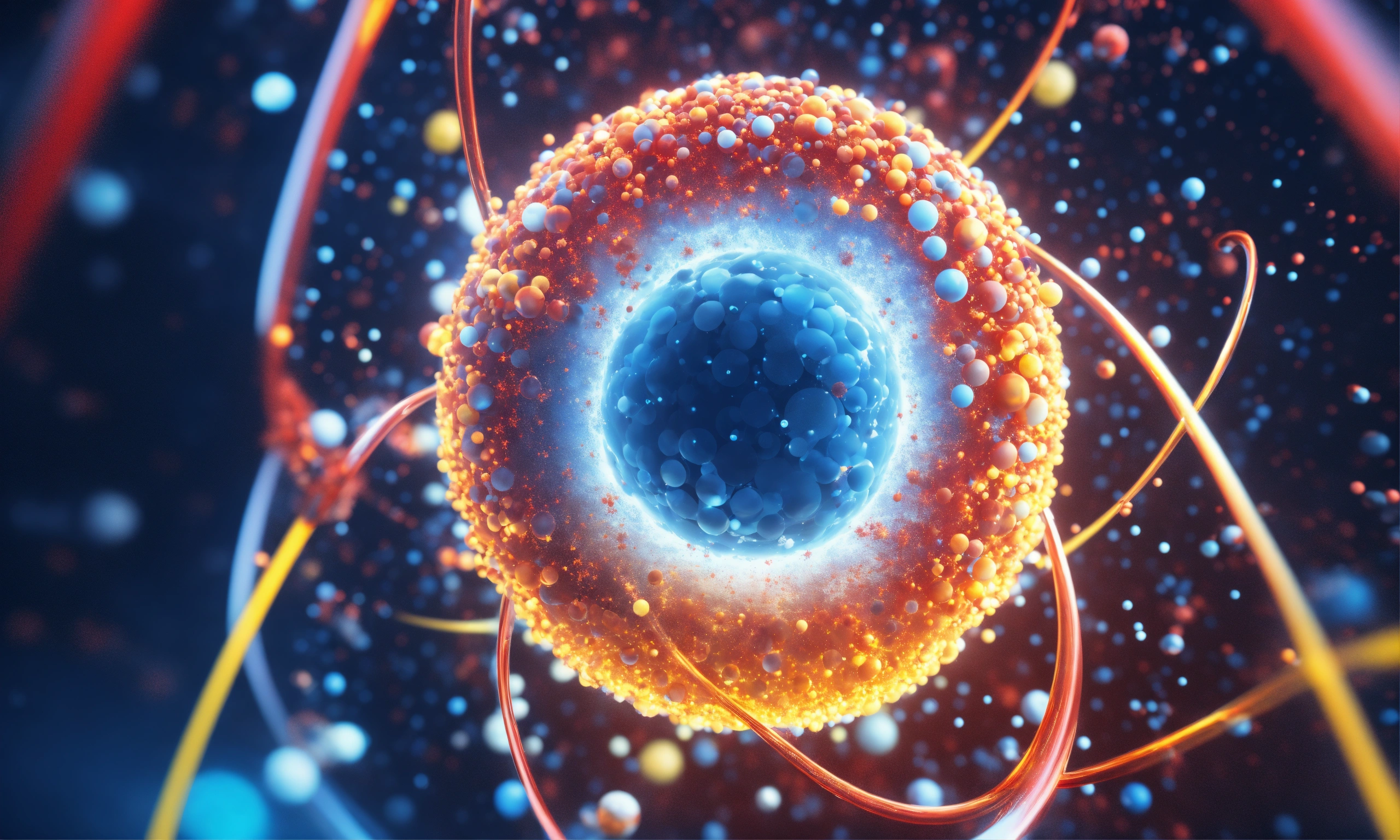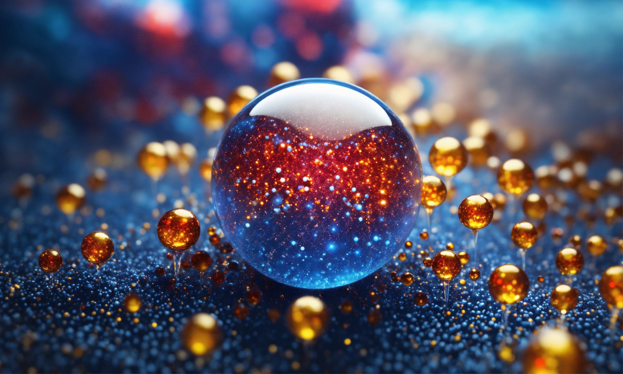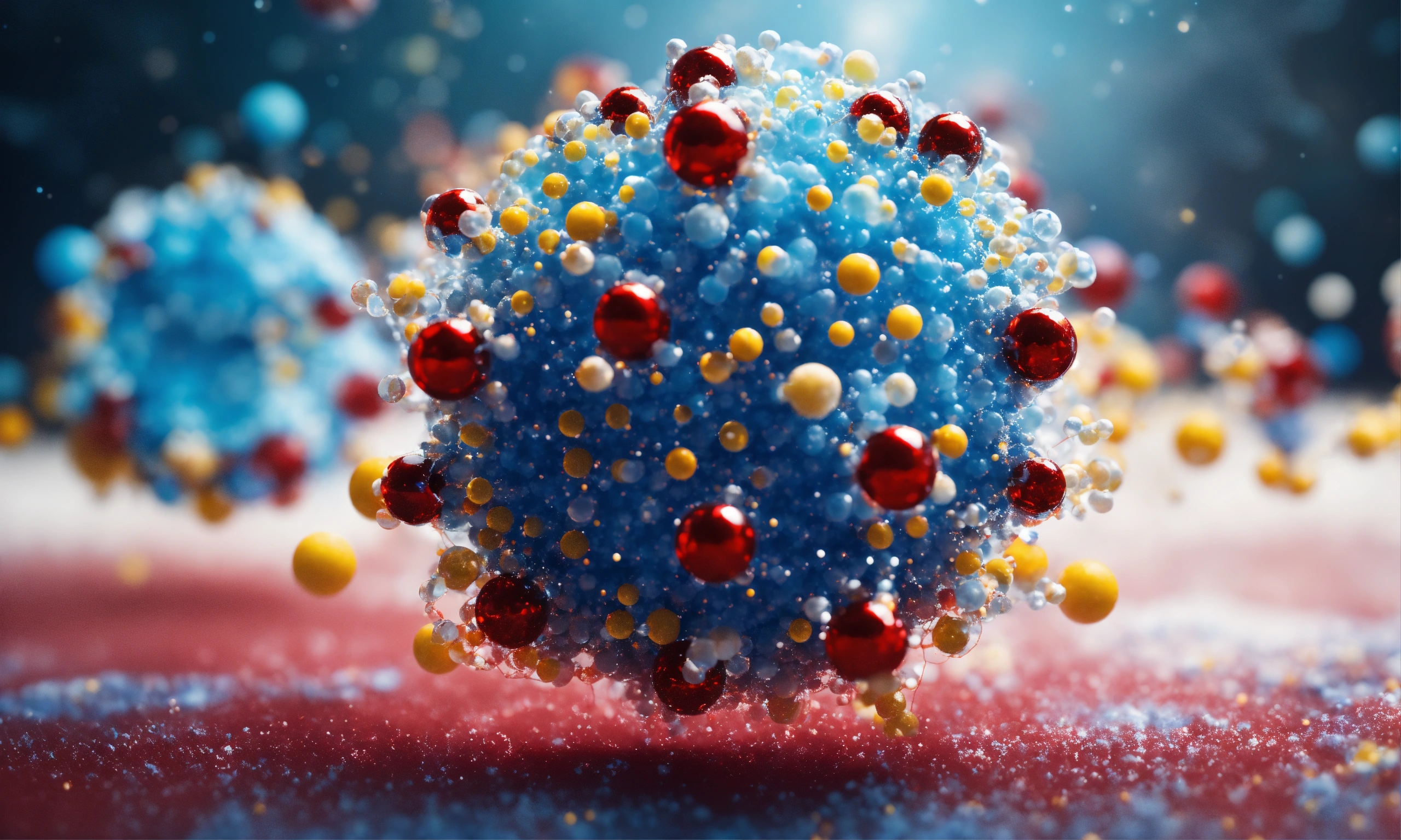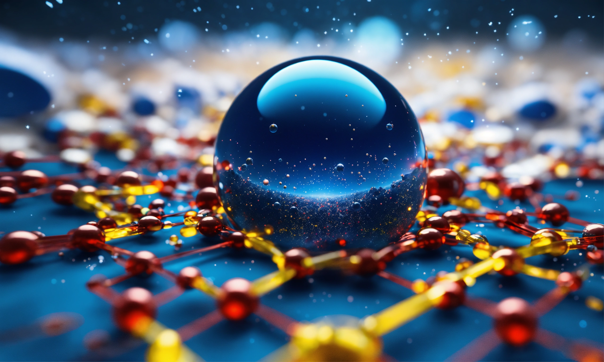 A single molecule in blue and white with a hint of red and yellow particules in perspective with a depth effect in a futuristic, hyper-fast-space style, white color background