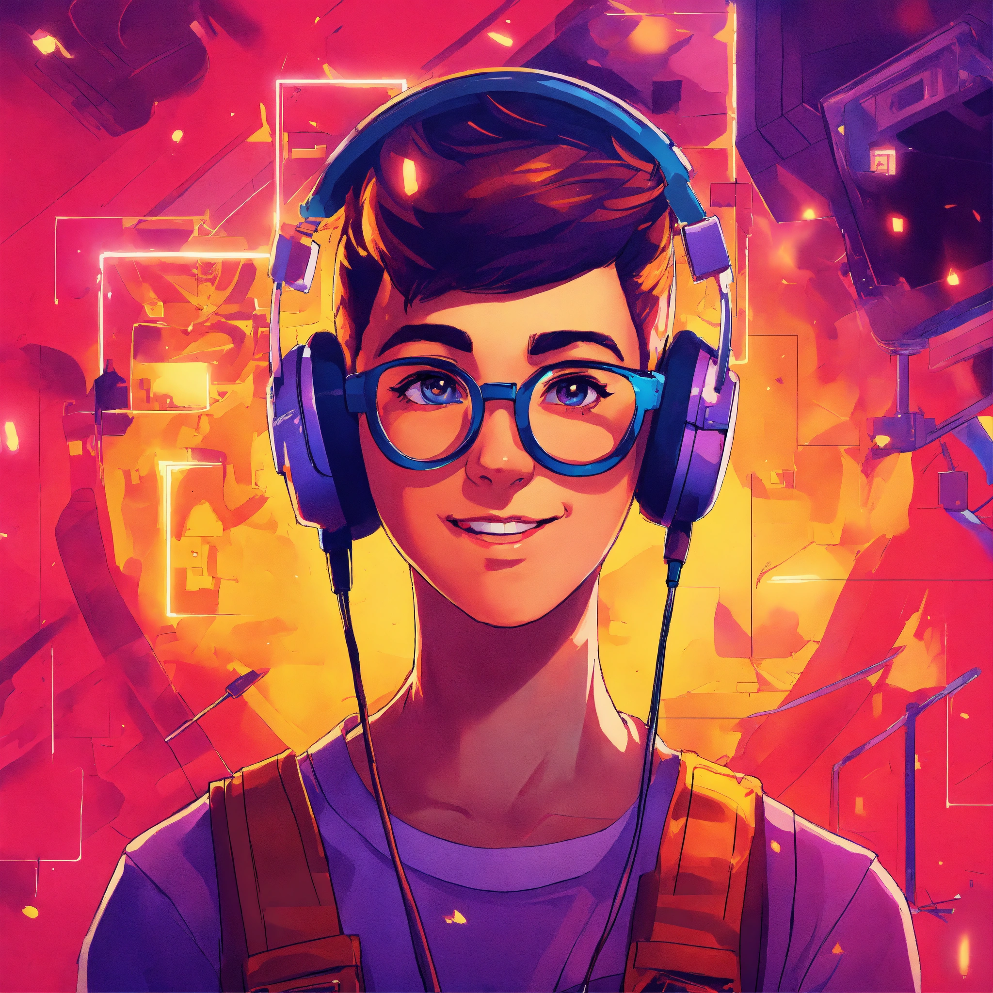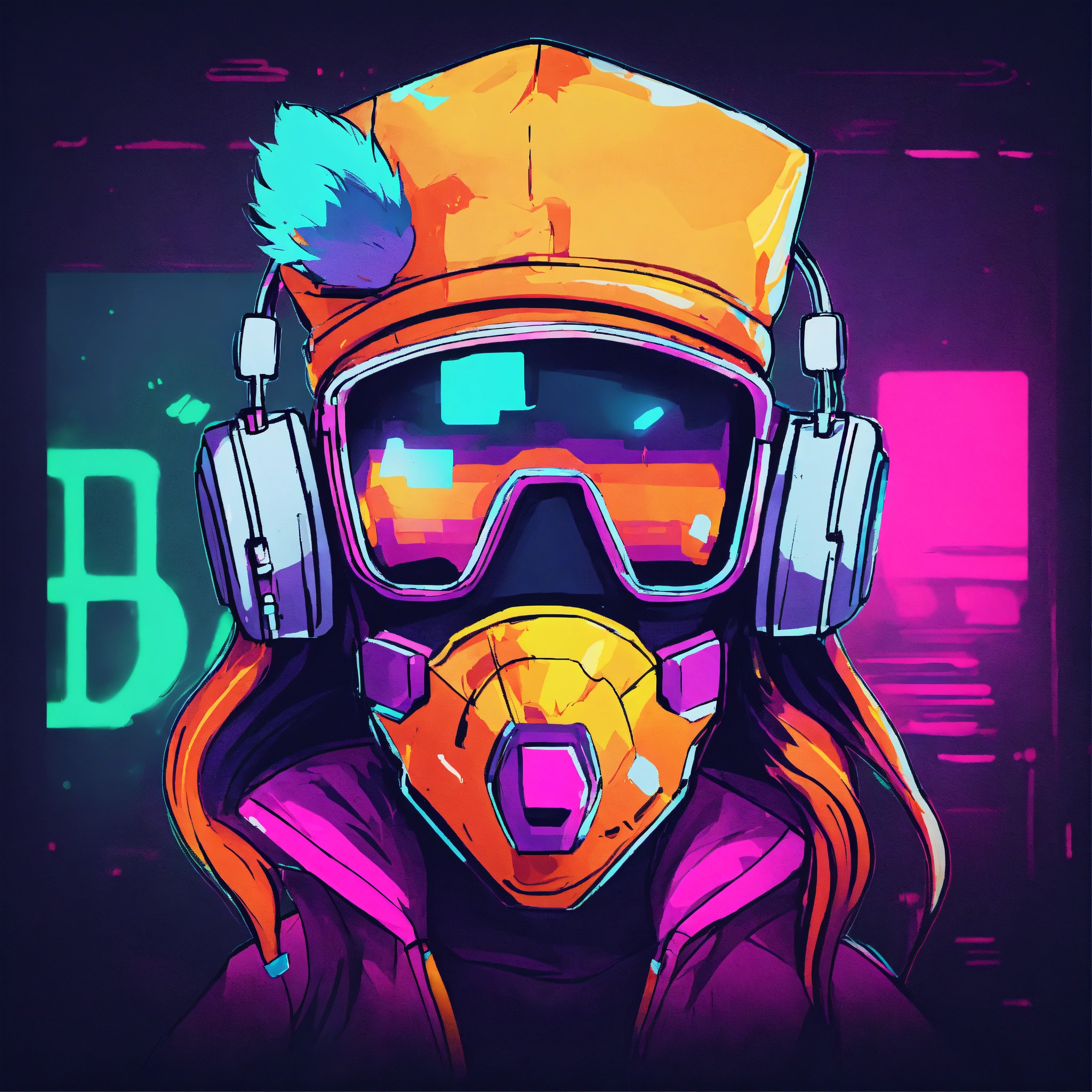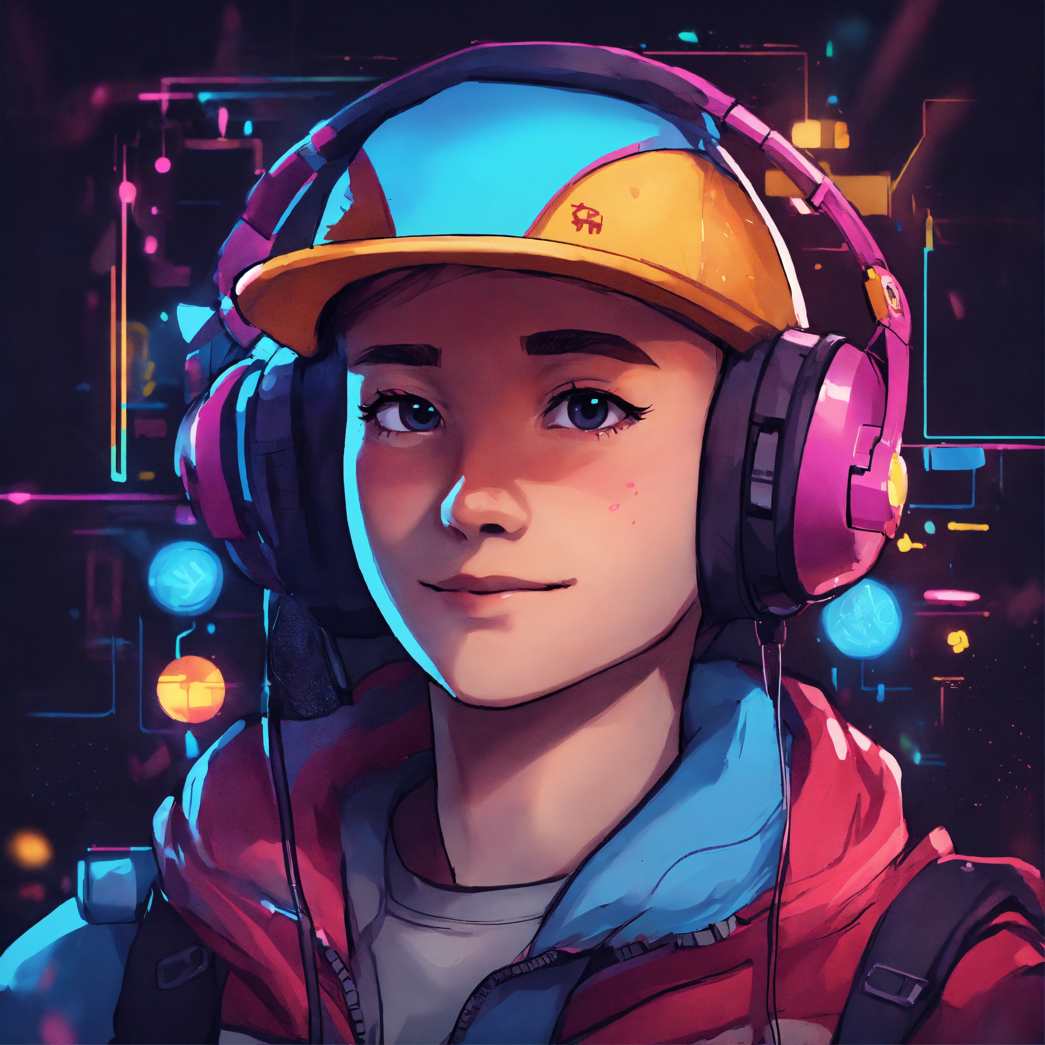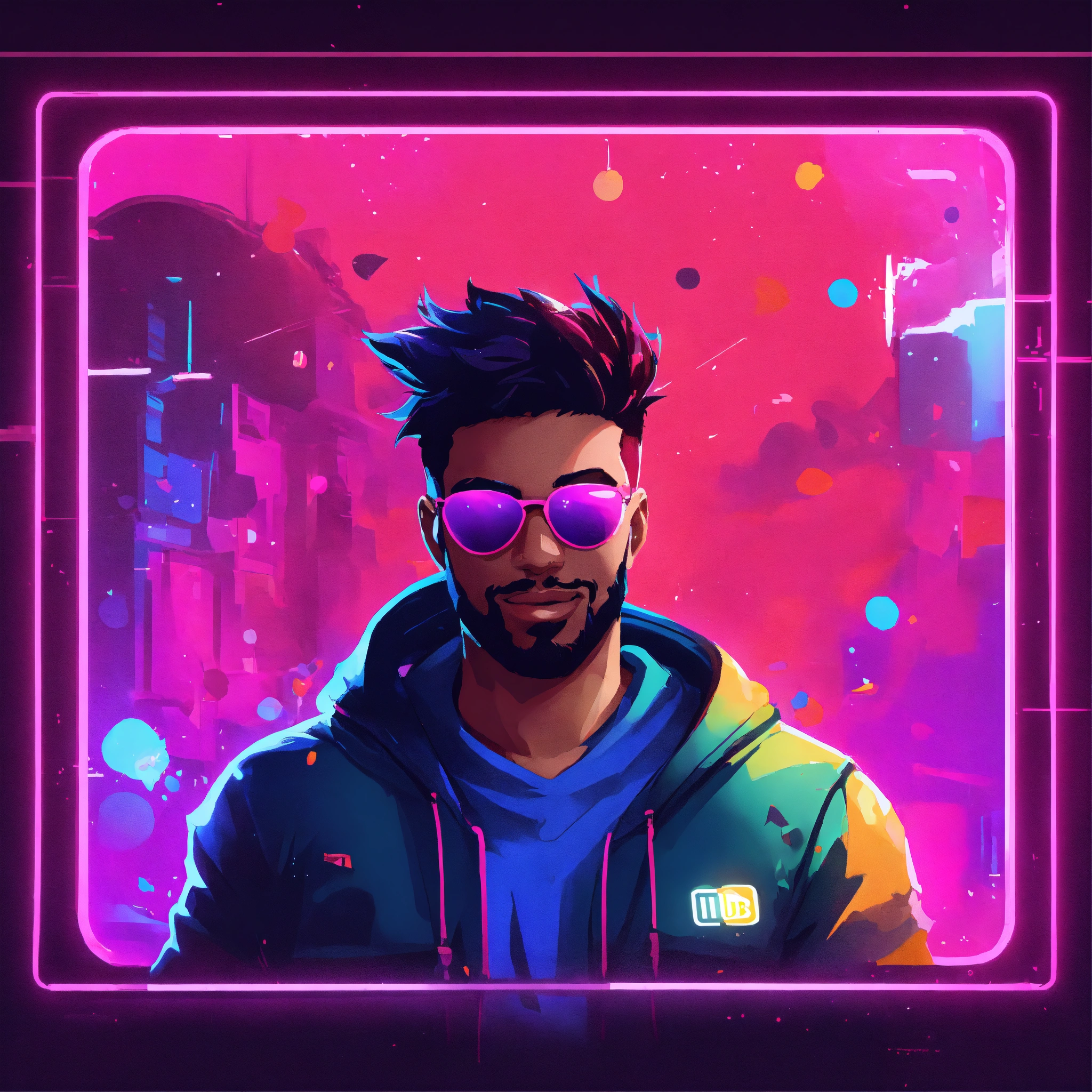 Produce a 98x98 profile picture for a youtube gaming channel that integrates educational aspects. include minimalistic art and highly contrasting neon colours. focus point on cartoony, fantasy figure as a grungy mii character portrait. create a visually appealing image that embodies the spirit of gaming and learning, all within the confines of a small square frame. the profile picture should effectively communicate the channel's blend of entertainment and education without the use of text