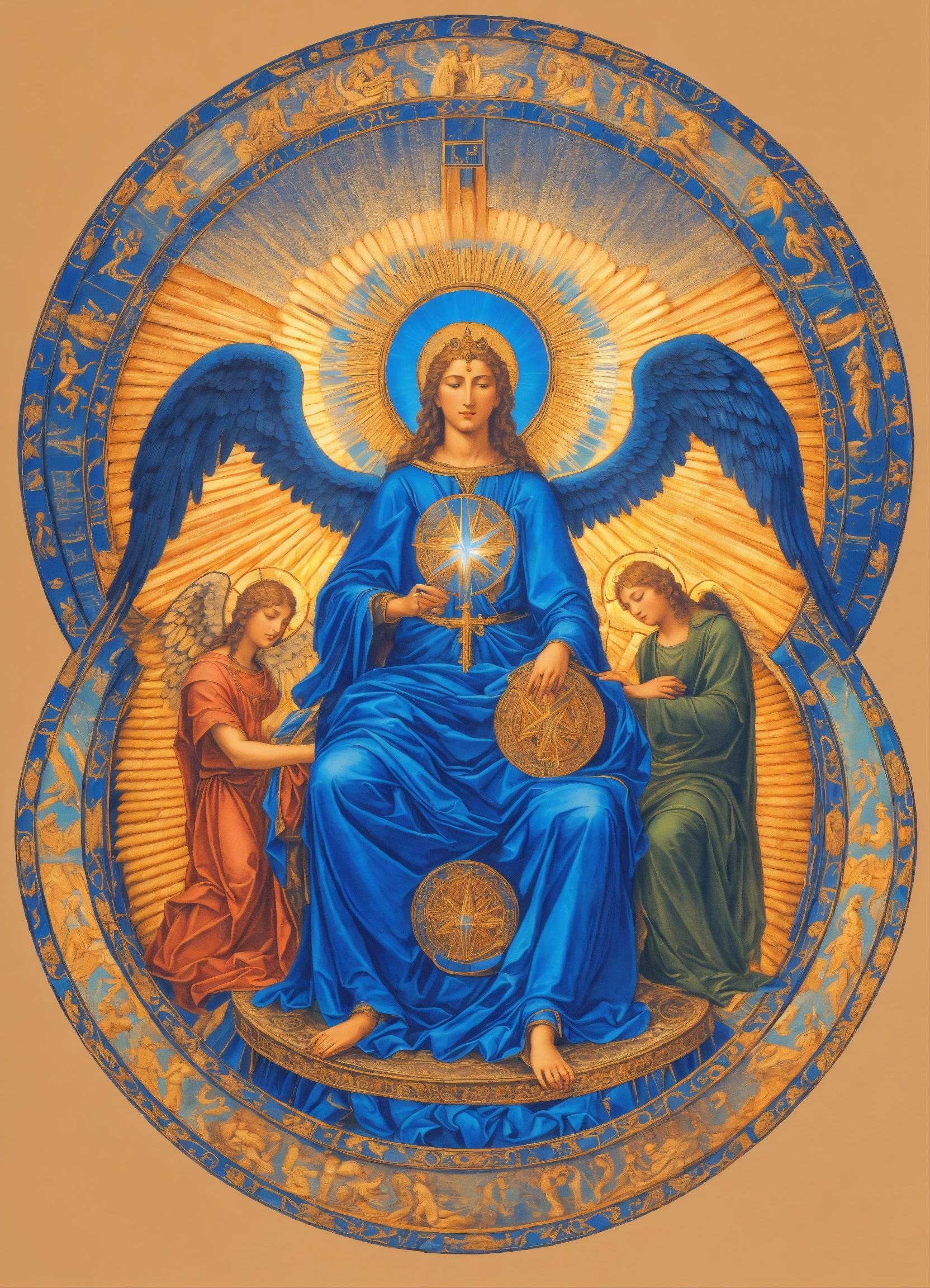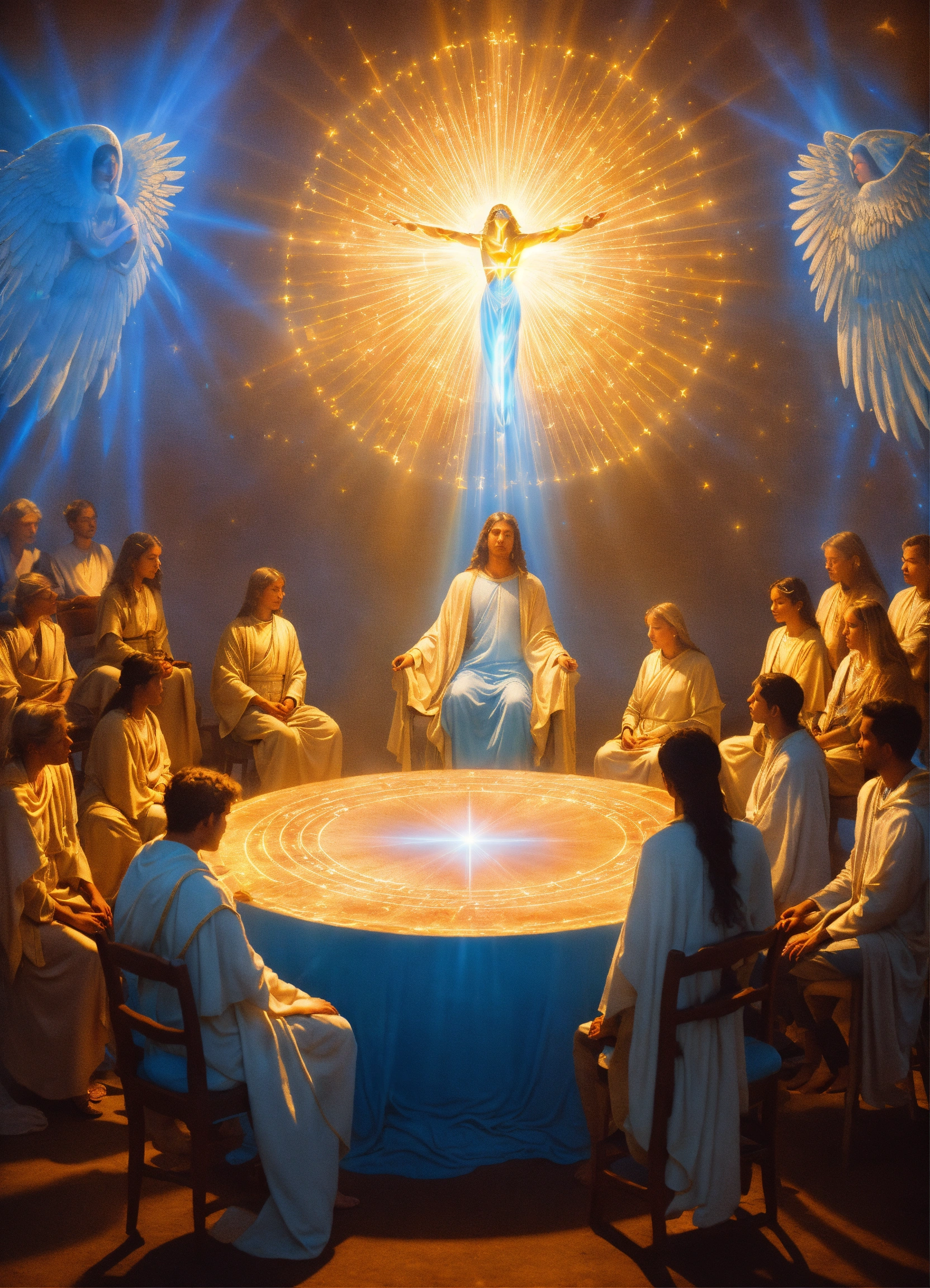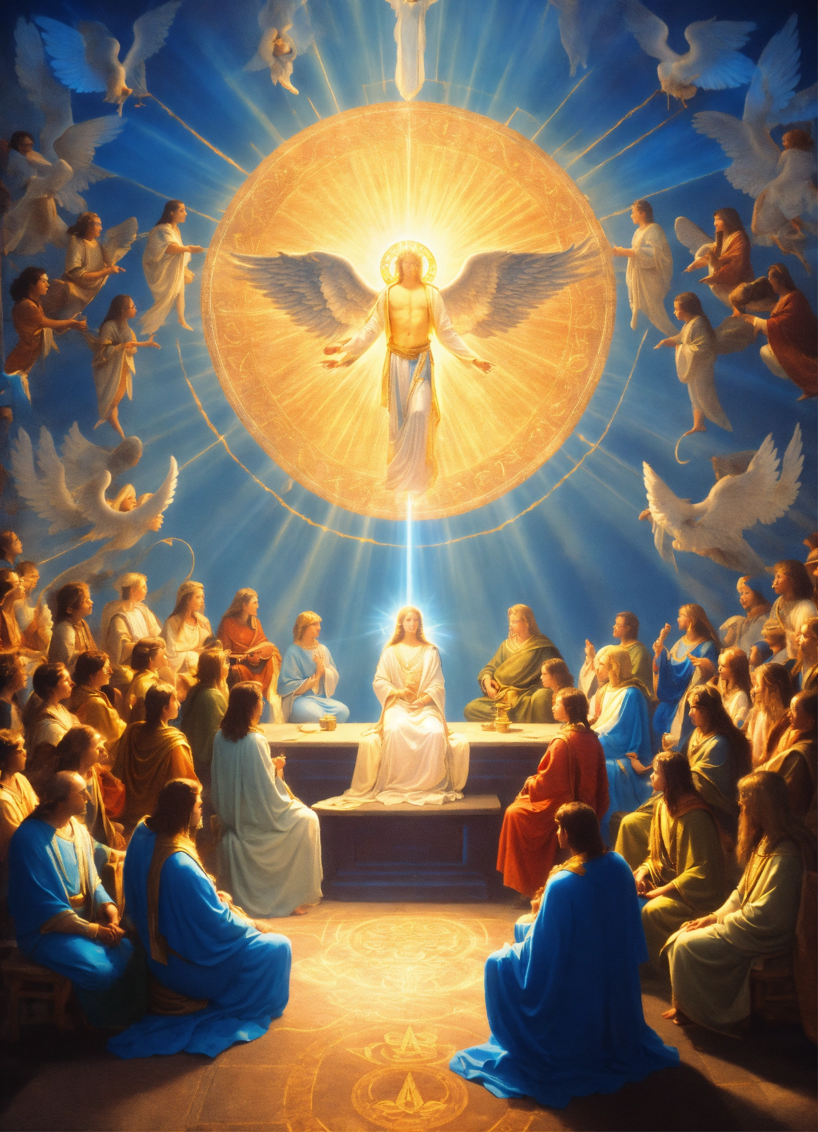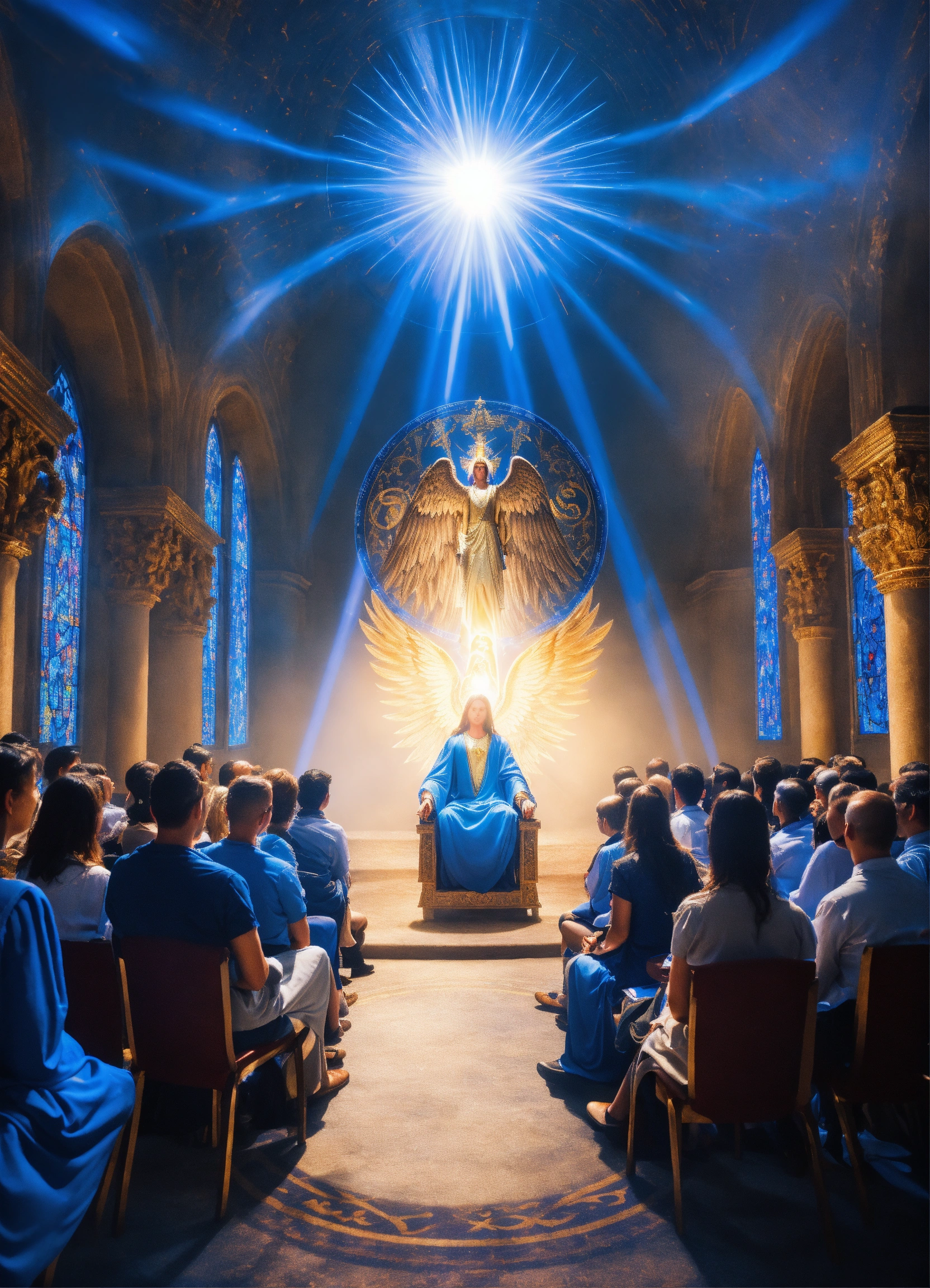 Many people siting on a chair in a circle in a seminar, archangel michael as man surrend an touch her with blue light, teaching, blue rays of light, inner transformation, sacred symbols. spiritual awekening, mystic symbols, esoteric emblems