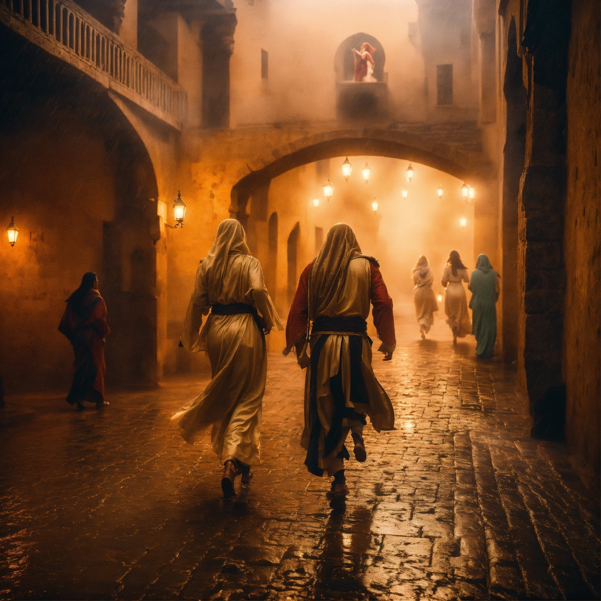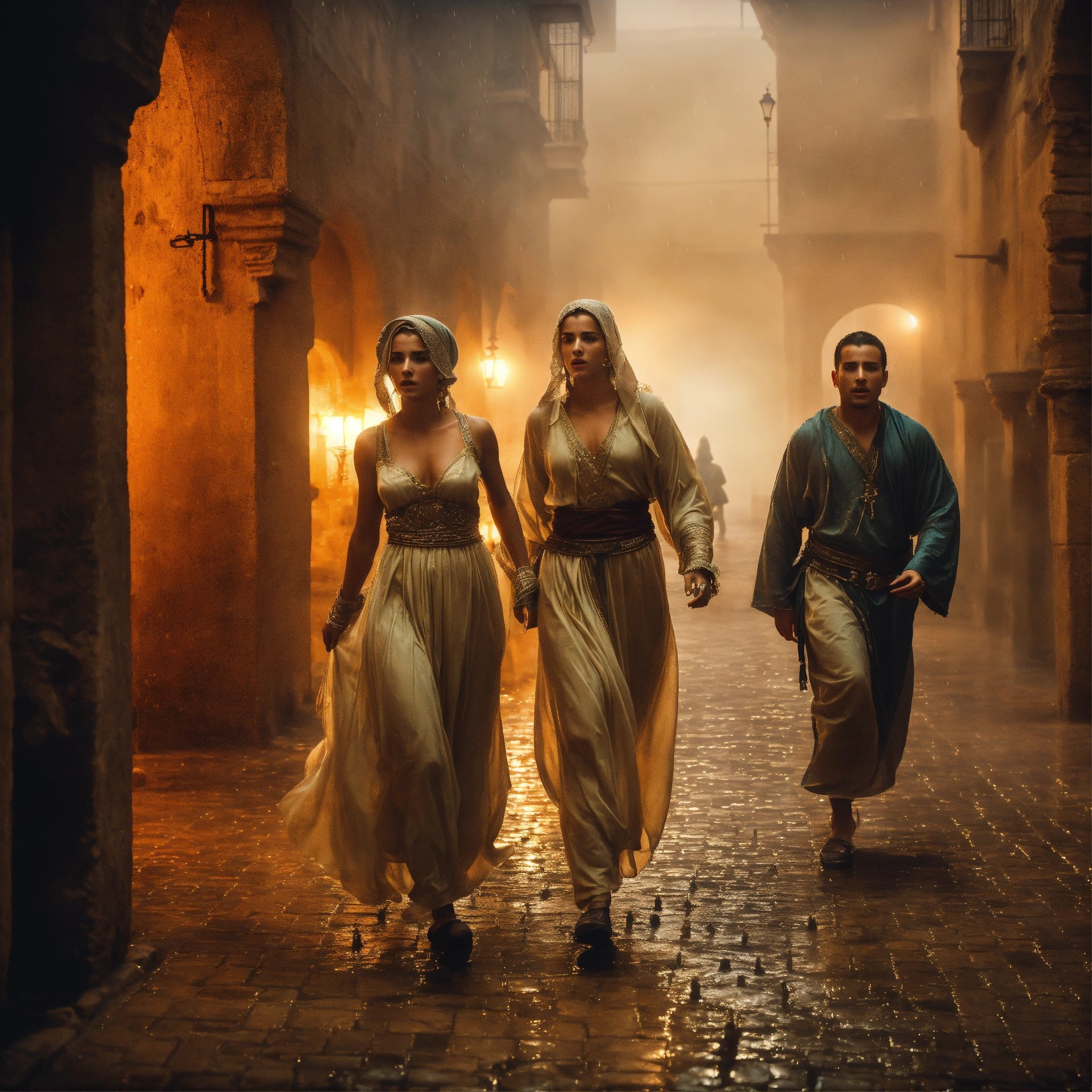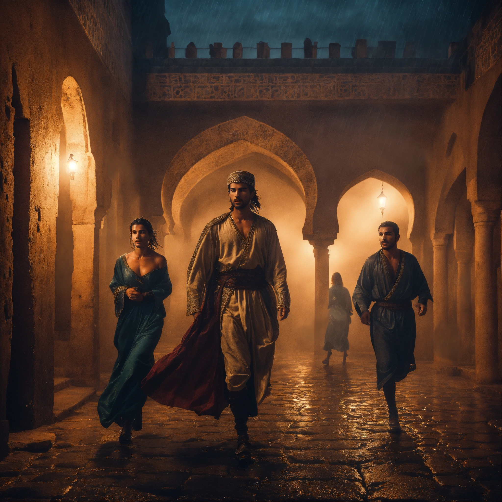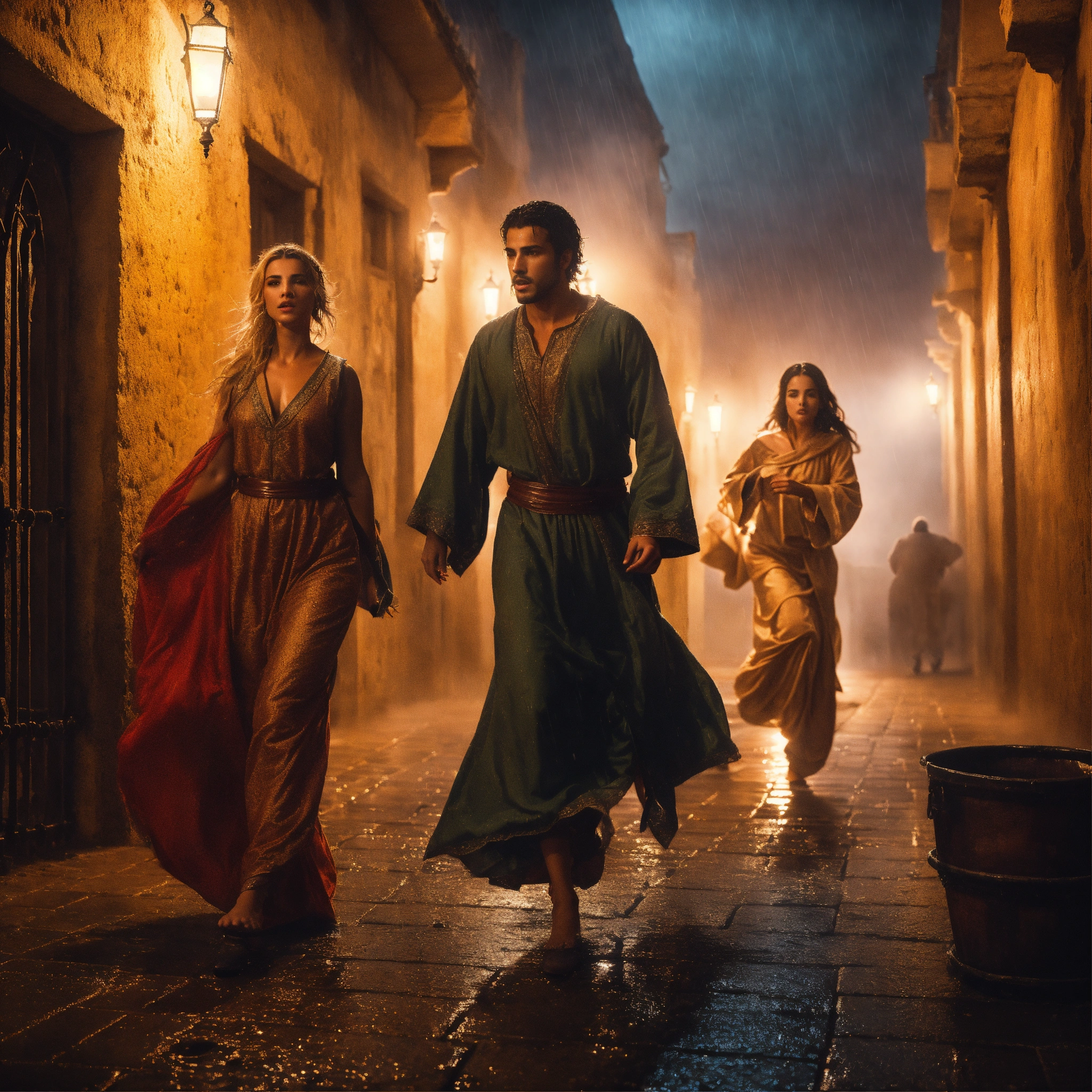 An epic fantasy scene featuring two gorgeous and beautiful blonde and brunette odalisques accompanied by arab merchant running away in the night, from a prison in medieval morocco. tension, fear and motion. misty and rainy atmosphere. cinematic view, sharp detail.