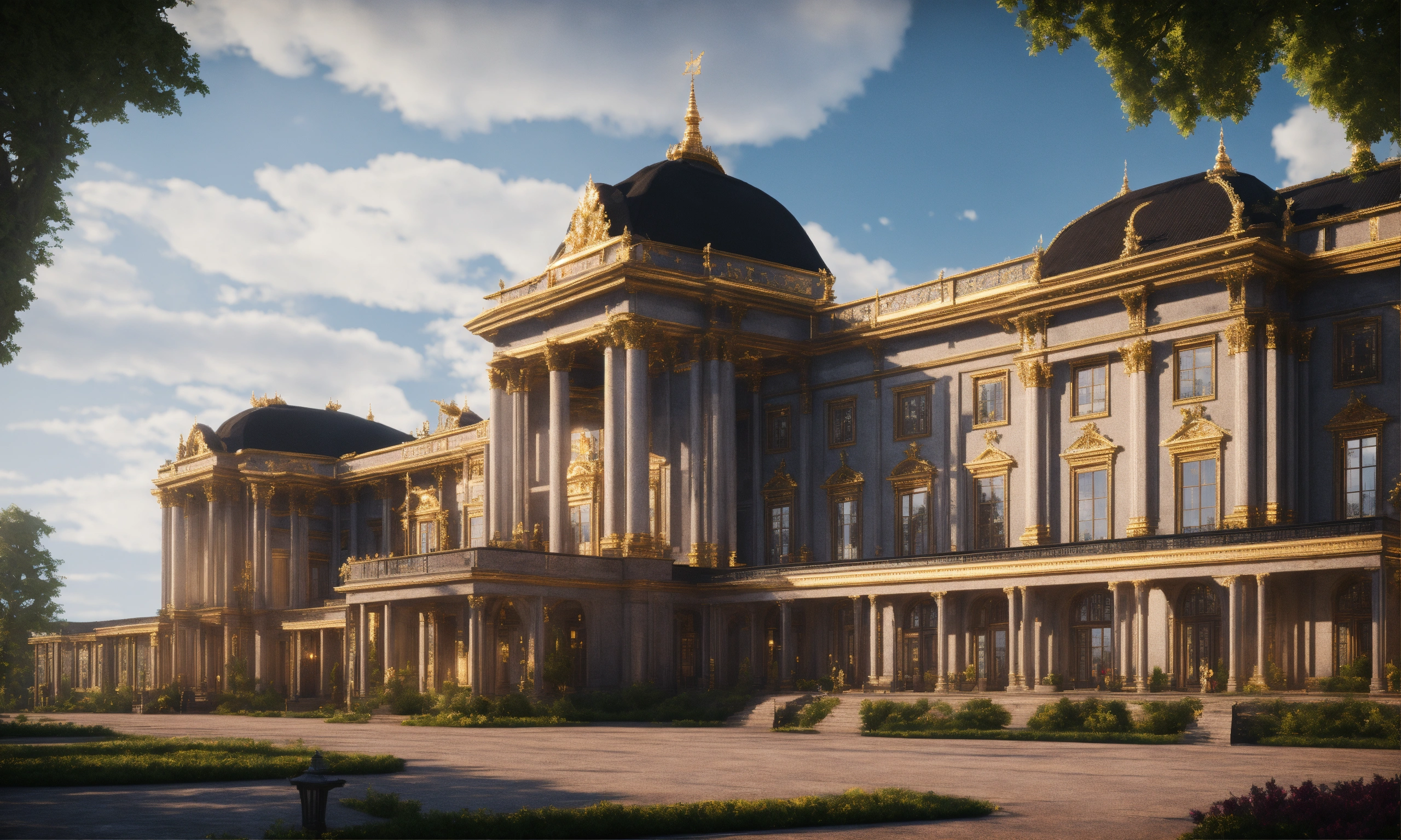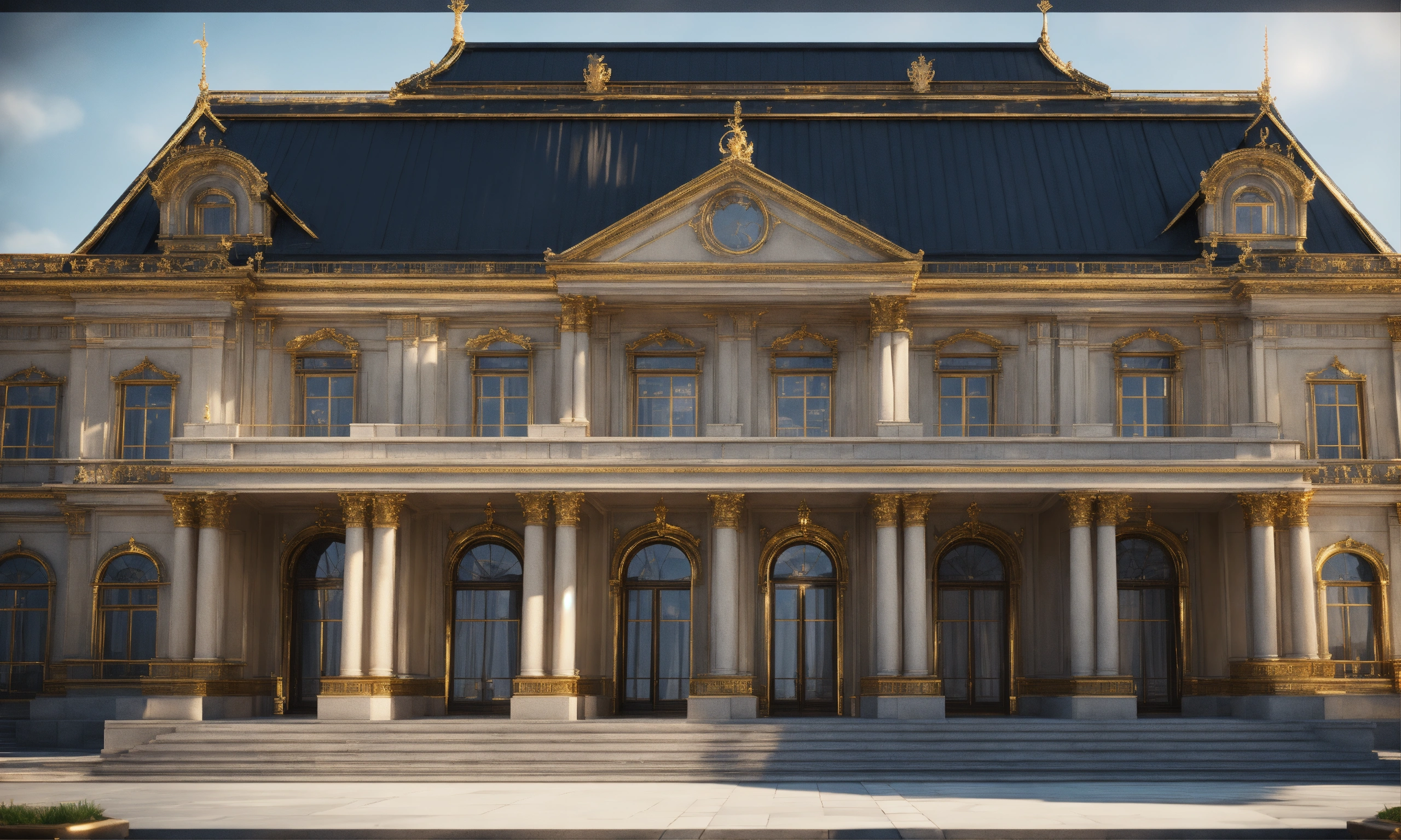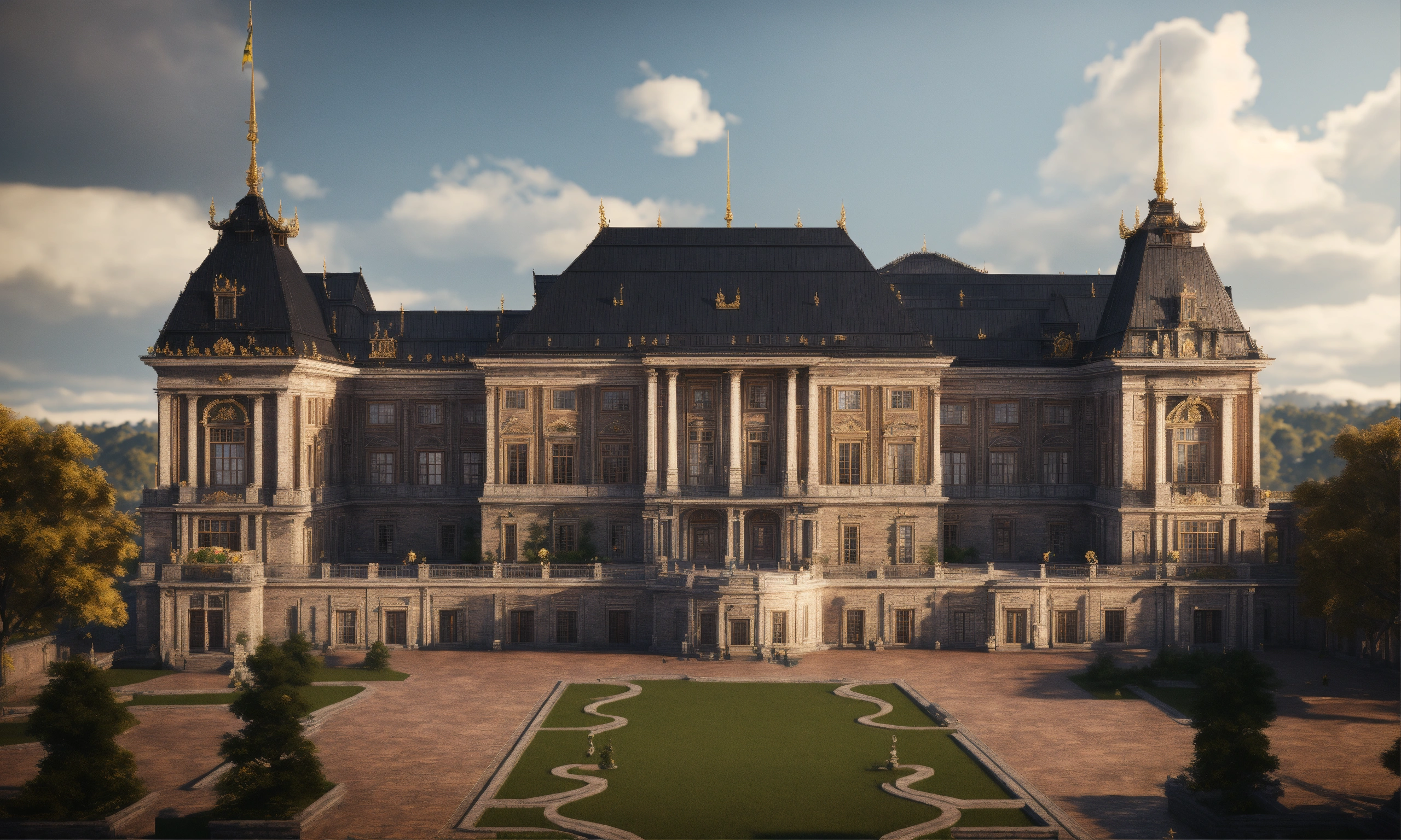 Full image of a massive royal palace with a black roof, built in the american midwest, swedish architecture, highly detailed, symmetrical, unreal engine, 8d