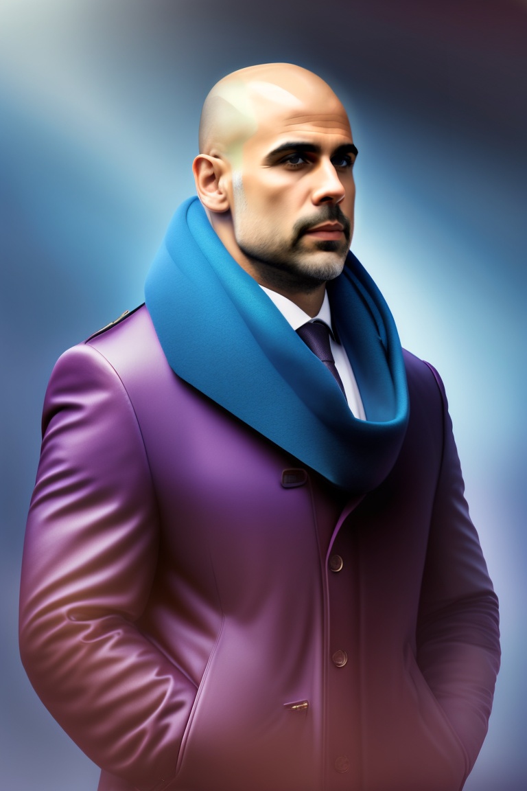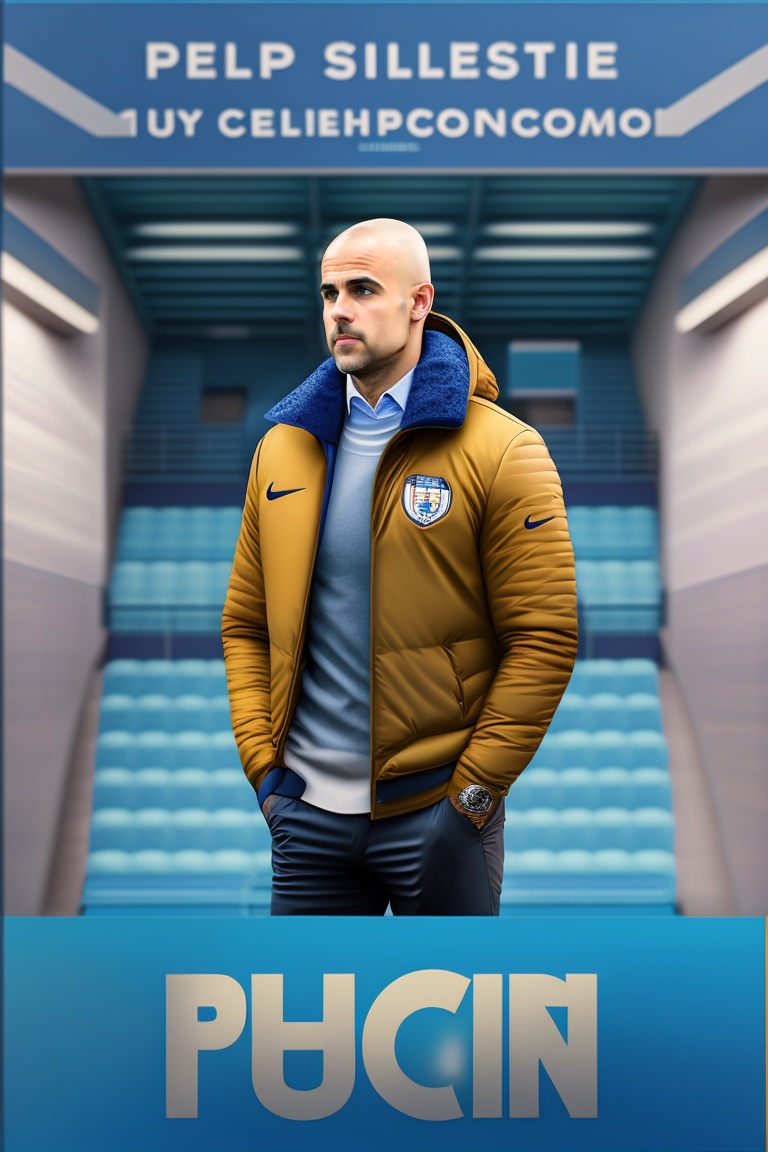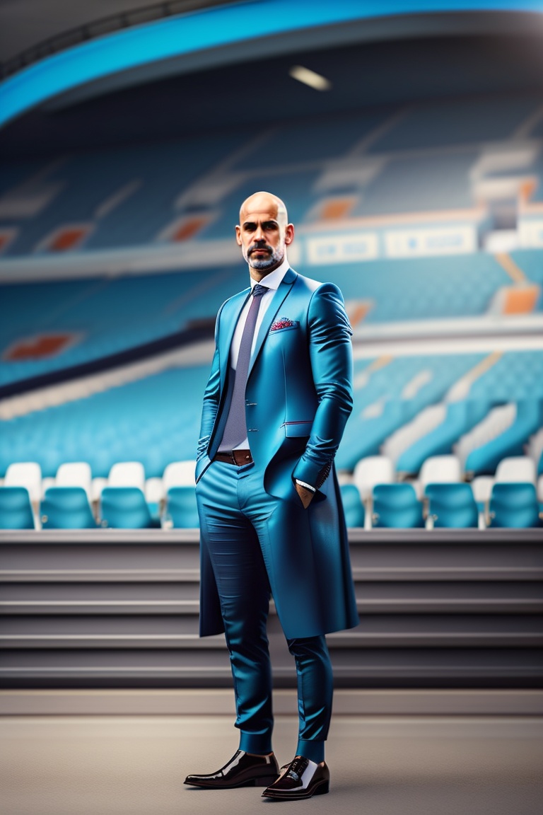 Highly detailed full length portrait of pep guardiola, coach, blue scarf, bald head, grunge aesthetic, england manchester city stadium background