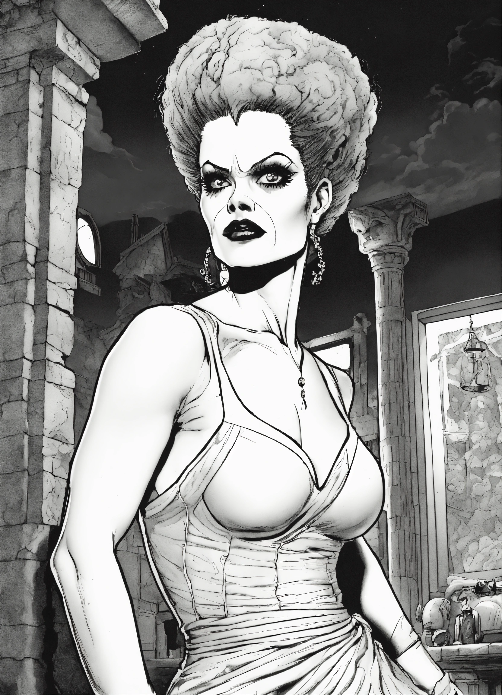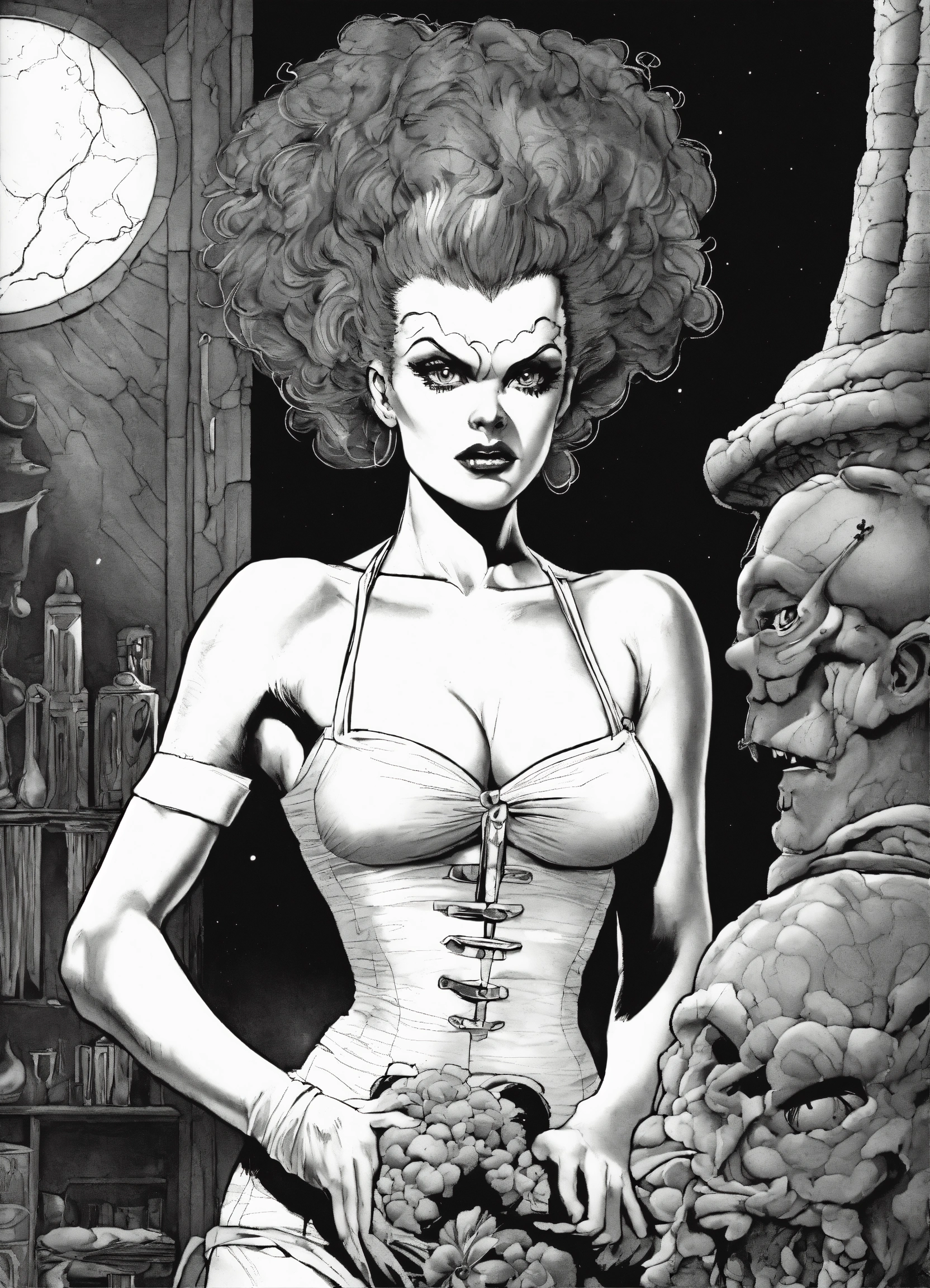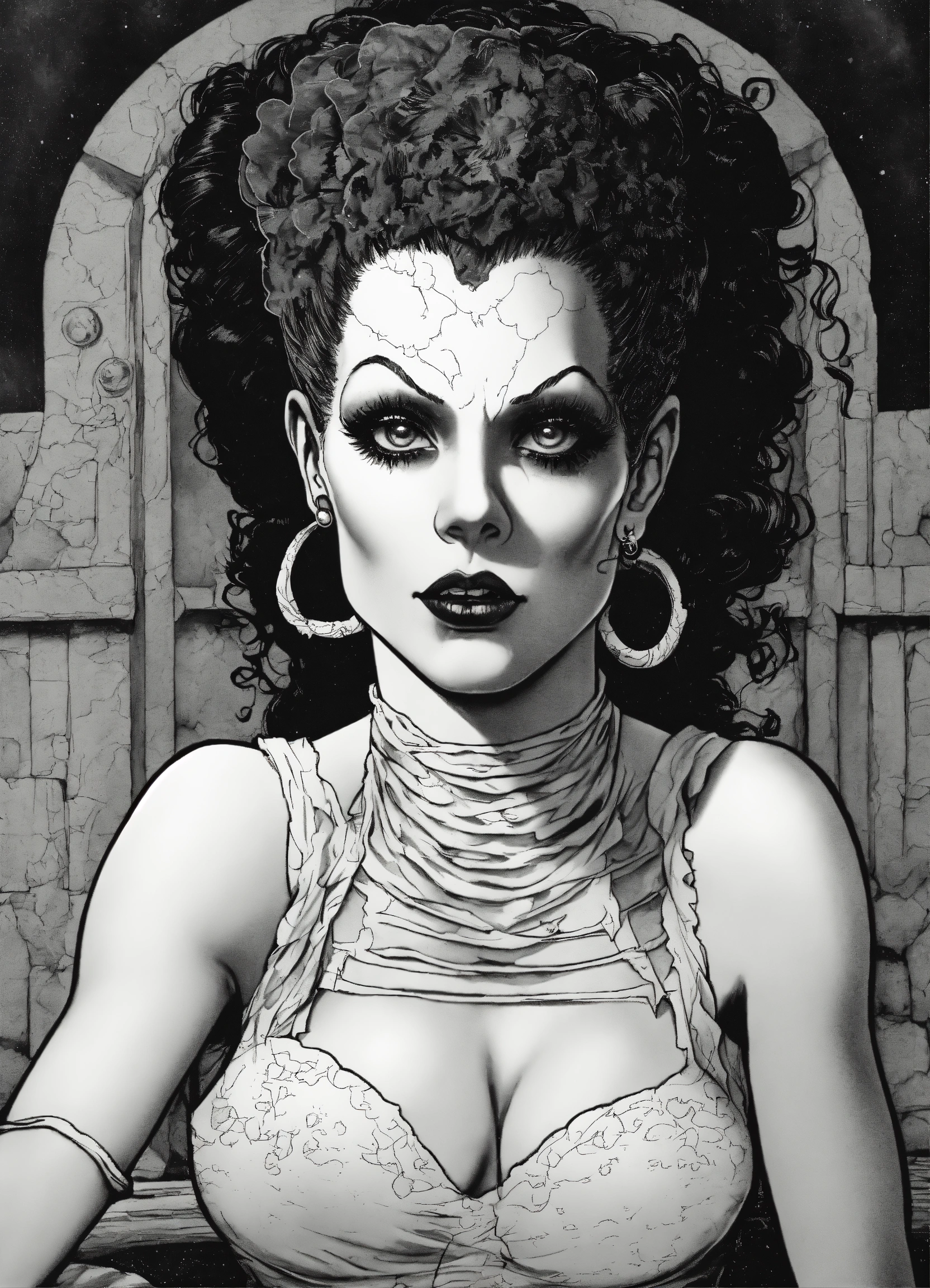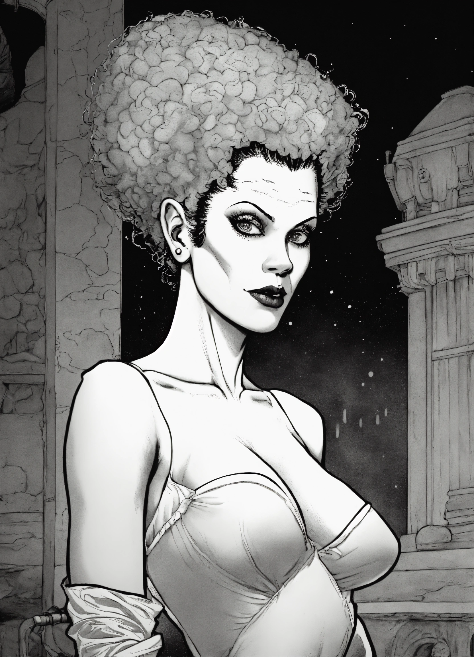 Adult coloring book page of a beautiful bride of frankenstein's monster pin-up, line art, black and white, richard corben style