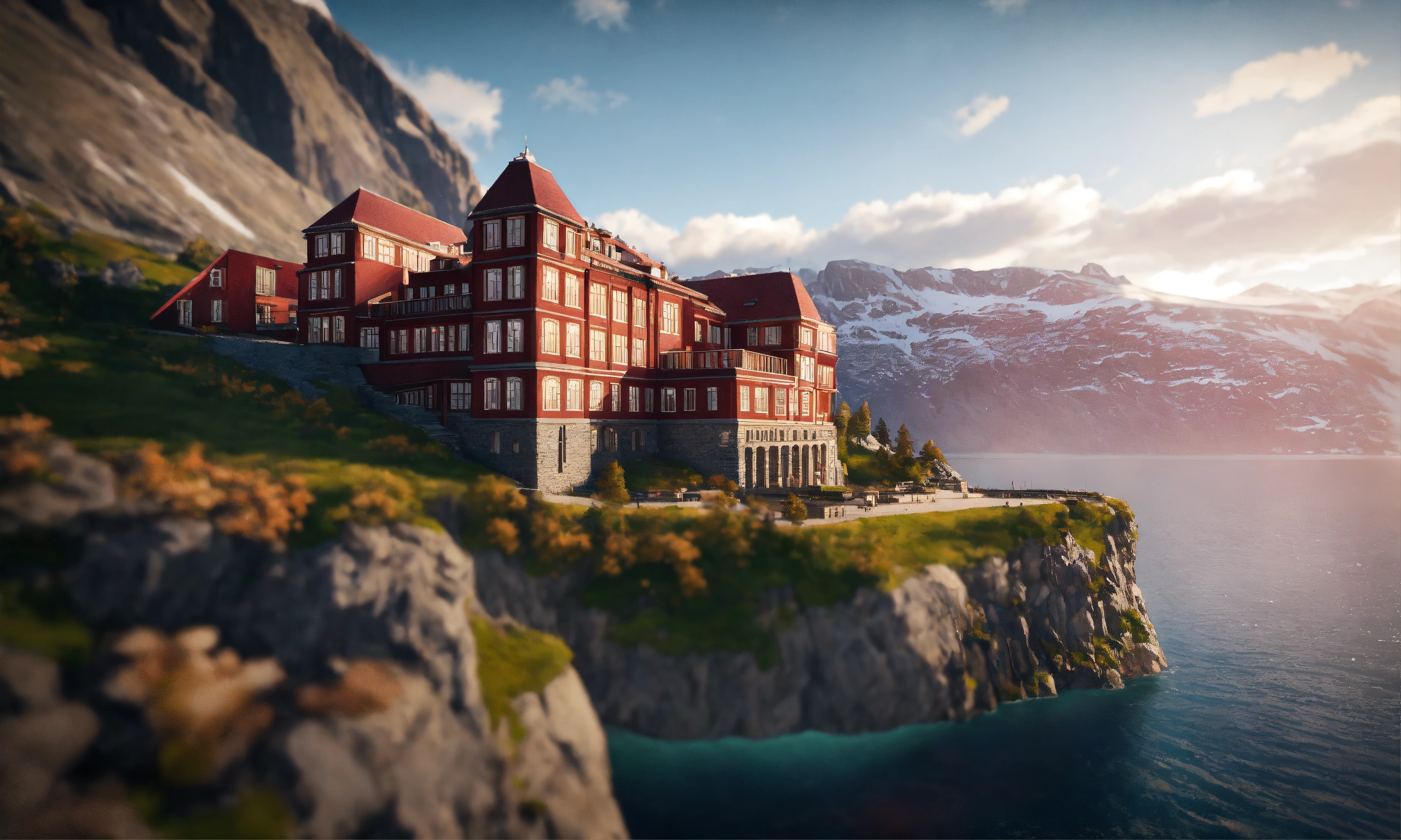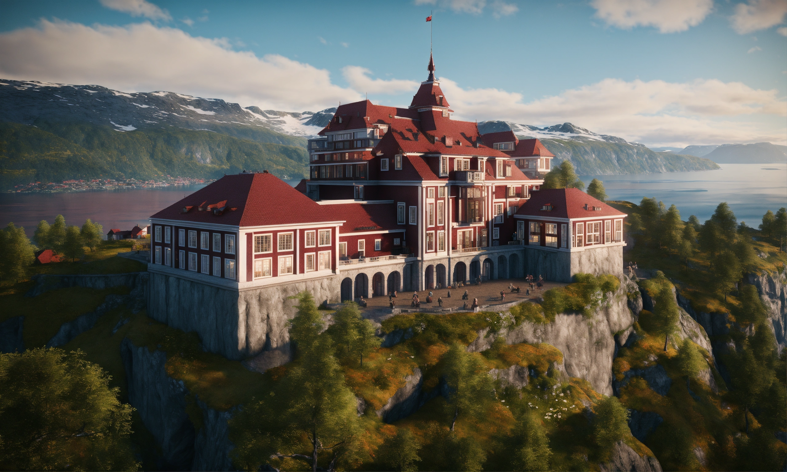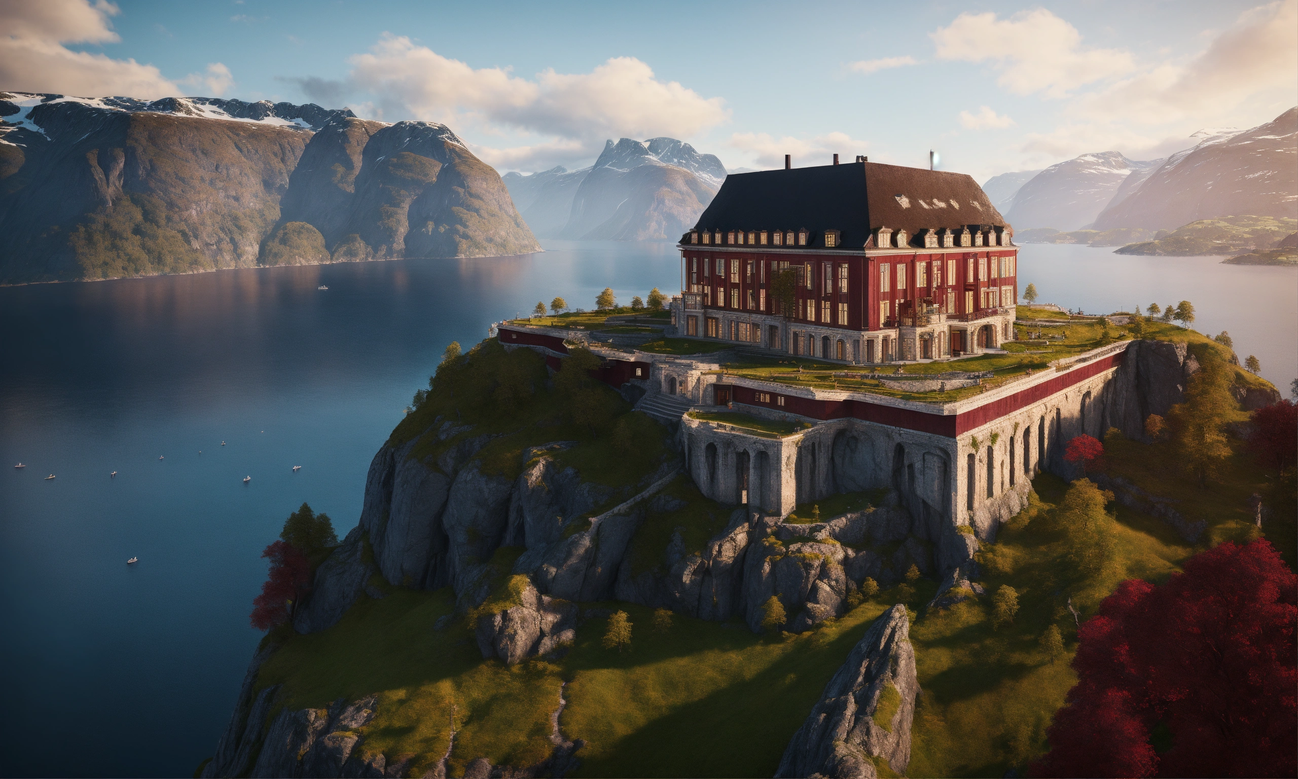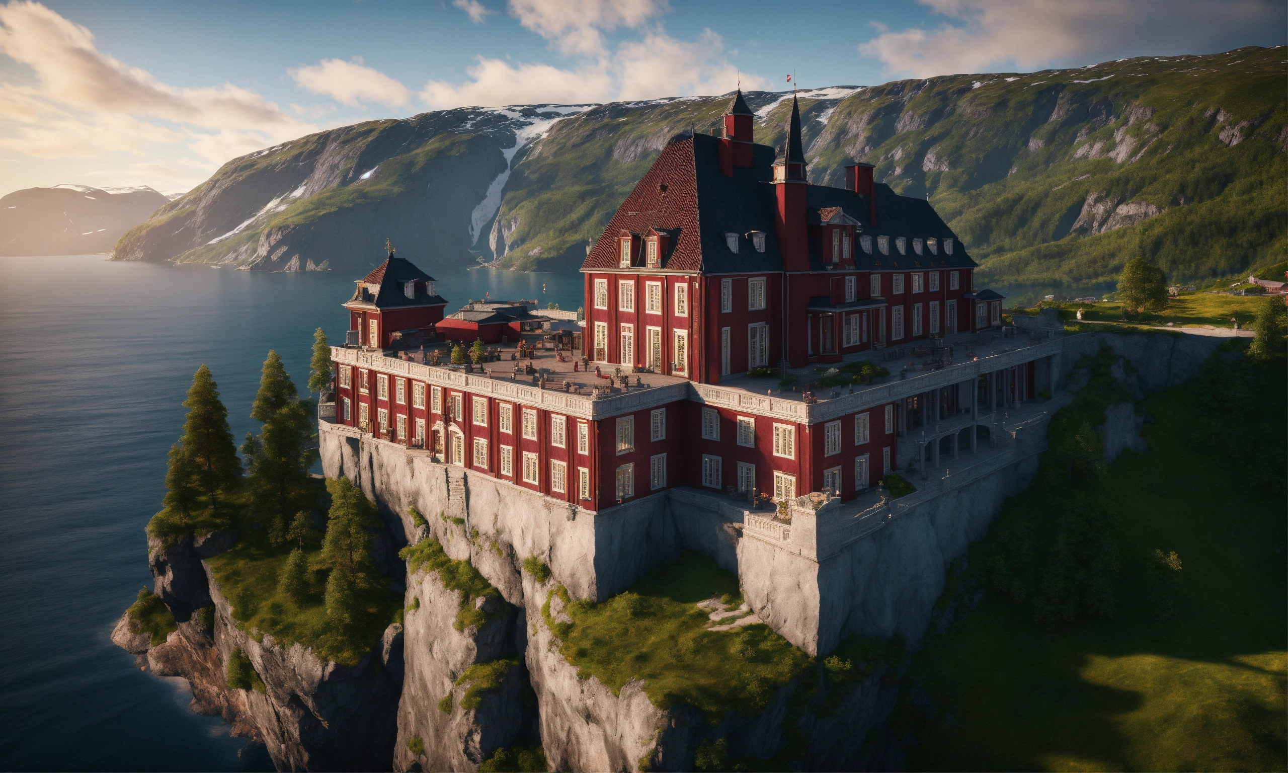 Full image of a massive maroon norwegian palace on a cliff overlooking a fjord in norway, norwegian architecture, highly detailed, unreal engine, 8d