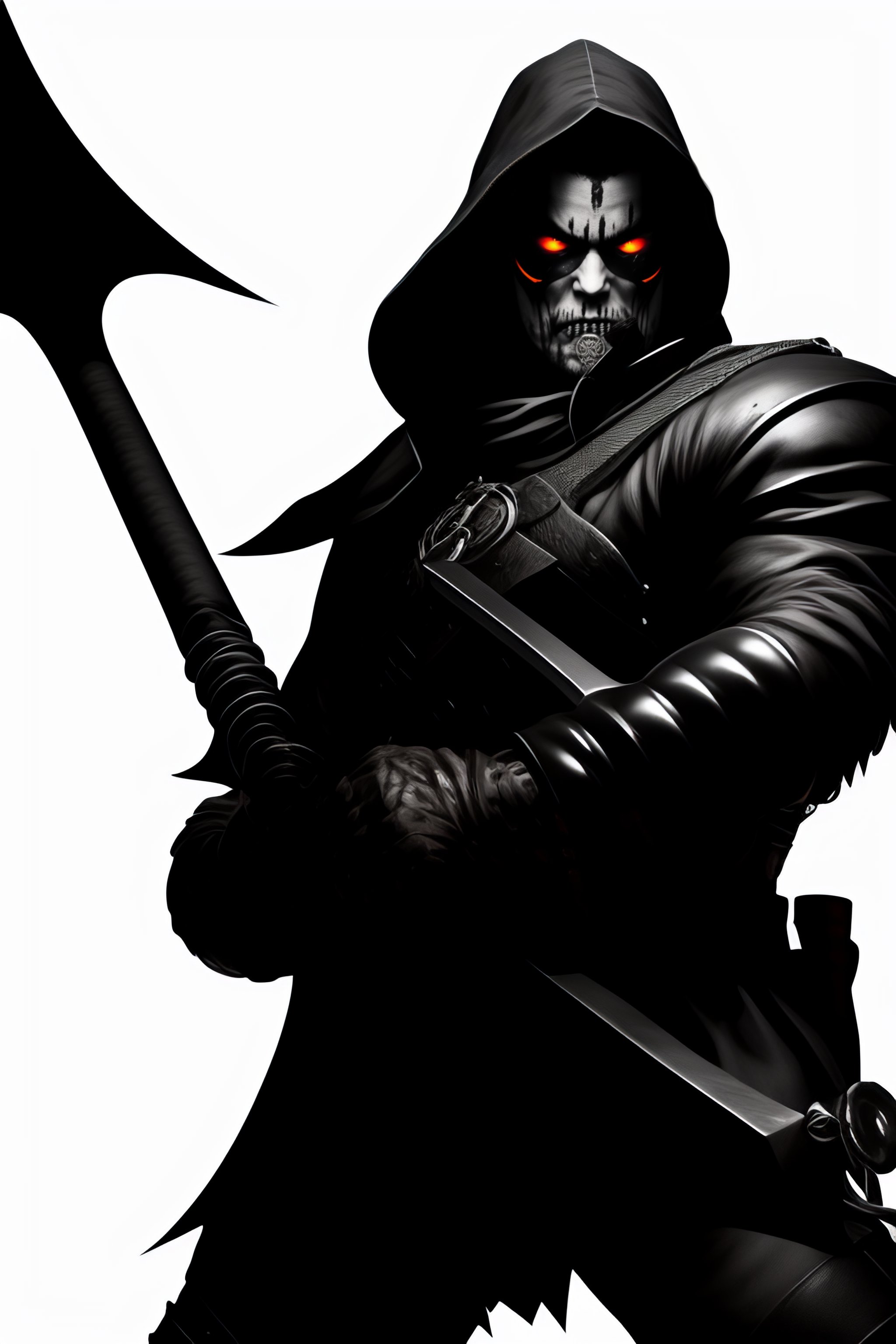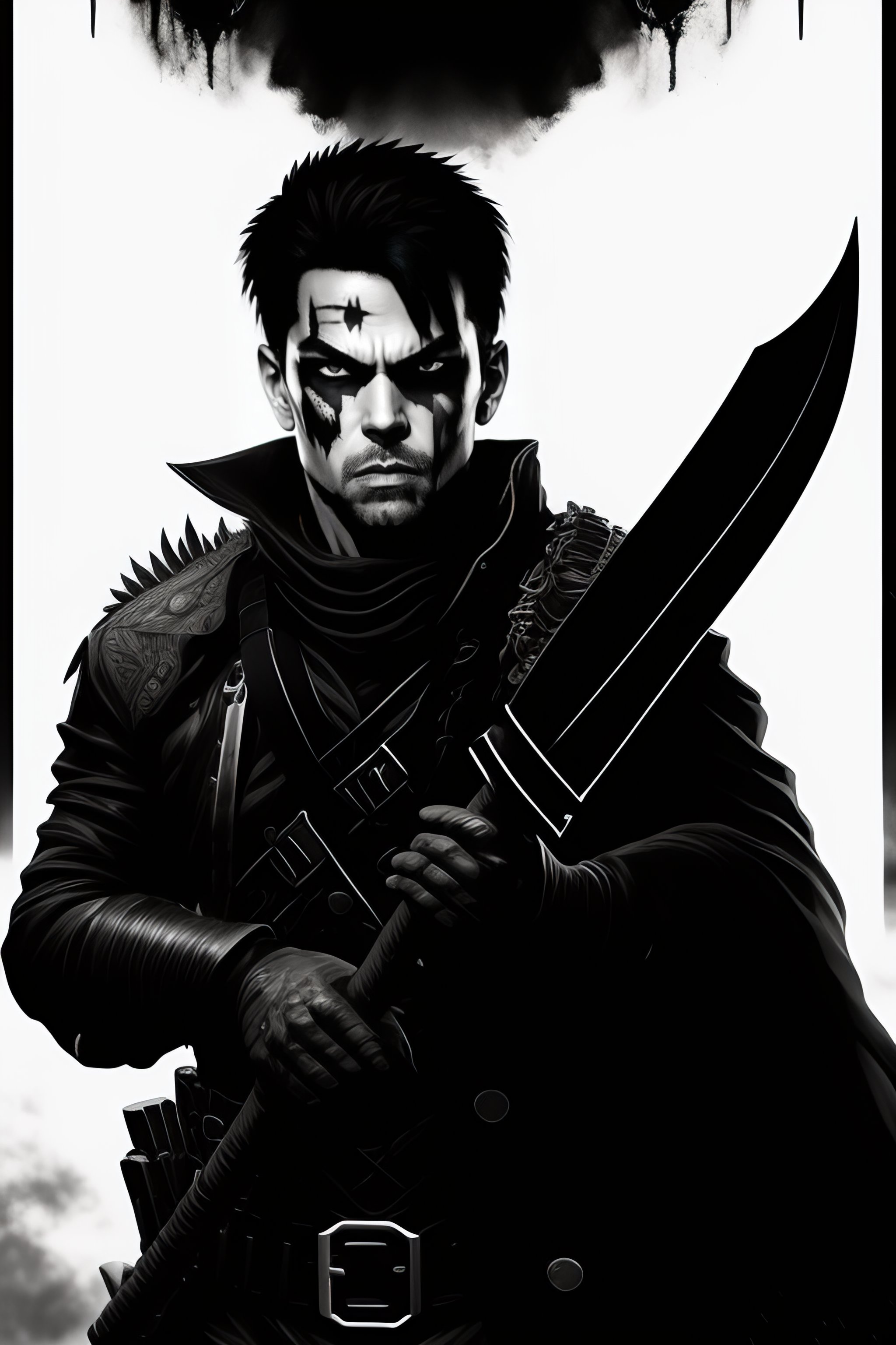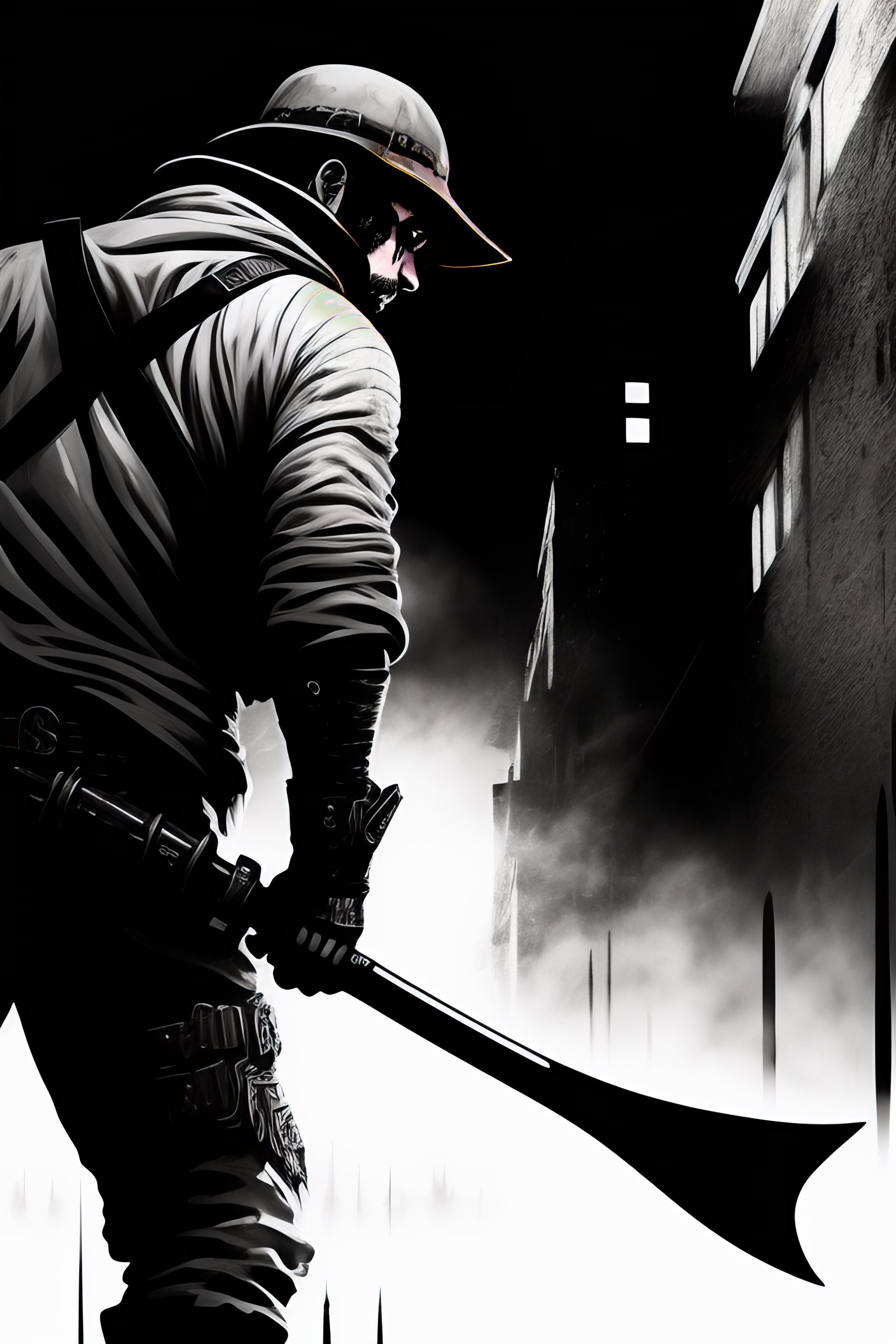 Create a dynamic black and white manga-style image of a determined zombie hunter wielding a makeshift axe made of scrap metal. the hunter should be depicted in practical clothing suitable for fighting zombies, with a utility belt, heavy boots, and leather gloves. the background should be dark and ominous, with shadows and mist adding to the sense of danger. the focus of the image should be on the hunter's weapon and the imminent threat of the undead, with a gritty and intense atmosphere