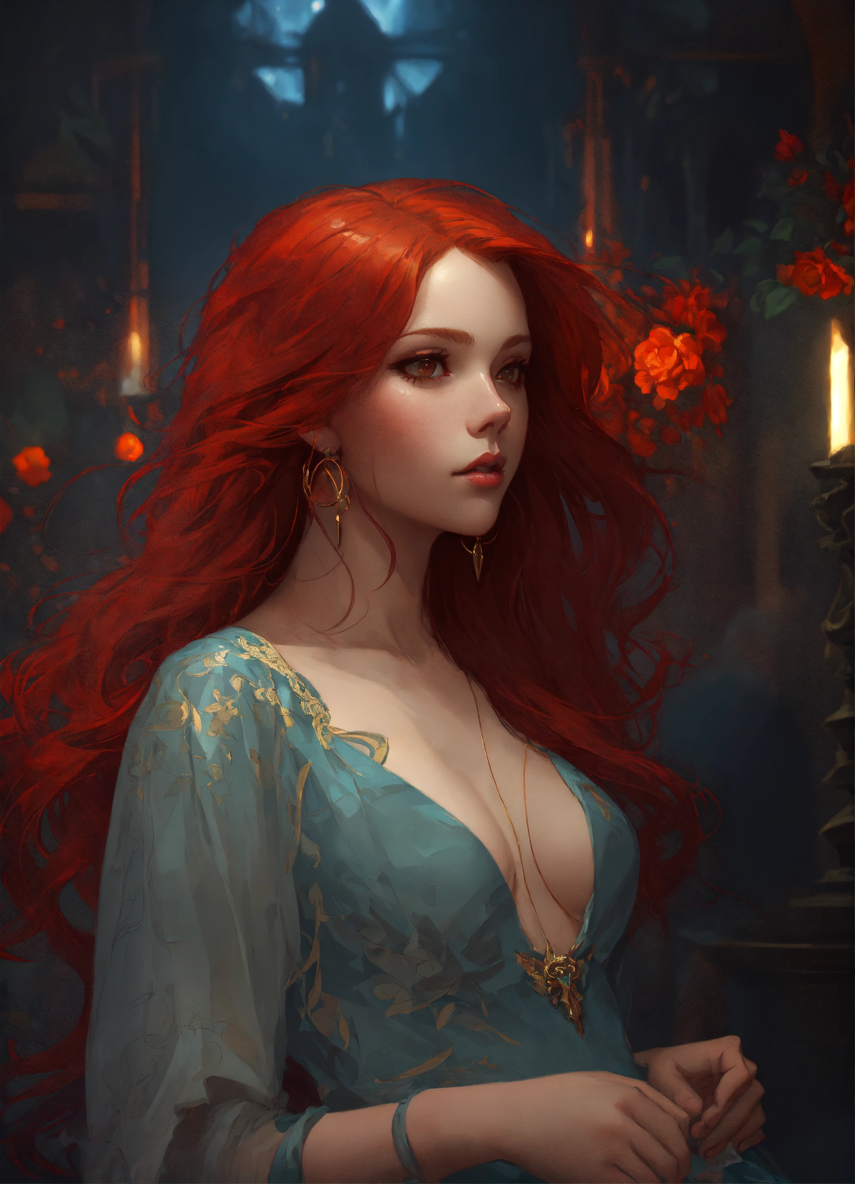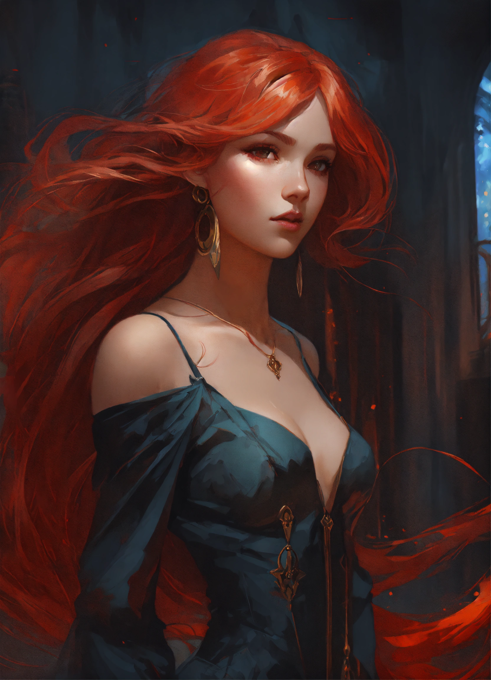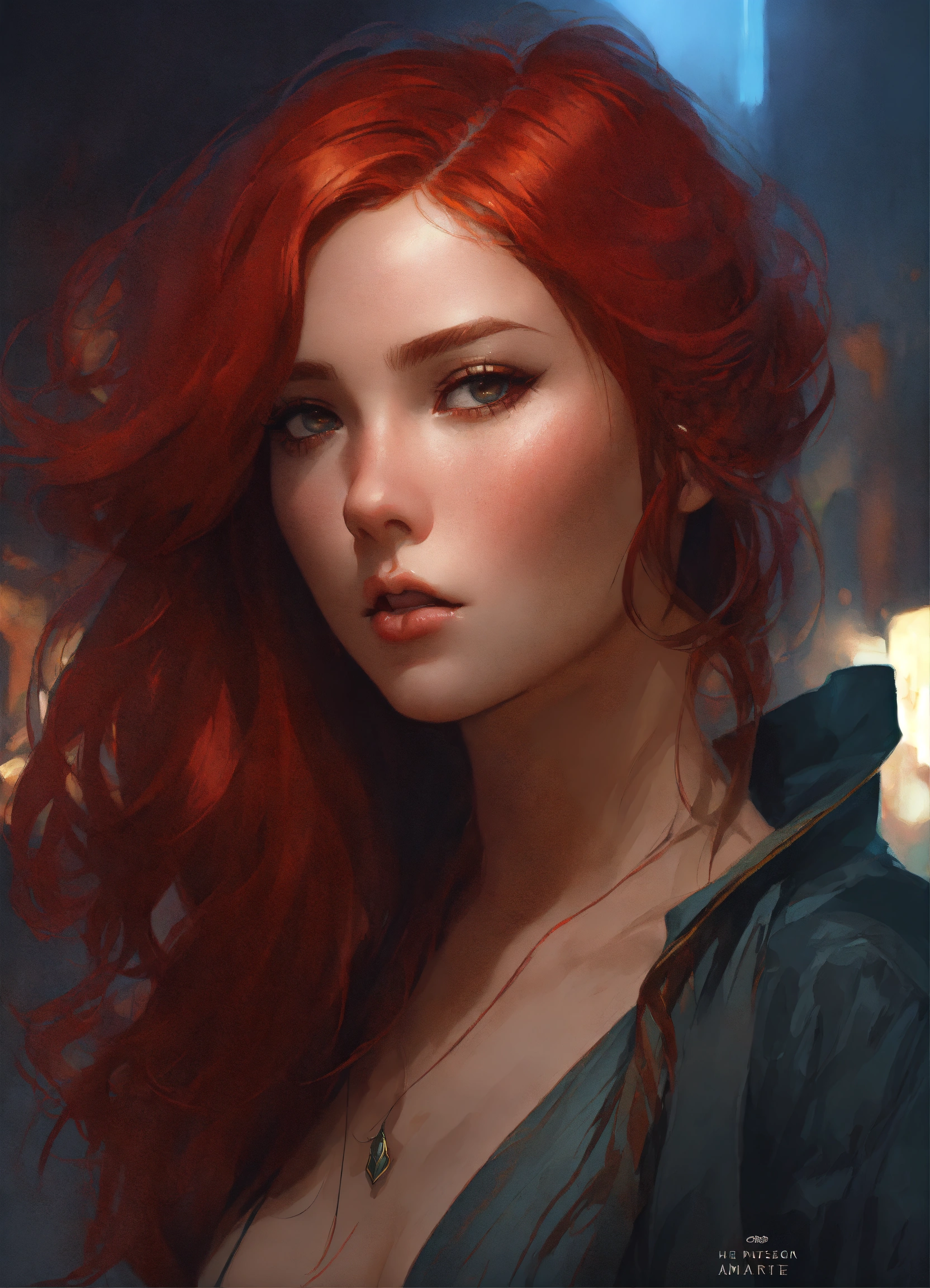 Beautiful, red hair, long hair, dark pin-up style hair, dark light night, intricate, sharp focus, illustration, highly detailed, digital painting, concept art, matte, art by wlop and artgerm and greg rutkowski and alphonse mucha, masterpiece, dark clothes, modern clothes