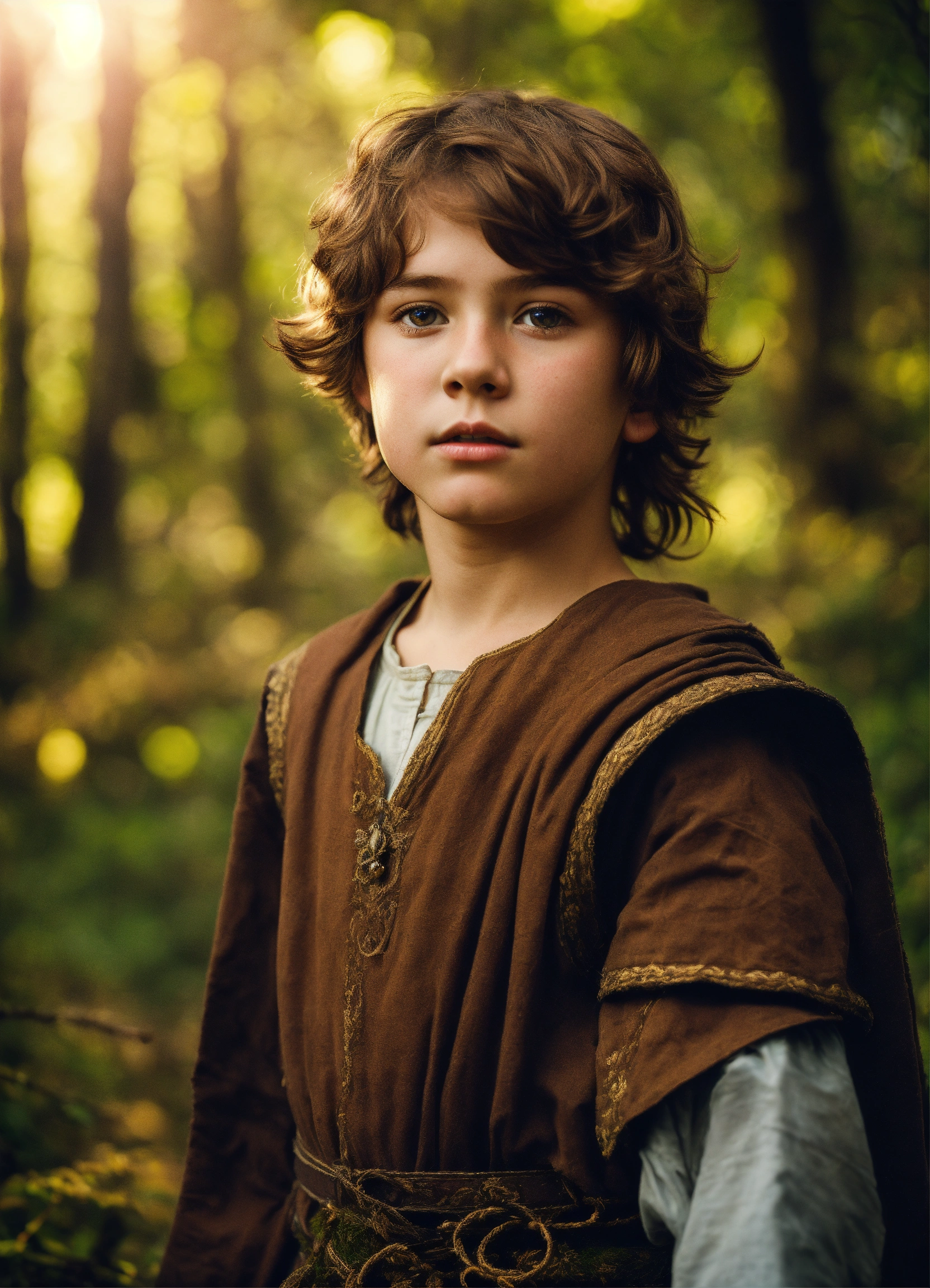 Young medieval boy with hazel eyes and brown hair in a forest fantasy