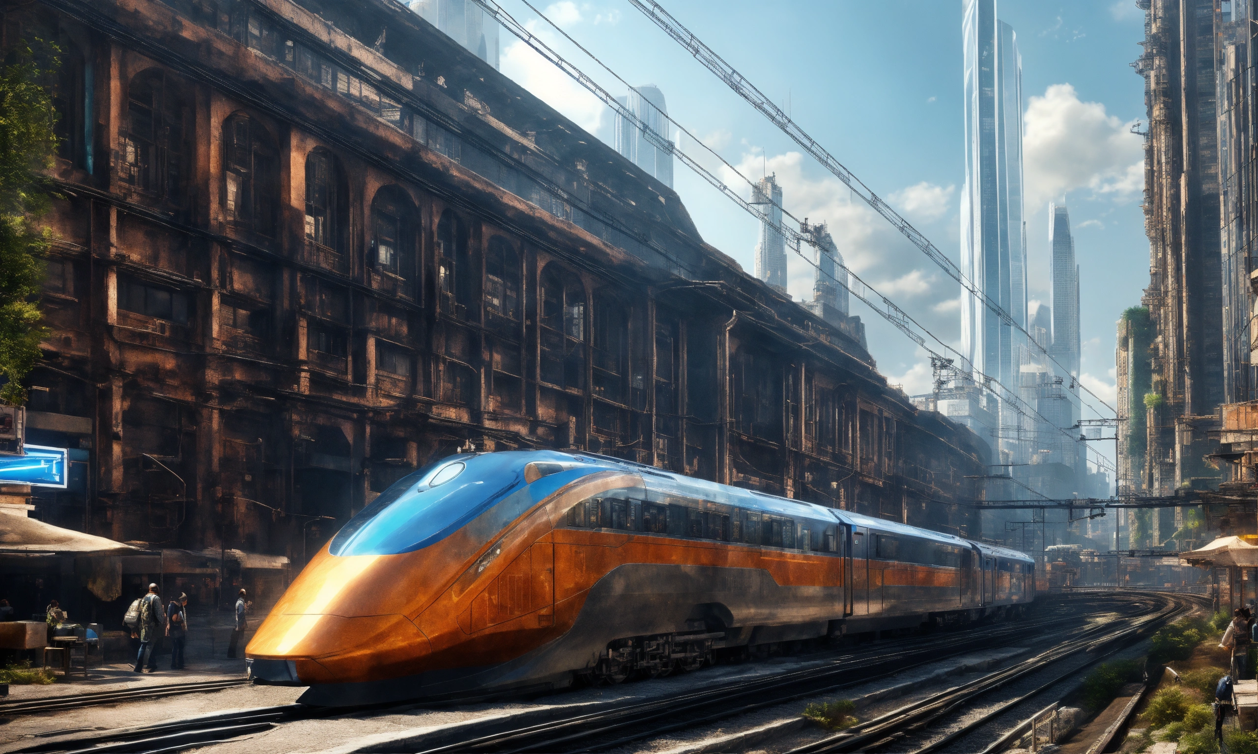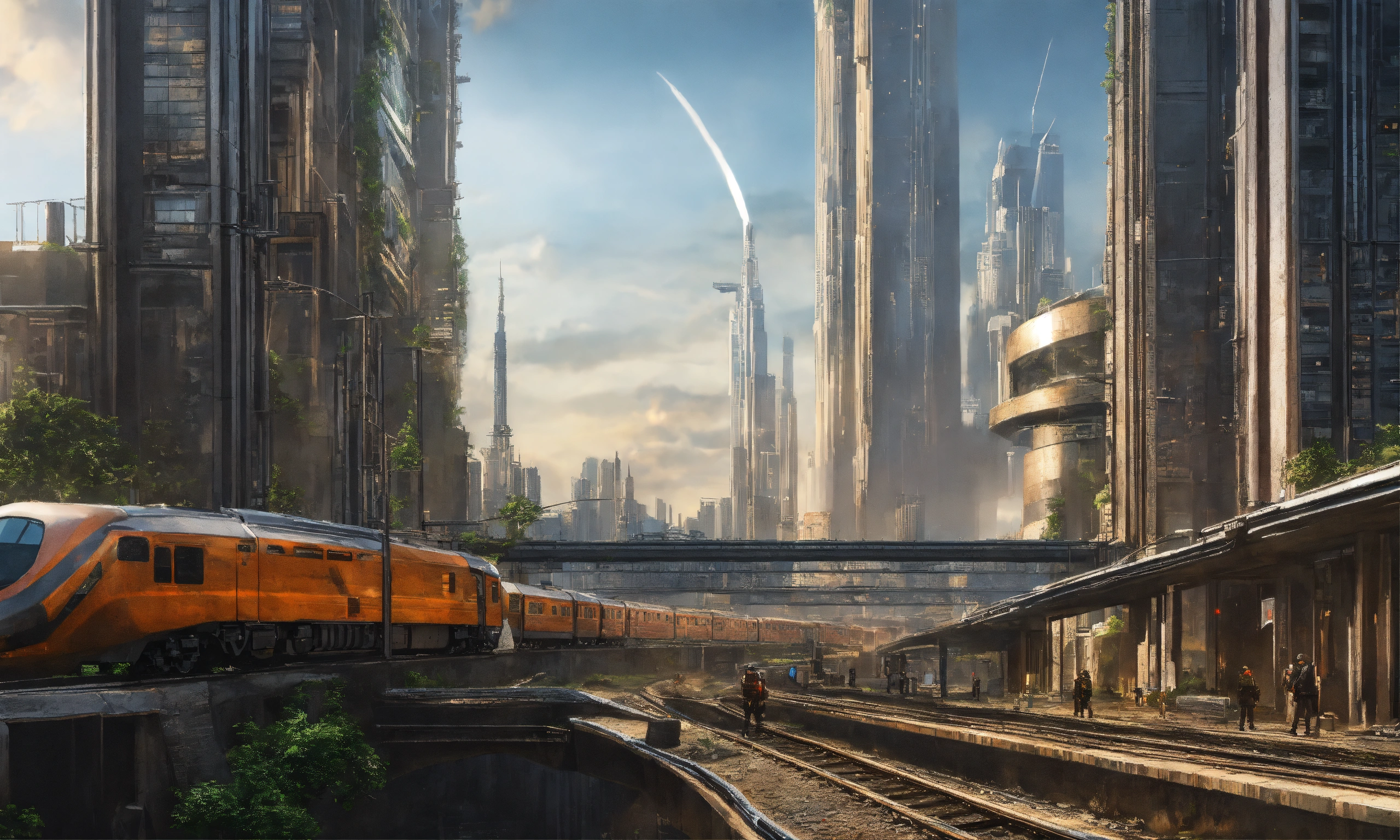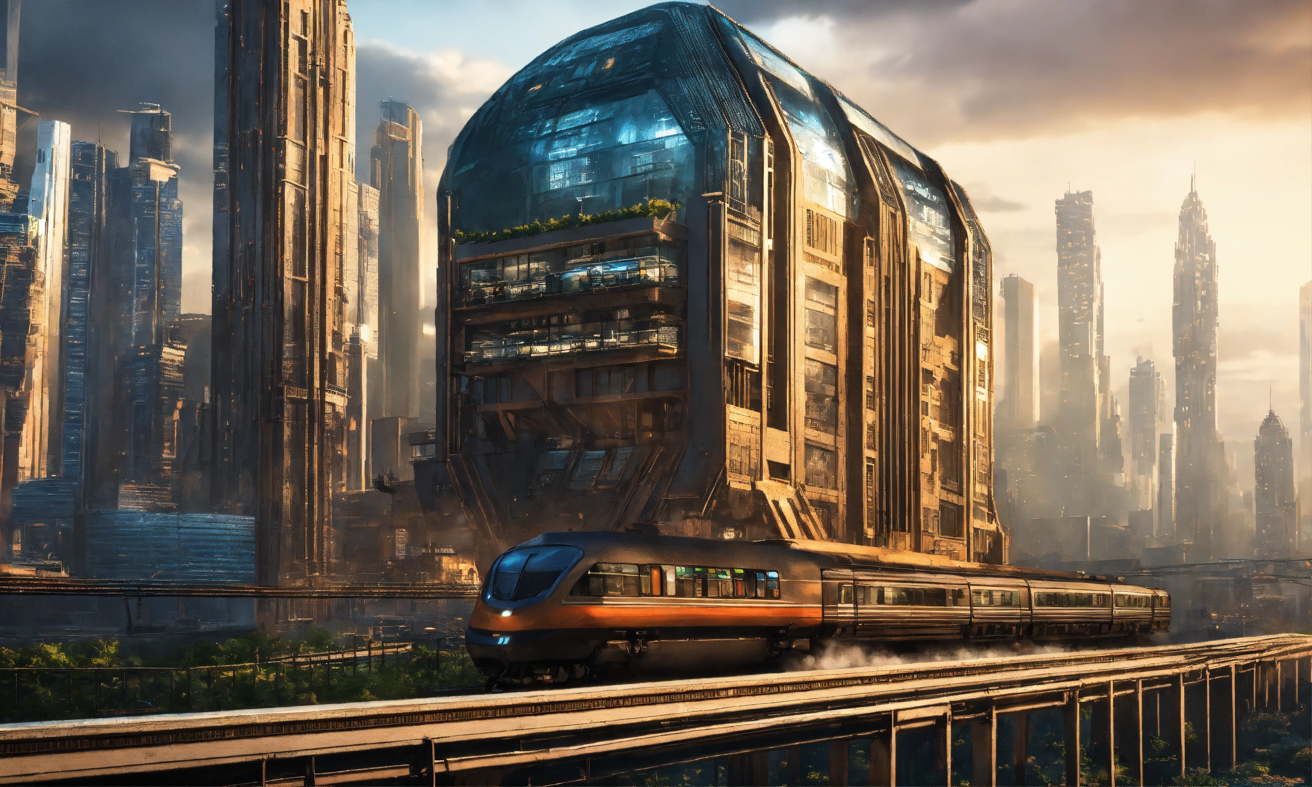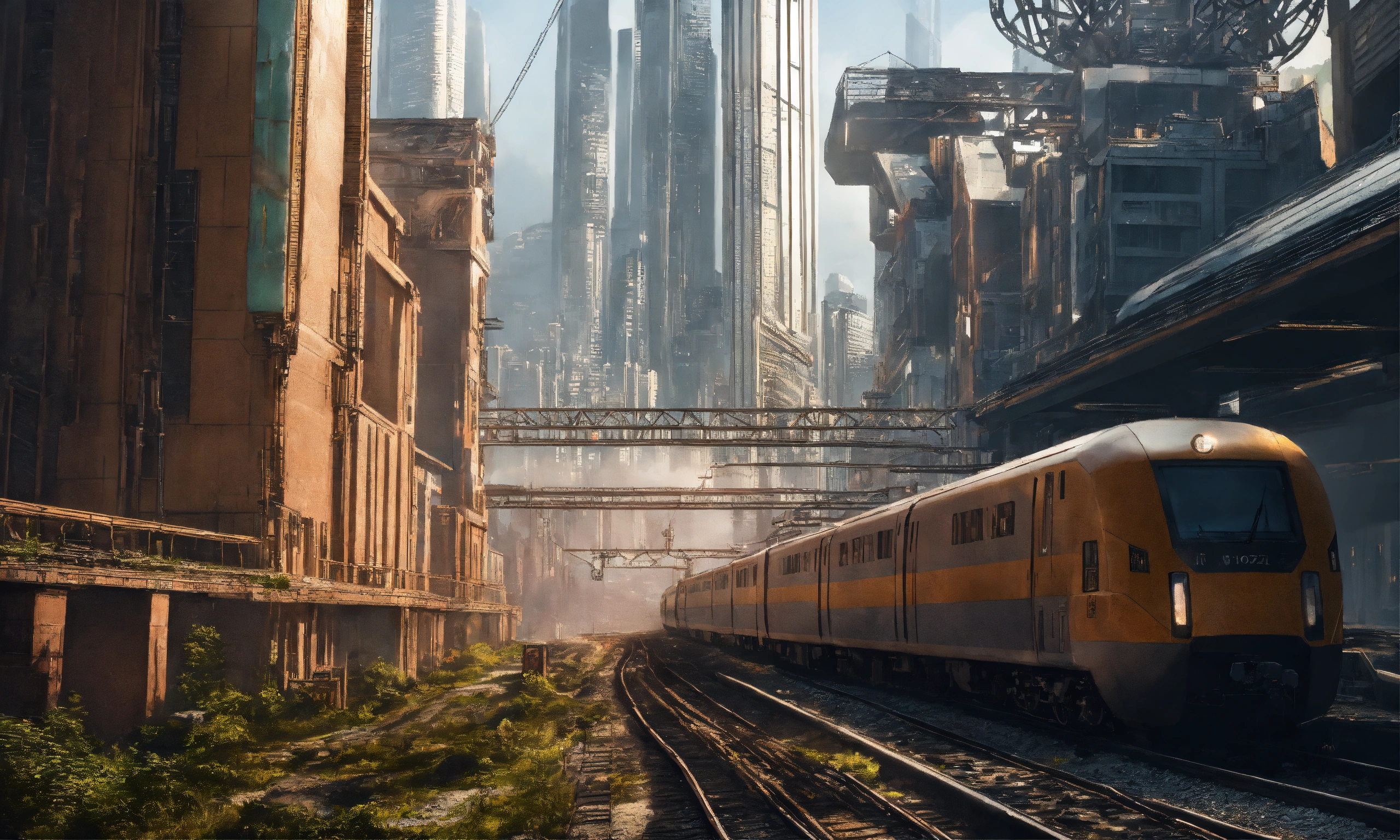 Realistic style, a future train in a near future city and a skyscraper, dystopian jewelry, 8k, masterpiece, best quality, ultra detailed