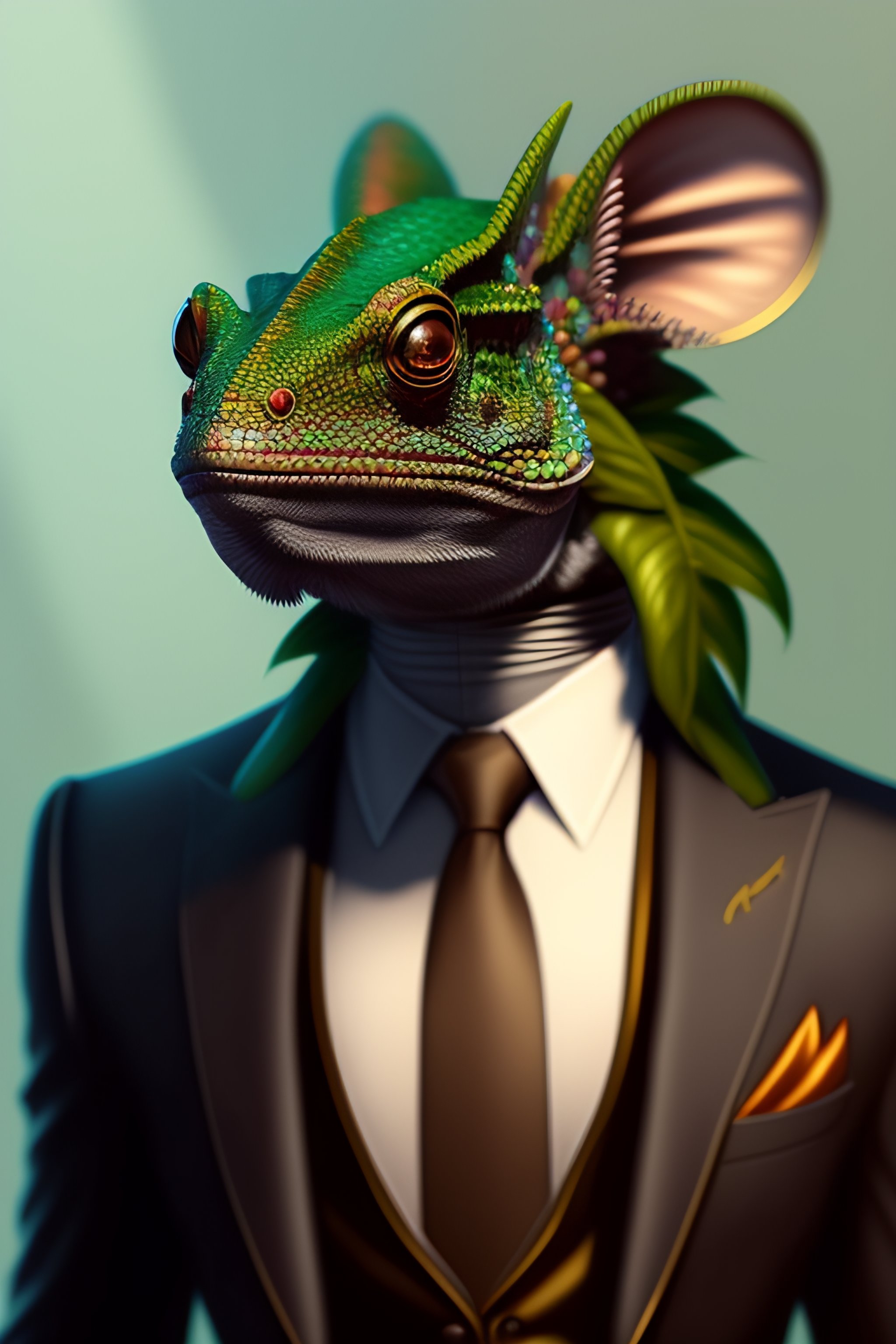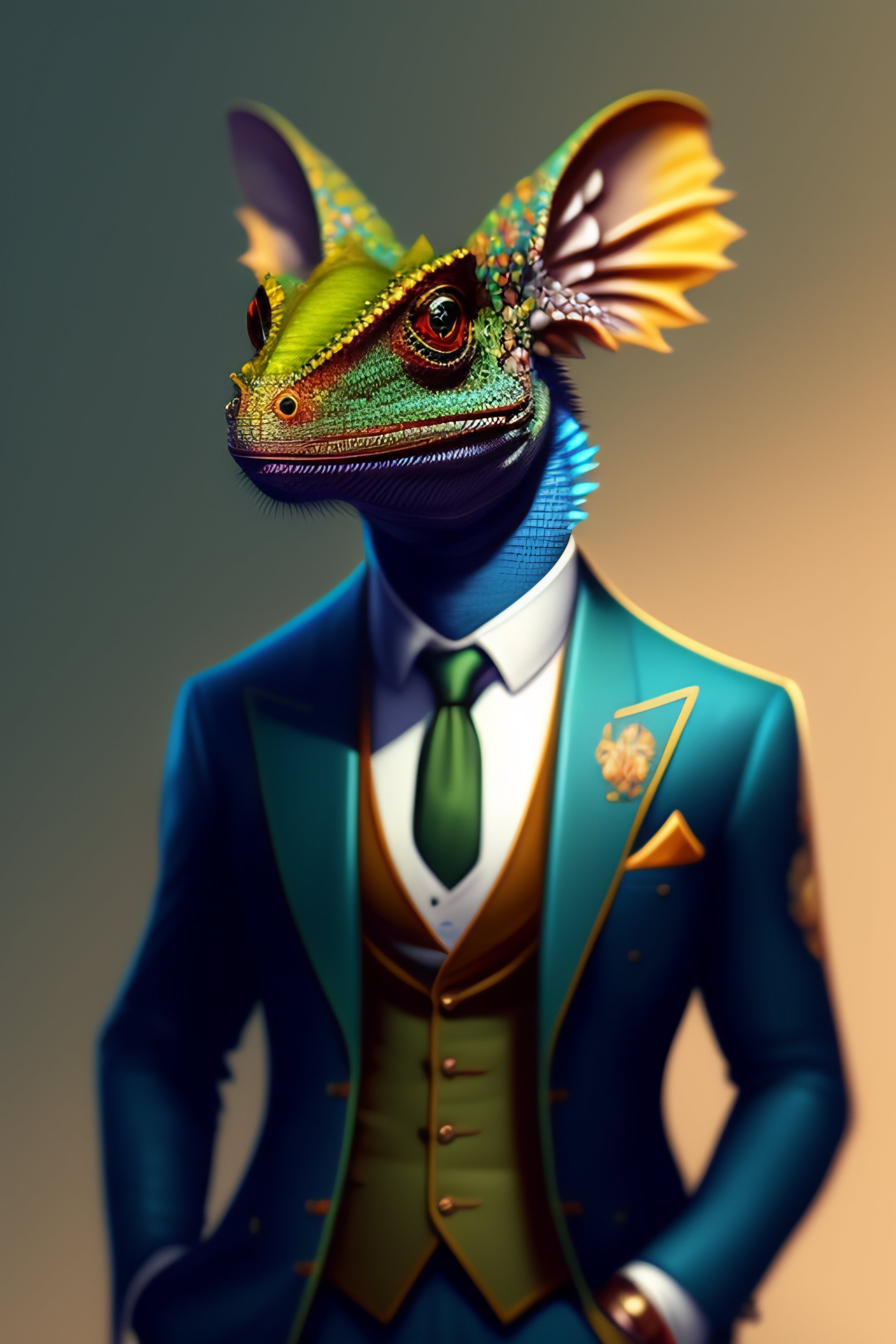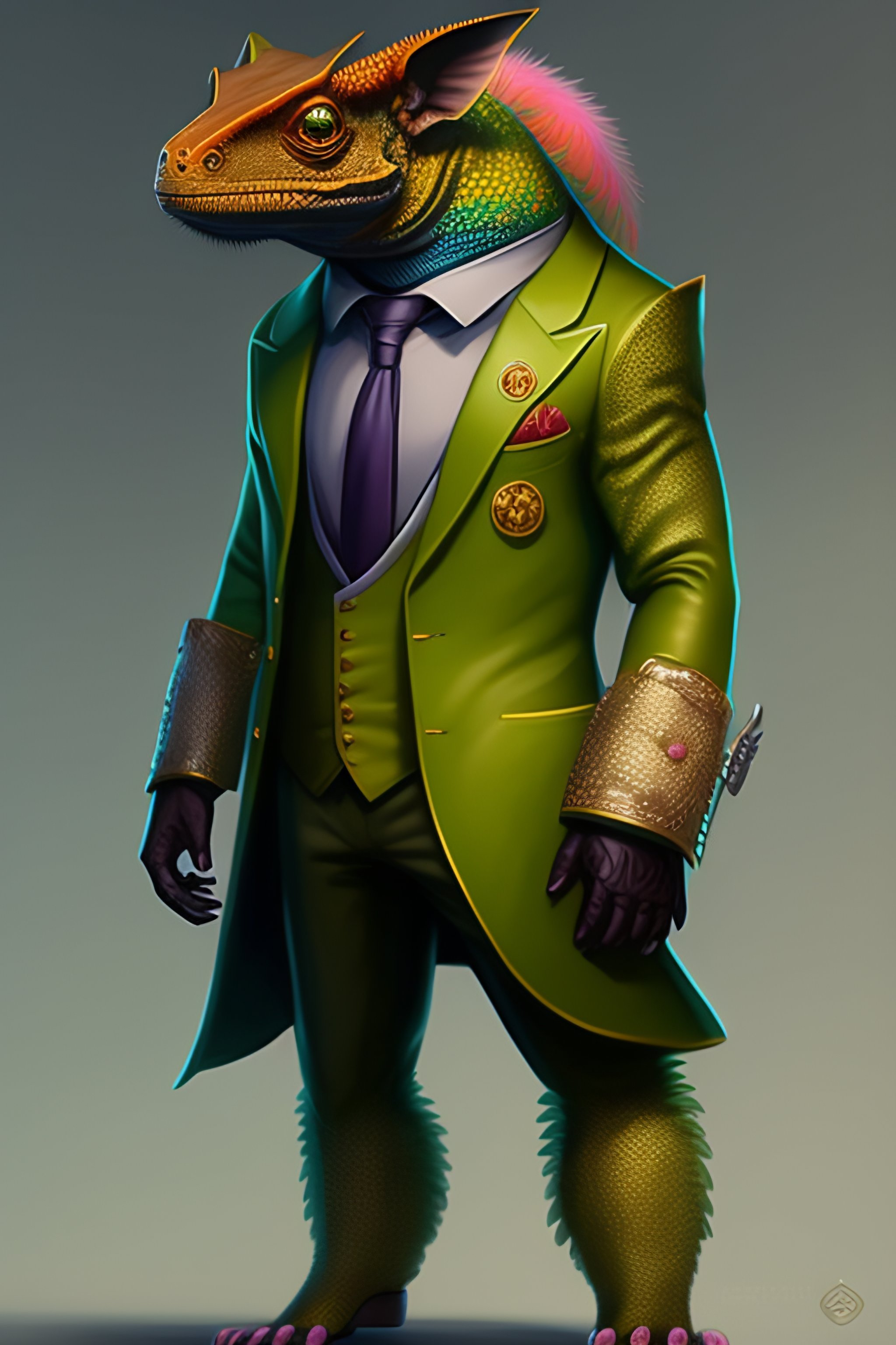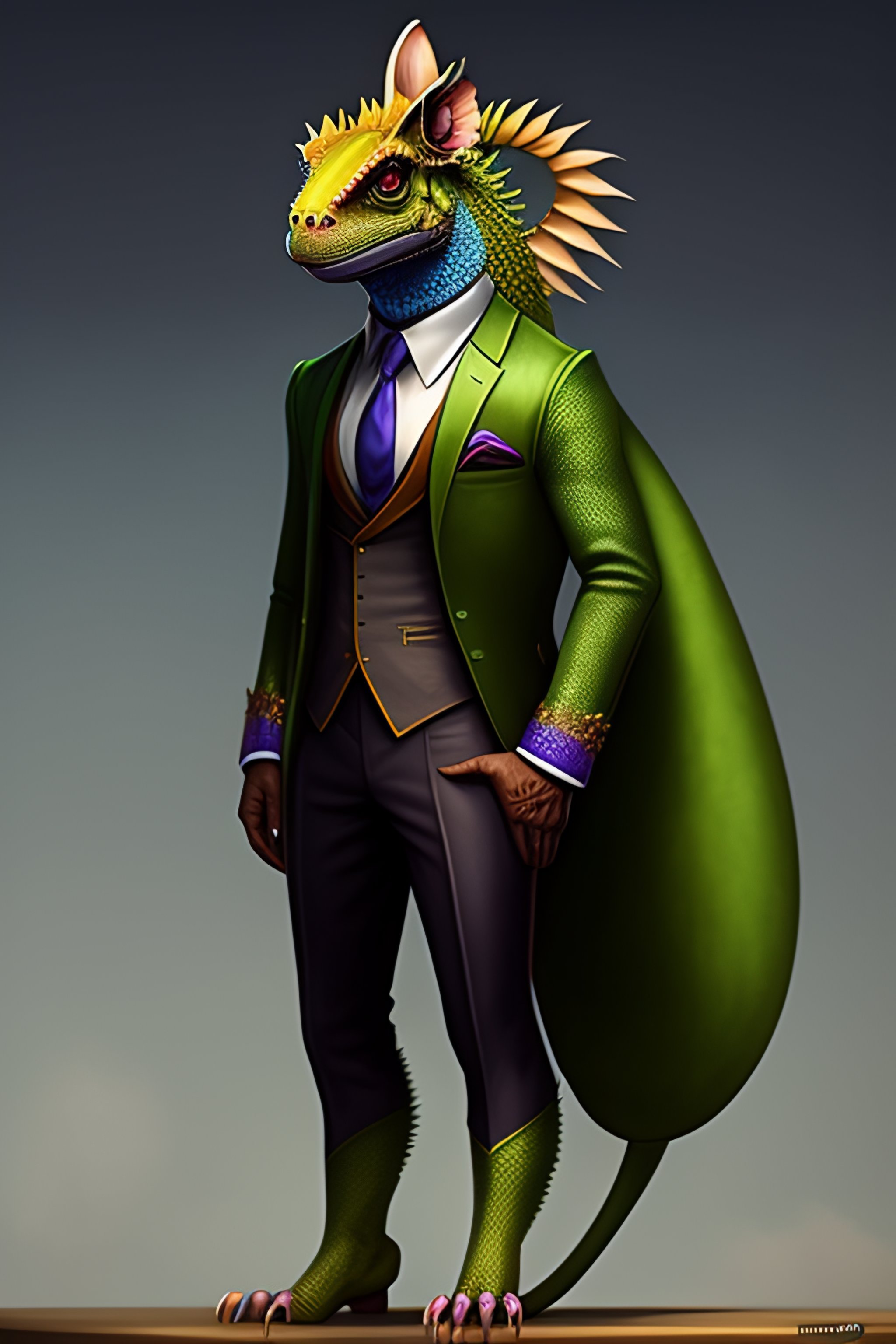 Anthropo-furry humanoid chameleon, three piece suit, character concept design, painting, detailed, vivid, popular on artstation