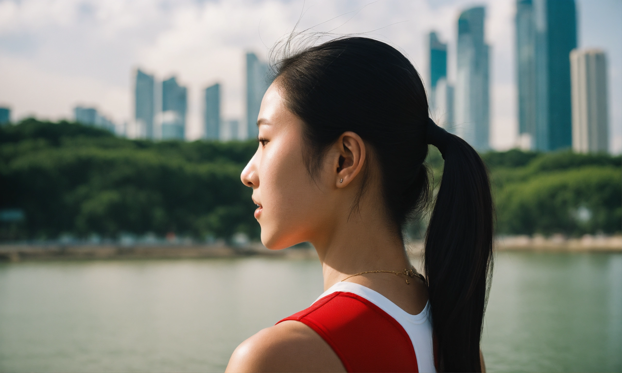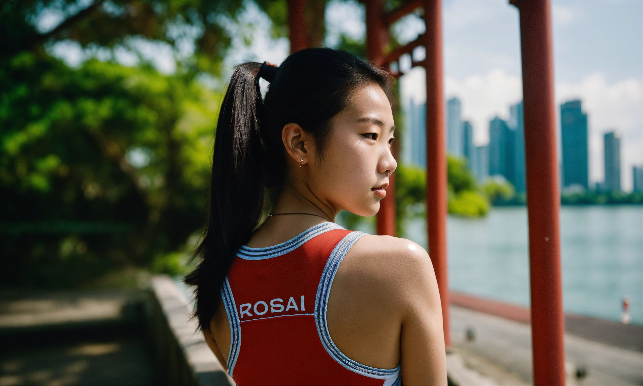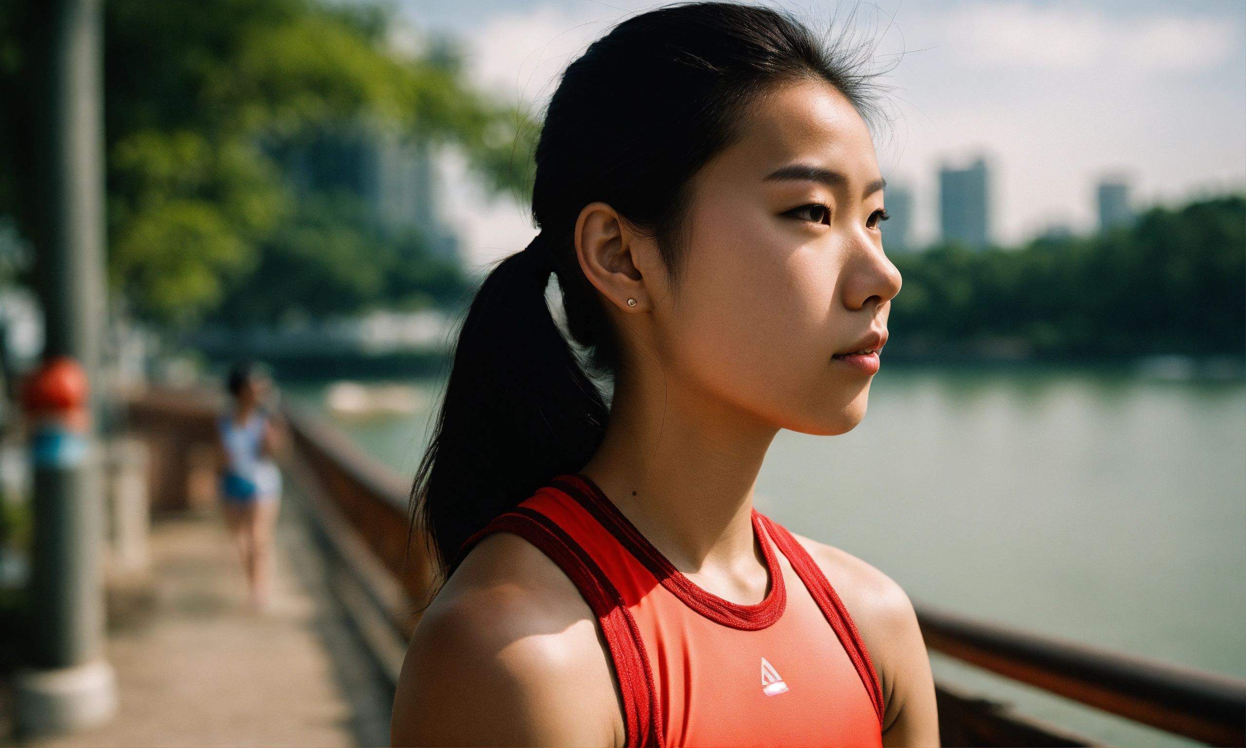 Sunny day, mid-day lighting, close-up side shot, slightly tanned face, athletic 18-year-old asian girl, ponytail singapore's east coast park, talking, calm and content, looking towards towards city scape beyond the edge of the water, wearing a plain red singlet, captured using leica summicron 35mm f2.0 lens, intricate details of expression, shot with kodak portra 400 film, cinematic richness.