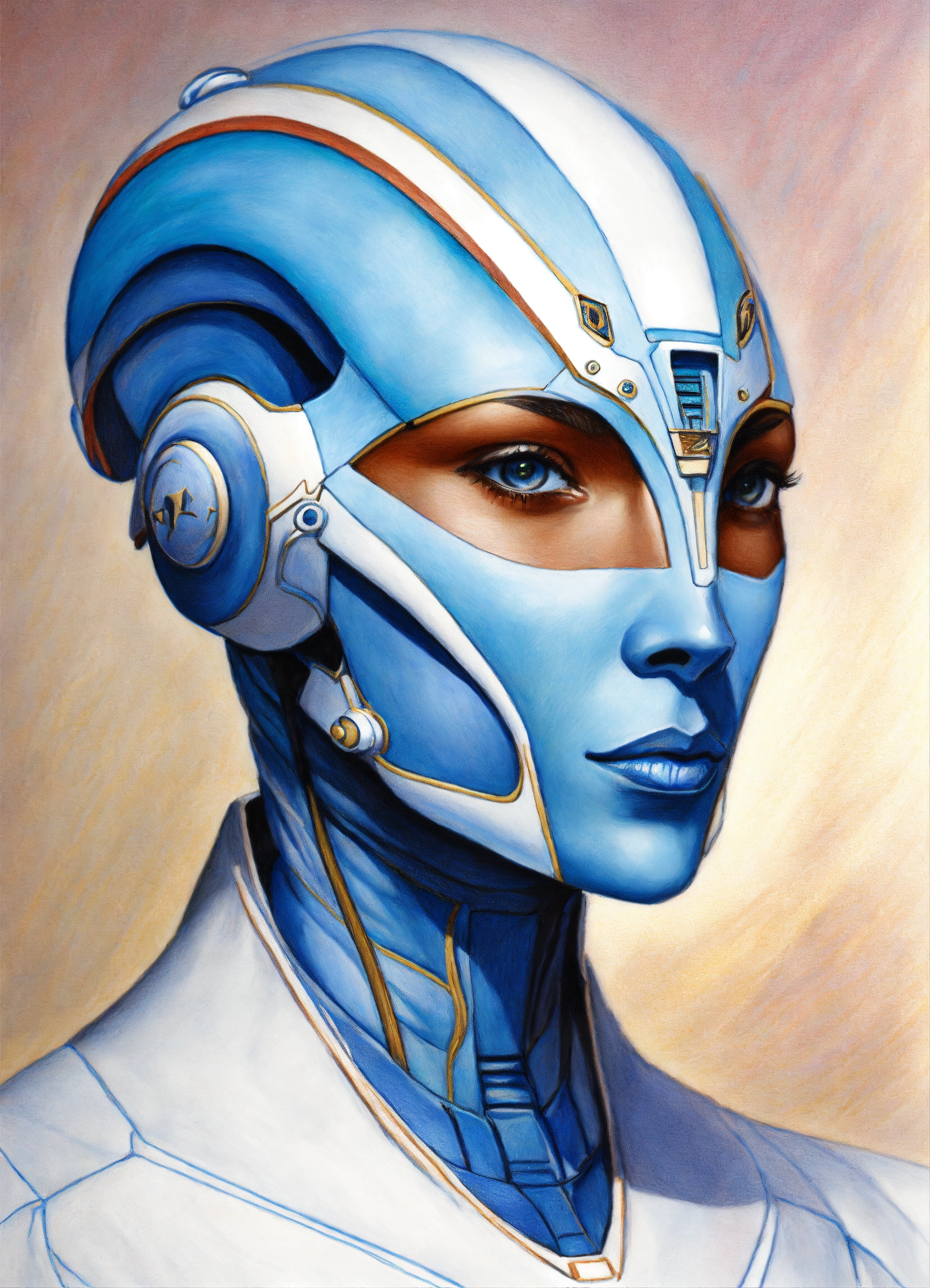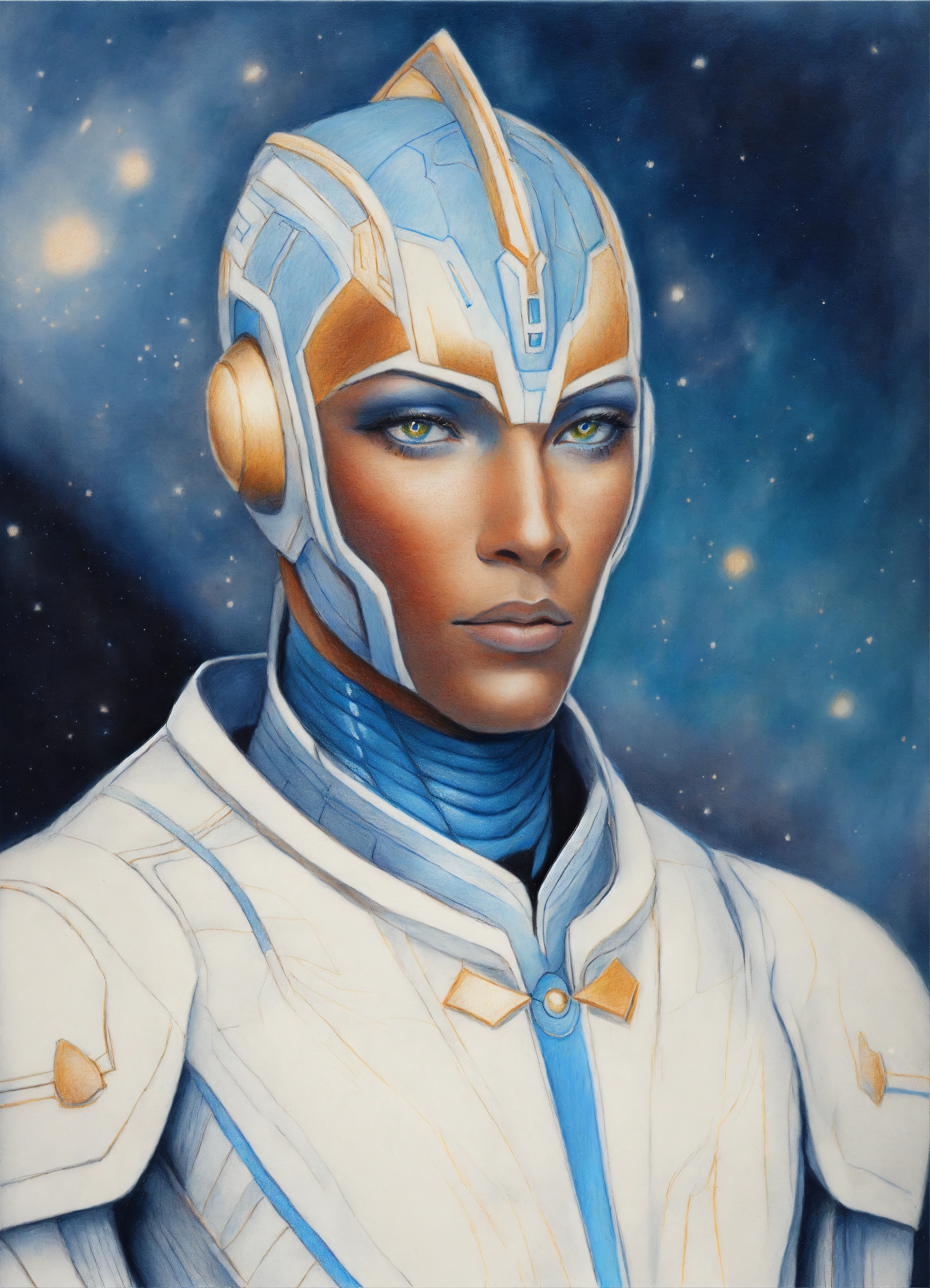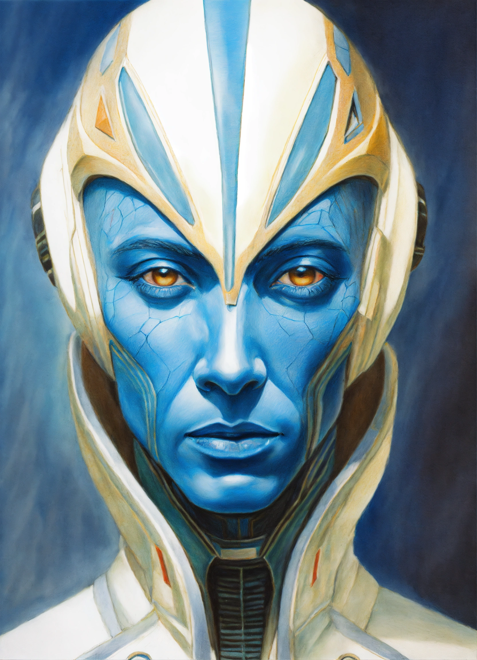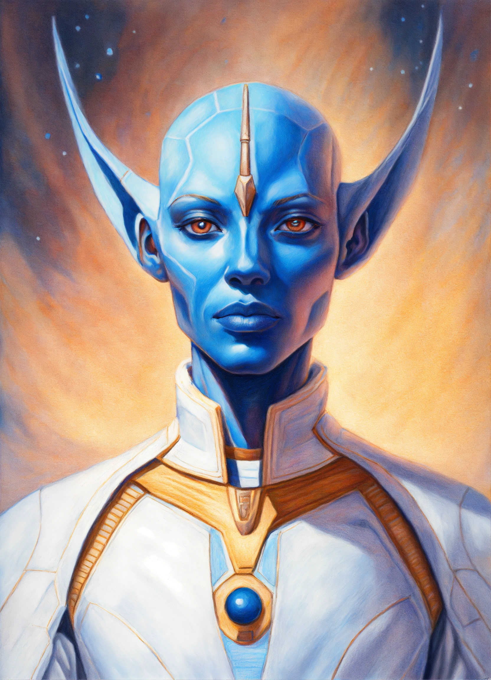 Colored pencil drawing of portrait of portrait of a humanoid arcturian with blue skin and an elongated head. member of a starfleet command. loving eyes, kind, friendly, sympathetic. wearing white clothes. white background.