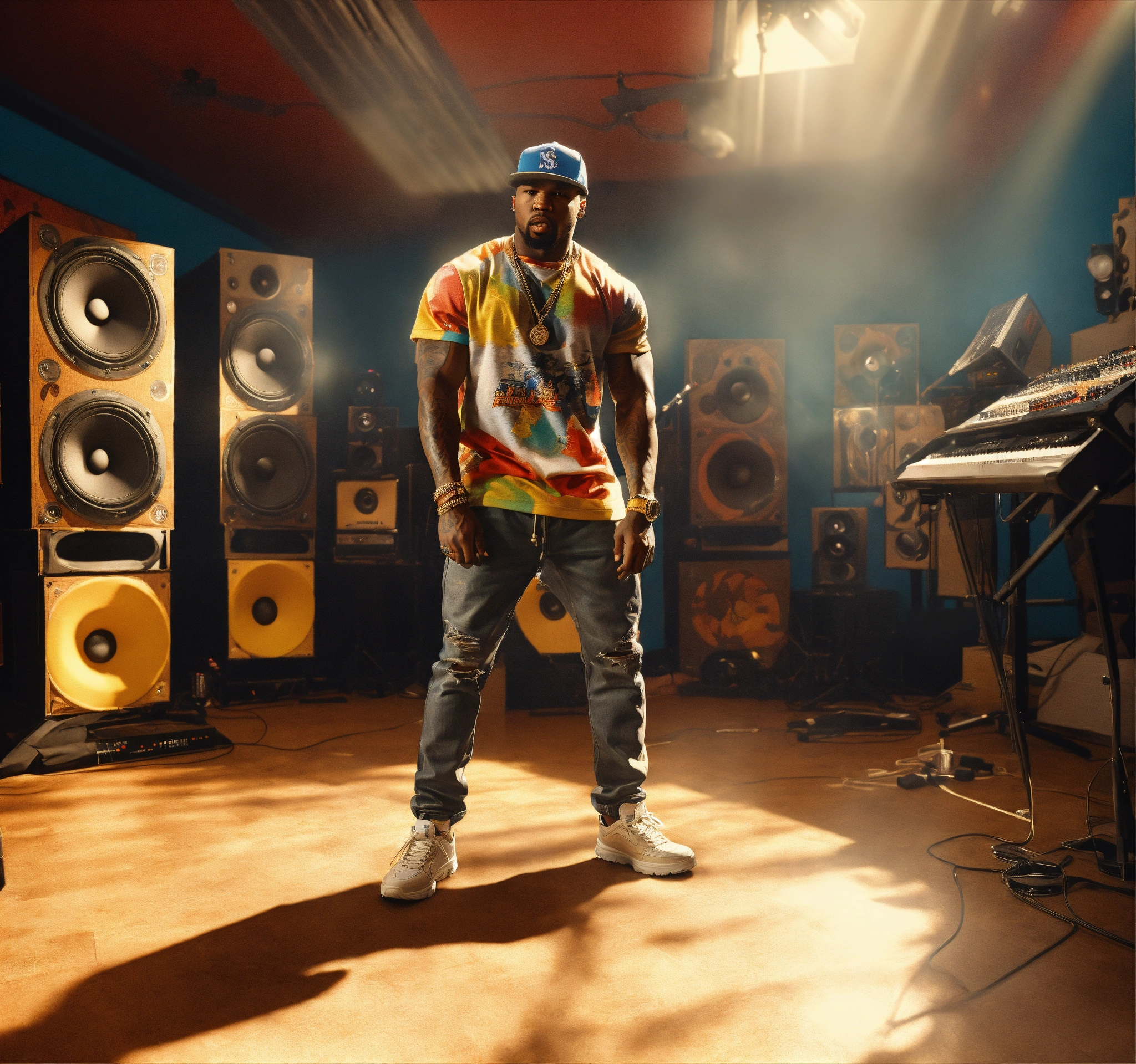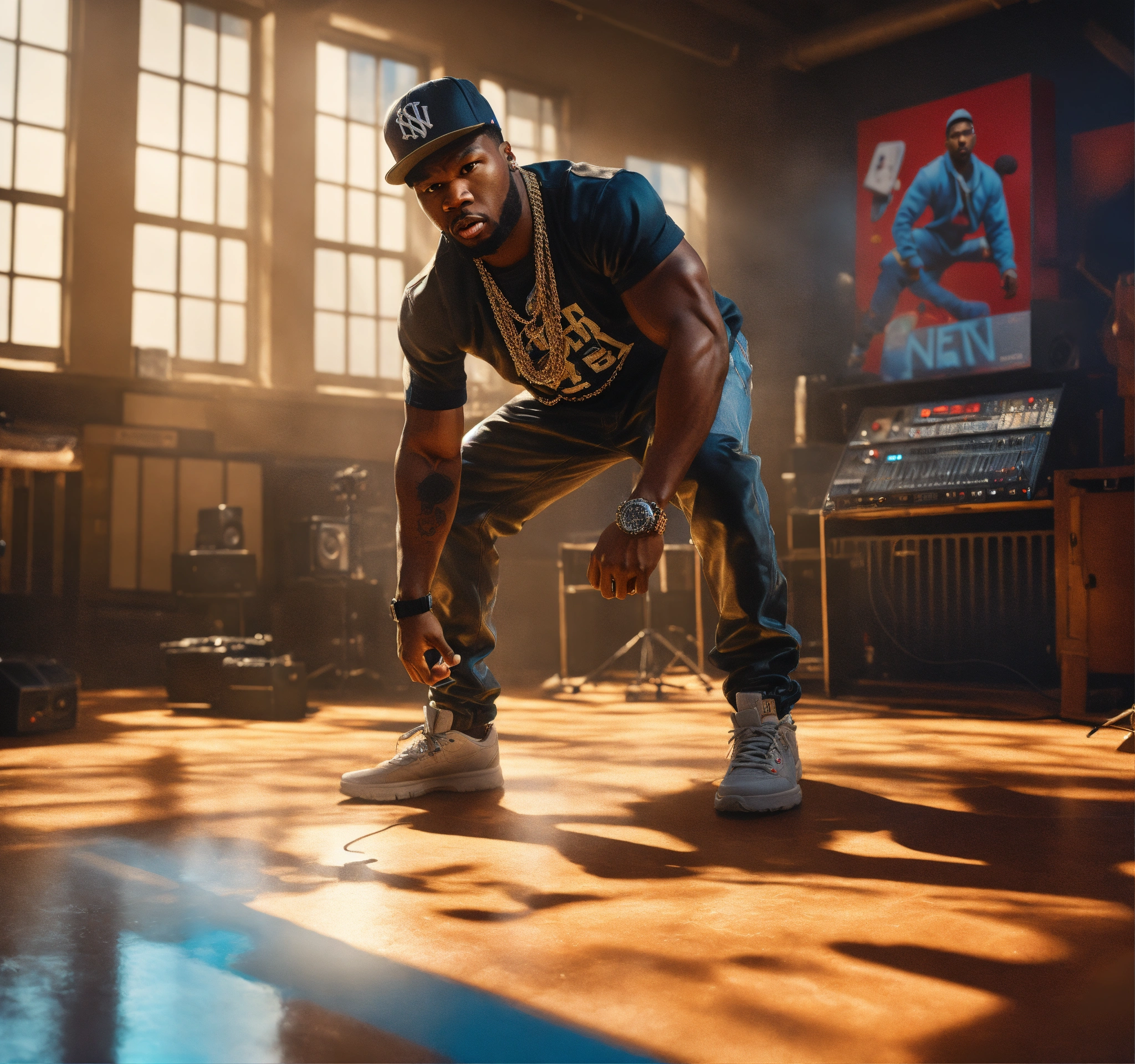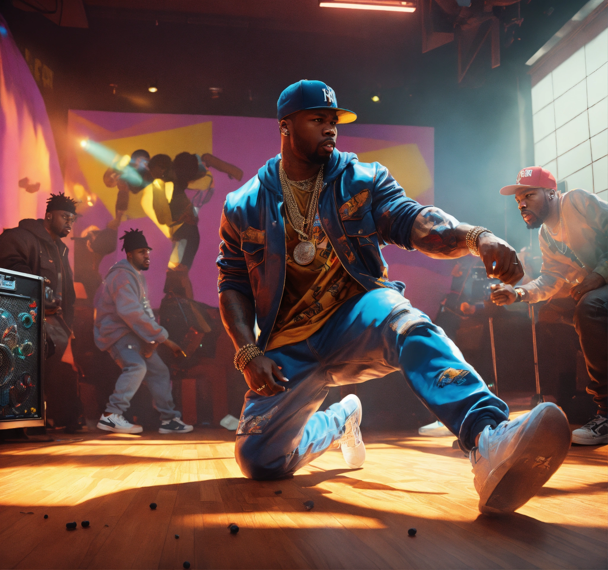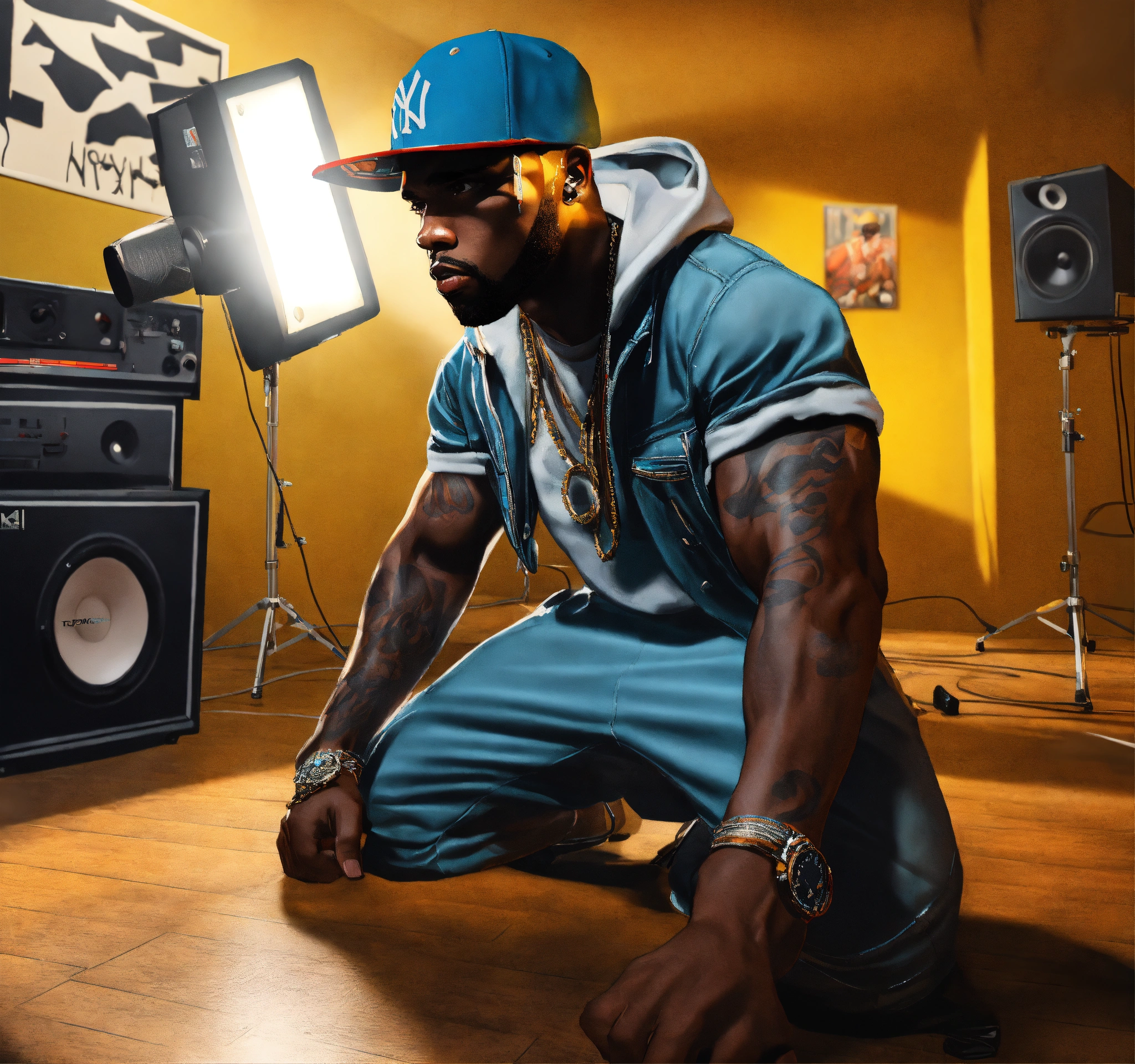 Medium shot angle pop art, hyperrealist full body portrait of black 50 cent looking rapper fighting in a recording studio rapper ja tule on floor new york street on a sunny day, fantasy art, photo realistic, dynamic lighting, artstation, poster, volumetric lighting, very detailed faces, 4 k, award winning