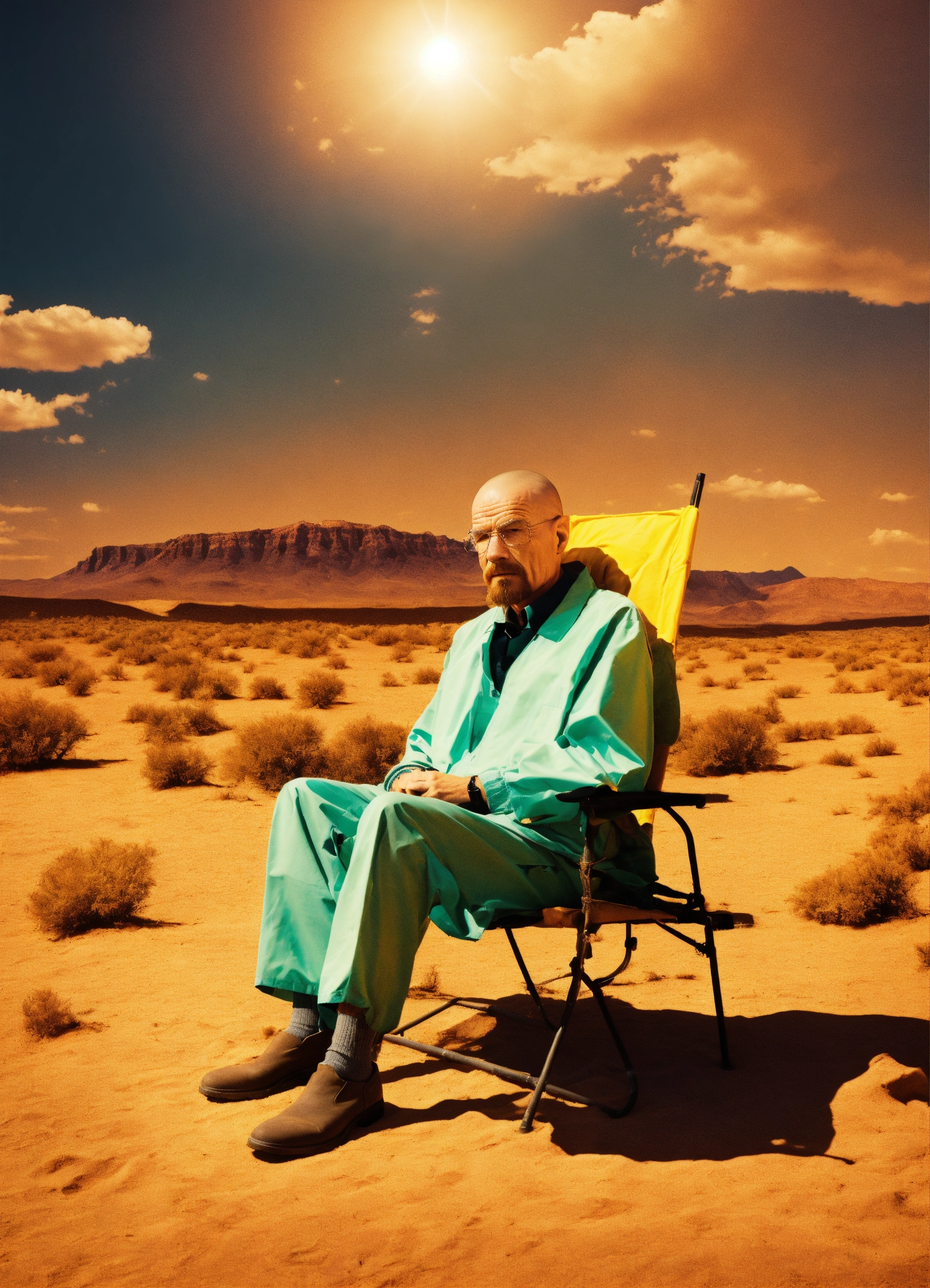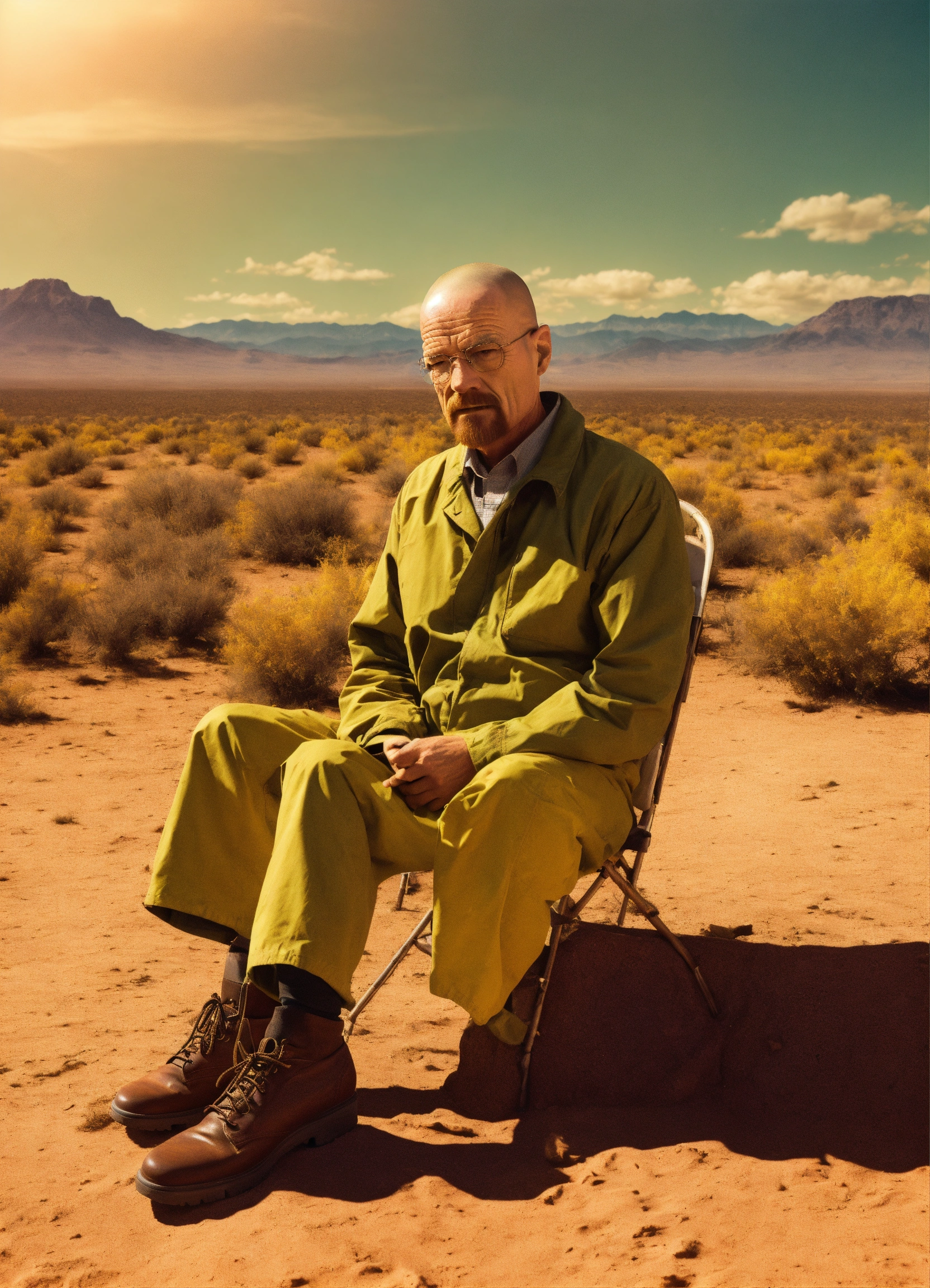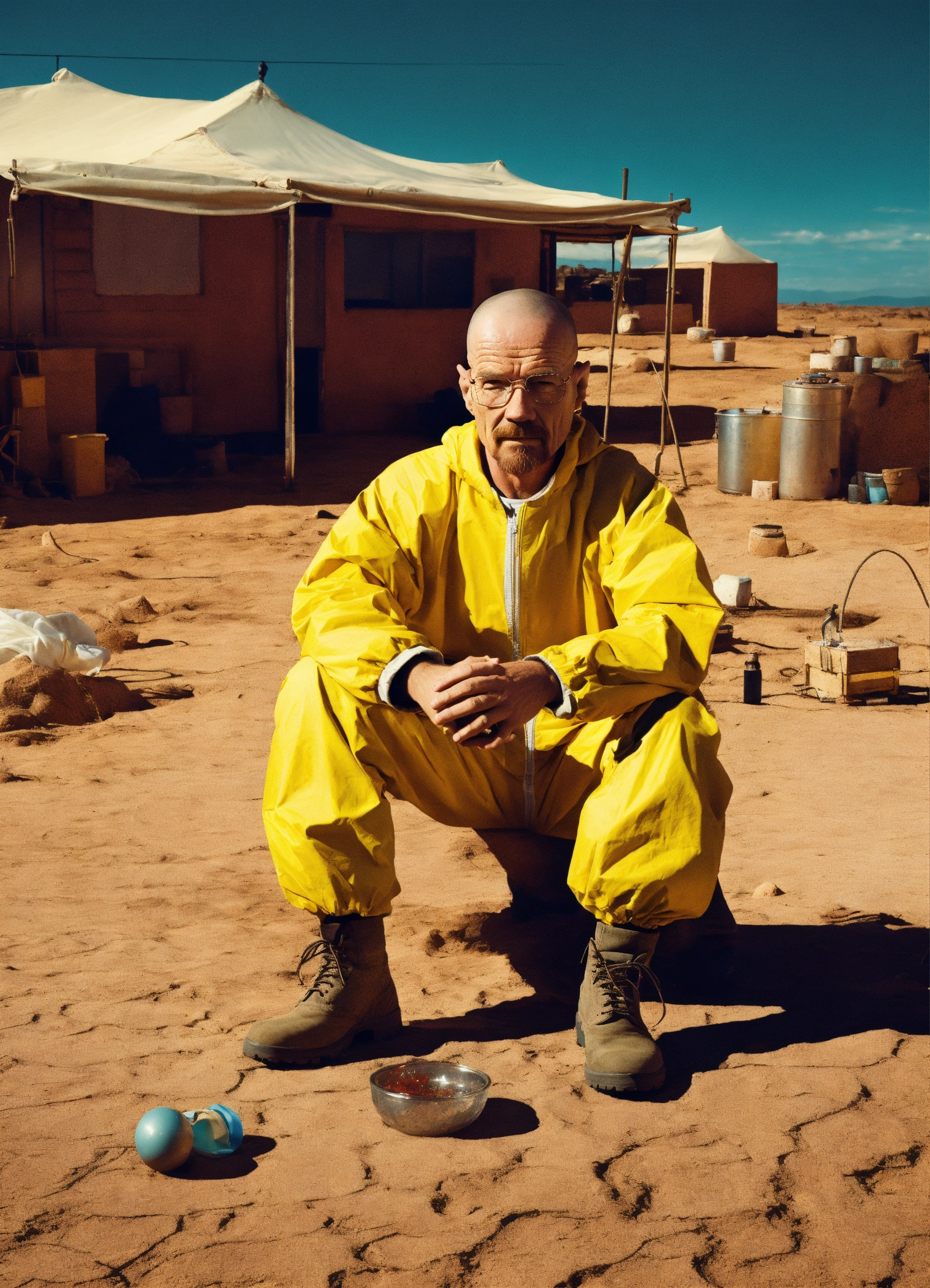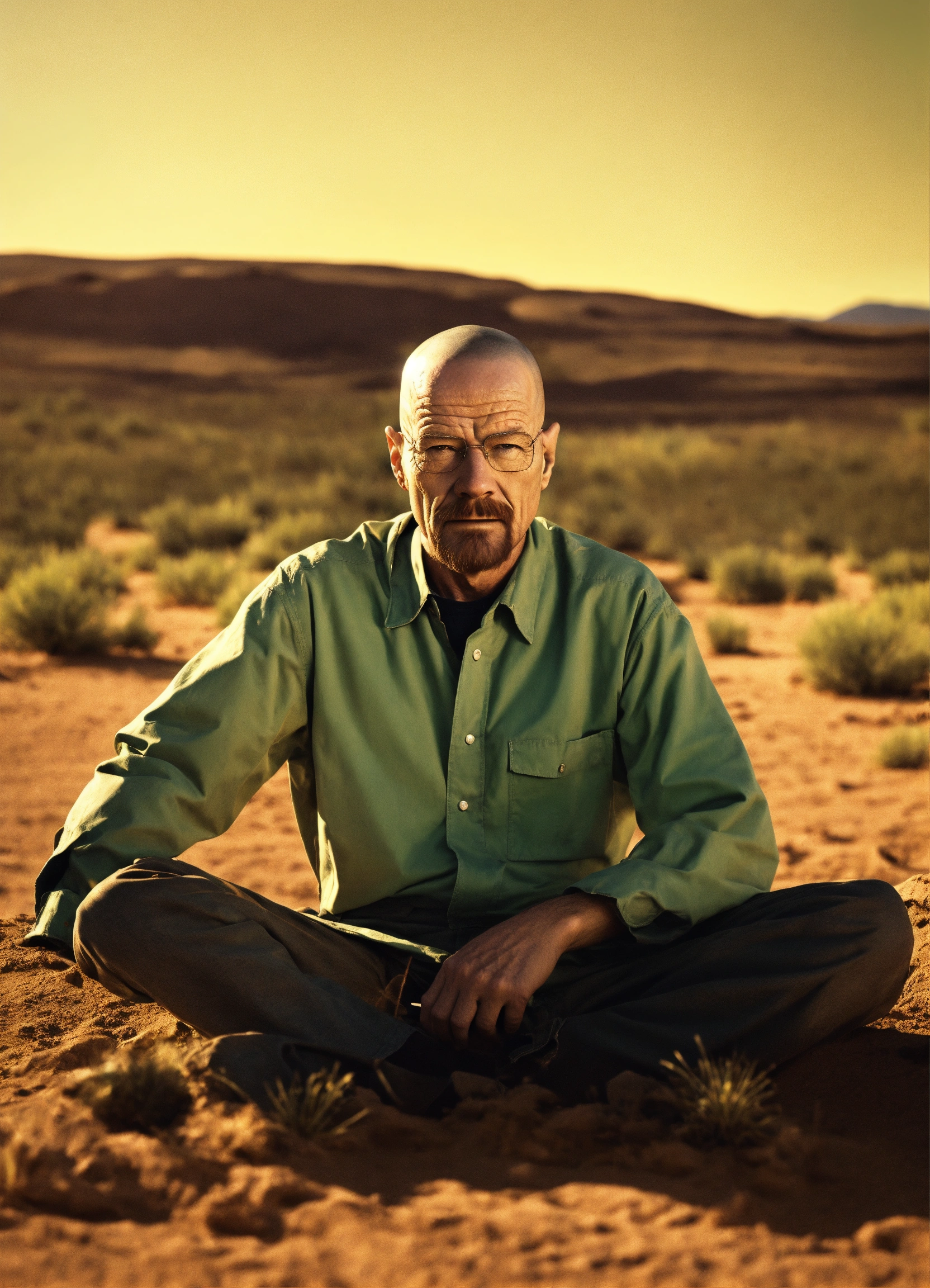 Walter white est assis sur le sol, il regarde l’objectif, l' image est une animation 3d issue de photograph