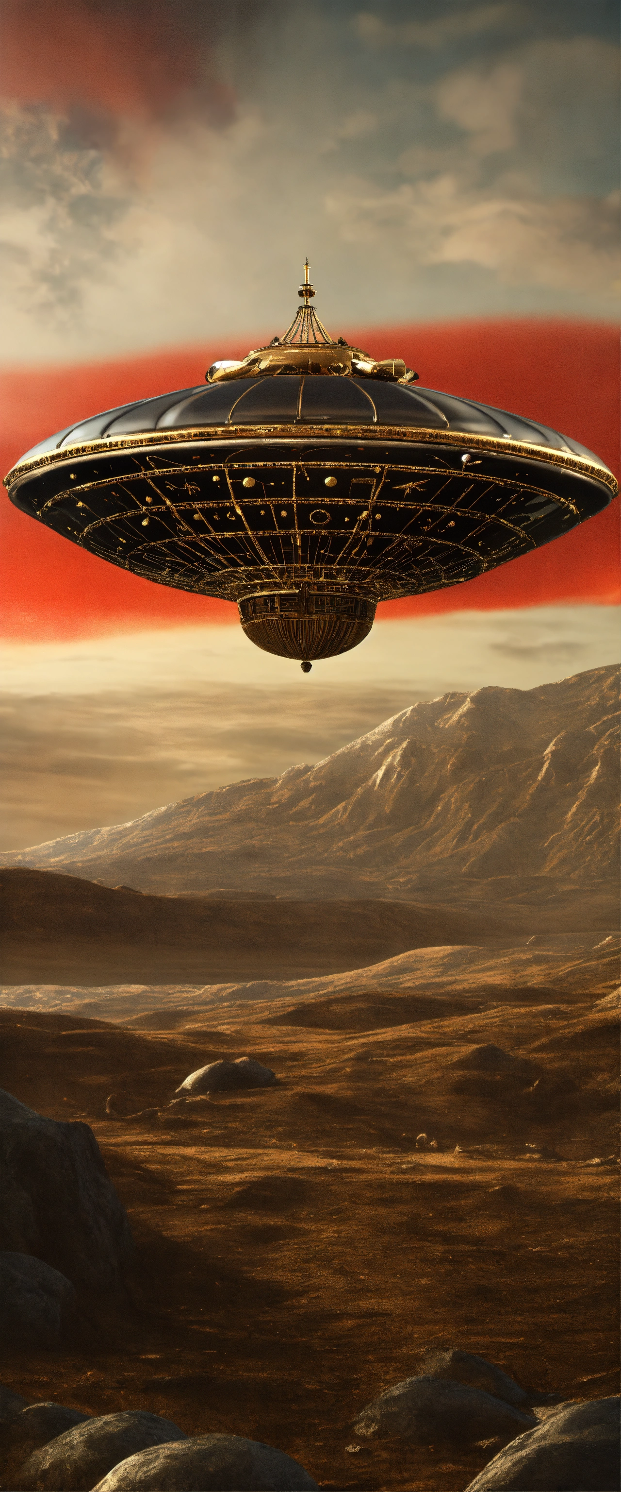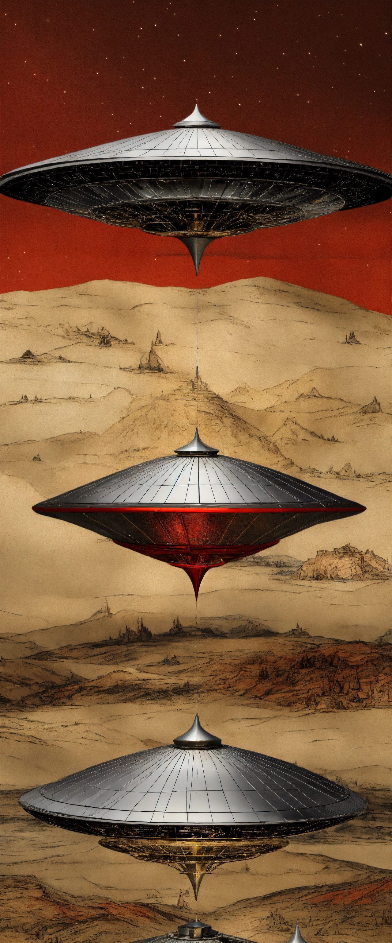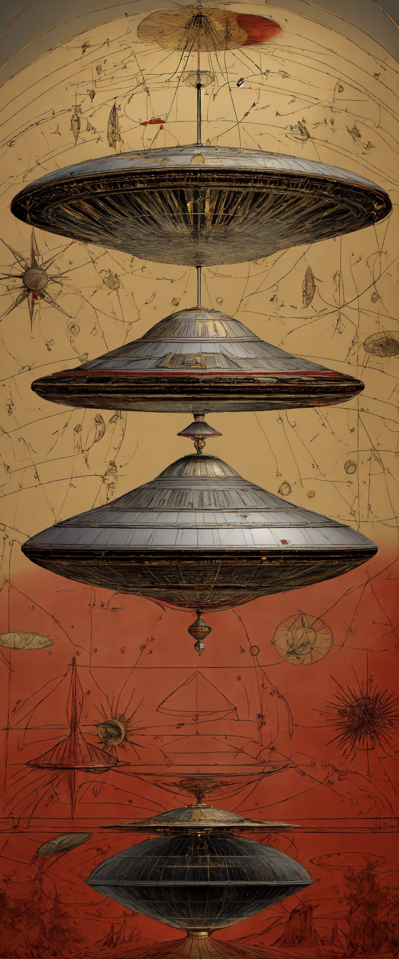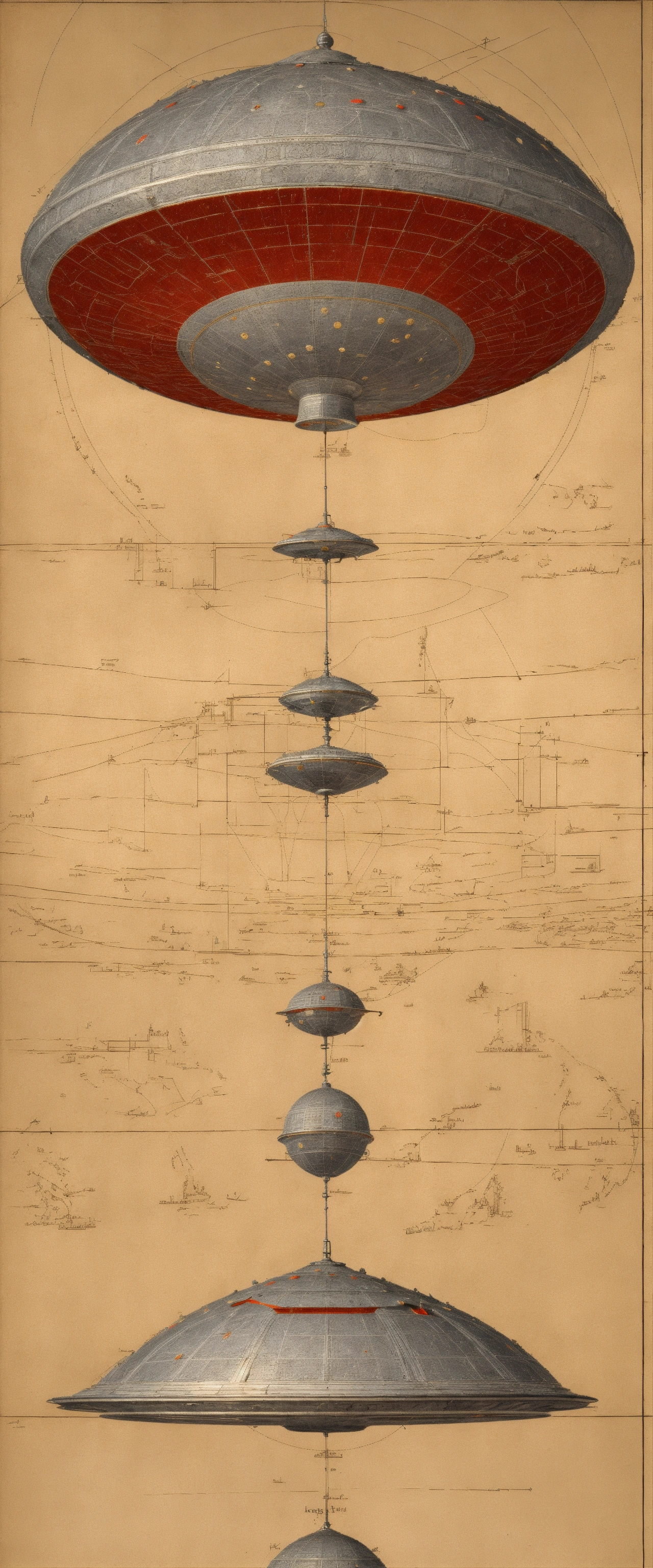A 3d render of a ufo in silver, black, gold, and red with accurate lines, from different perspectives designed by leonardo da vinci in the voynich manuscript, 256k highest resolution, surreal, very sharp, vintage paper, very accurate lines.