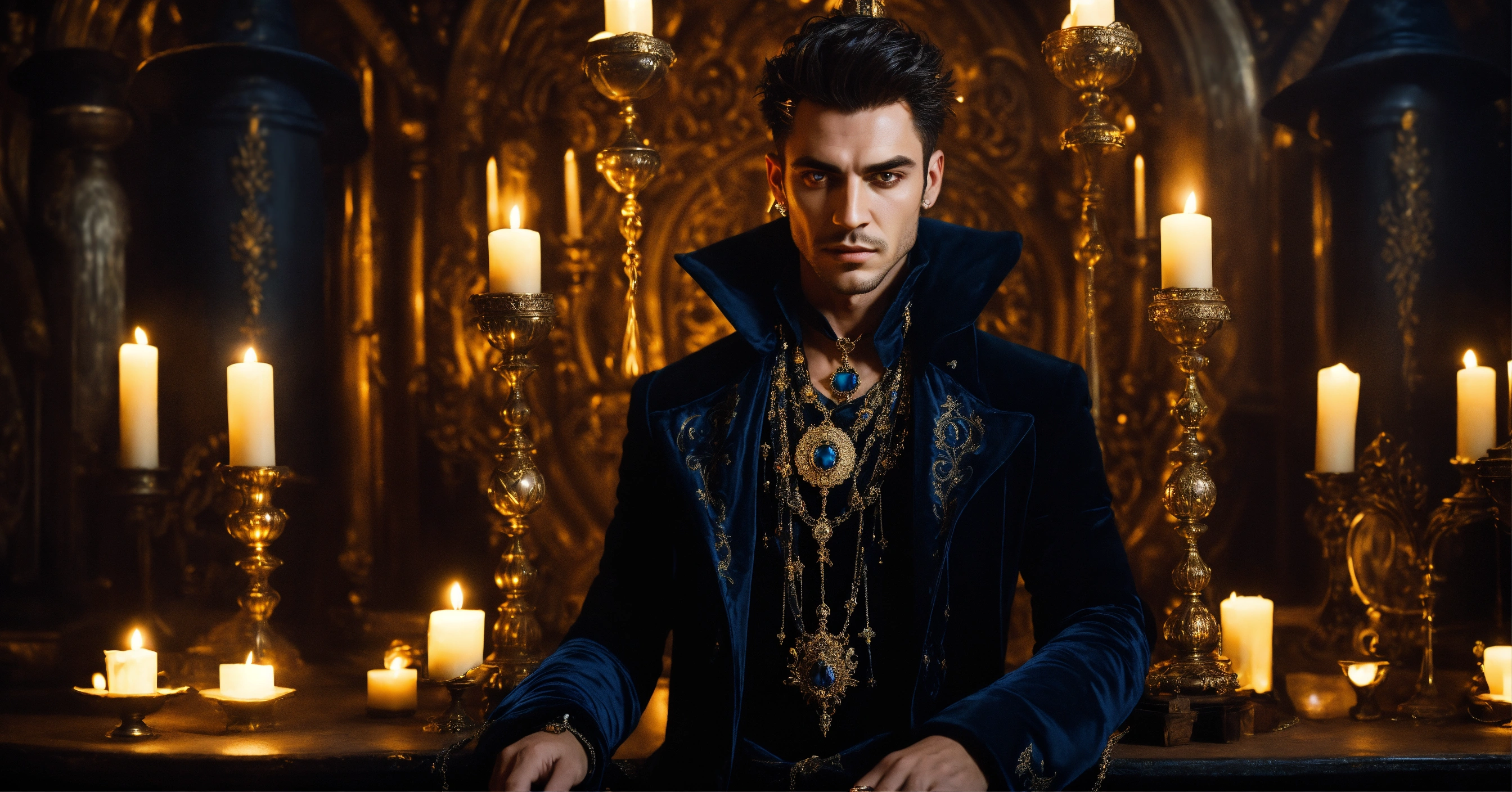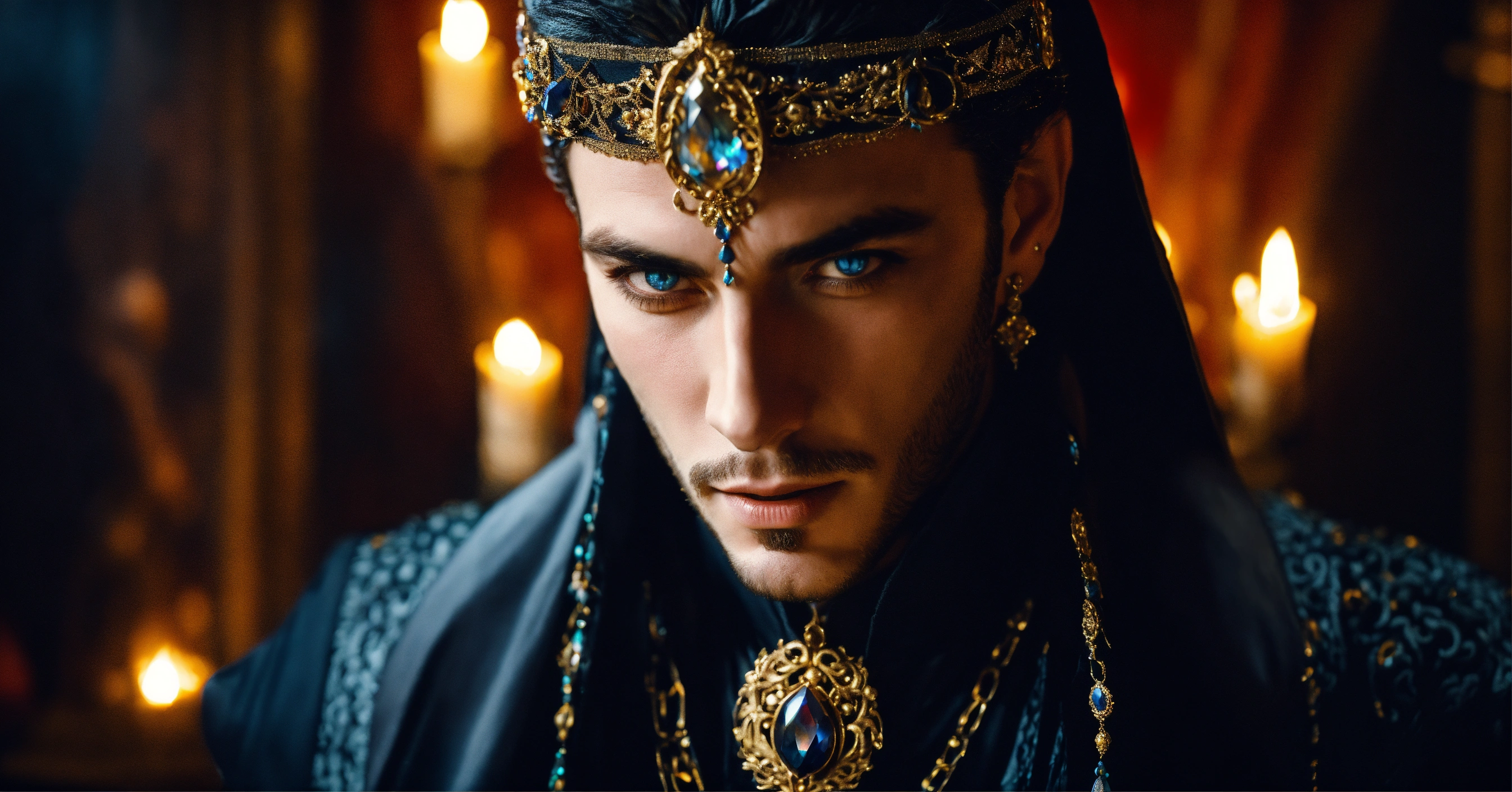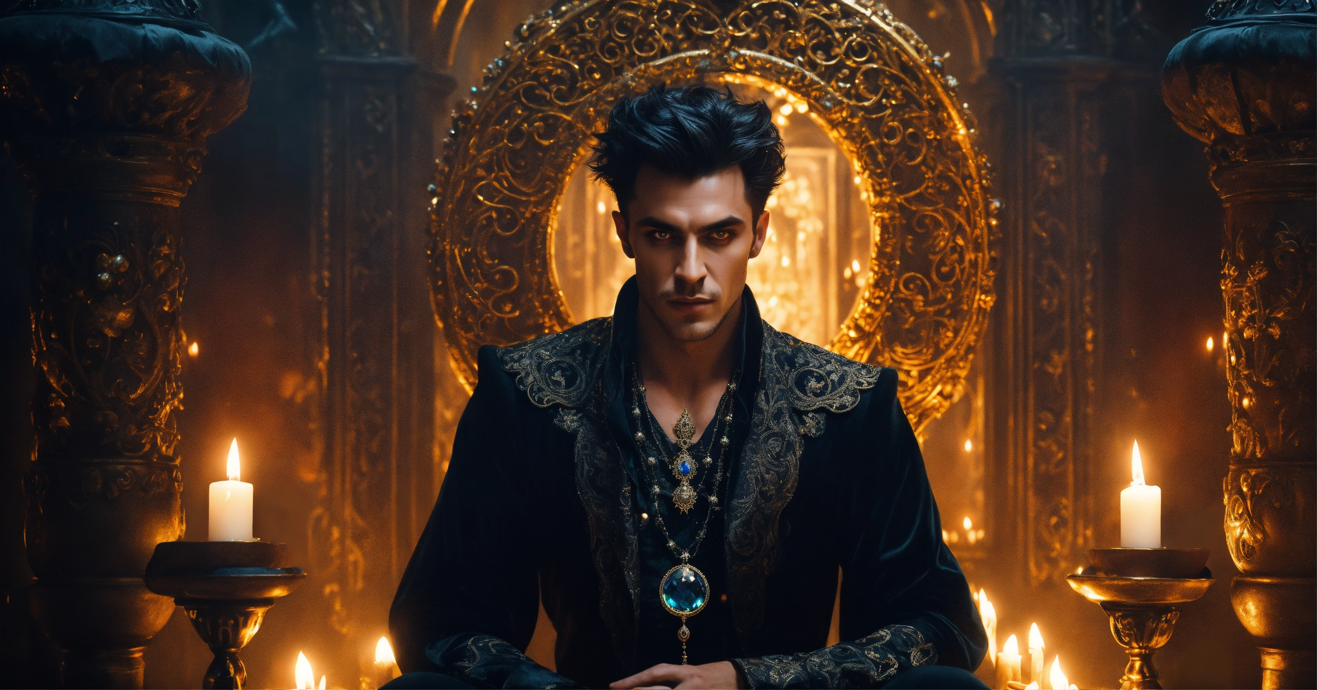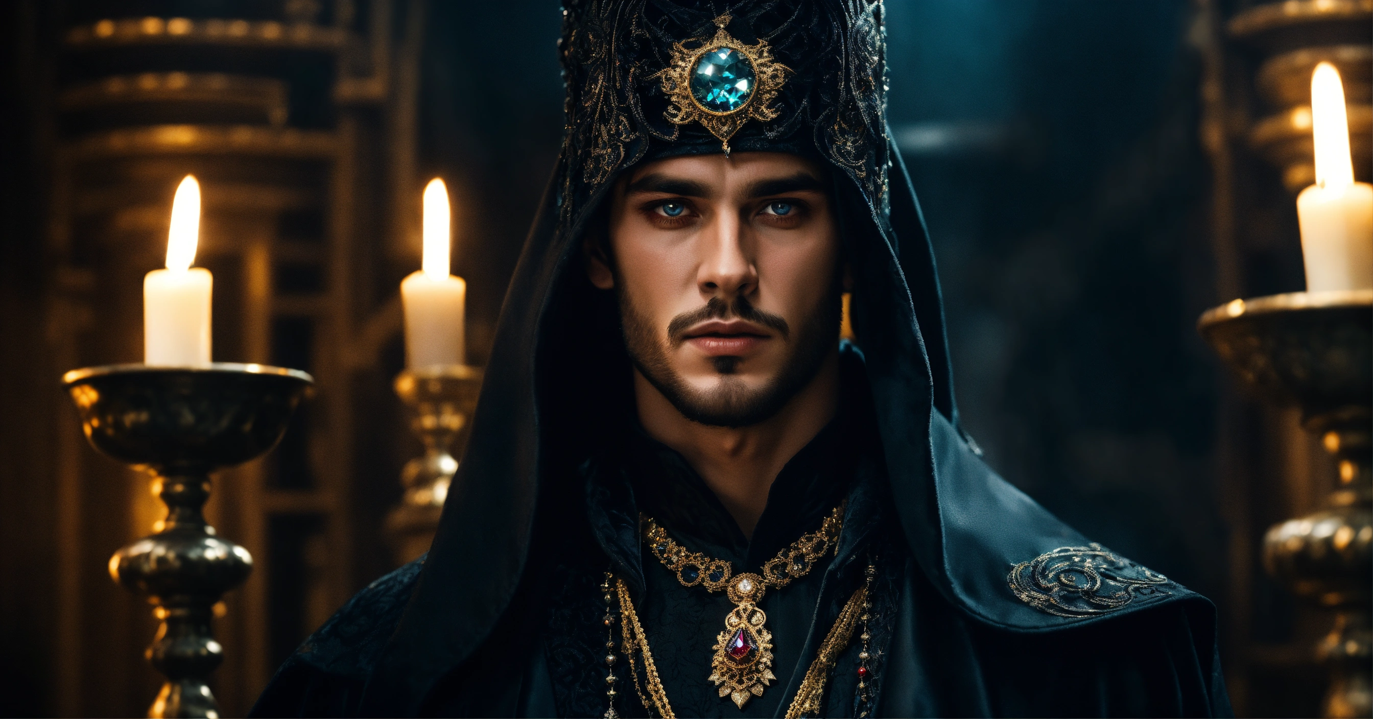 Dark and dramatic fantasy portrait of a young and handsome sinister sorcerer with sparkling mesmerising eyes, dressed in elaborate dark clothes and ornate jewellery putting a spell on the viewer in a secret occult chamber.