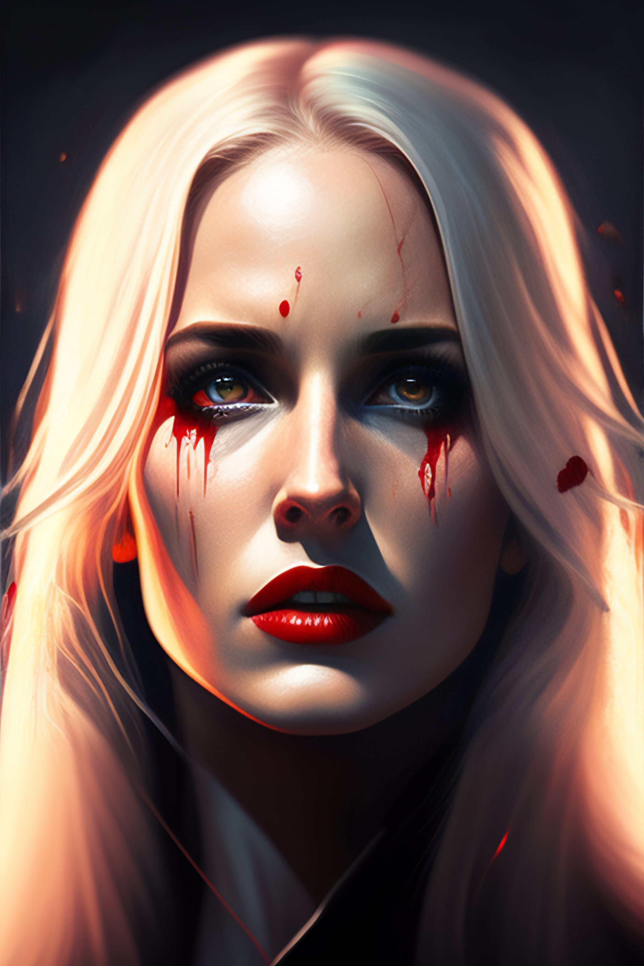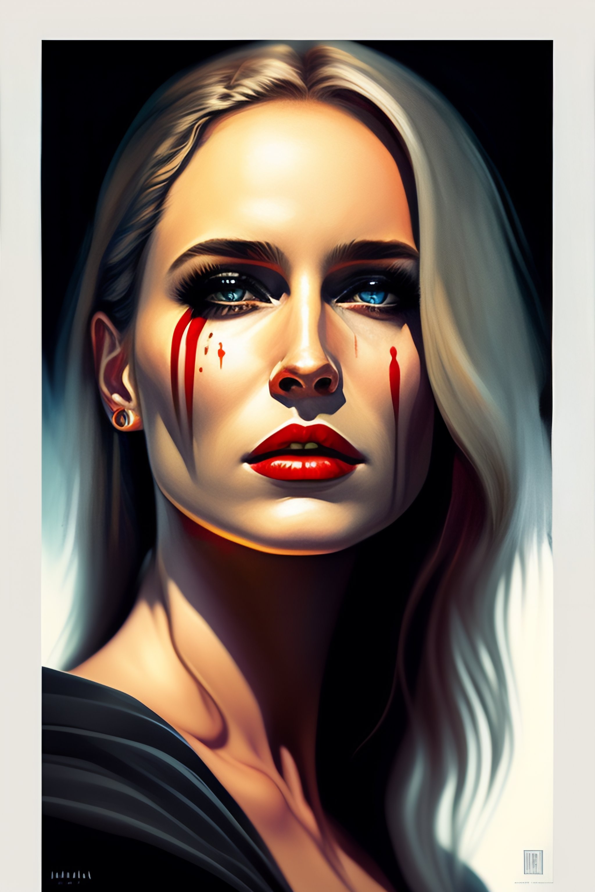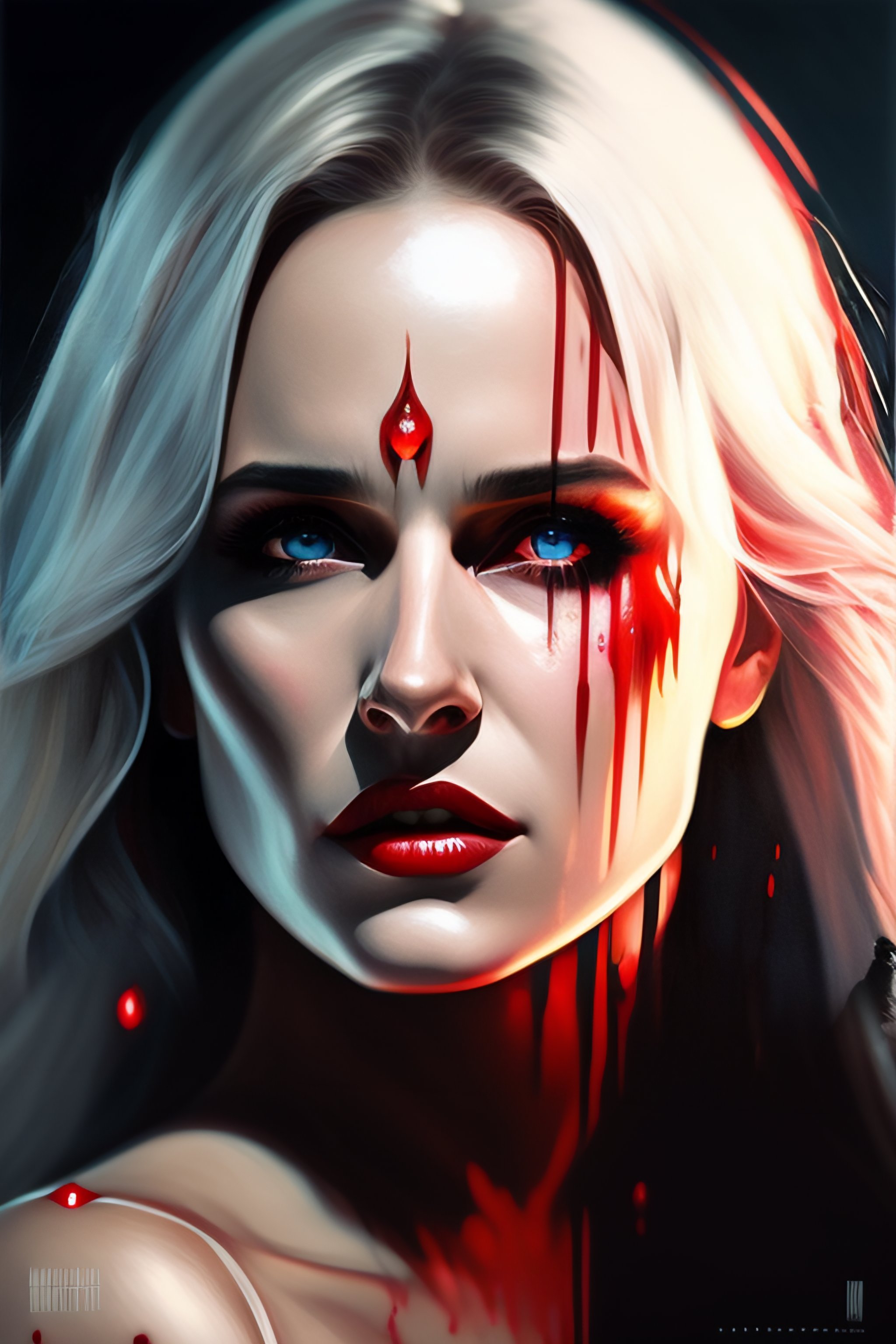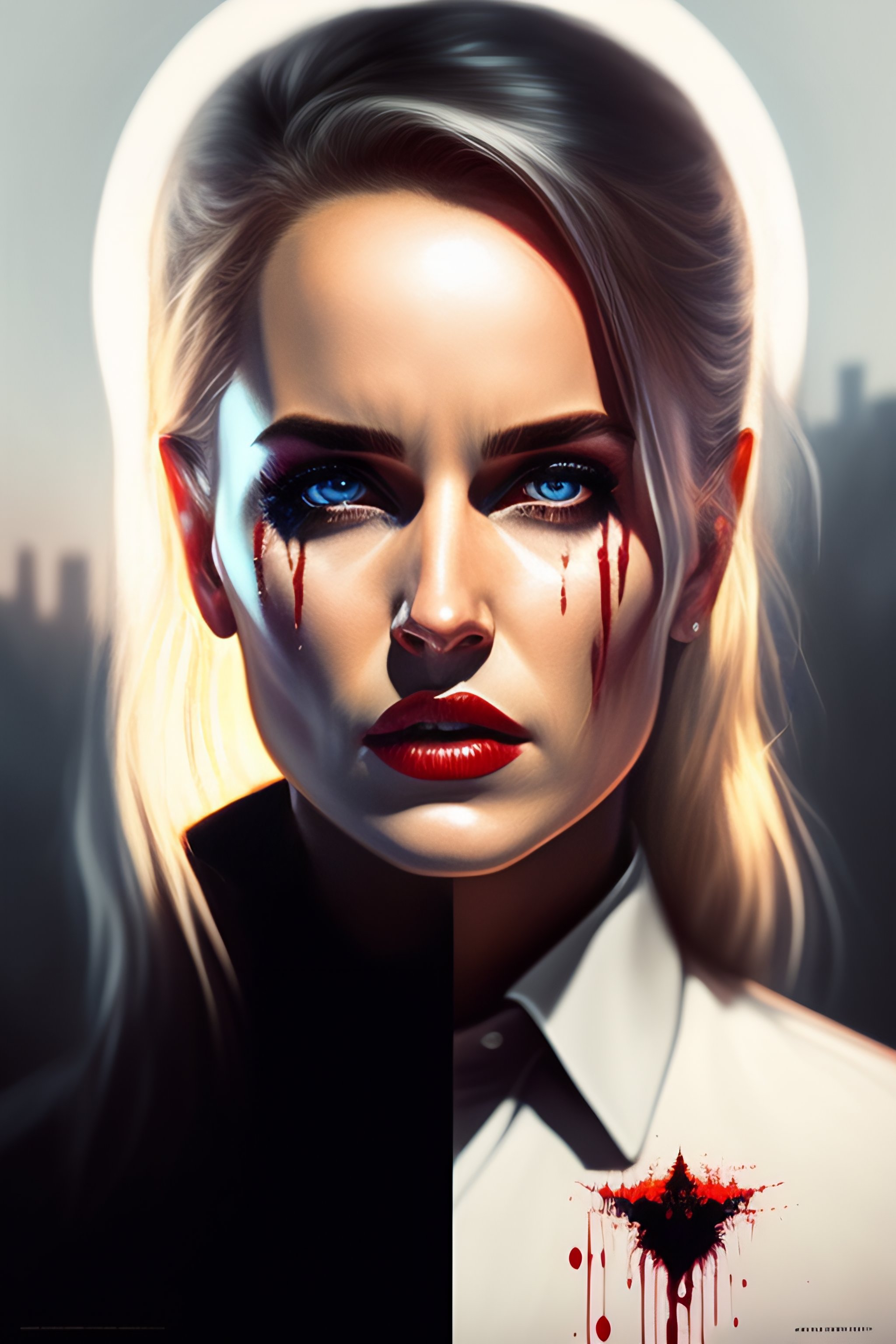 Sharp hq rendering, dark young blond patricia arquette with white eyes dripping blood from his forehead and having an stigmata, long hair, a black devil up in the background, white eyes, horror face, creepy, character portrait, concept art, painterly, fanart, highly detailed in the style of wlop by ilya kuvshinov, wenjun lin, angular asymmetrical design, horror movie, scary movie poster