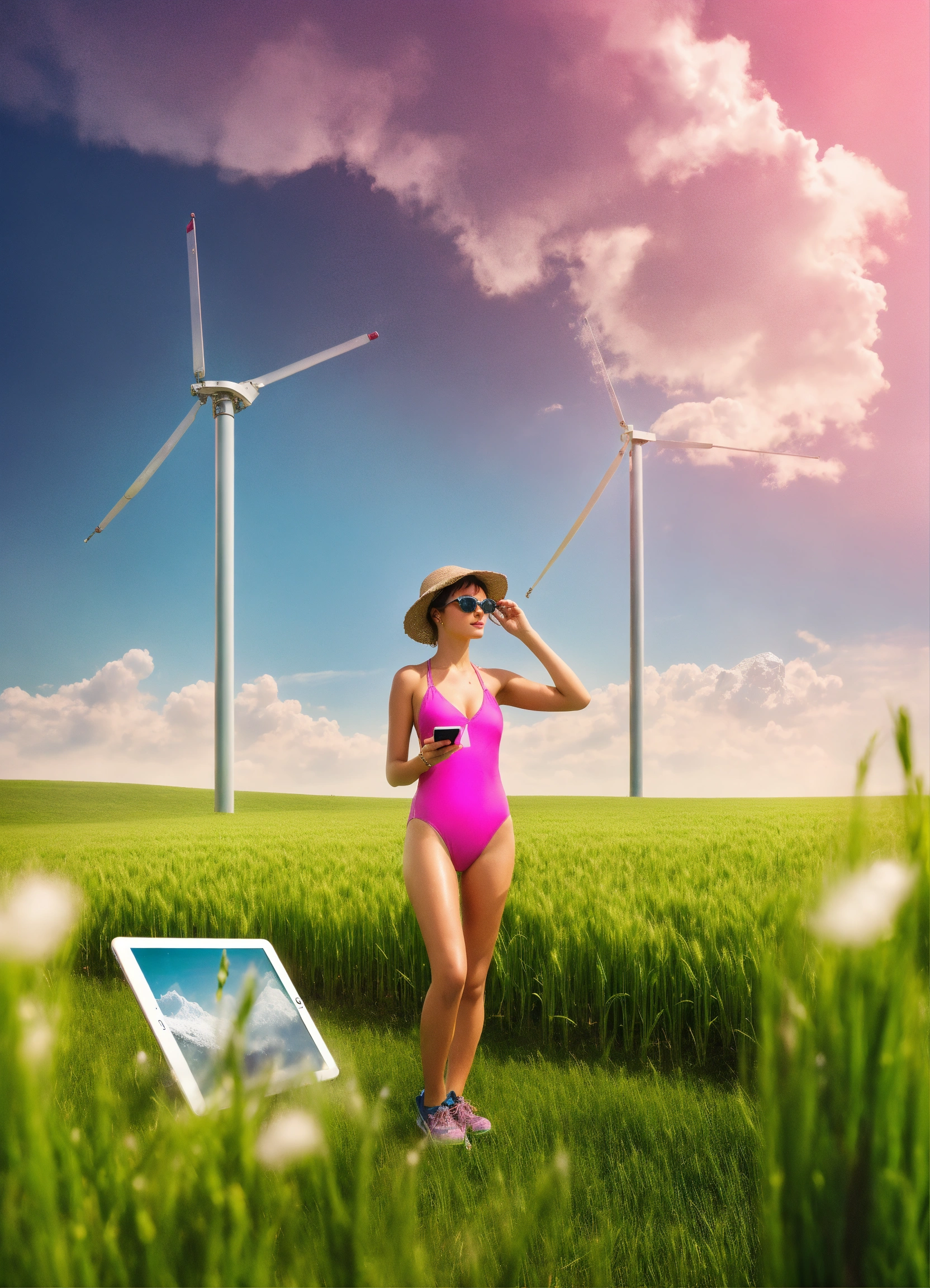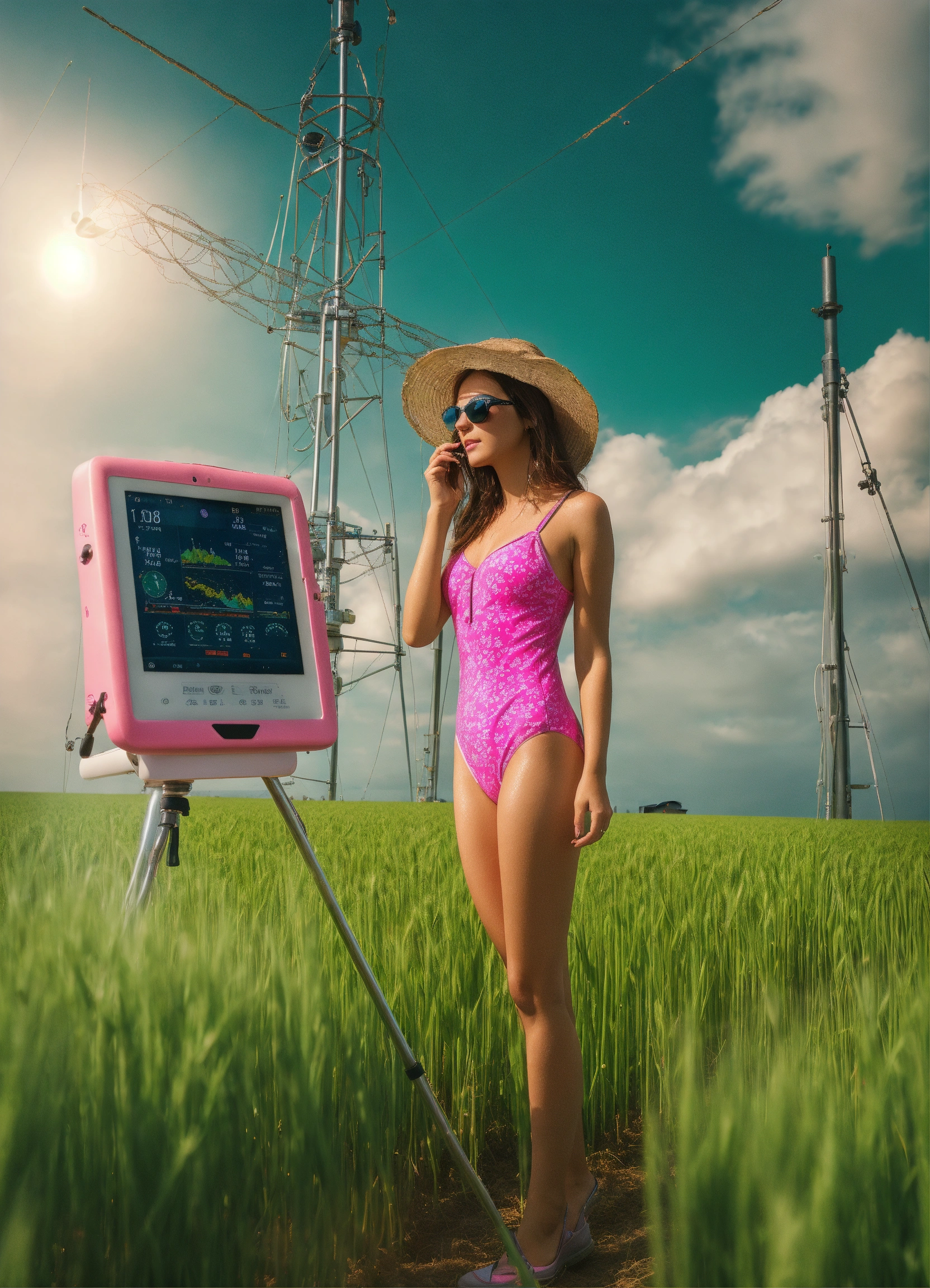 20 years old lady in a pink swimming suit, warm shoes and a a hut, wearing sunglasses standing near weather station observing snow is melting and simultaneously watching into tablet pc in the middle of a green wheat field