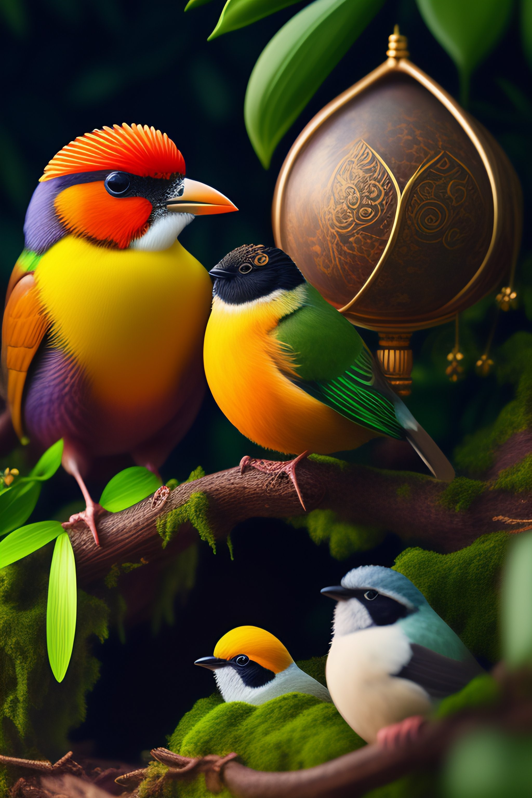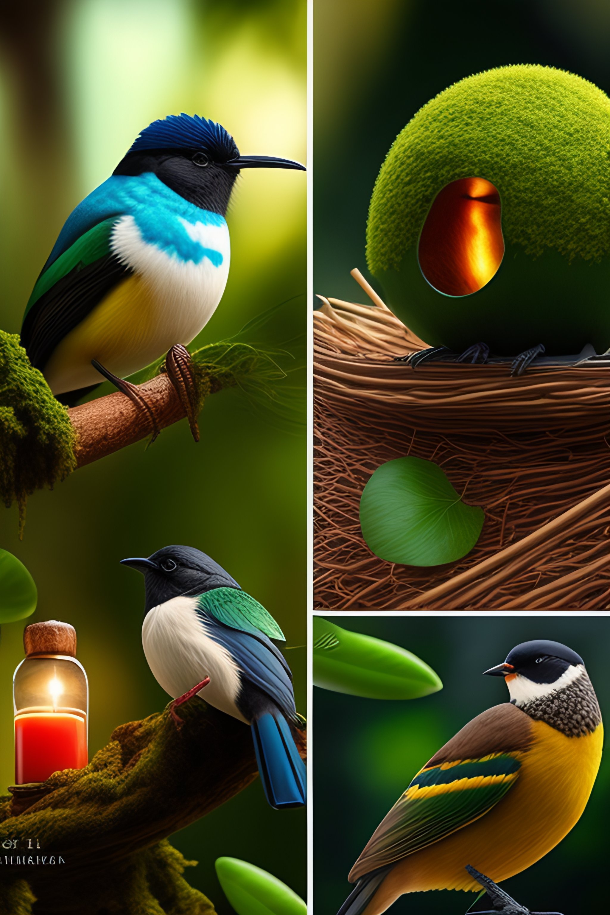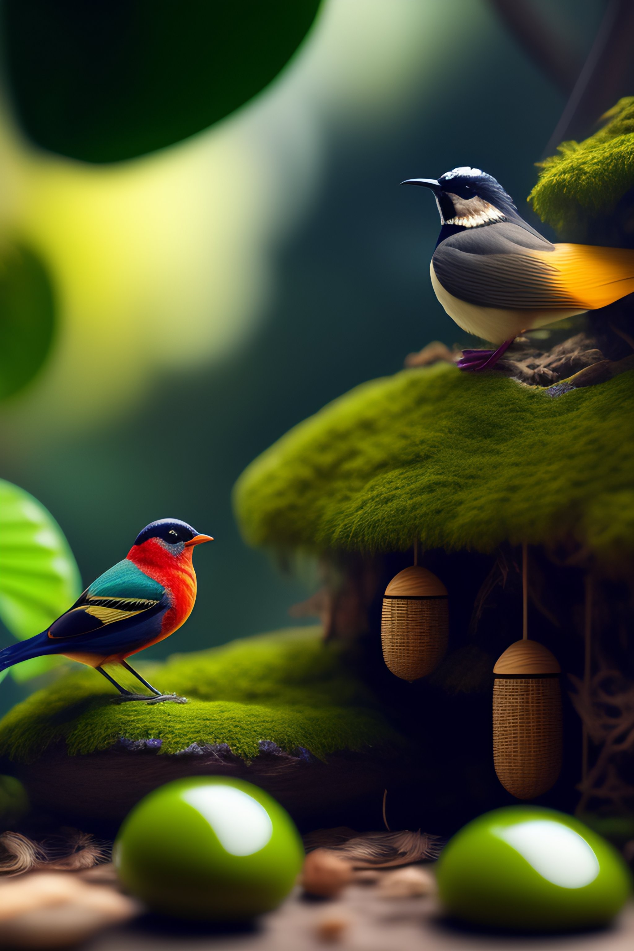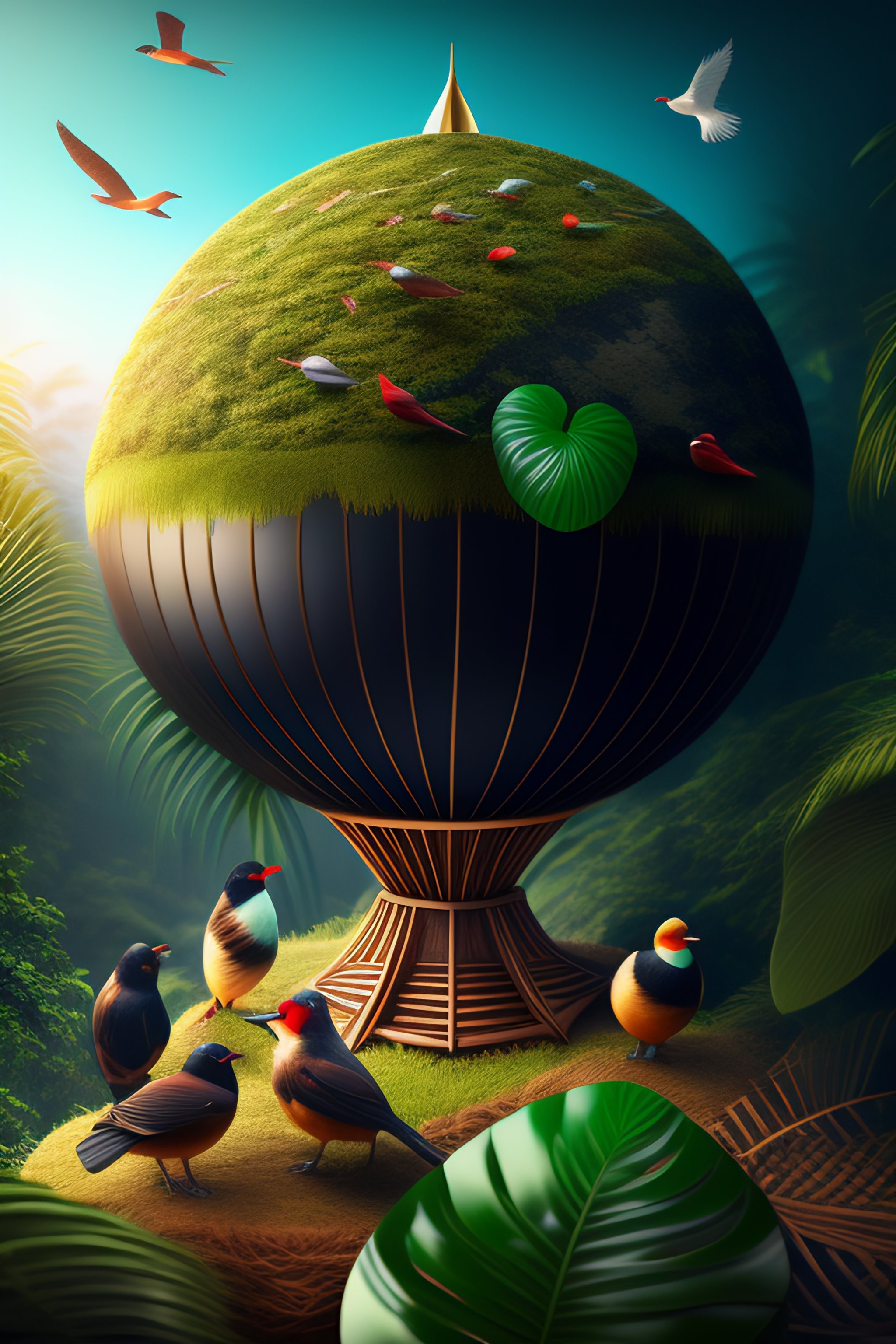 Prompt: '[birds with umbrellas], knolling, in jungle-globe, natural materials, highly detailed, depth, lumen render, 8k'
