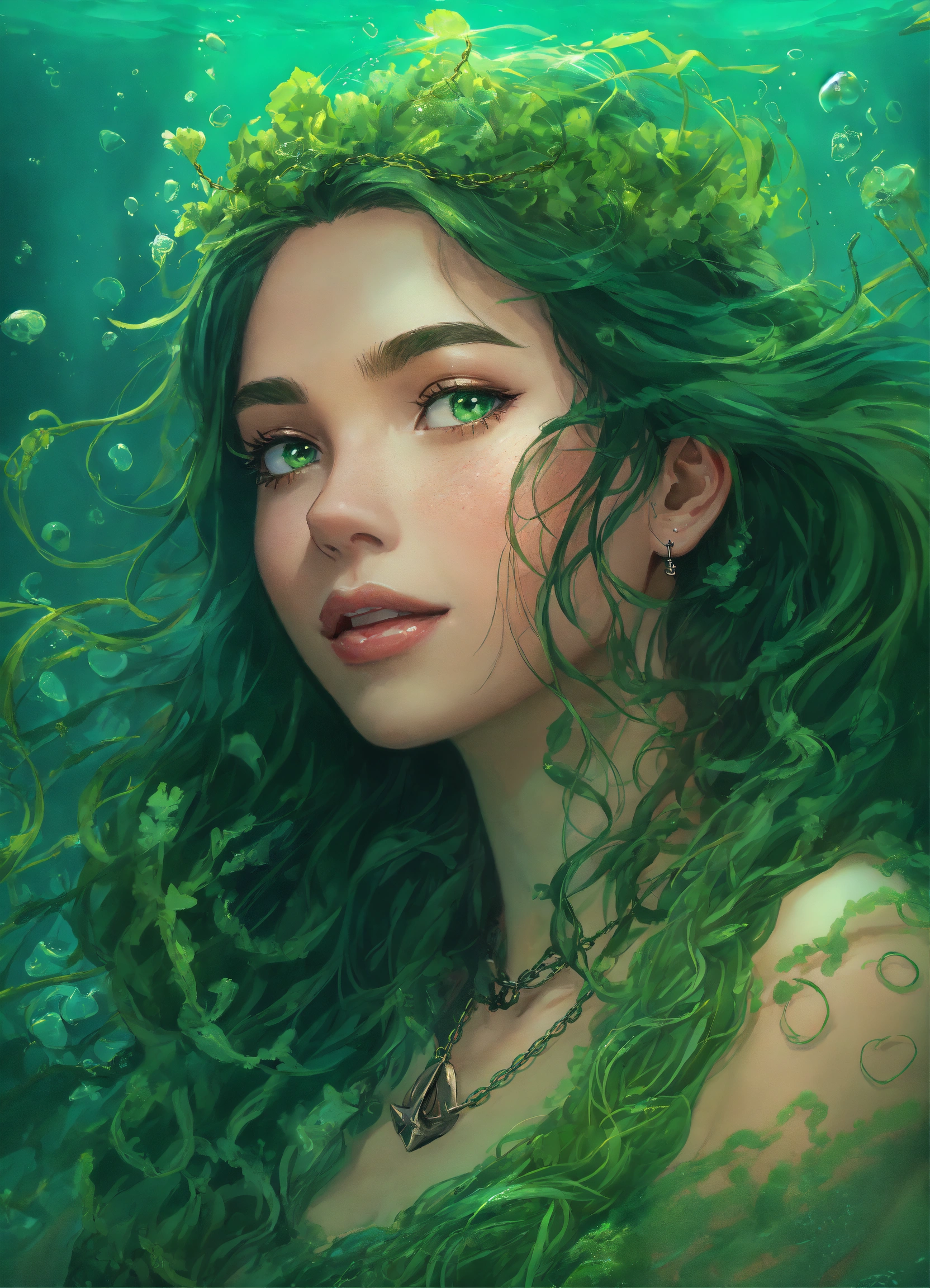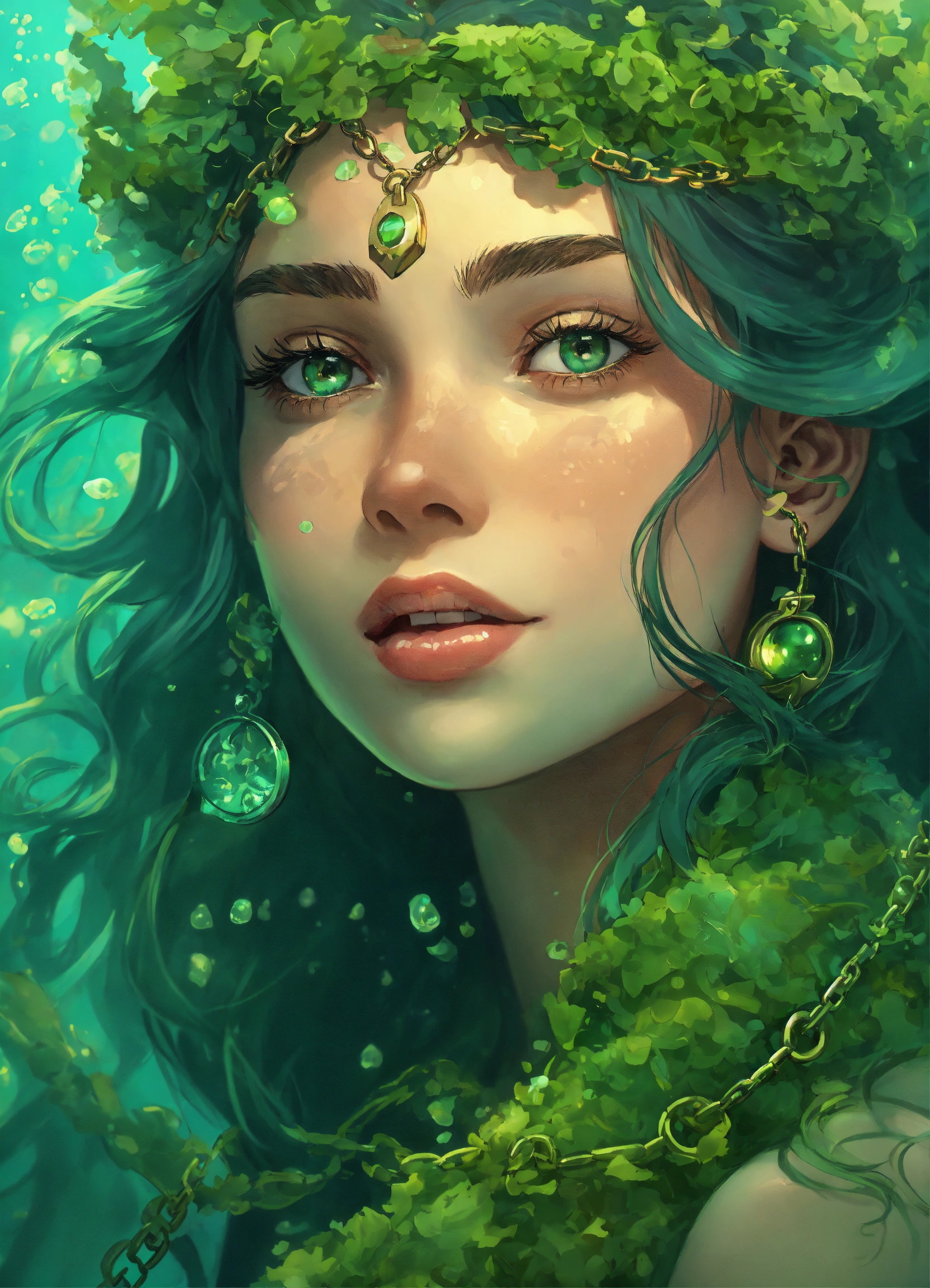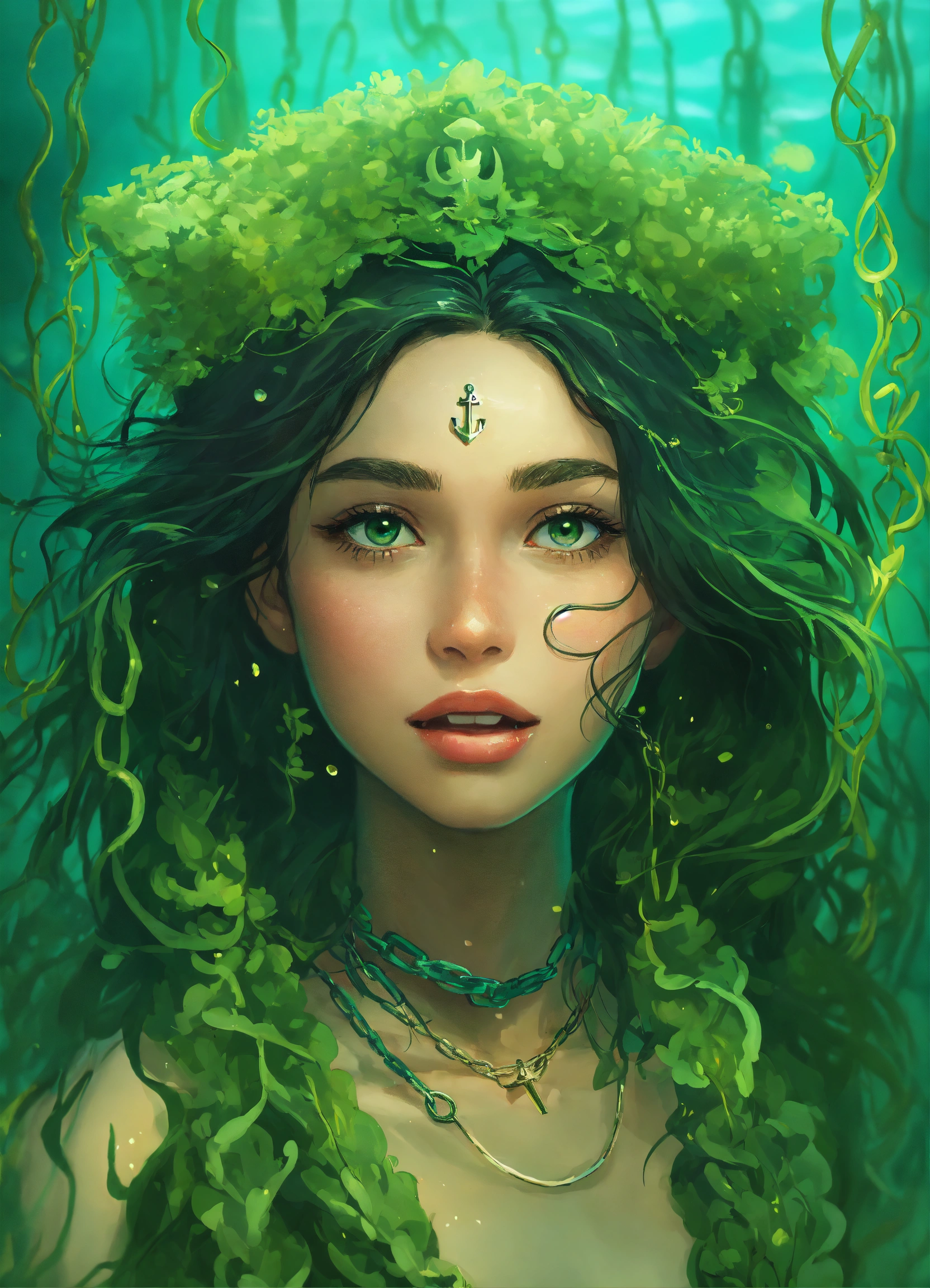 *surreal*portrait of happy disney princess covered in light green sea weed, ocean is inside her eyes, chain and anchor in her dark hair, 2d realistic disney animation