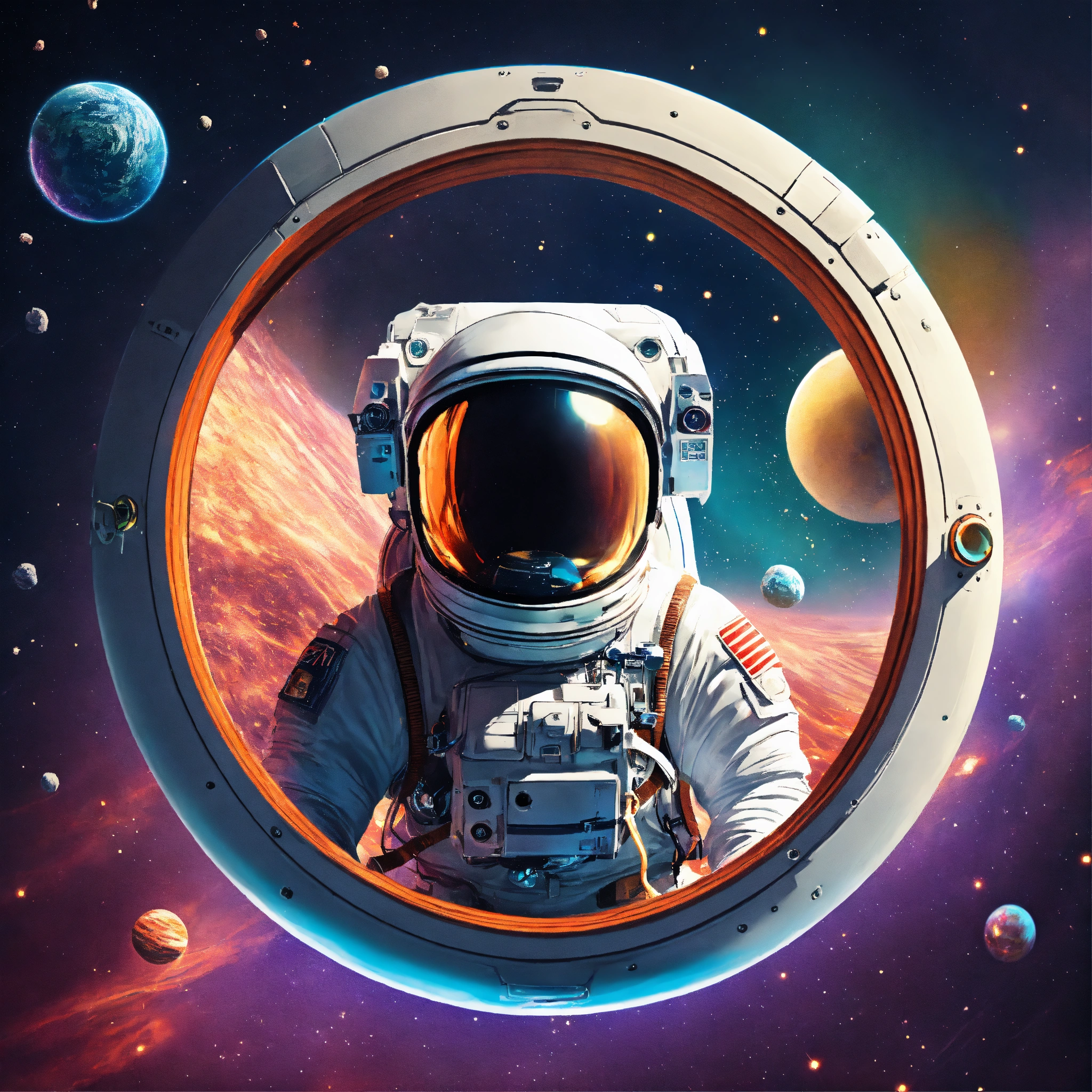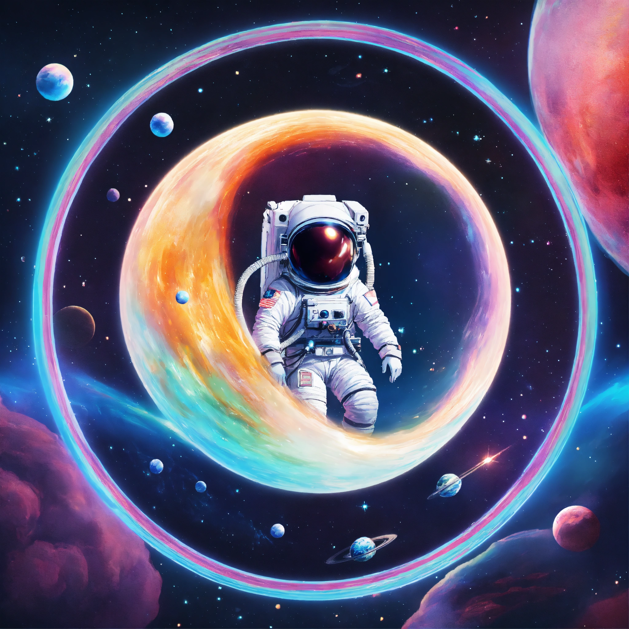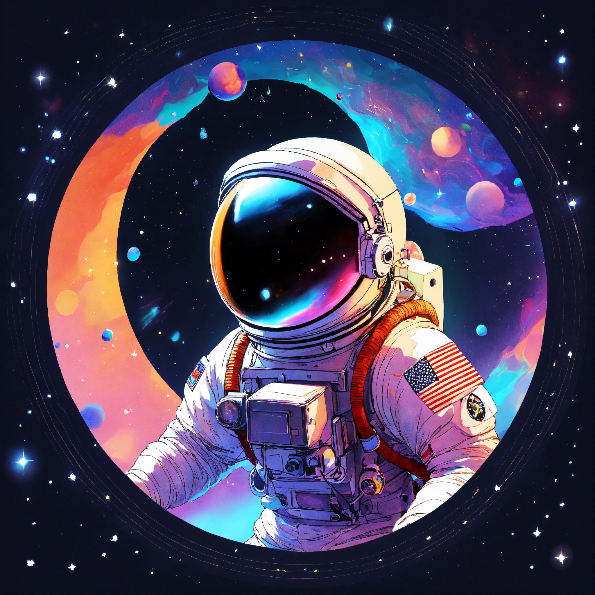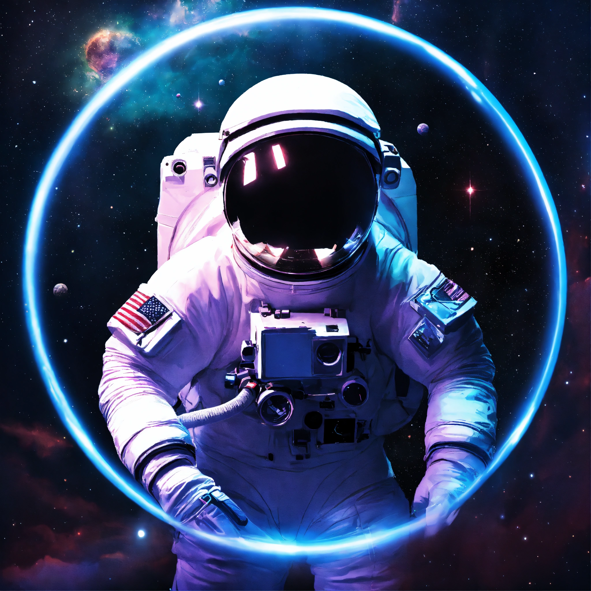 Atronaut flaoting in space, in circle image, holographic, best quality, everything outside of circle should be white, white background