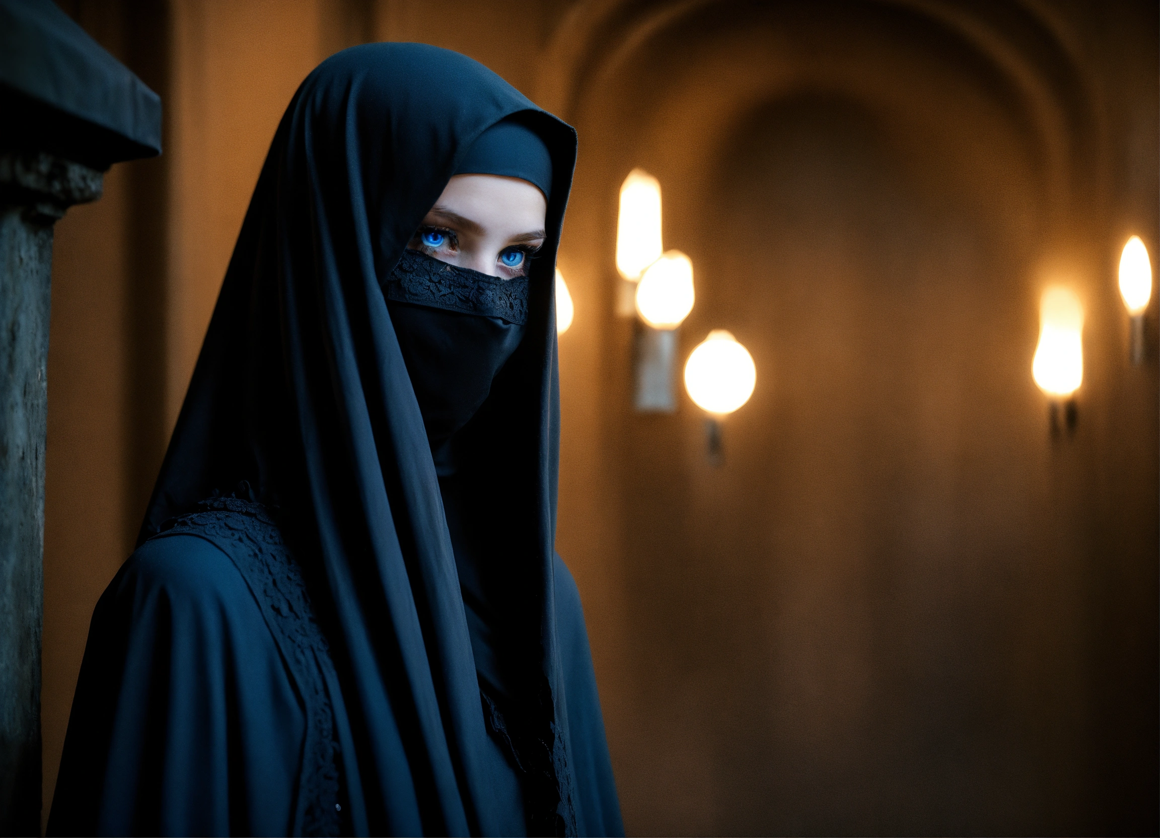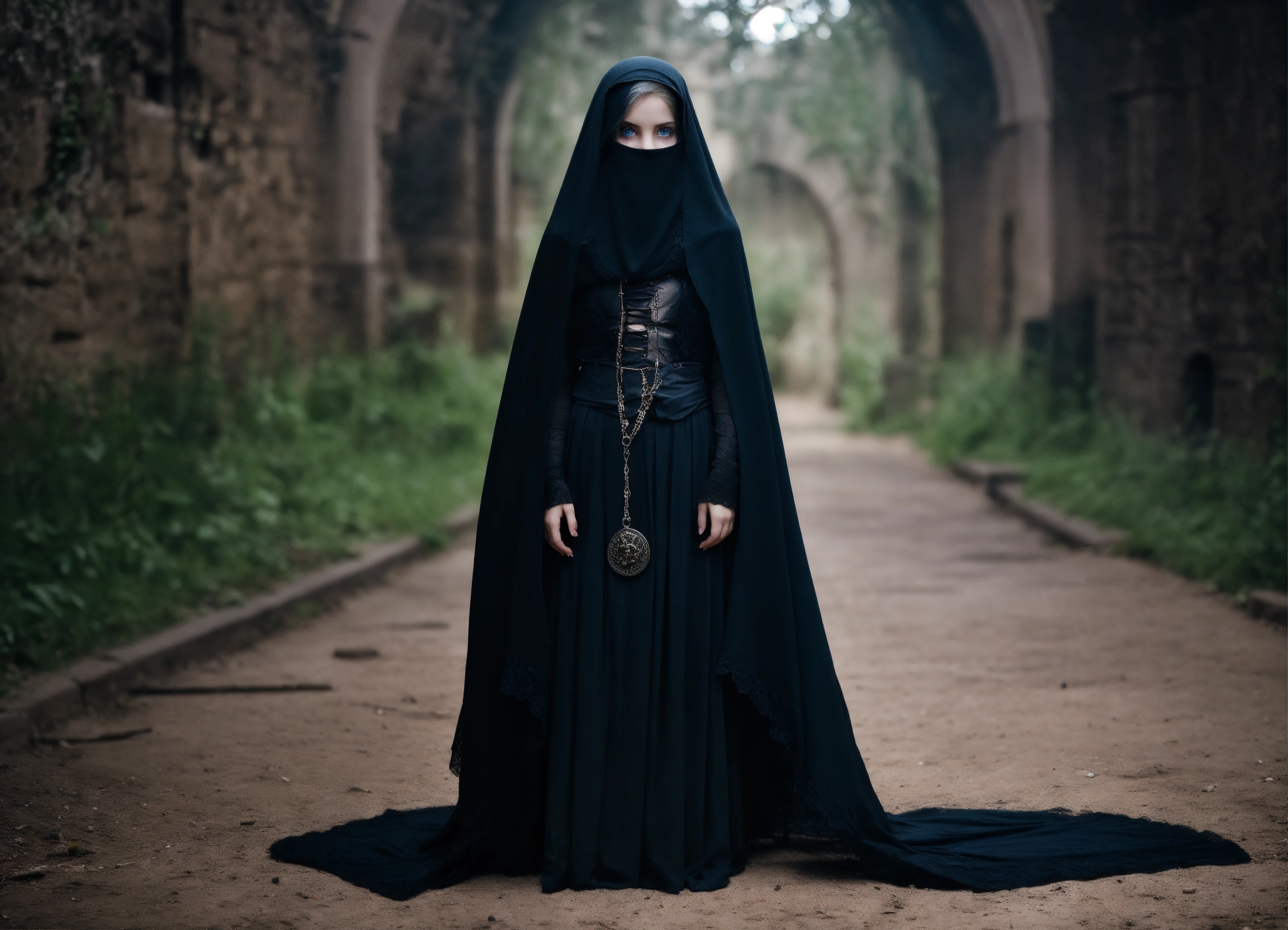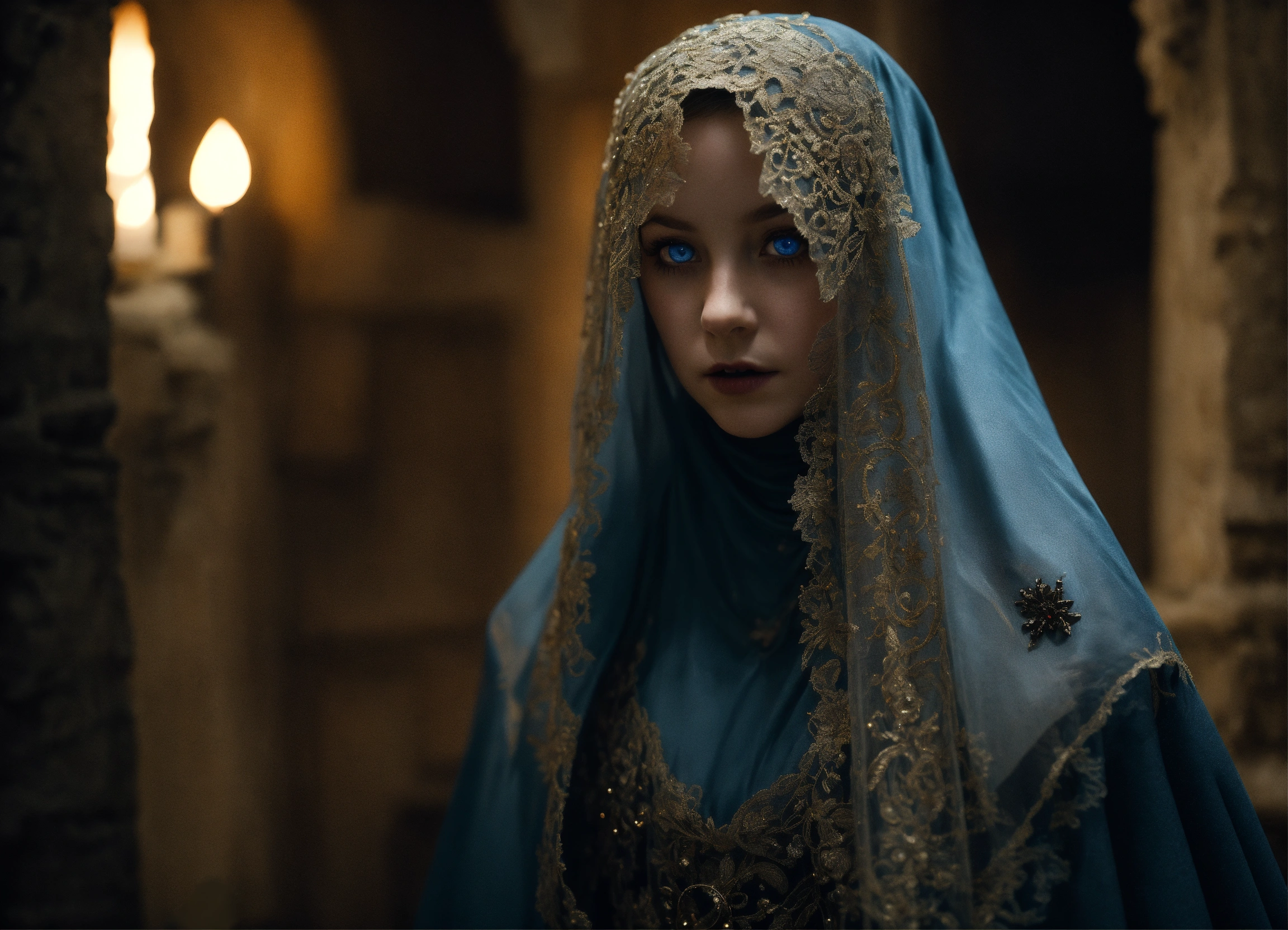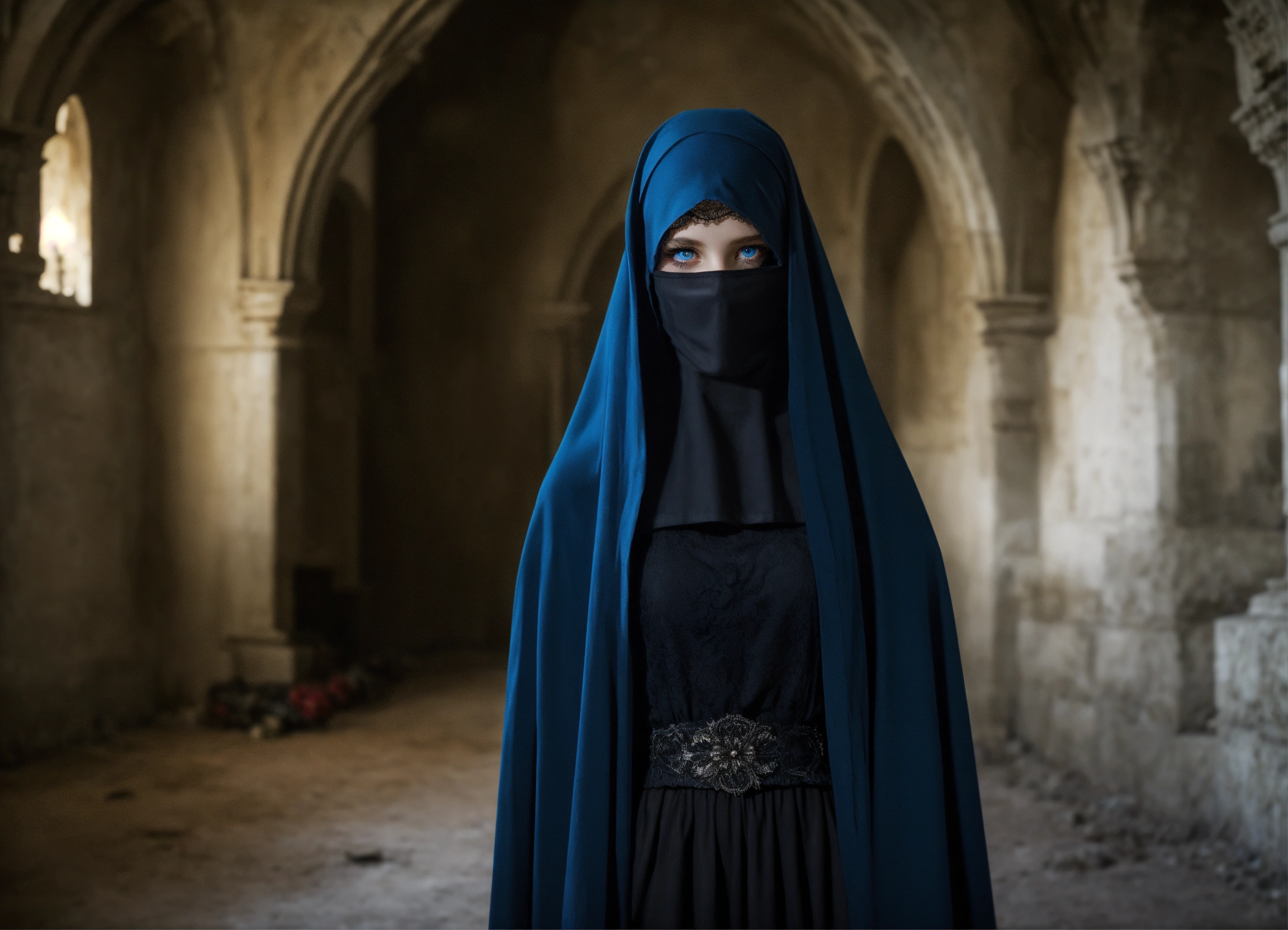 Body portrait of a very childish deadly pale ultra slim twelve year old female child with a veil in the syle of a niqab covers her face, she is a goth necromancer with waist long silverwhite hair, cropped-top and skirt, ultra skinny, very slim body, emaciated body, completely emaciated, ultra narrow face, alabaster skin, pale as a corpse, glowing blue eyes, ultra slim face, innocent looking, in a gloomy crypt, lasziv, kindlich, unschuldig, childlike, verführerisch, graceful, wispy, glowing blue eyes, ghostly, dead, evil, demonic, undead, darkness, grotesque, mysterious, dark, cold ambient lighting, extremely detailed, fantasy, medieval setting