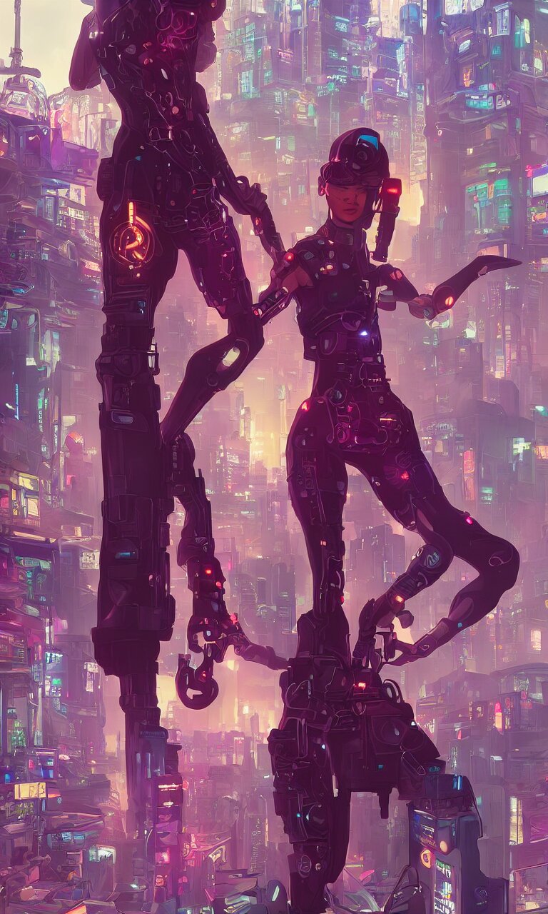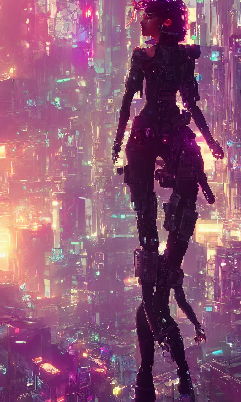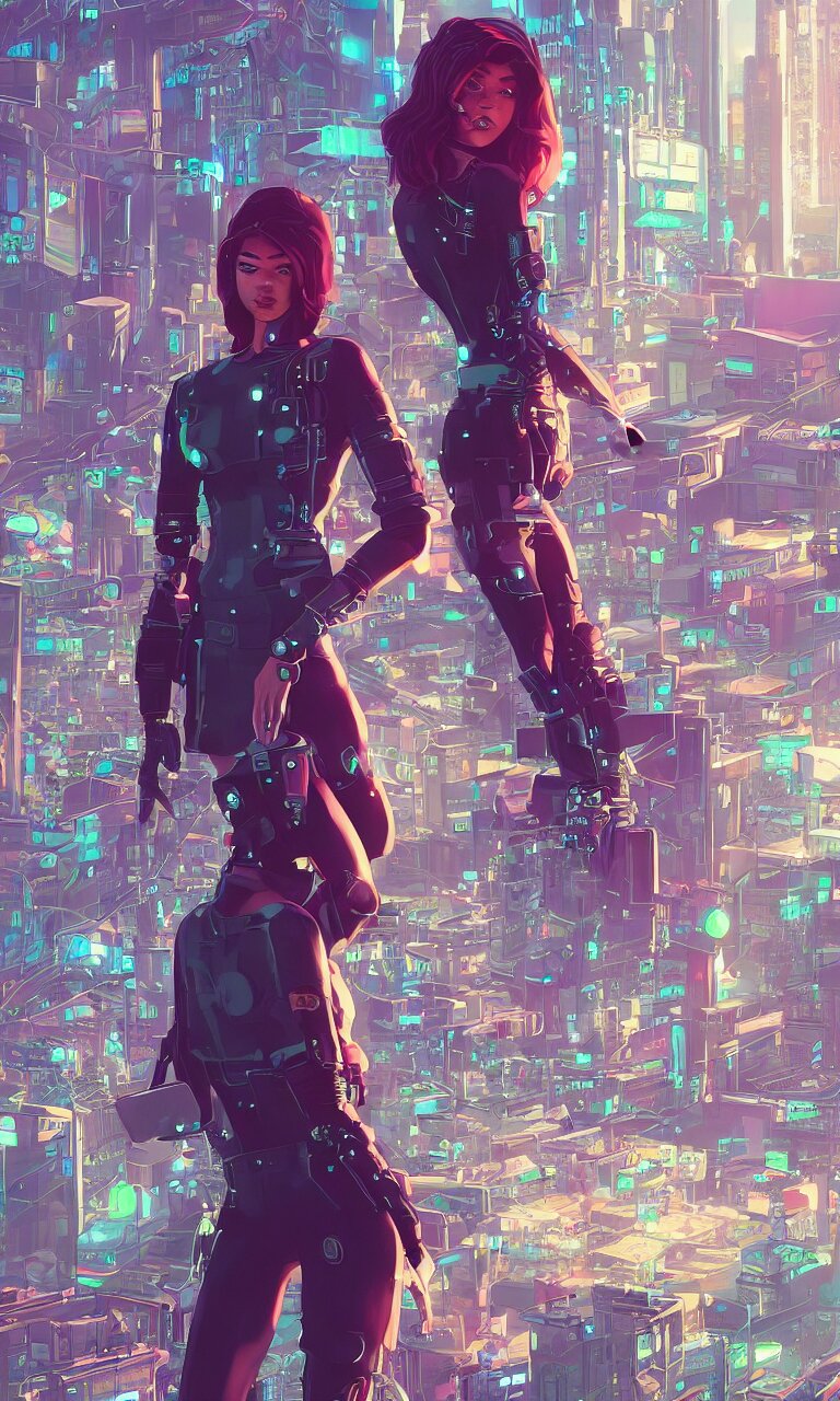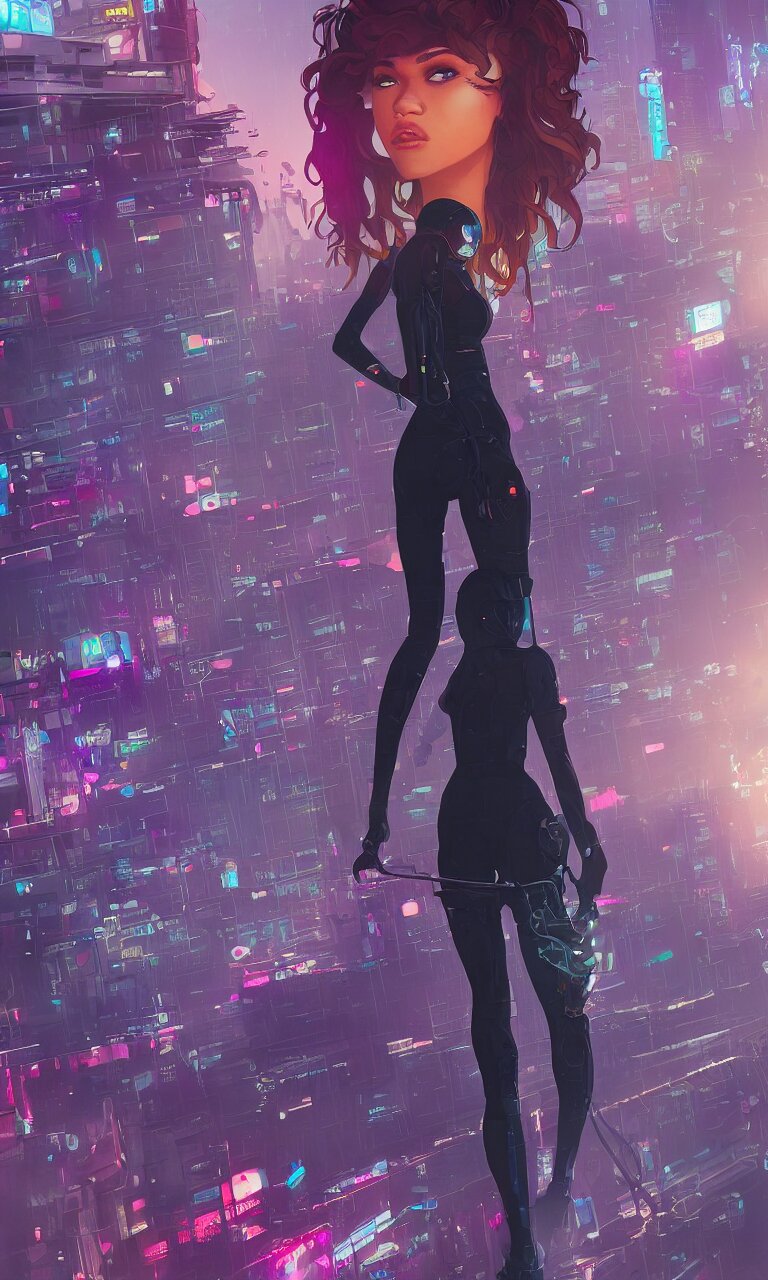 Zendaya crushing it as a cyberpunk hero standing on the rooftop of cybertown, art poster, full body, t - pose, character design, ambient lighting, 4 k, lois van baarle, ilya kuvshinov, rossdraws, alphonse mucha, jung gi kim, dylan kowalsk, artstation
