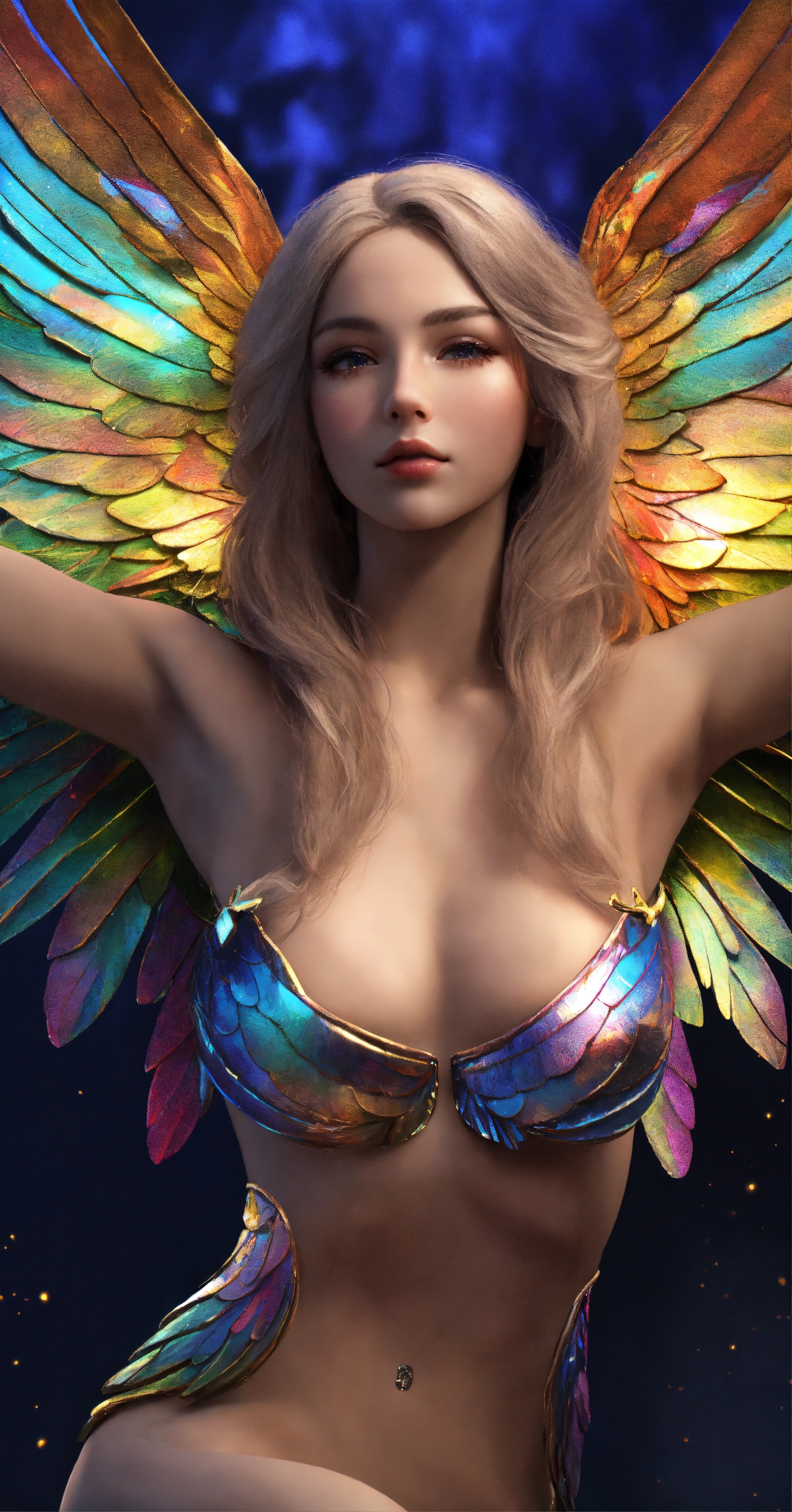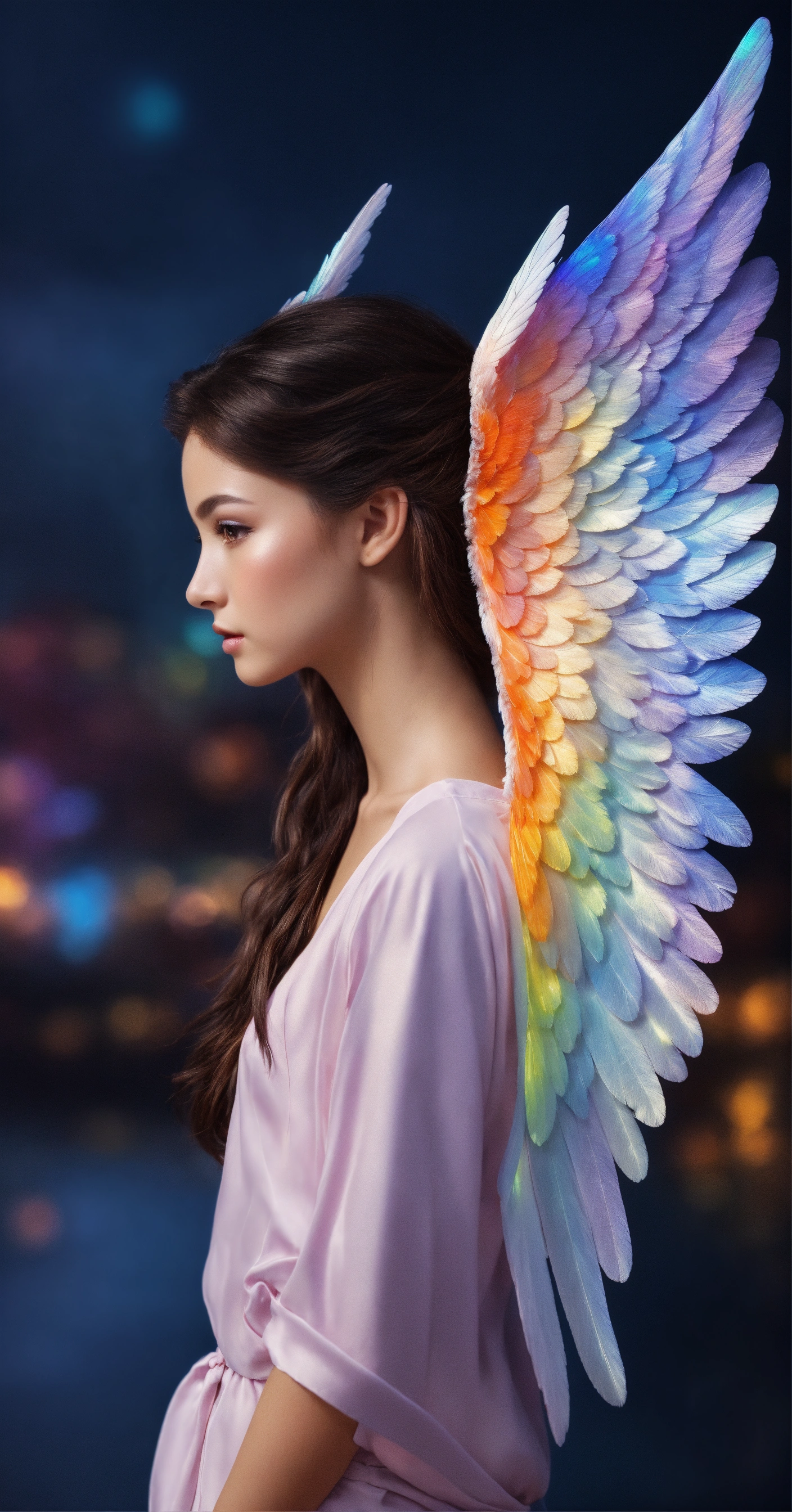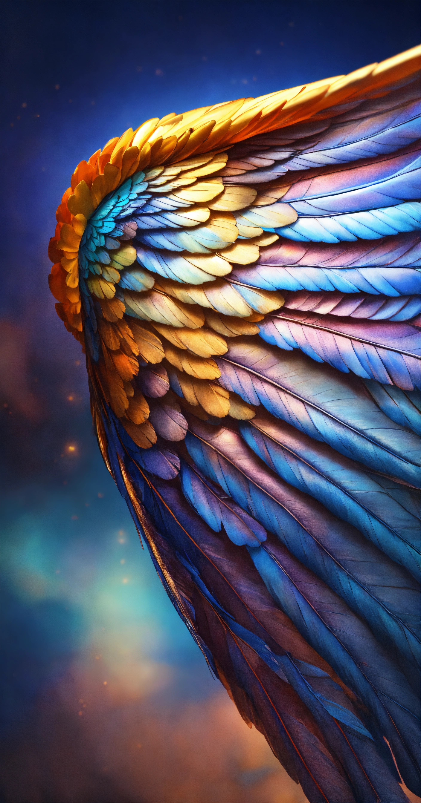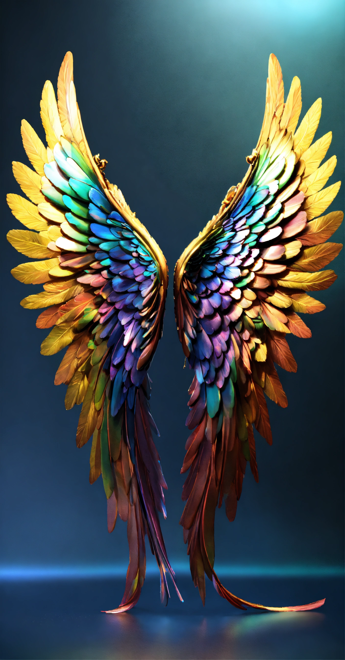 Beautiful and perfect small angel wings in iridescent colors, detailed and defined and at the same time. just a pair of small full iridescent colored wings. hyper-detailed and hyper-realistic wings. wings with a slight decoration in iridescent tones. small wings complete both the right wing and the left wing, the background is dark blue, 3d, masterpiece. hd. realism. high resolution. high quality. digital art. 8k