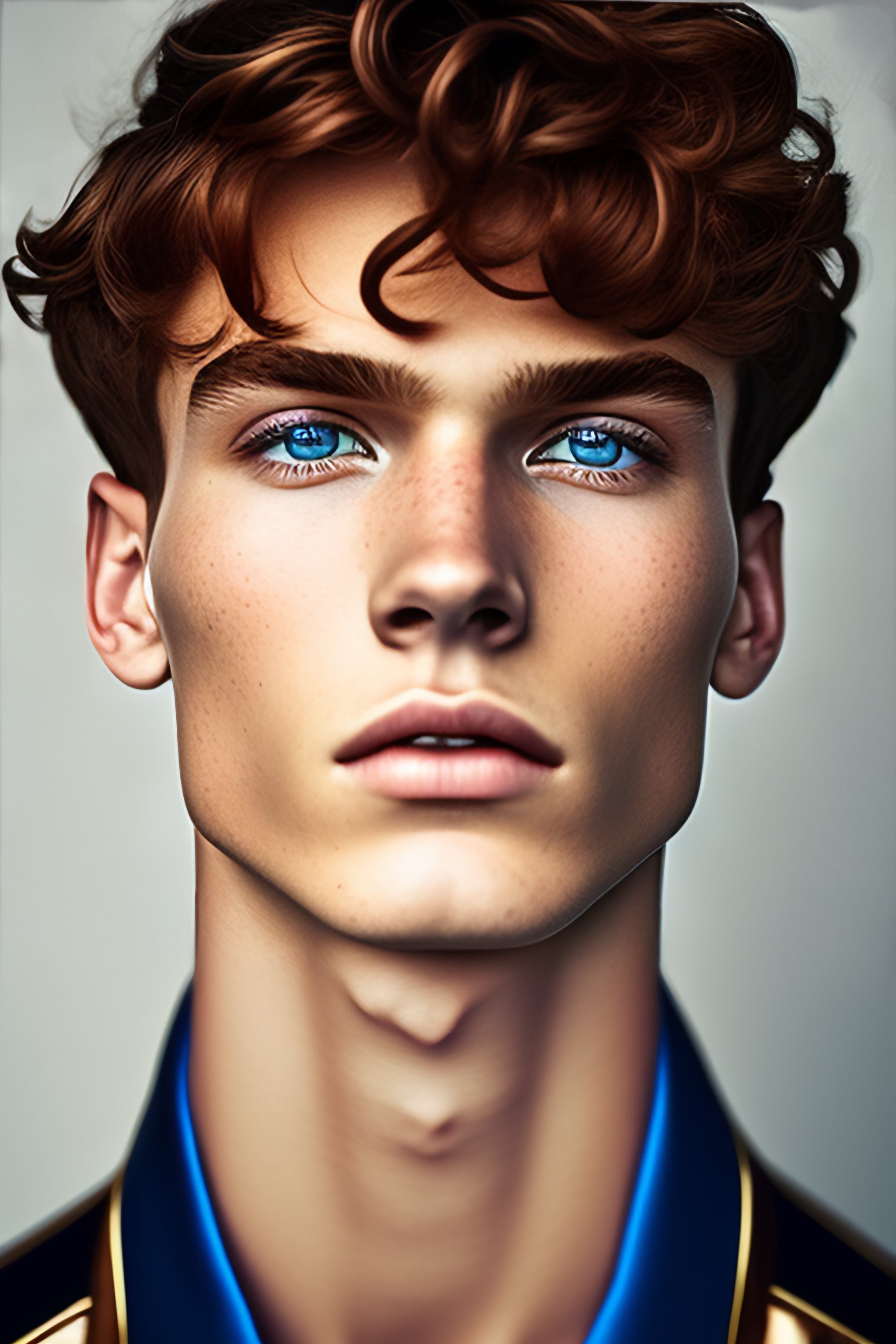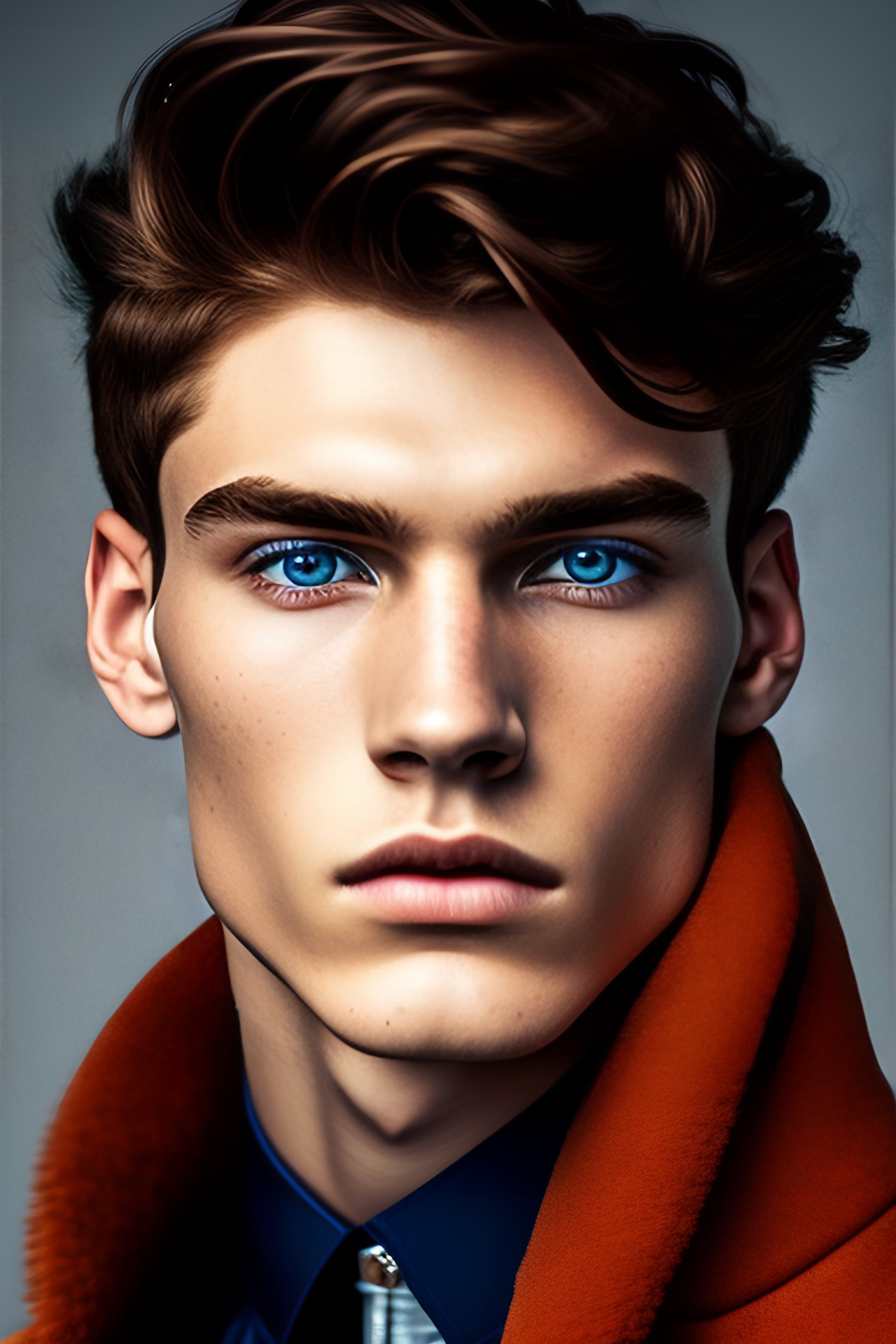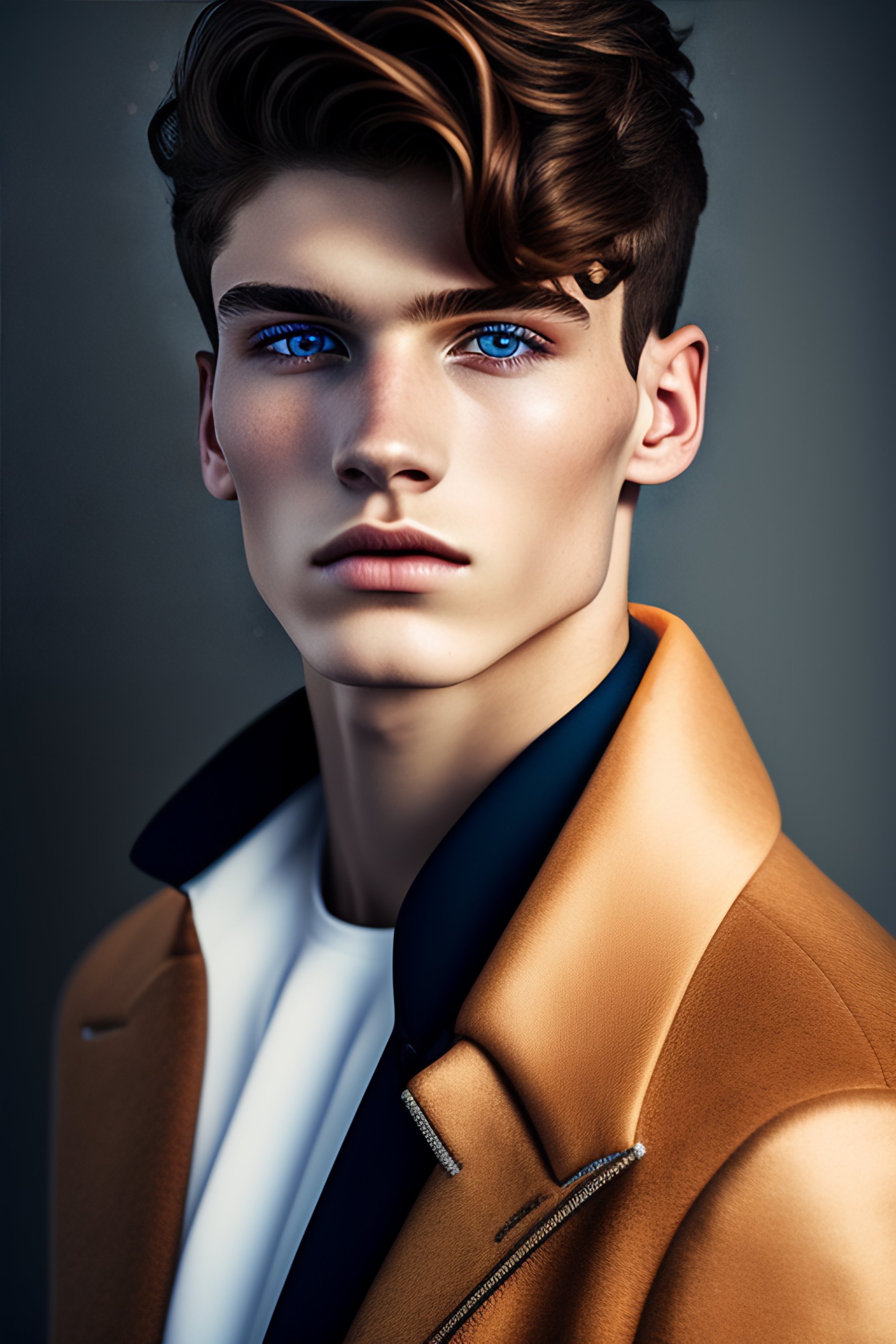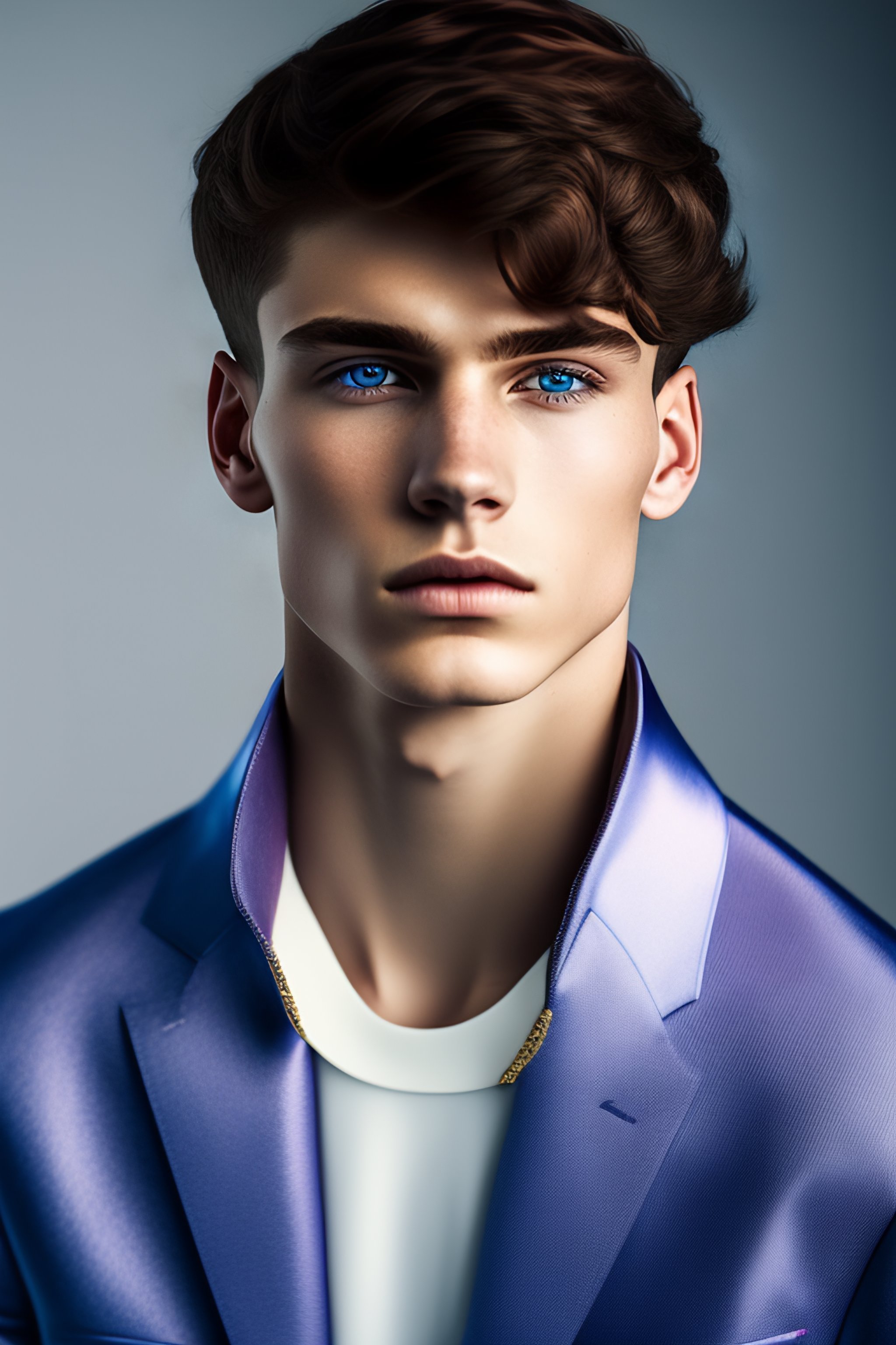 Close-up photo of a 18 years old man wth brown hair and blue eyes, fashion editorial, studio photography, magazine photography, pointed nose, blurry background