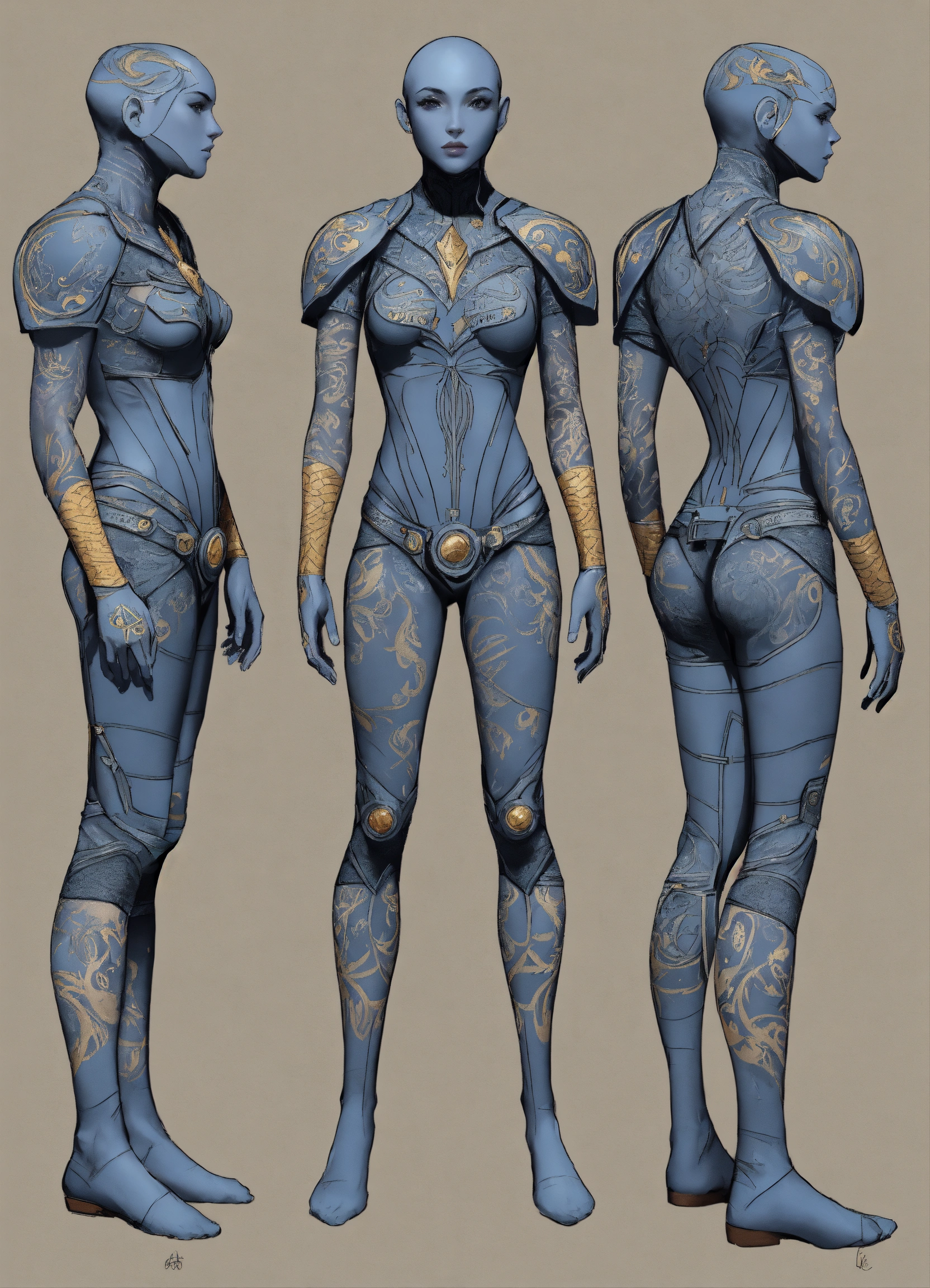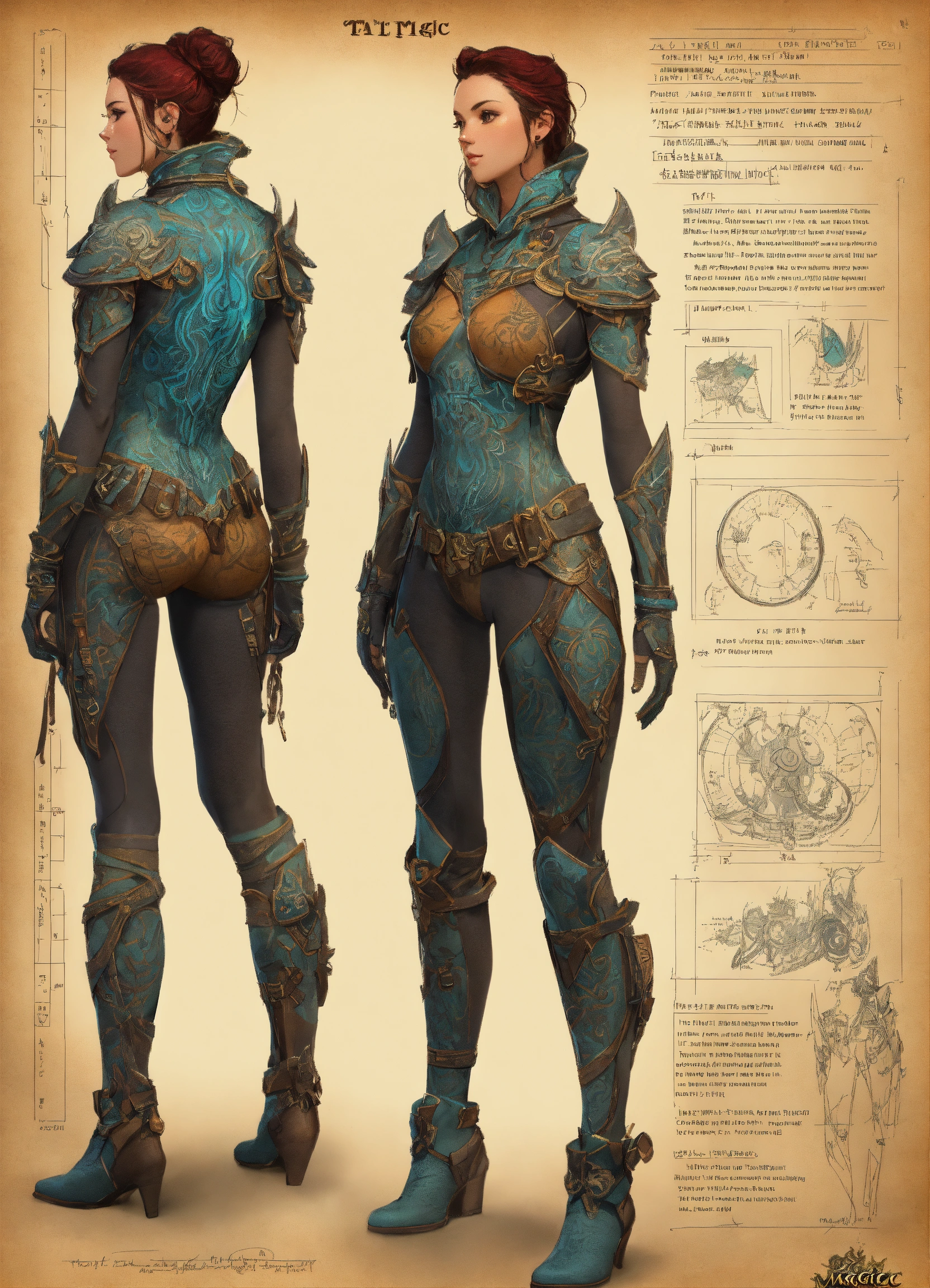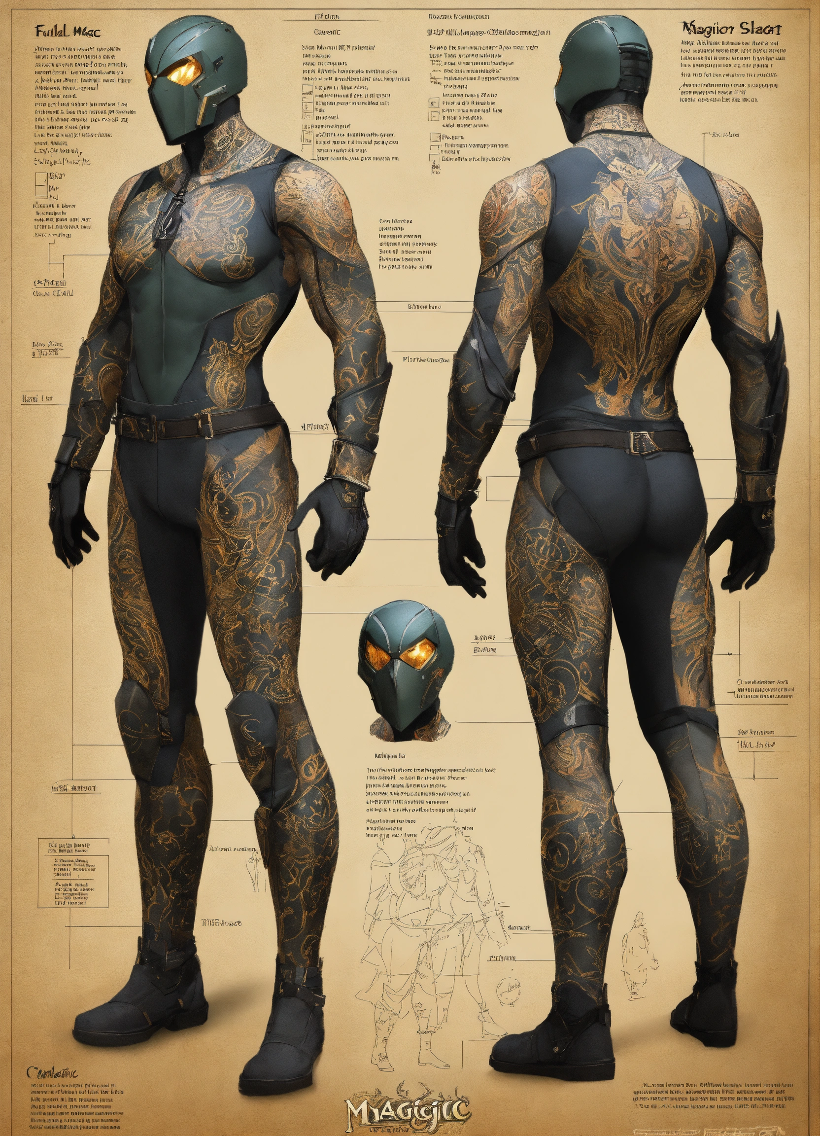 Full magic tattoo body suit, character sheet, character design, chart, reference sheet, multiple views, high detail, fine details, concept art