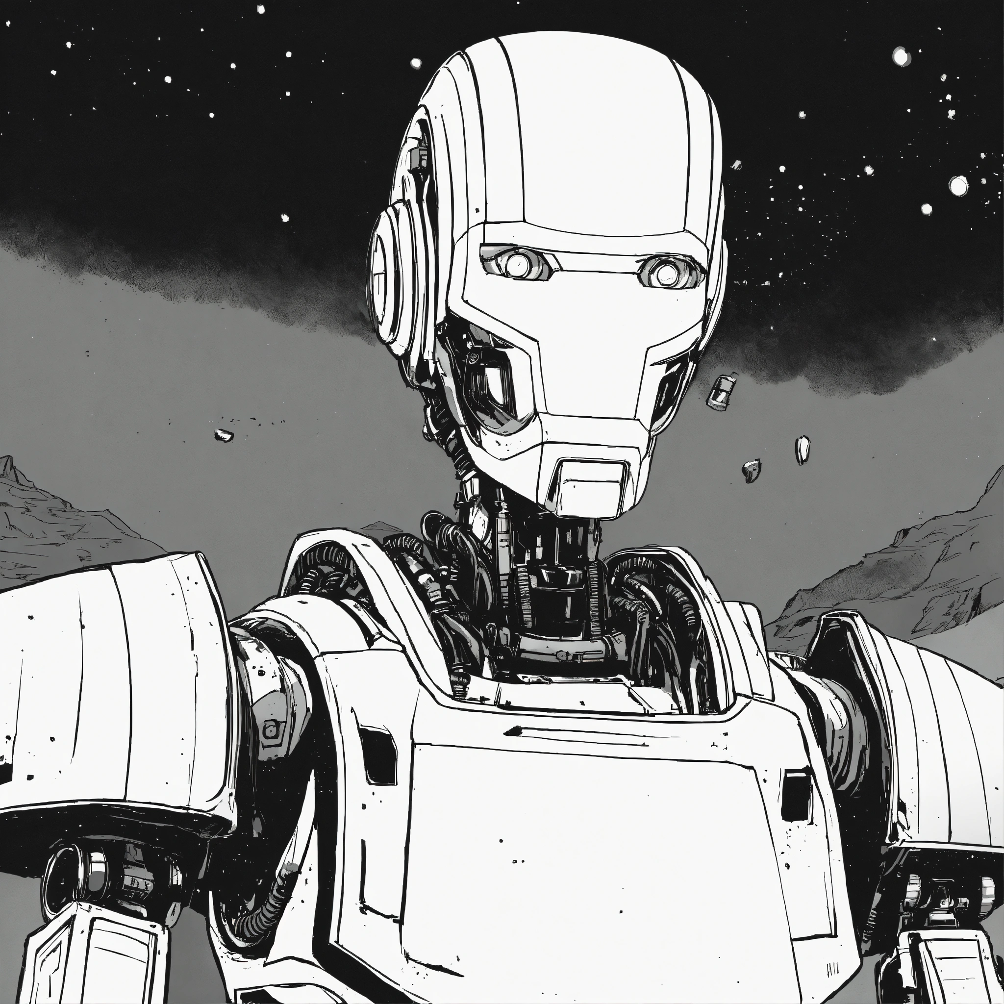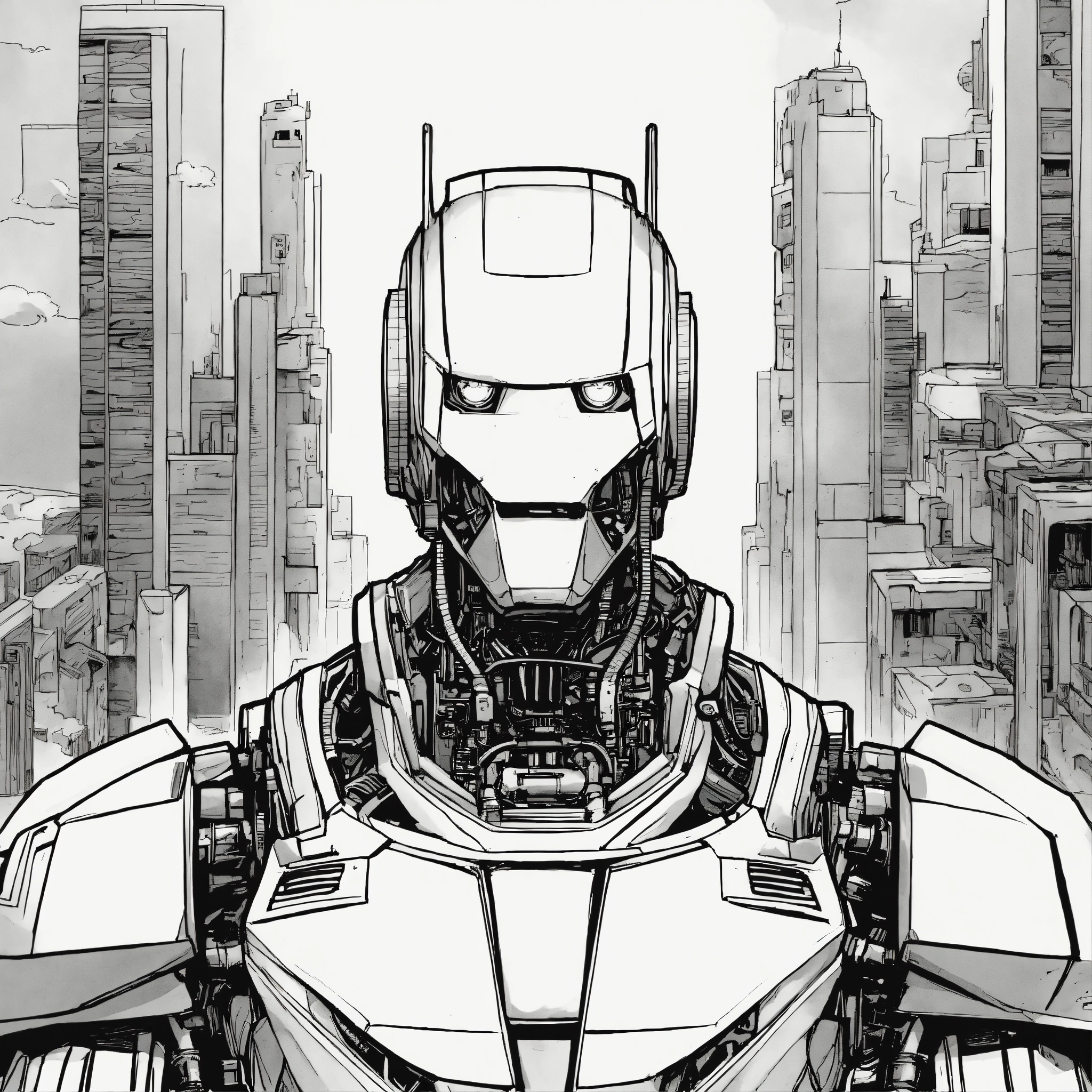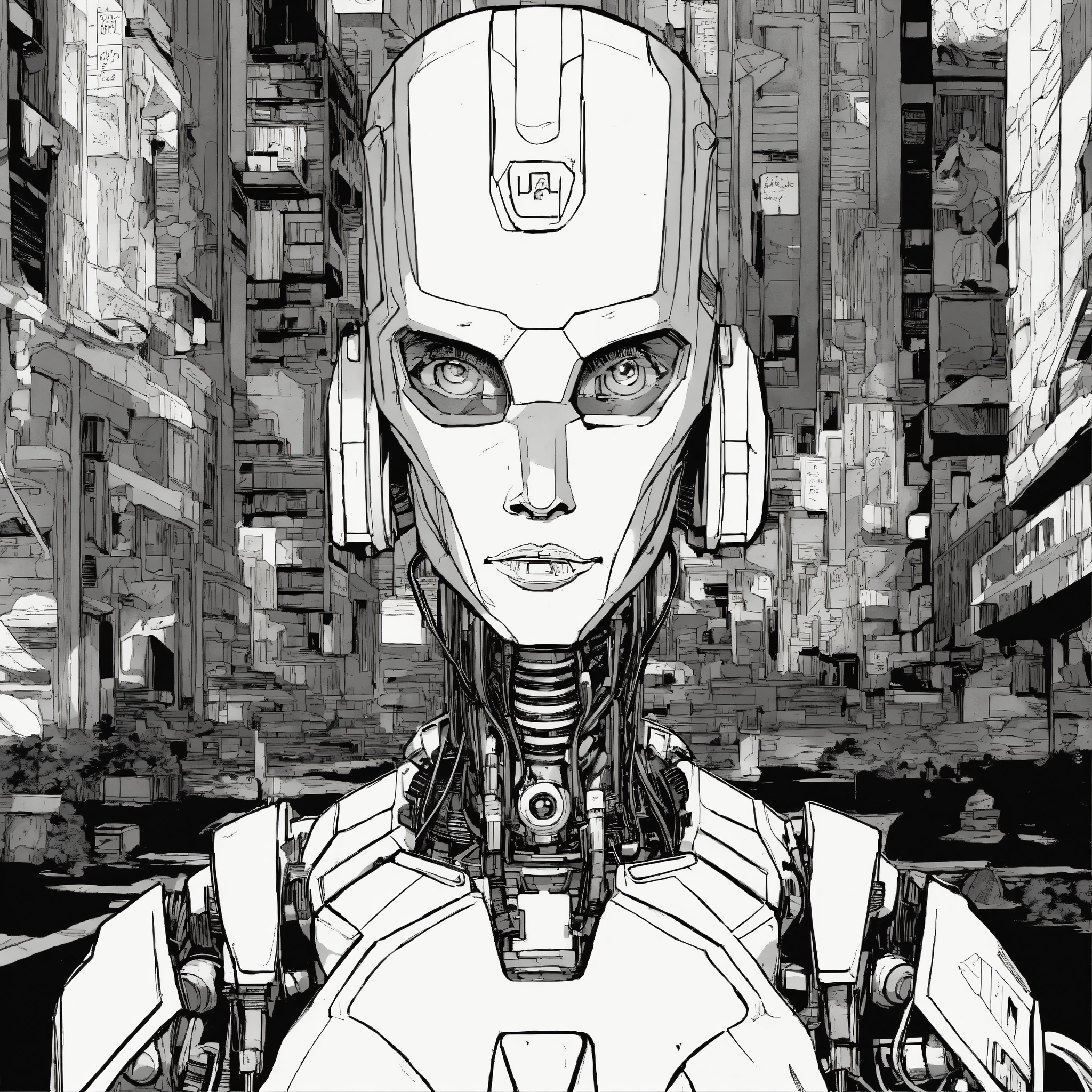A comic book panel about robots taking over the world, simple comic art. comic book cover art. ink art. mnimal, close up androids face, black & white drawing.