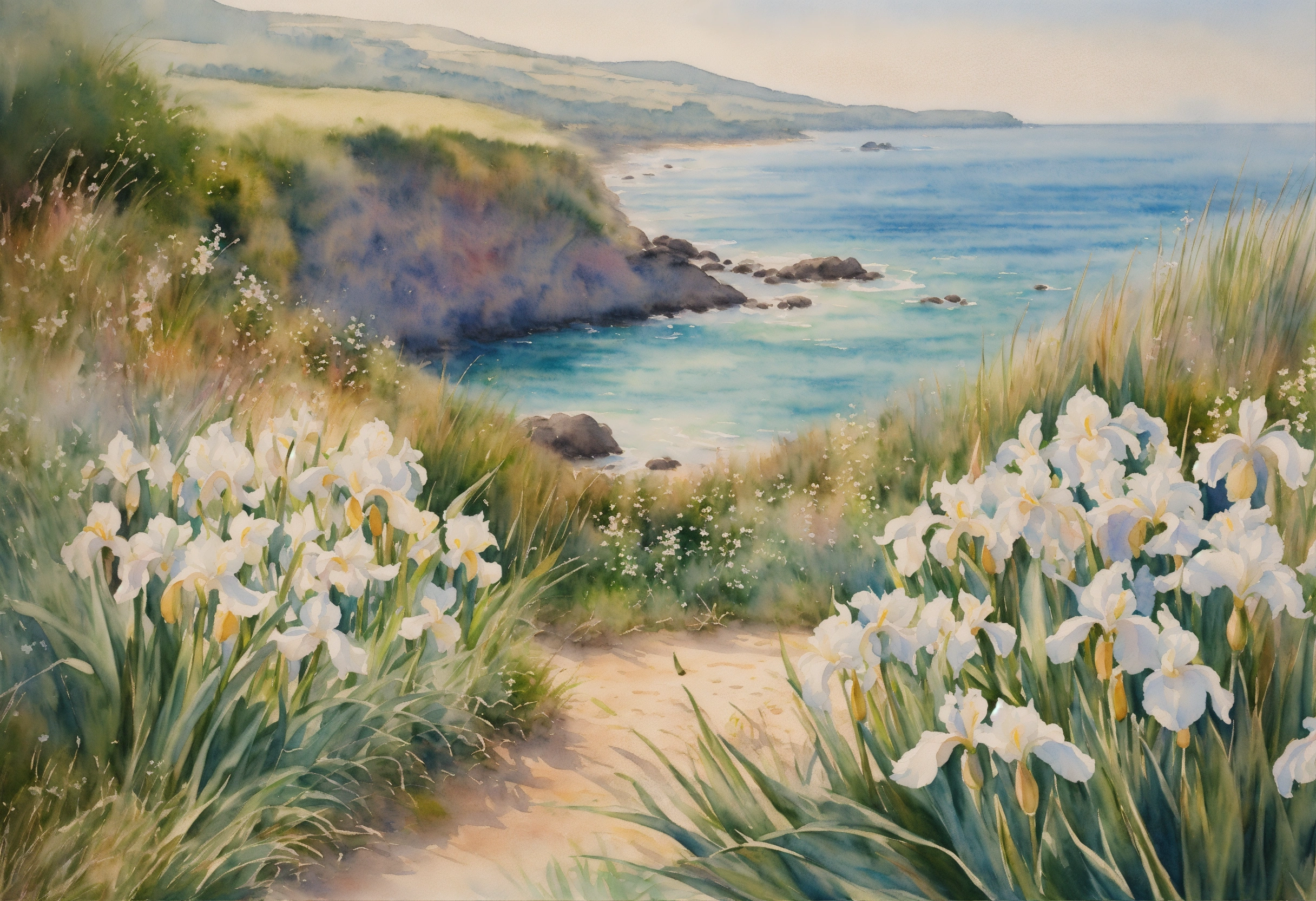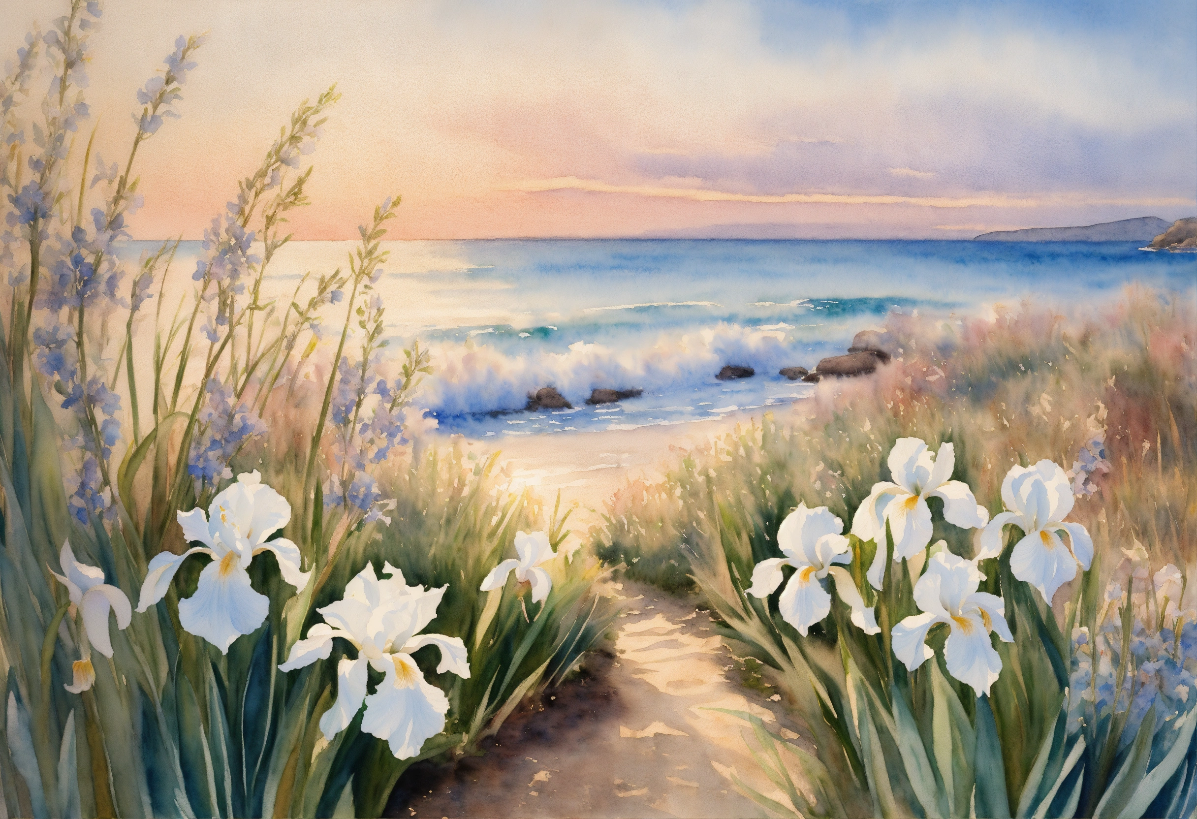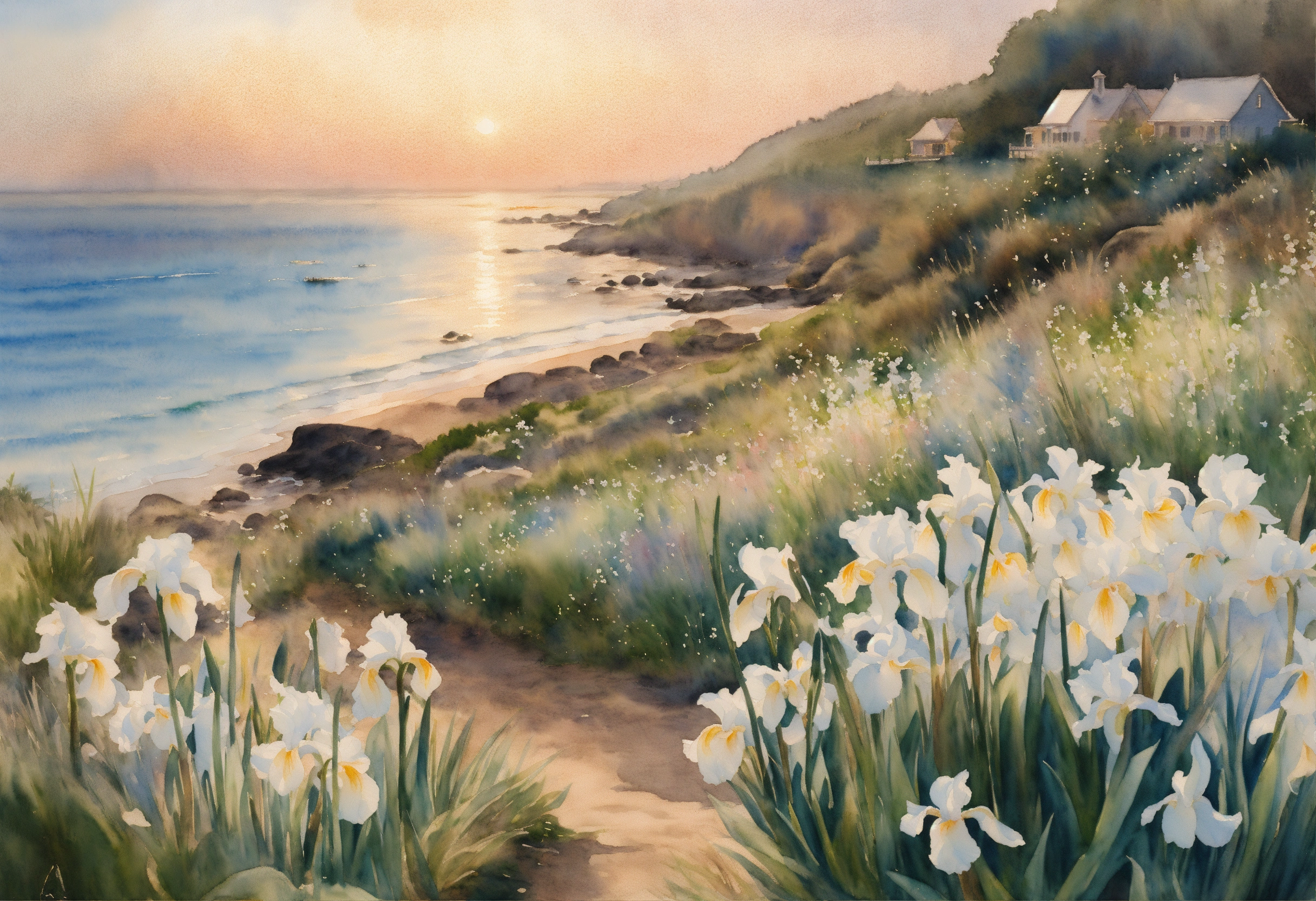 Watercolour painting, pastel colours, warm light, intricate and detailed, seashore, ocean view, beach, beautiful garden, white irises, 8k, ultra-detailed, sharp focus