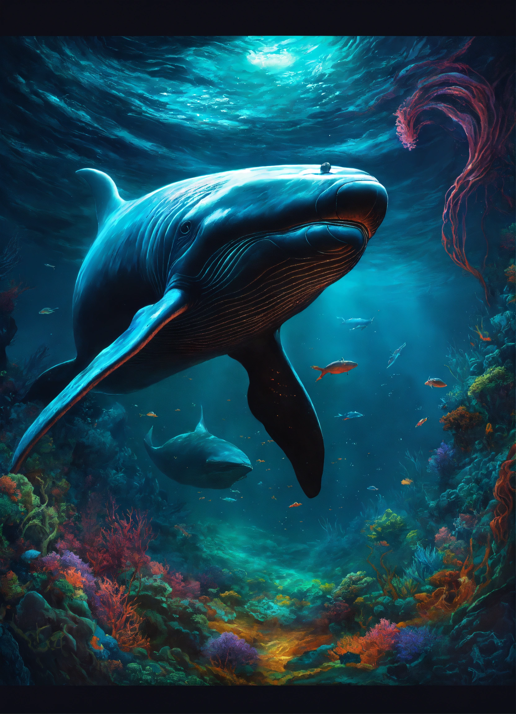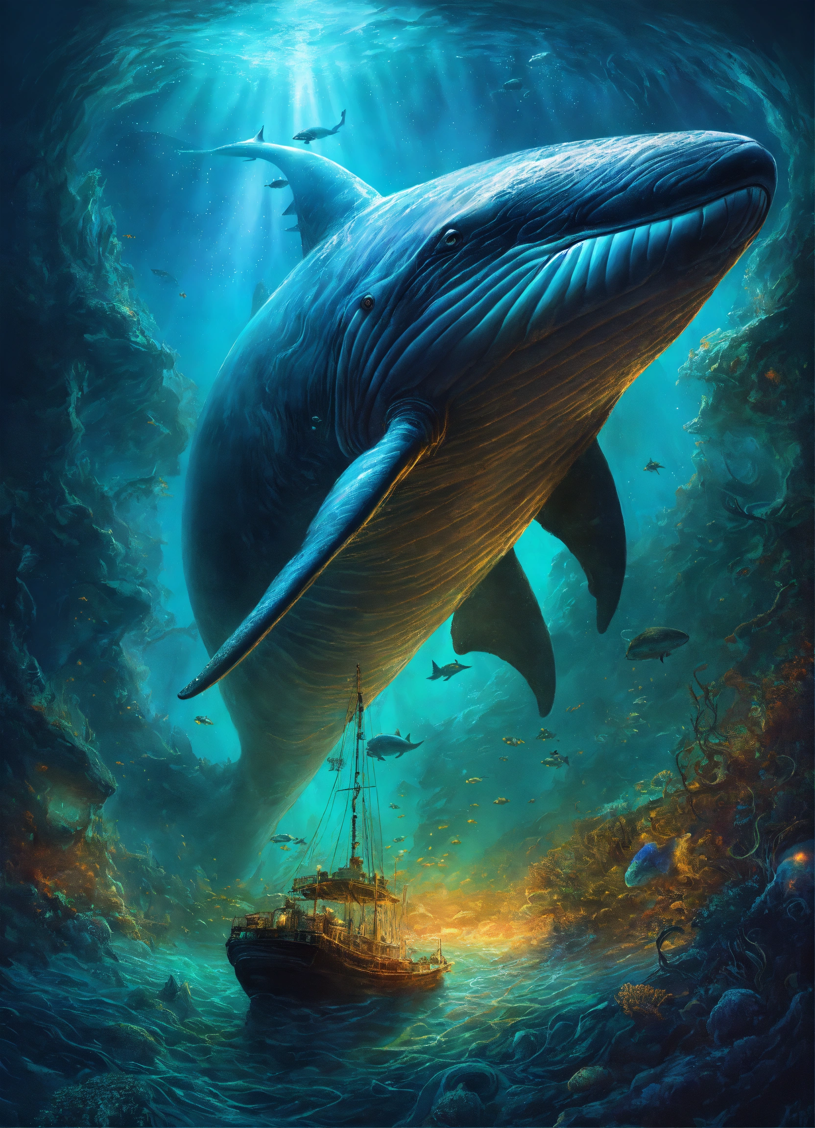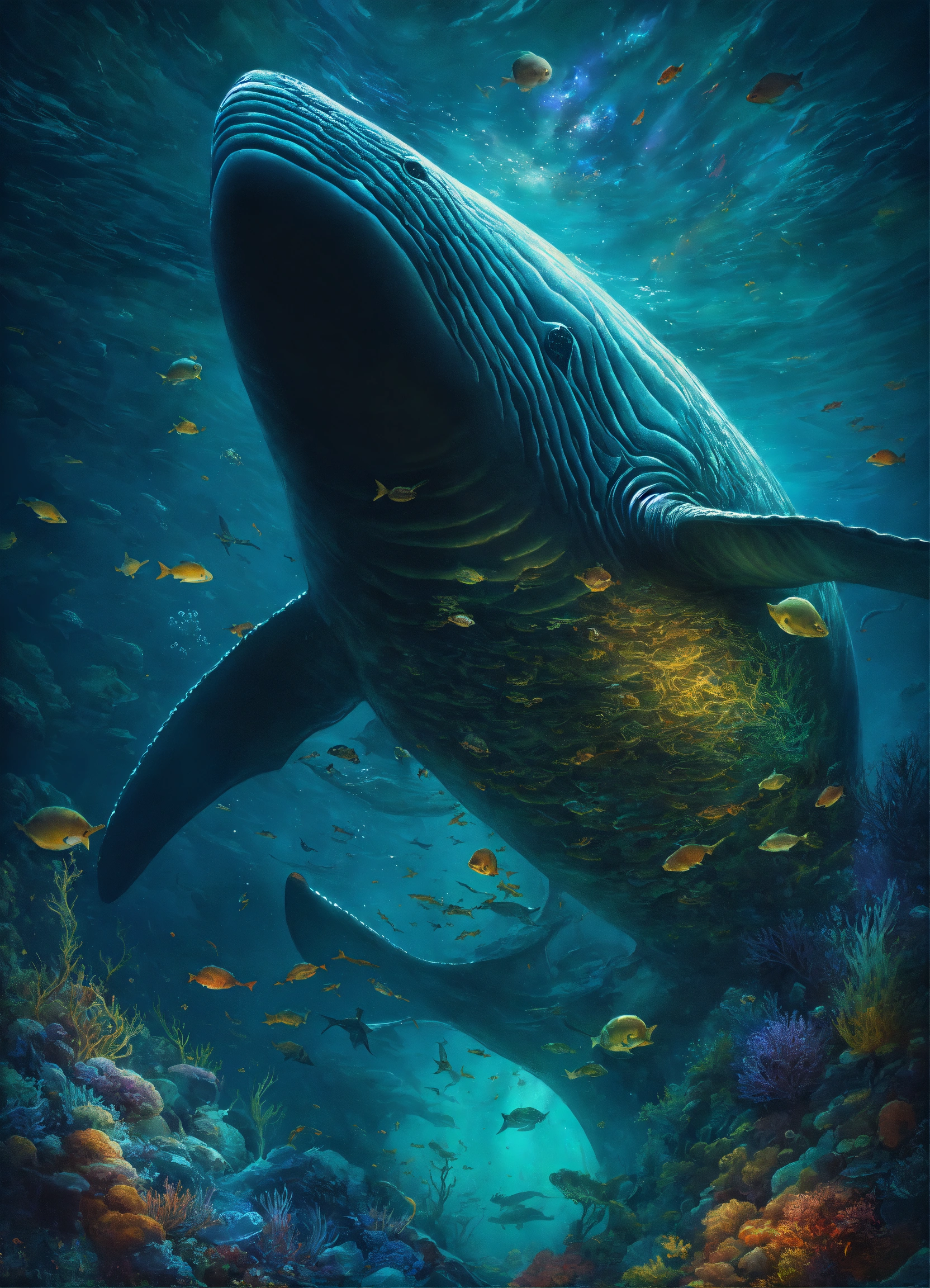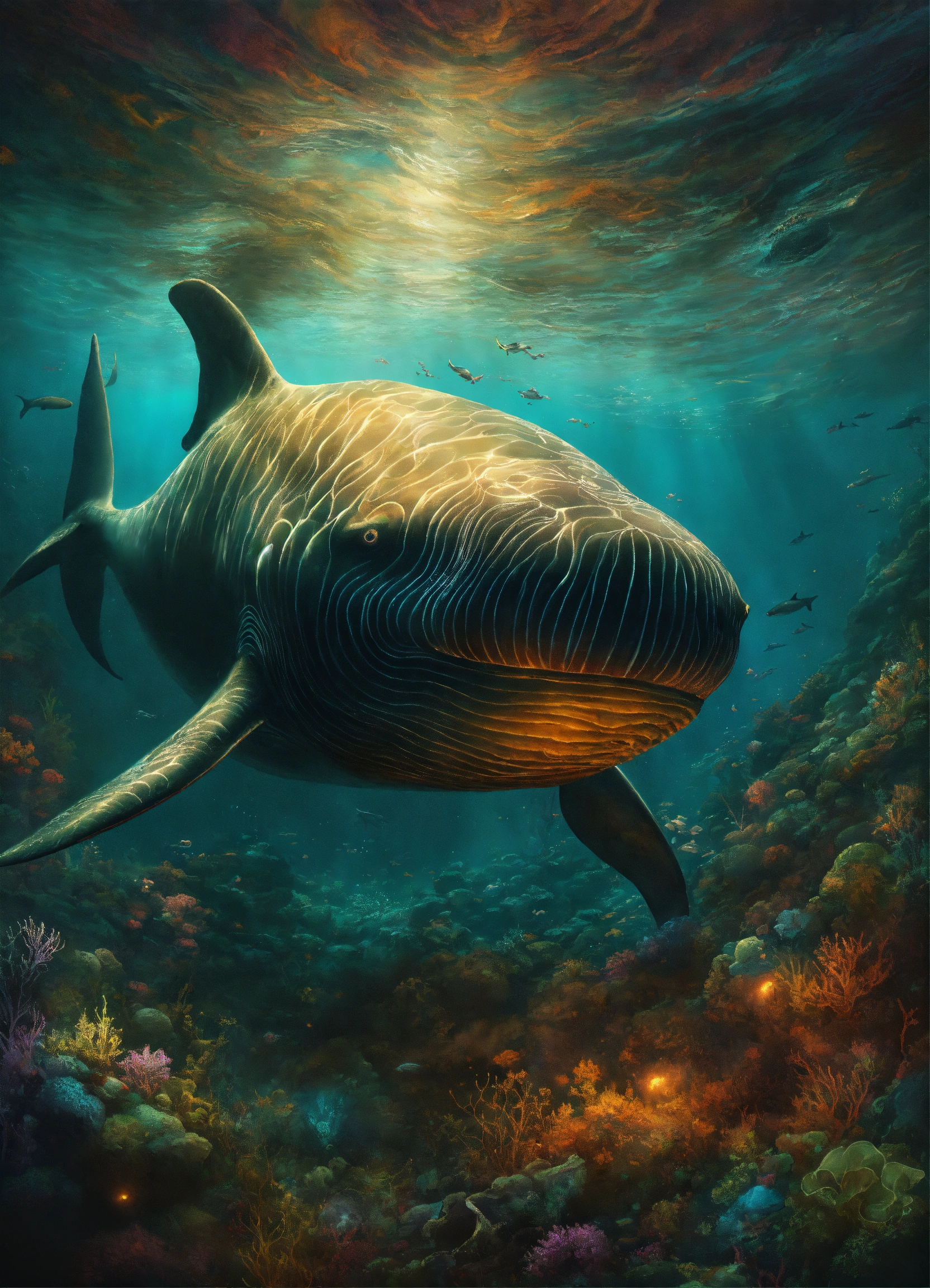 Monstrous and scally whale disappearing in the darkness of the deep, view from behind, low angle, underwater, fractal oil on canvas volumetric lighting complex cosmic detailed entangled ethereal fantastical infinity mysterious noctilucent ominous psychedelic seascape space spiraling dreamcore spacecore surrealism color graded dynamic lighting intricately detailed by tomasz strzalkowski