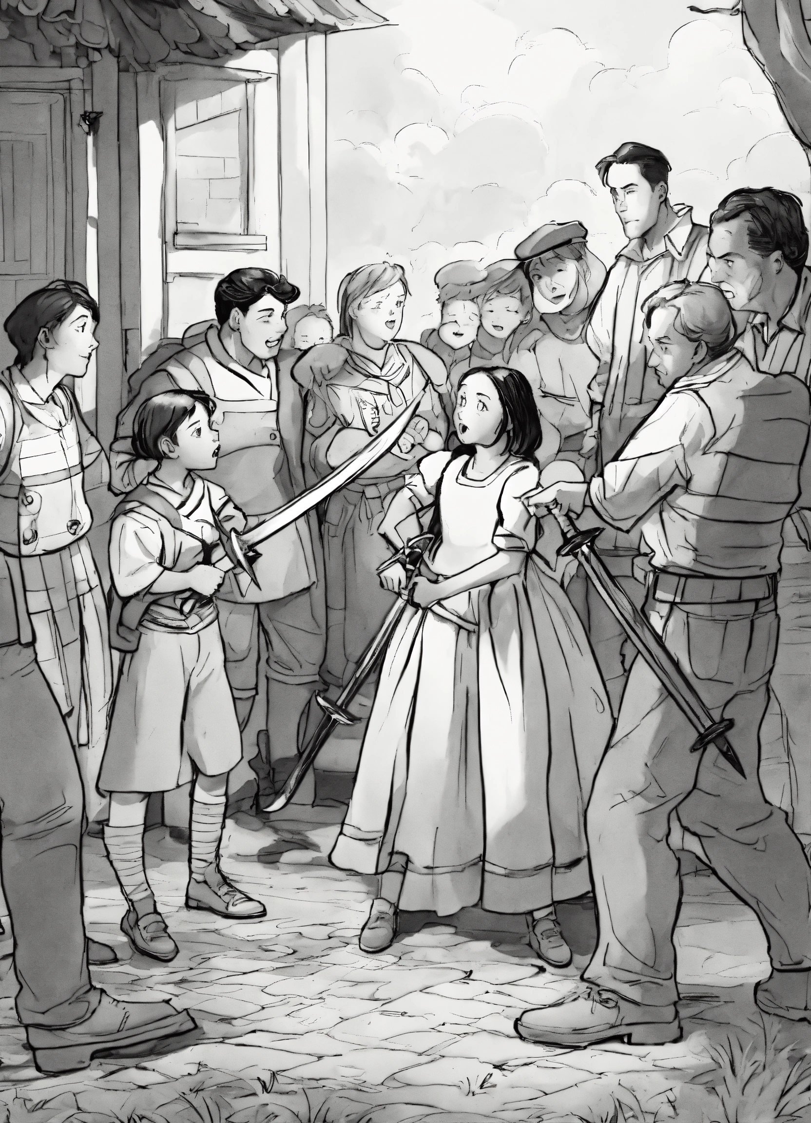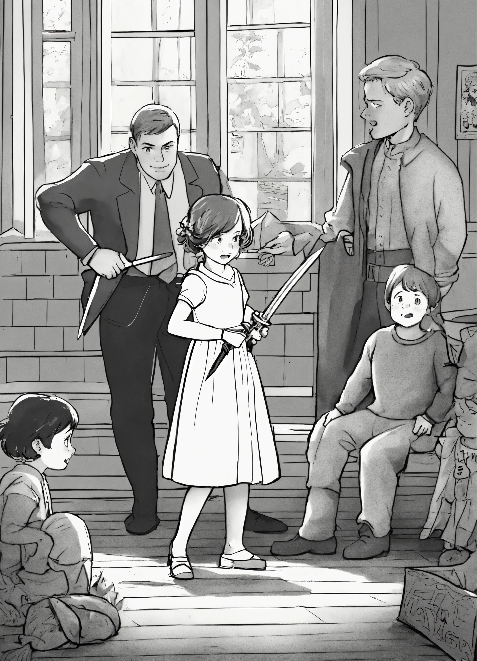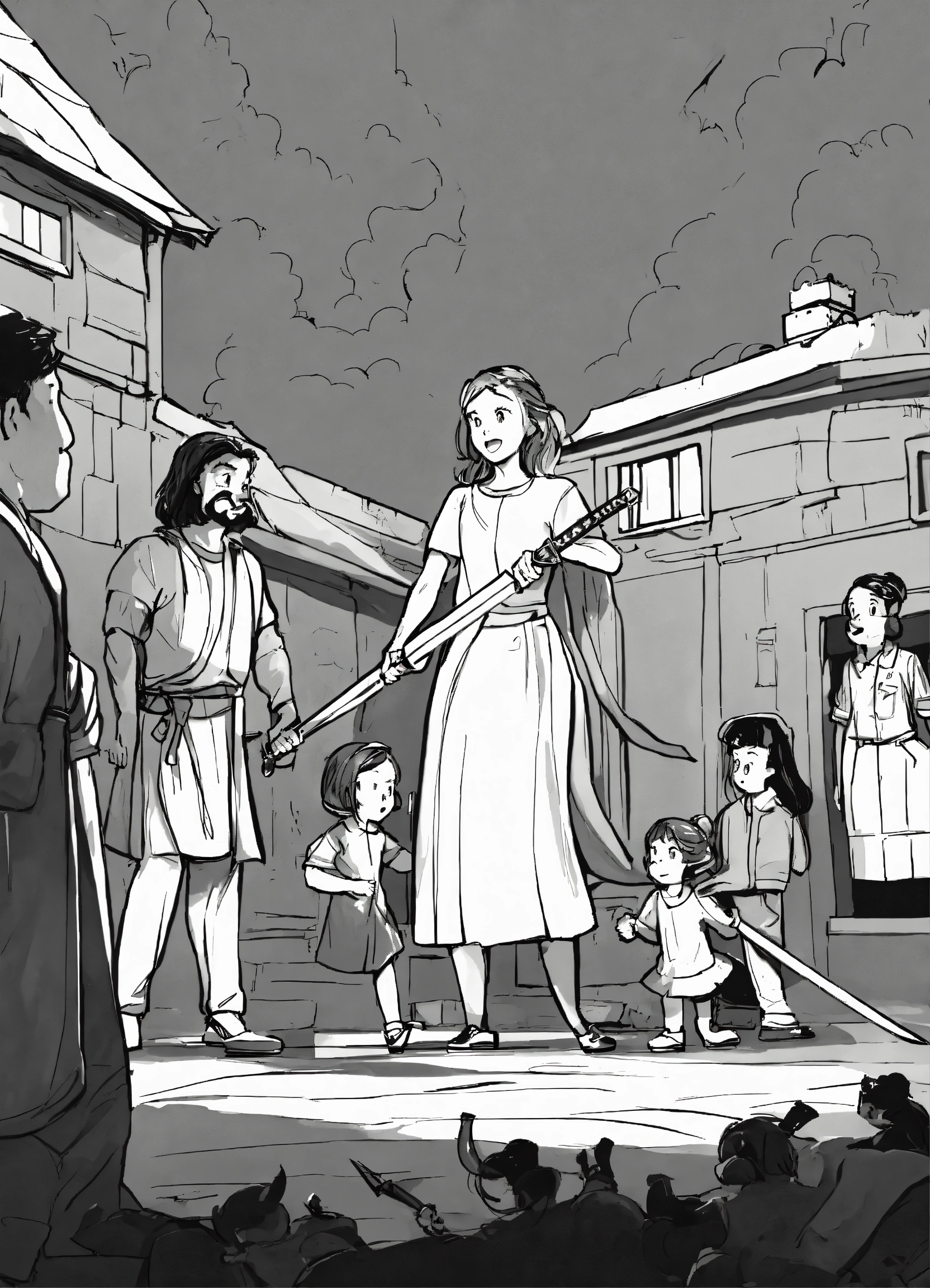 parents and teachers scold a girl with a sword