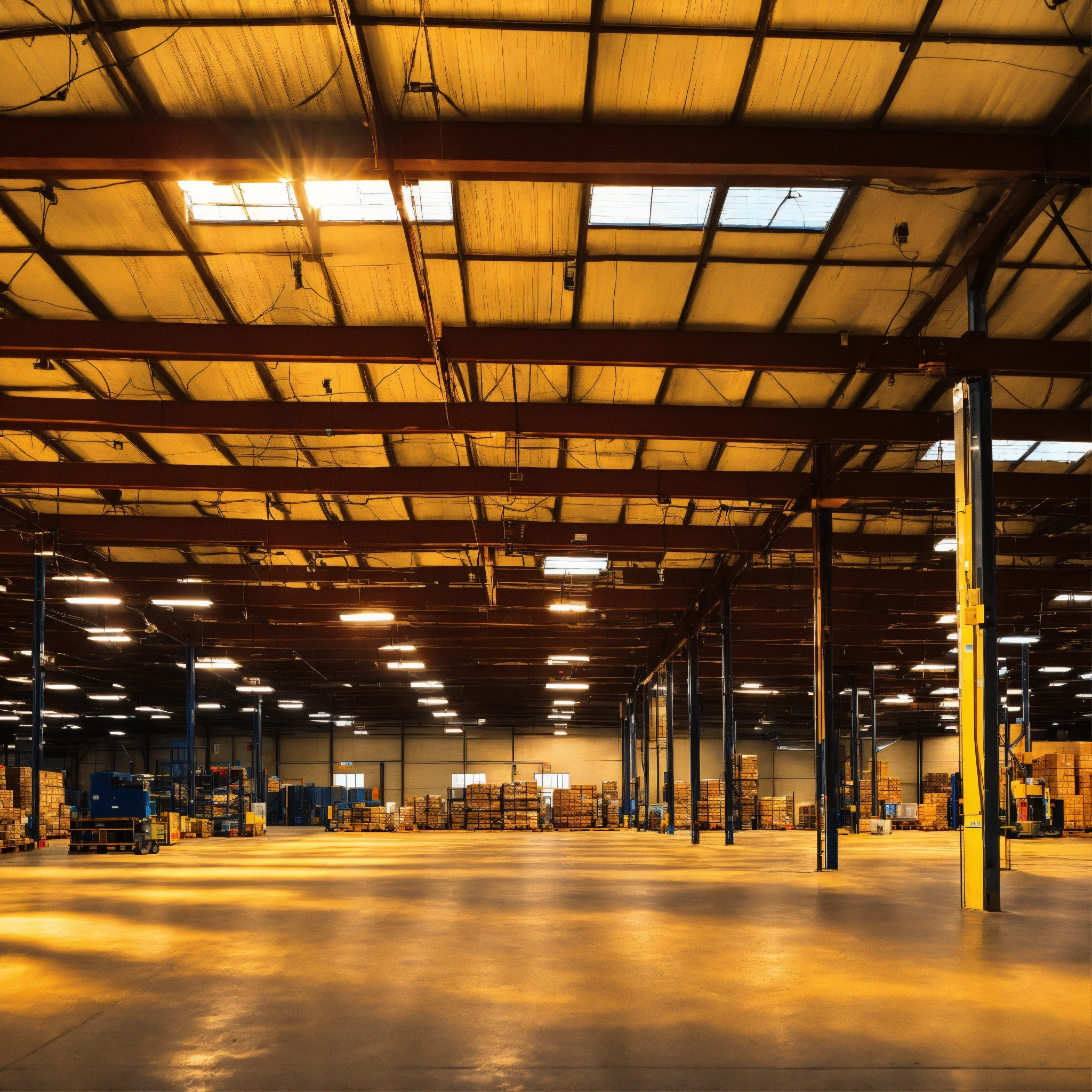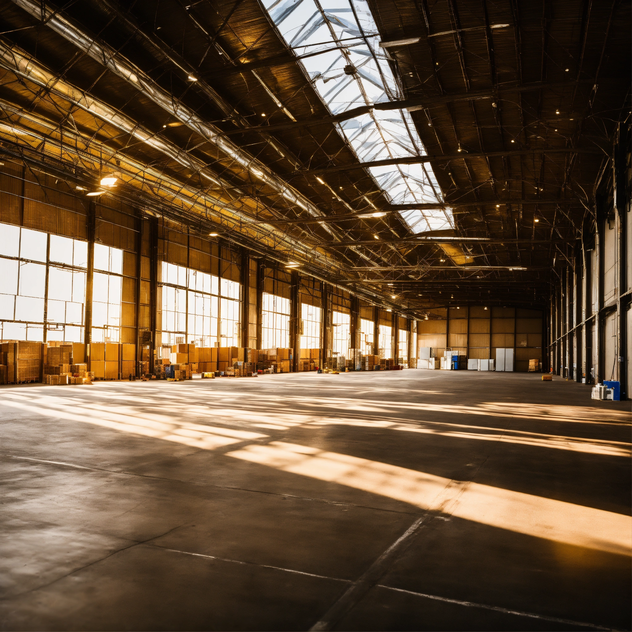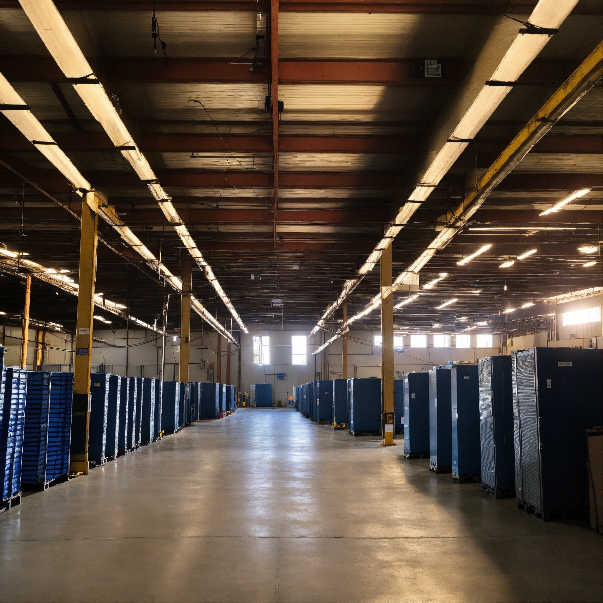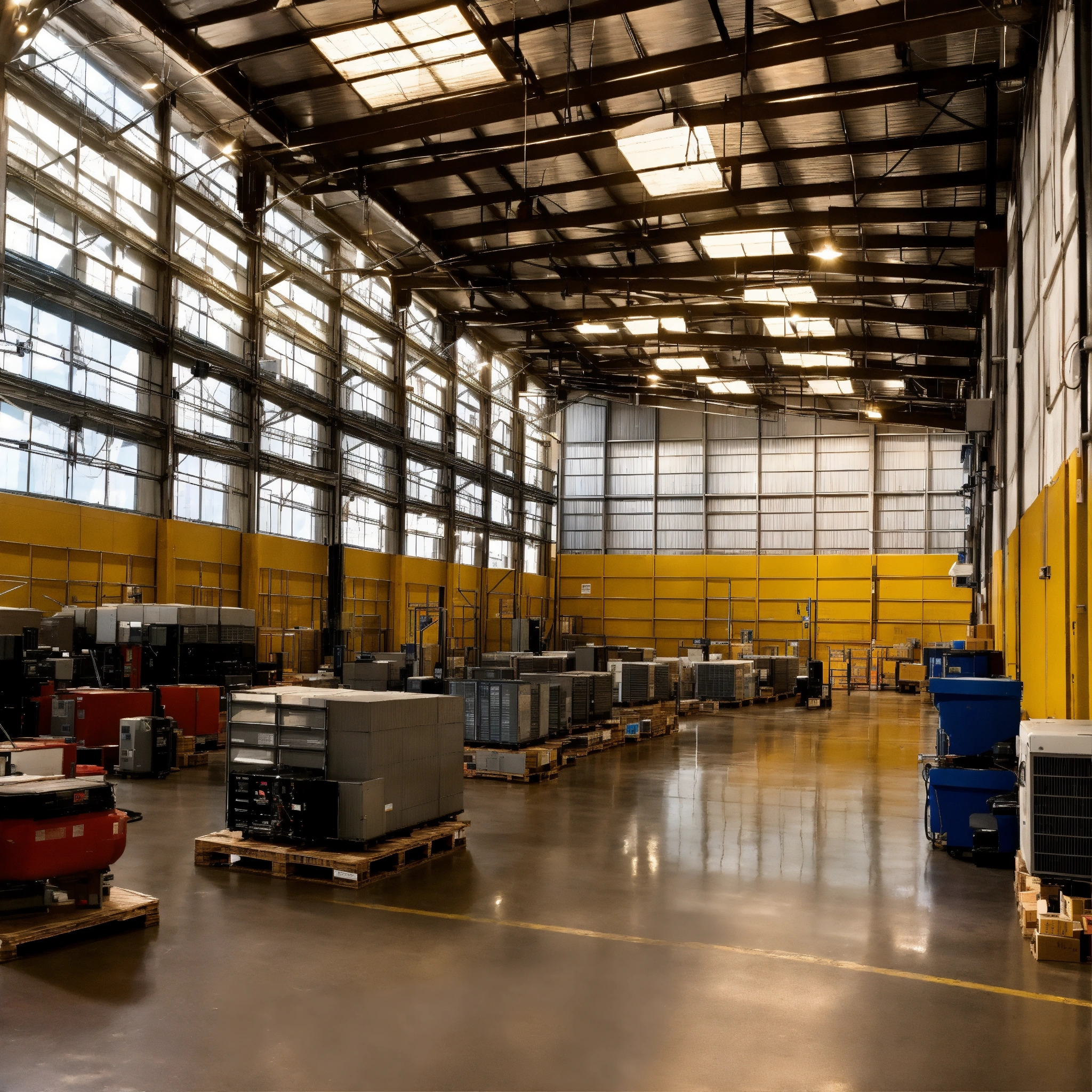 A photo of a large warehouse that is filled with hvac equipment. the warehouse is well-organized, and the equipment is clearly labeled. there are large windows on the side of the warehouse, and the sun is shining through.