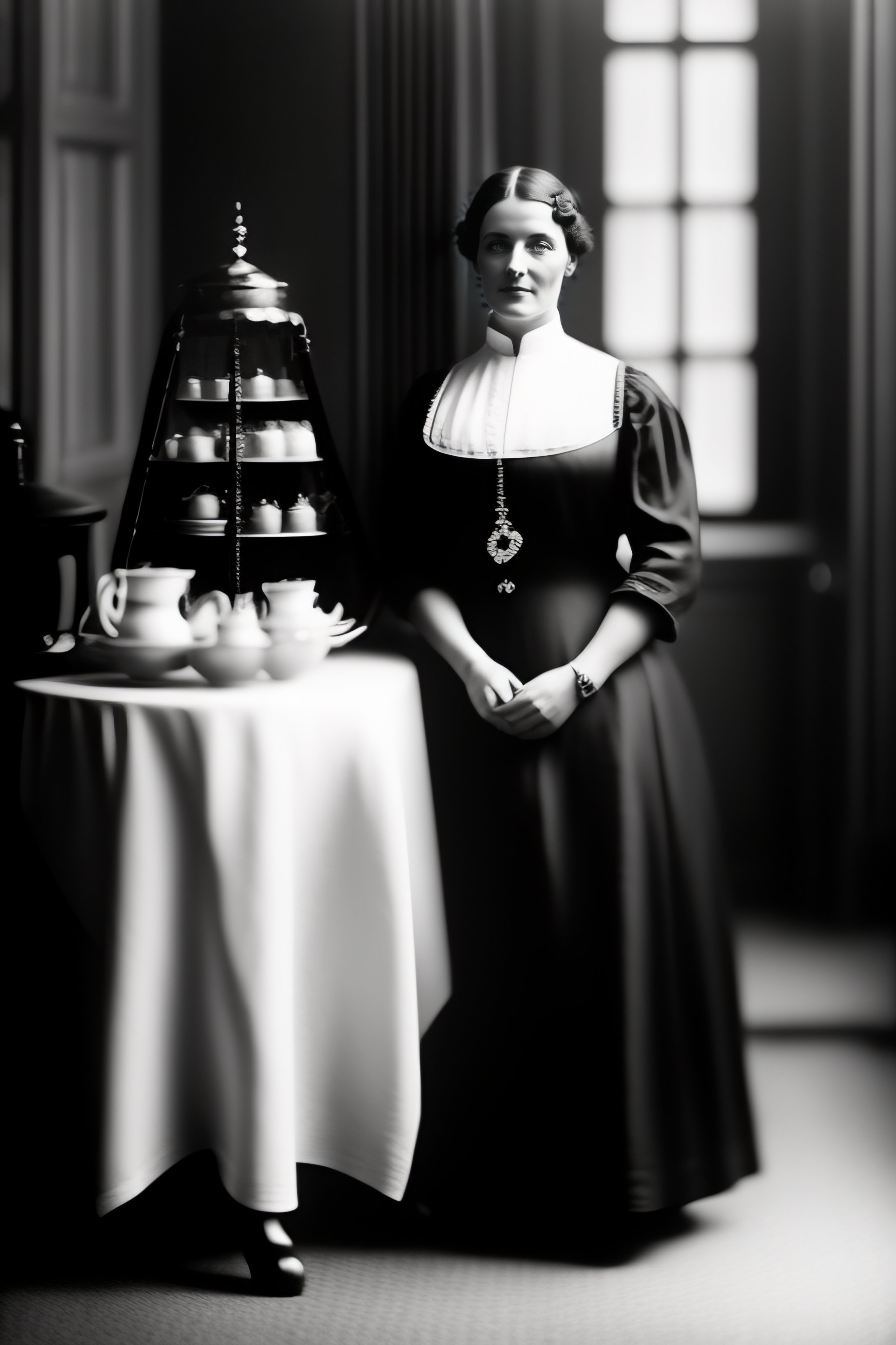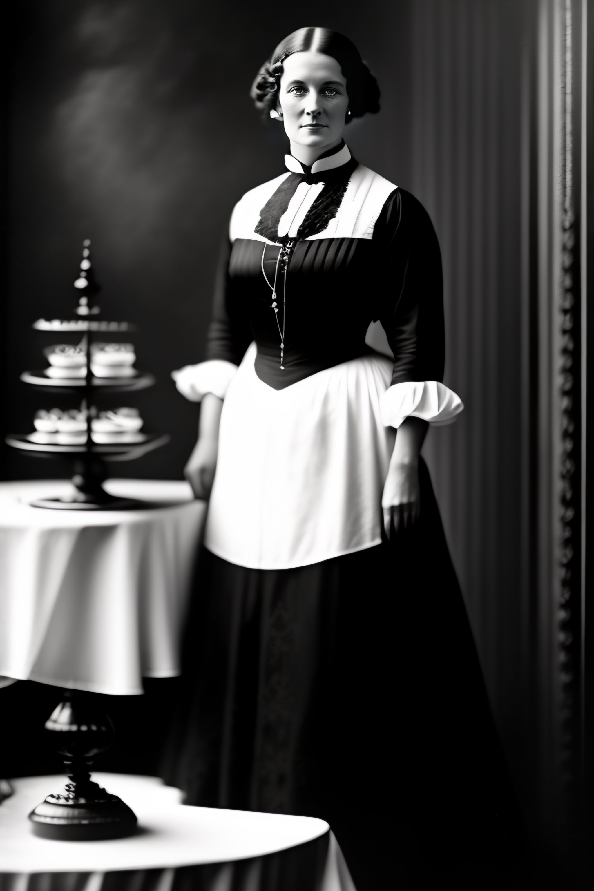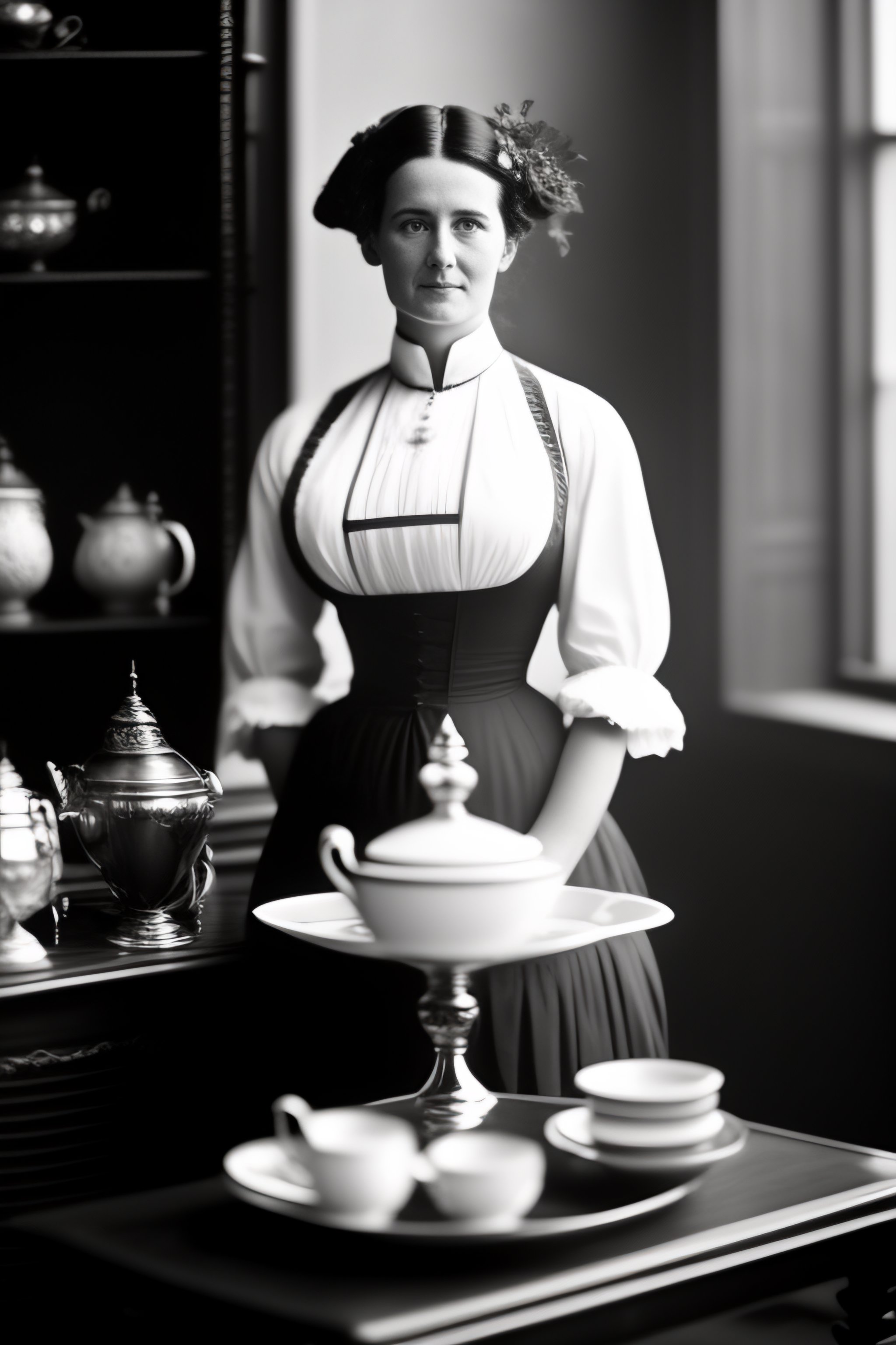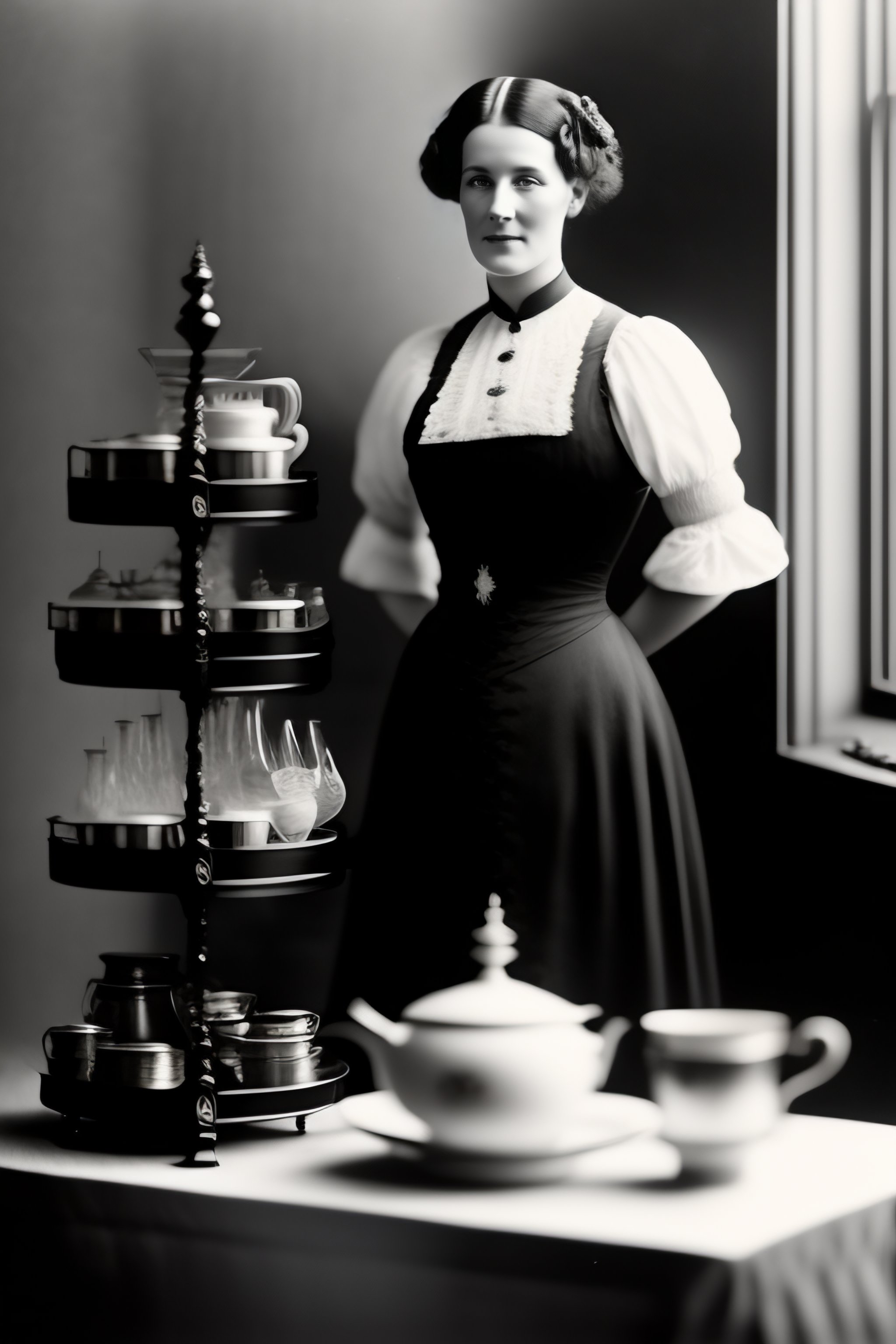 1910 grainy photograph of an edwardian maid with a black dress and a white apron standing next to a tea trolley