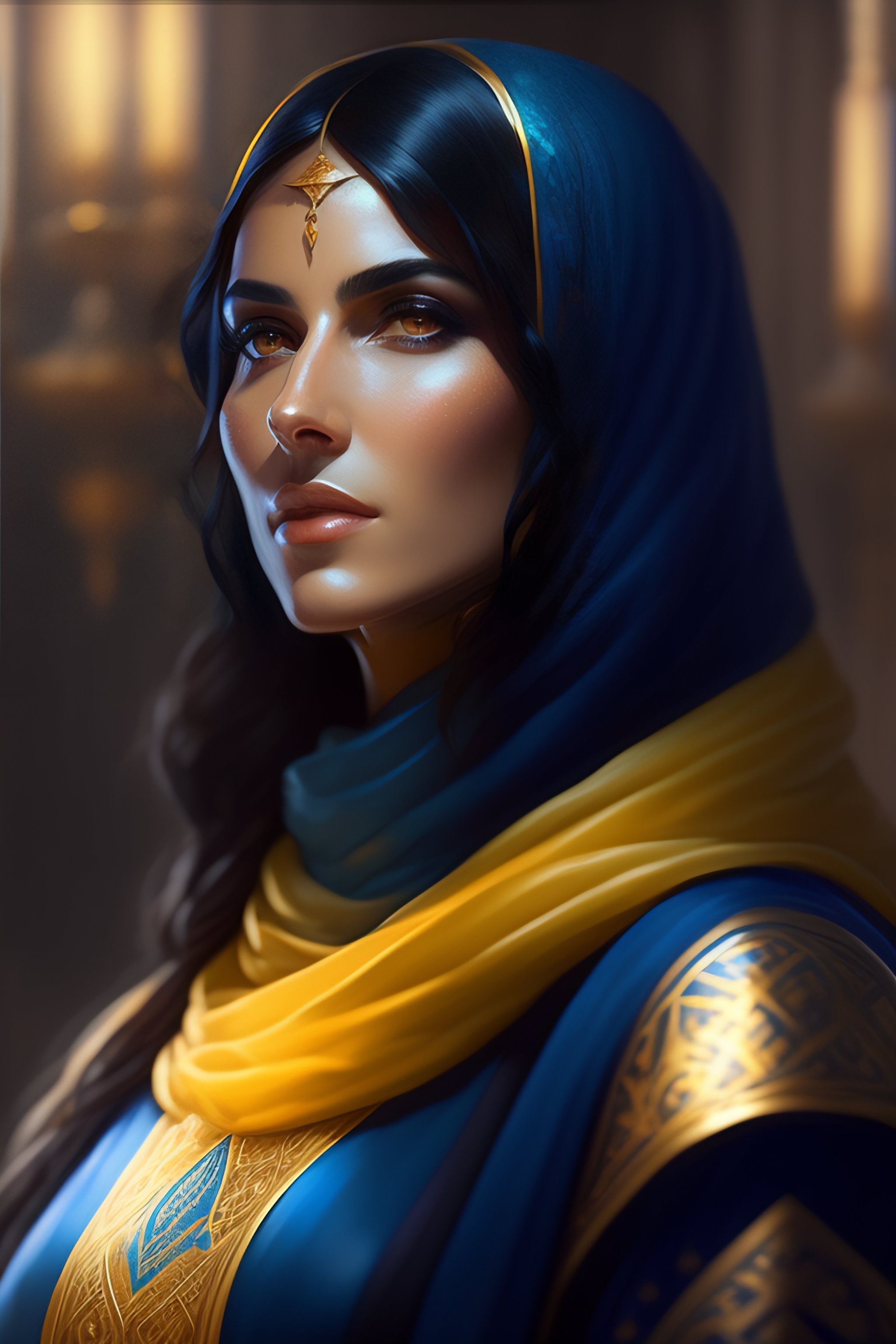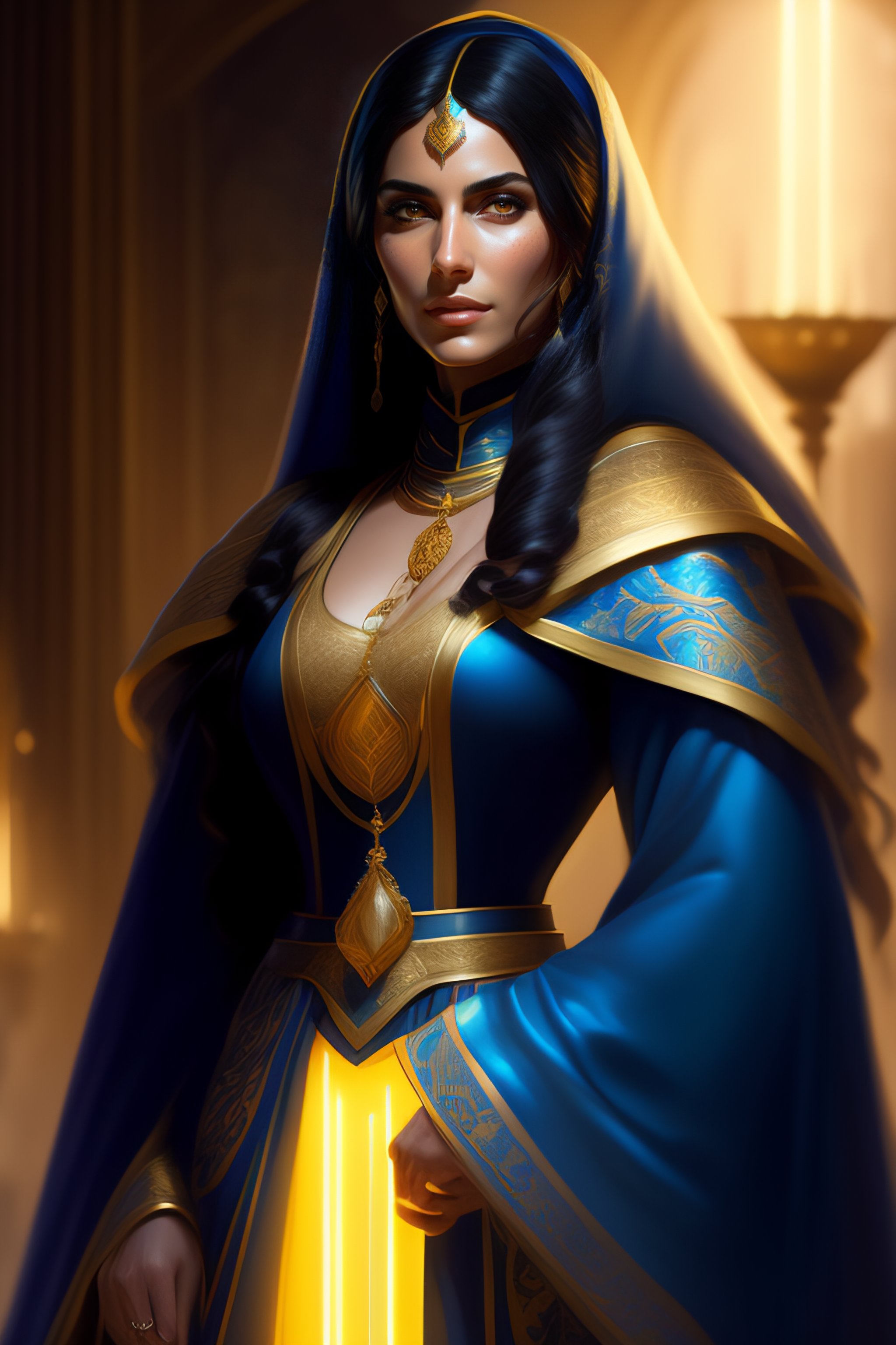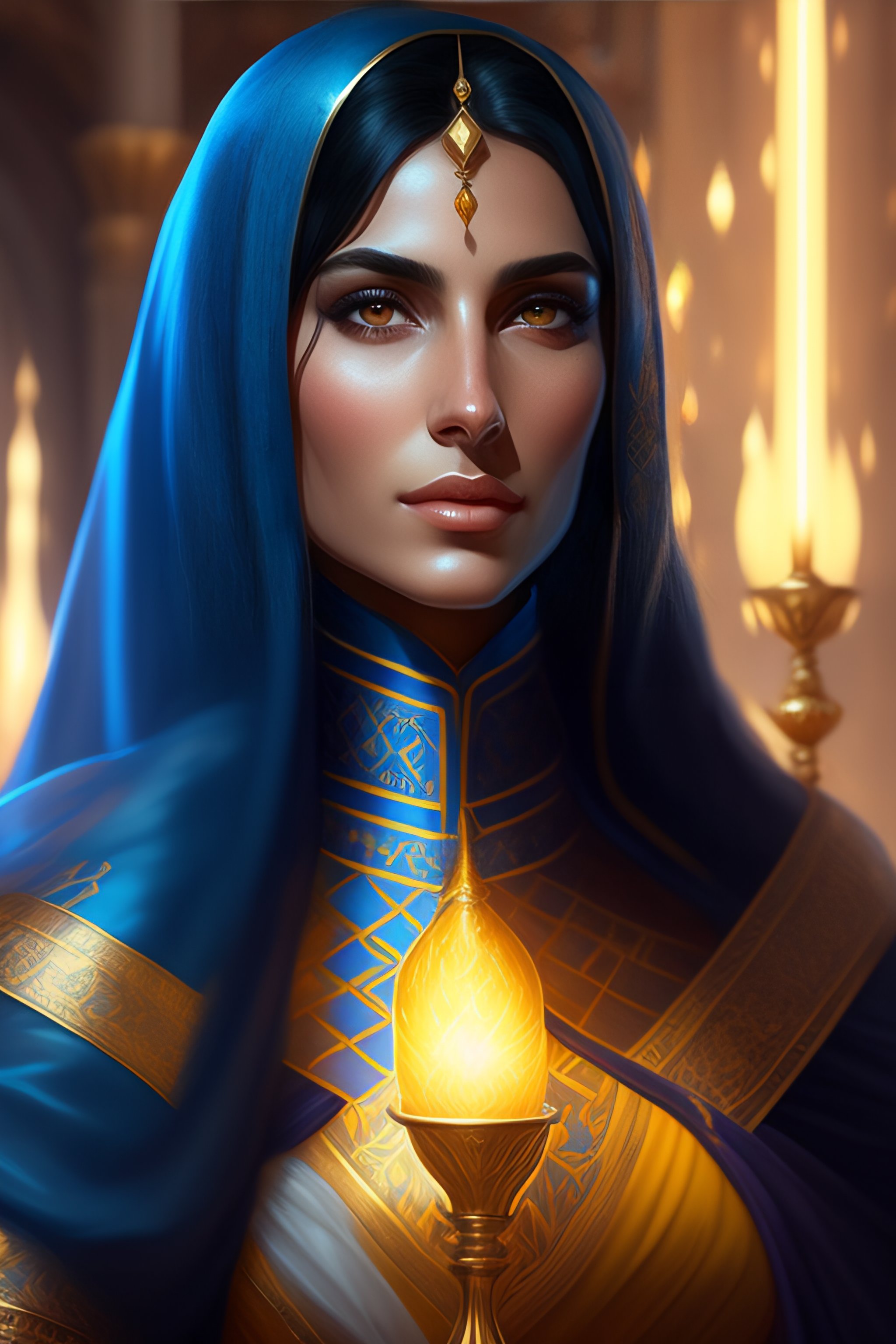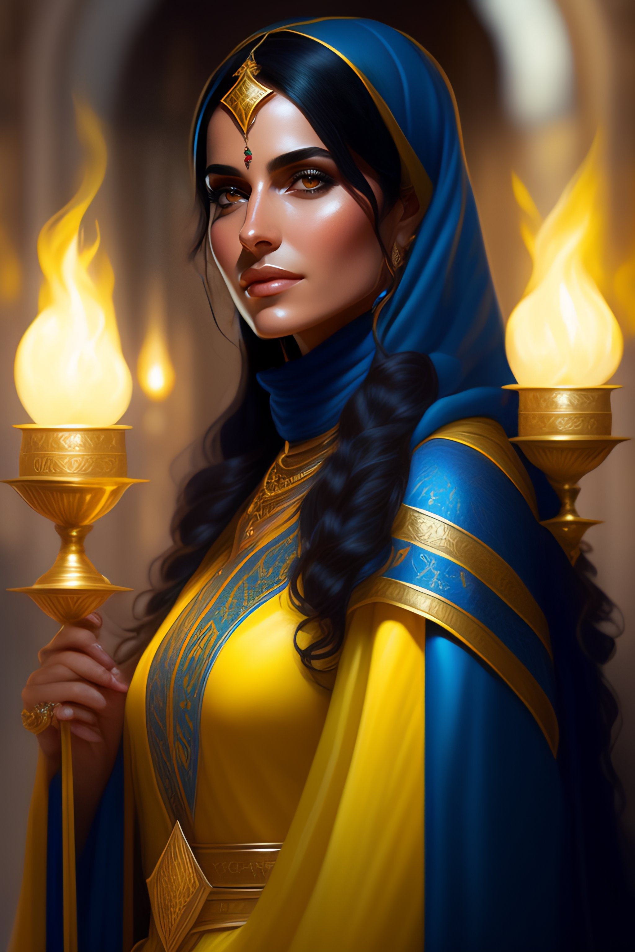 Portrait of a middle - eastern female cleric with straight black hair wearing blue and yellow vestments casting fireball, fantasy, highly detailed, digital painting, artstation, concept art, character art, art by greg rutkowski and tyler jacobson and alphonse mucha