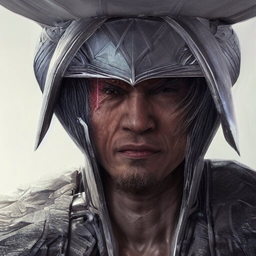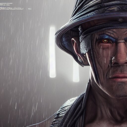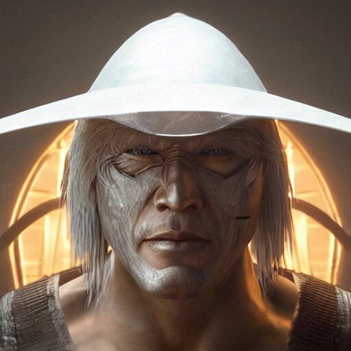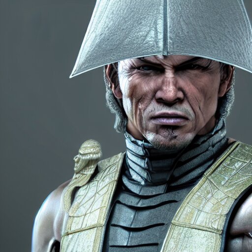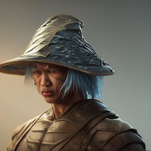 Hyper realistic, highly detailed hybrid of raiden from mortal kombat, and raiden from metal gear solid wearing a conical rice hat. unreal engine, greg rutkowski, beeple global illumination, translucent, sub - surface scattering