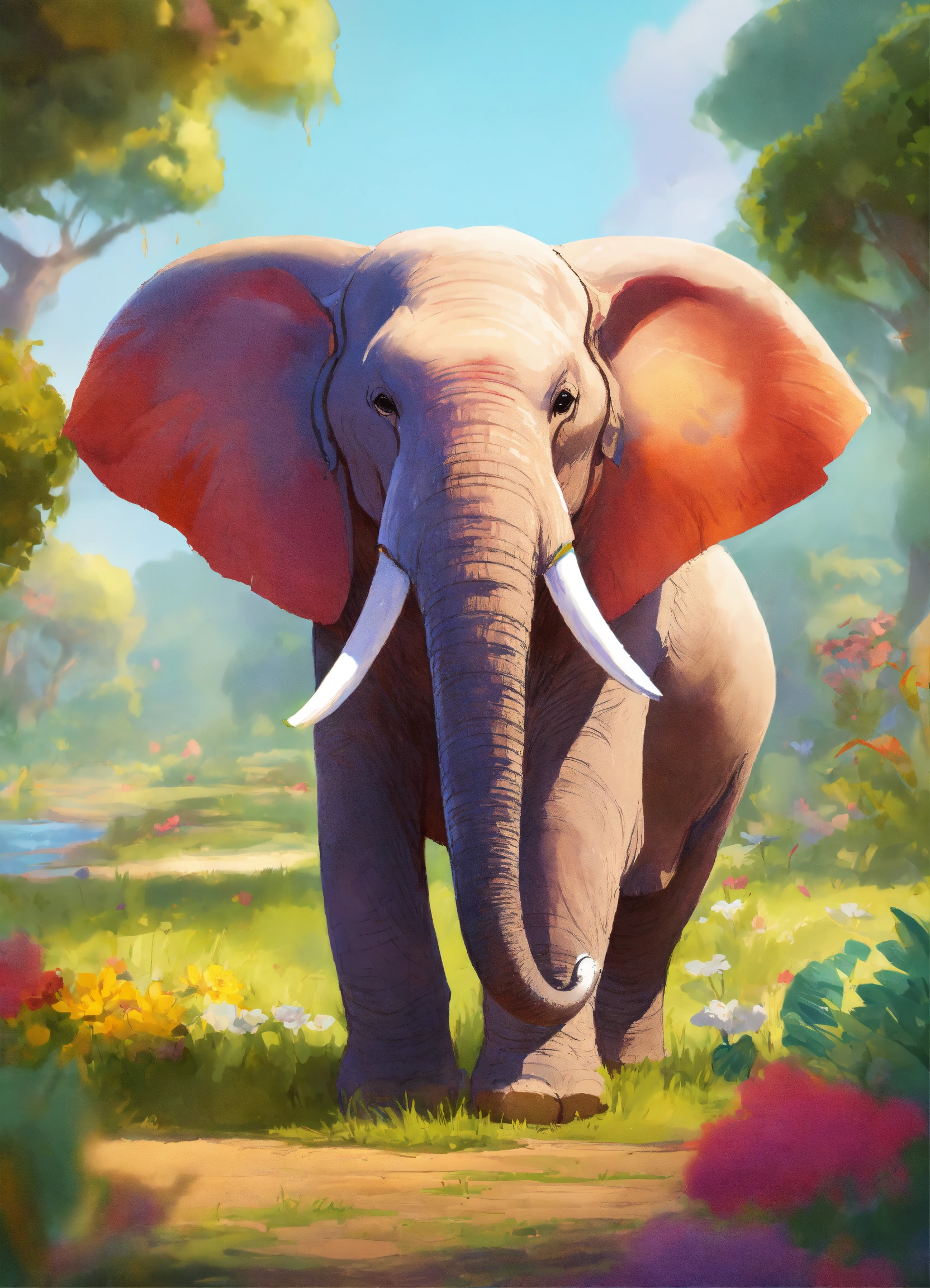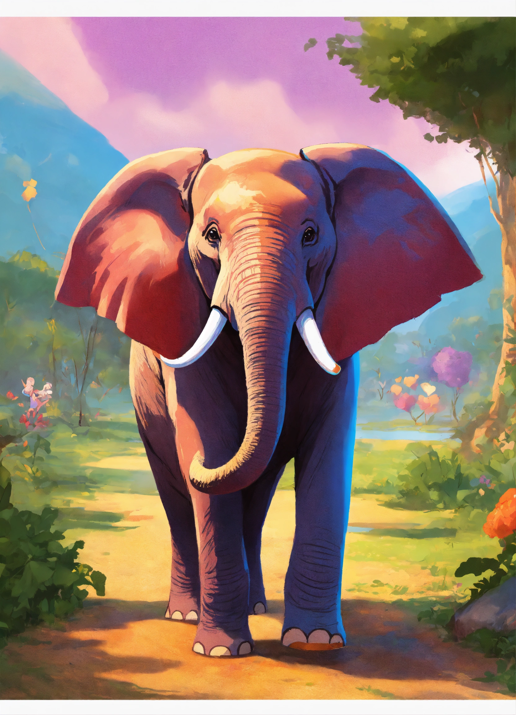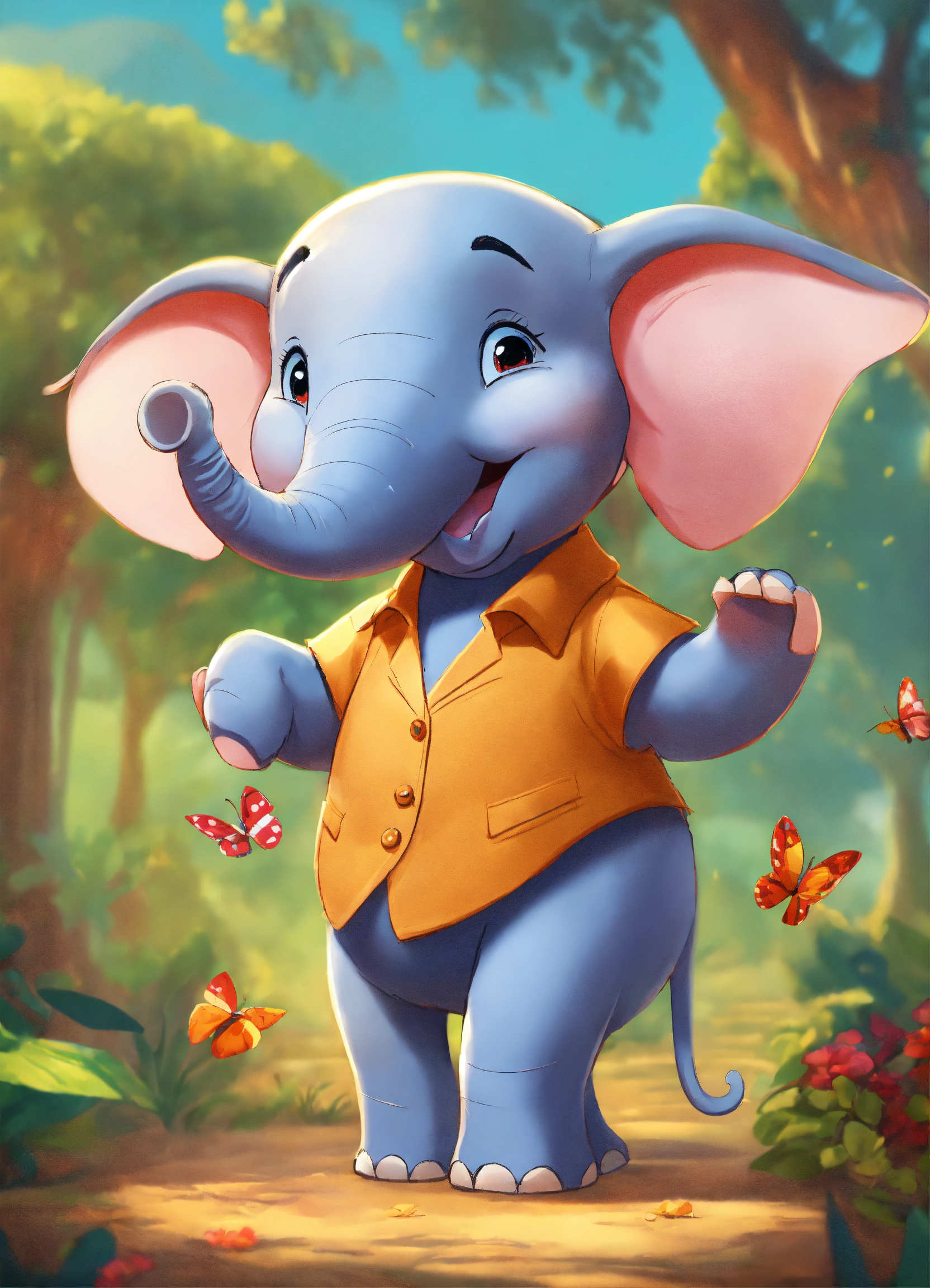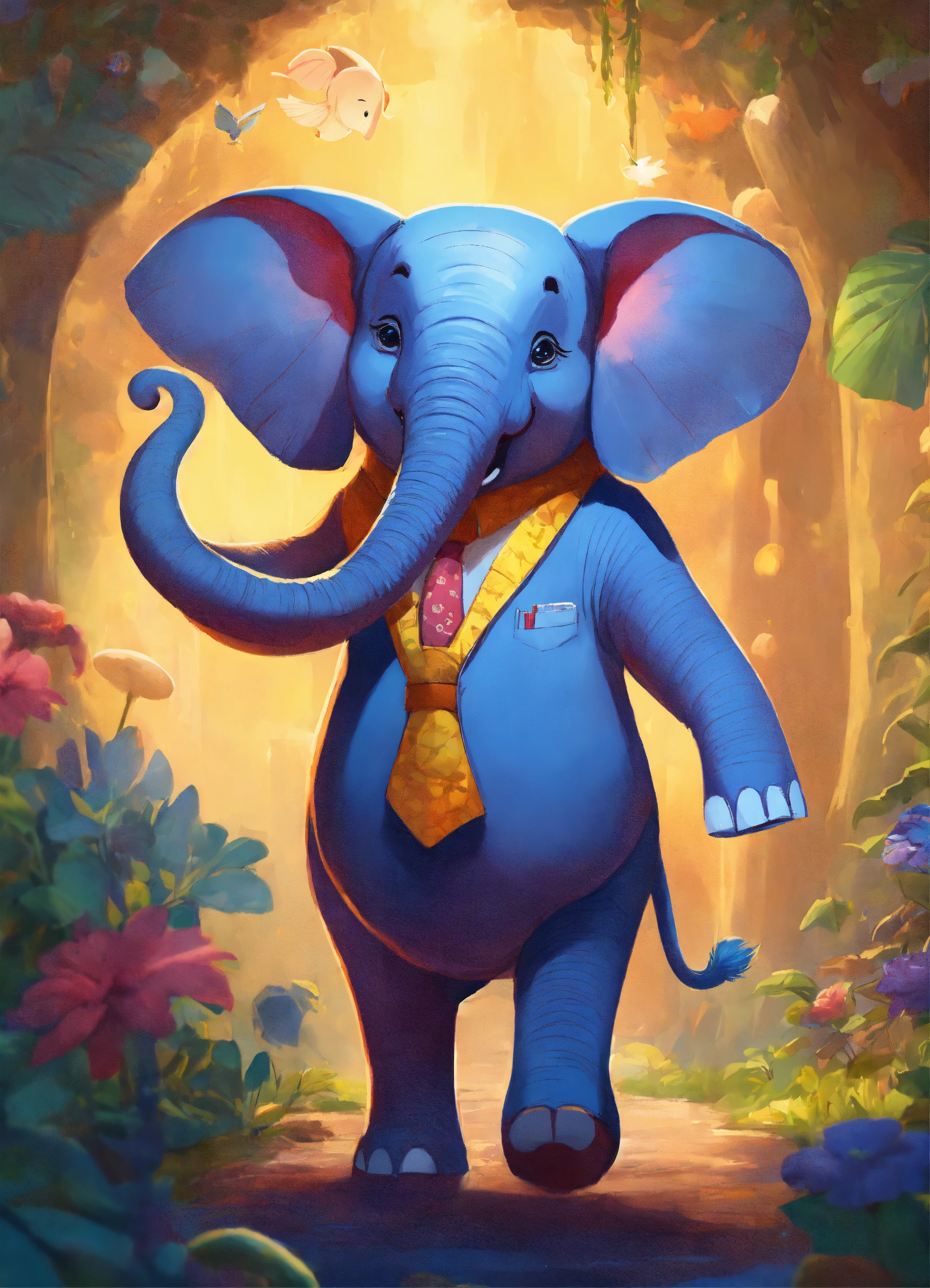 Elephant, standing on two legs, as if it were a person with dress clothes smiling, charismatic, pixar style, animated character, colorful, with a nature background, different body sizes, and varied drawing styles, anthropomorphic characteristic