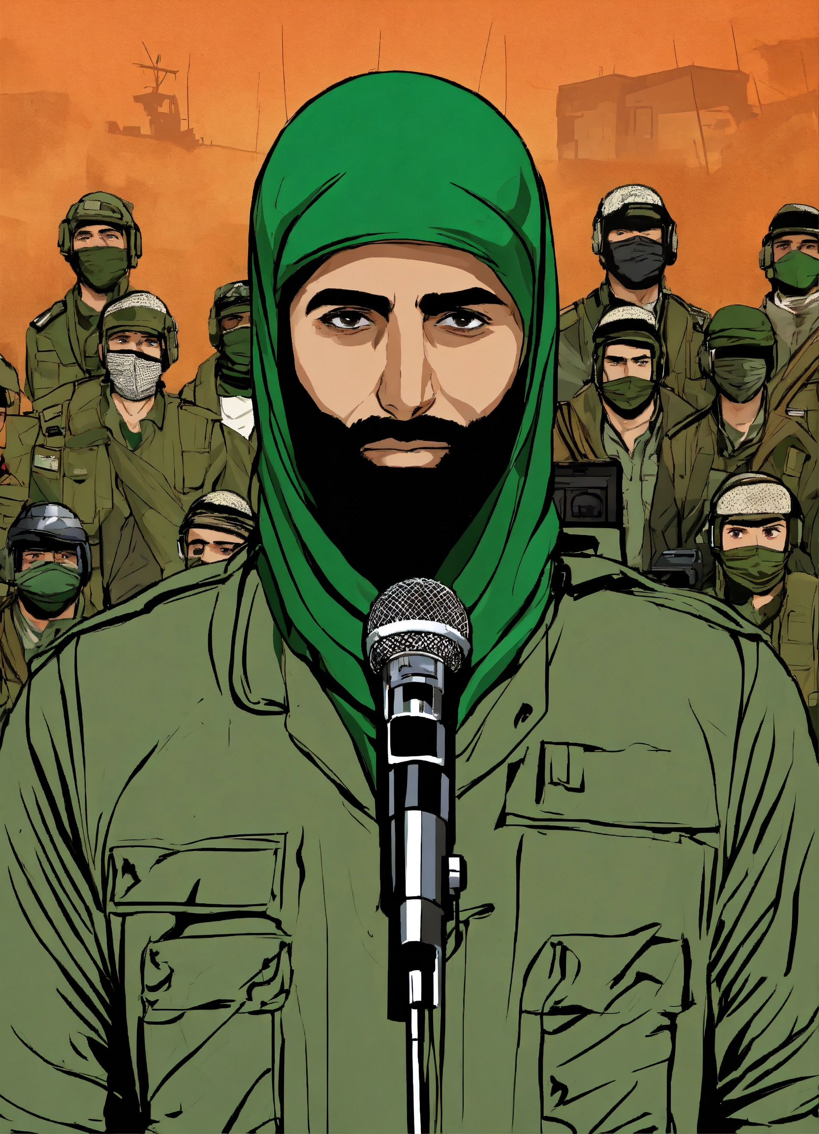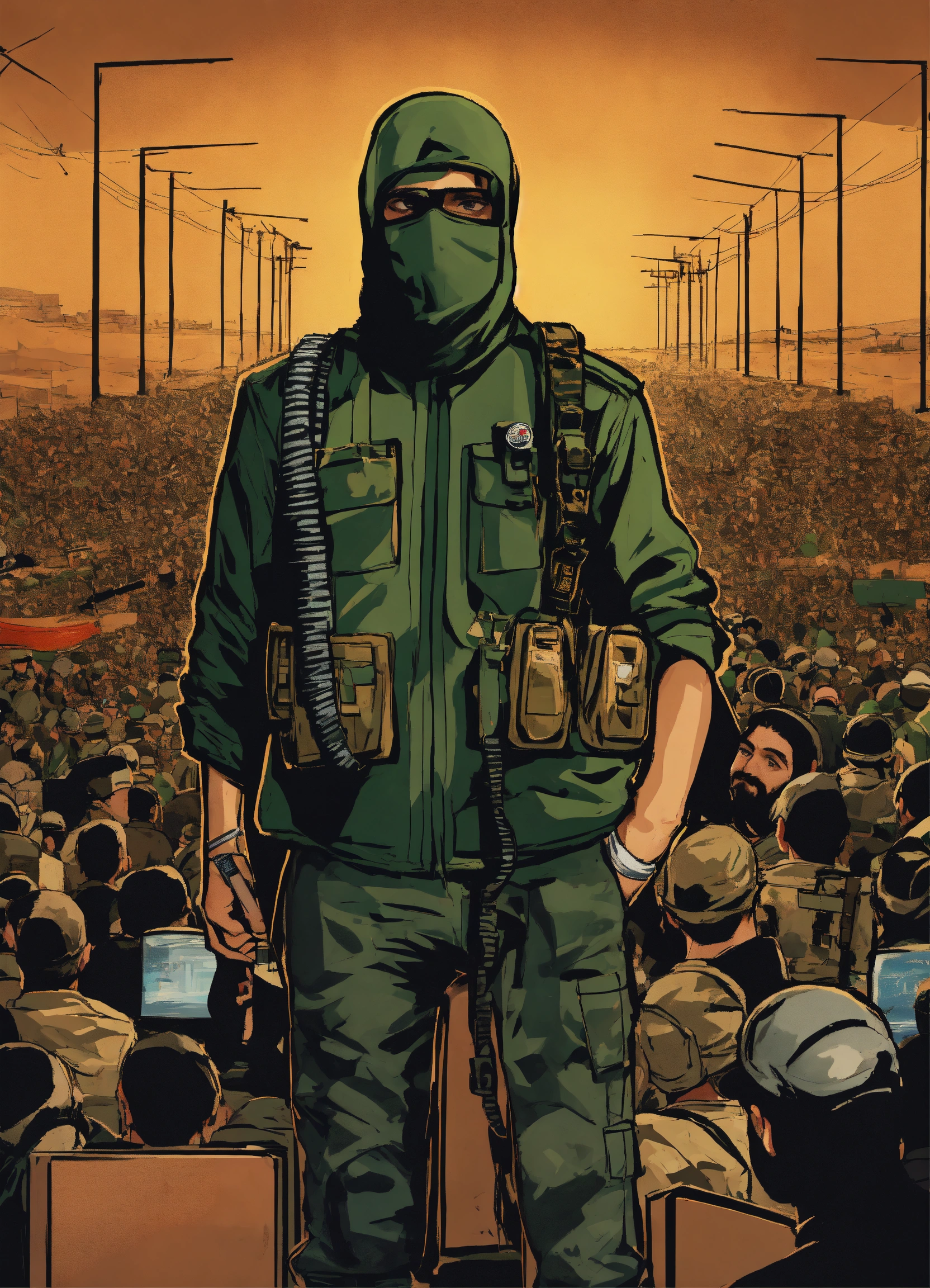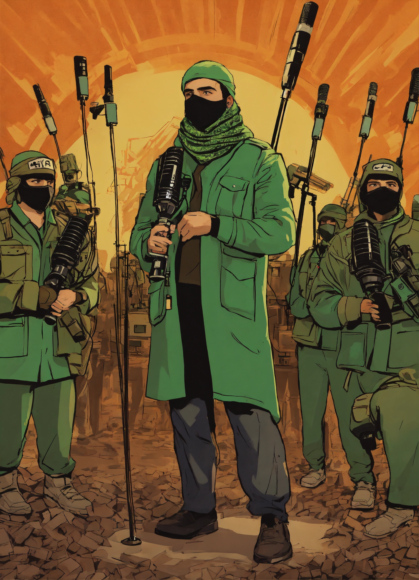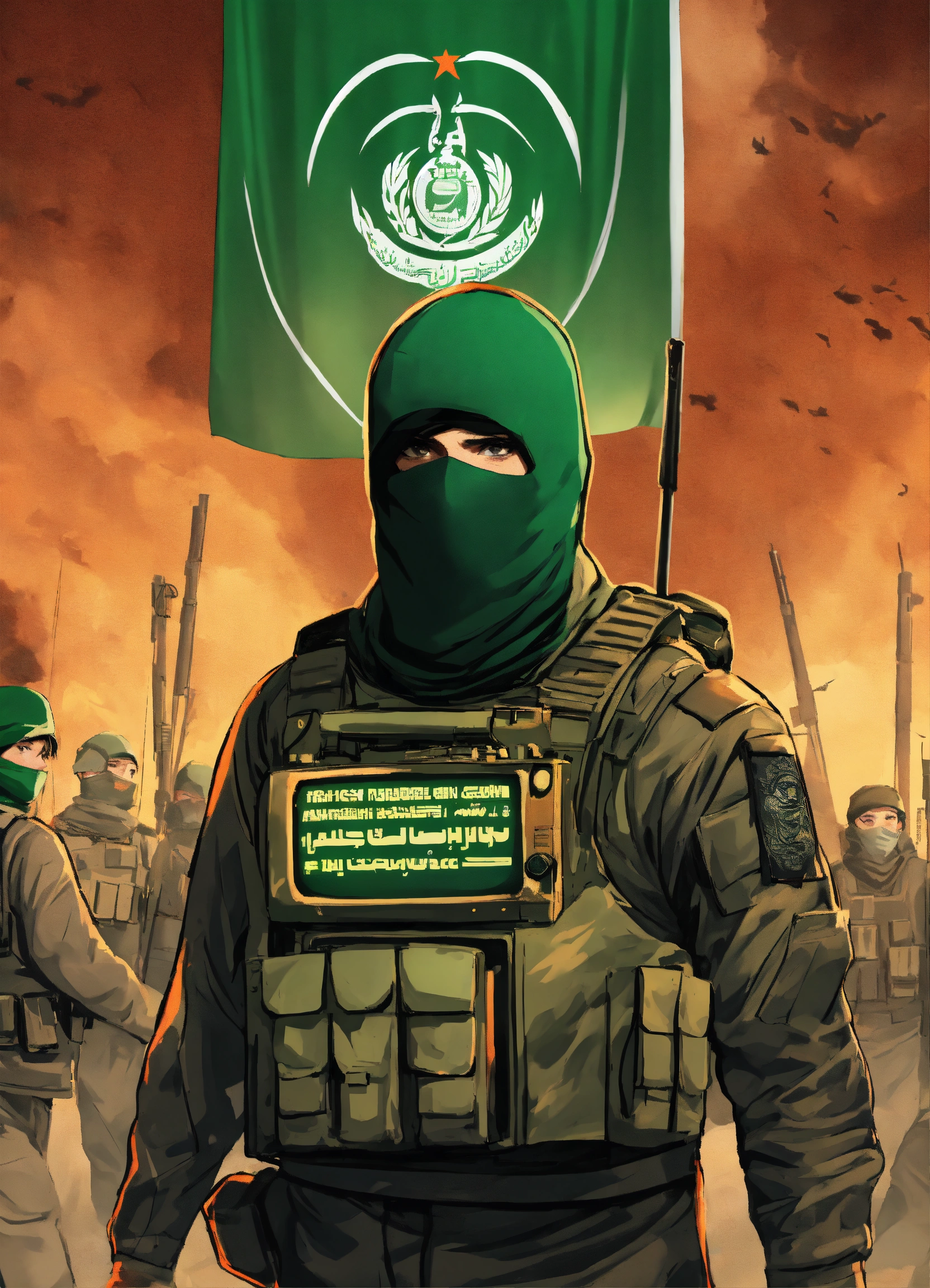"a design that represents a fighter from hamas, masked, standing in front of numerous microphones and appearing on a television screen, where he is the official spokesperson for the resistance movement."