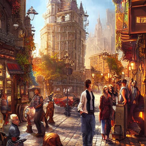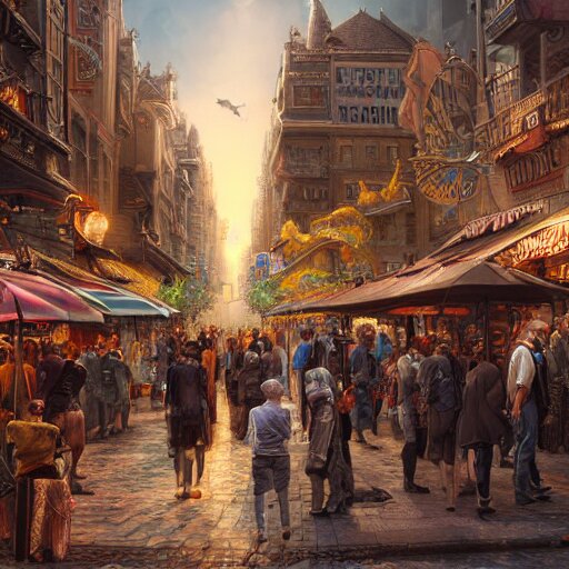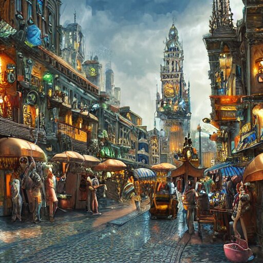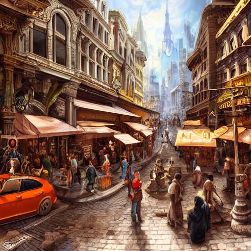 A busy fantasy street scene from within a beautiful and ornate city, hyper realistic digital art, beautiful painting, detailed, cinematic, great composition